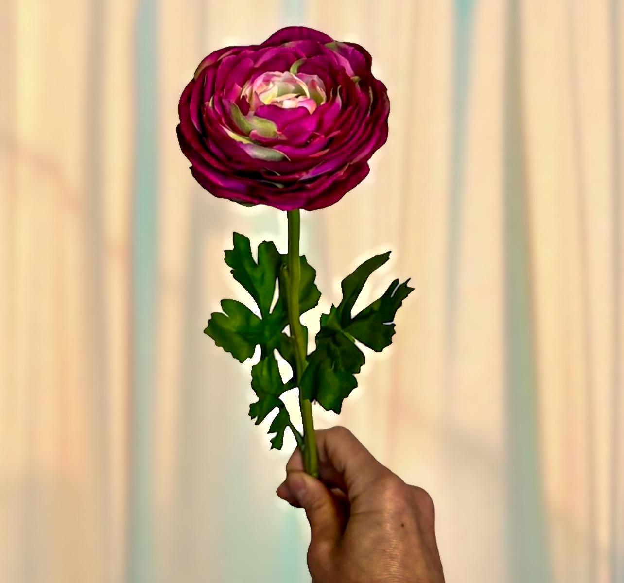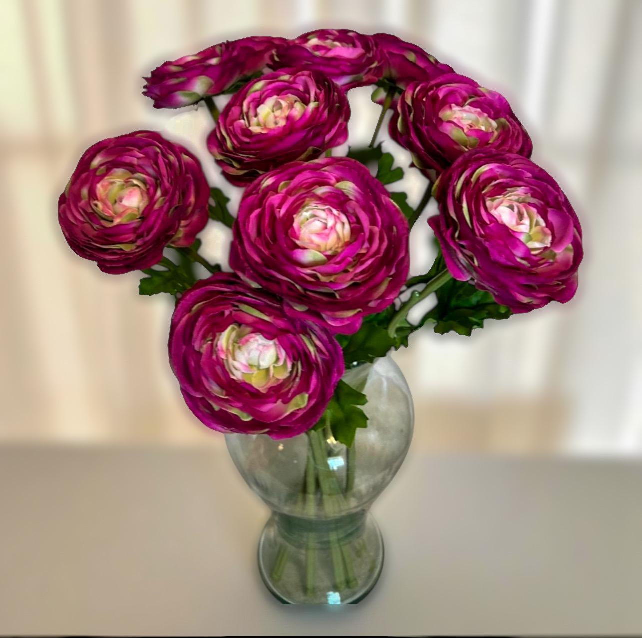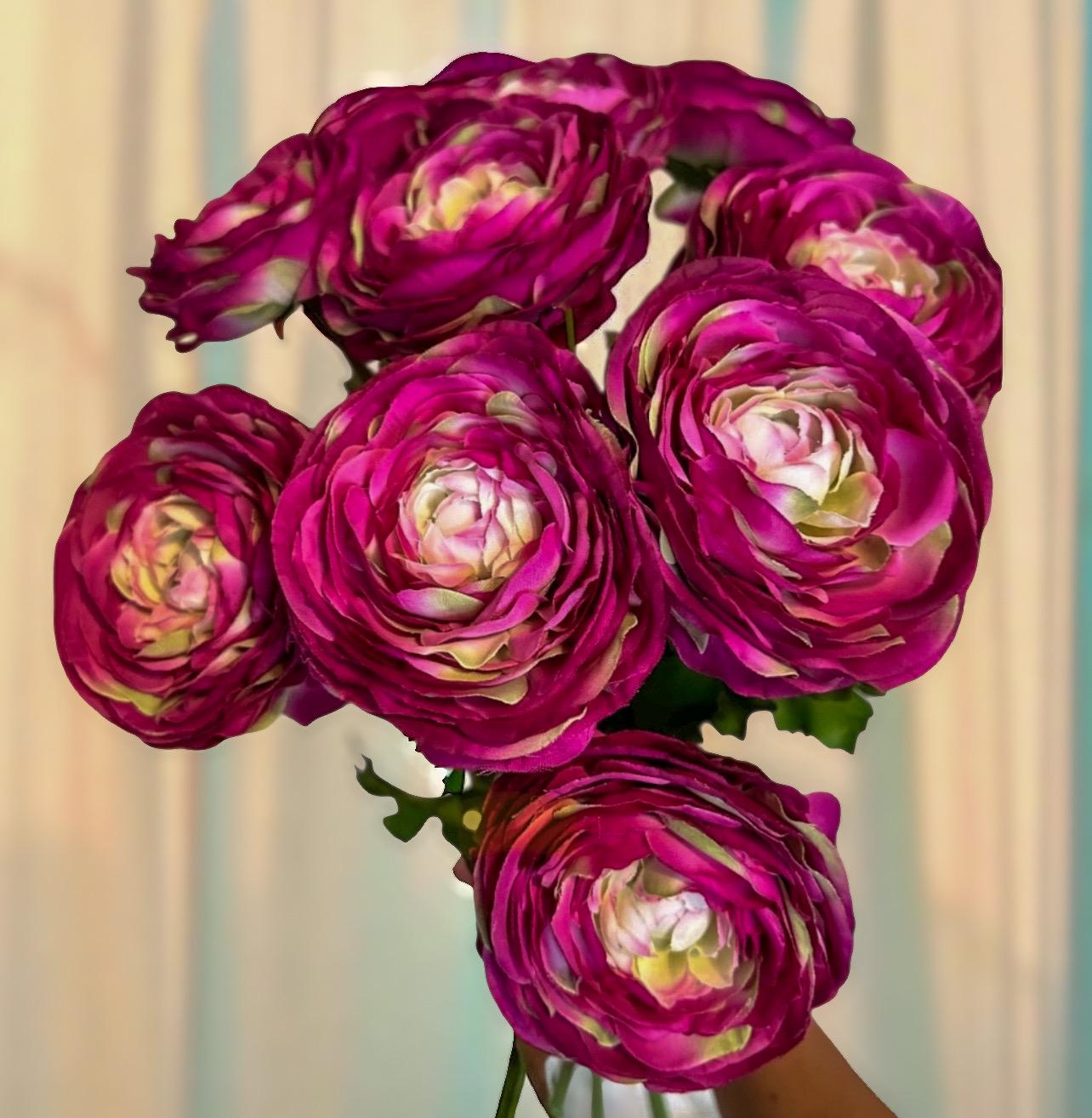 Bring bold beauty to your floral arrangements with these stunning faux ranunculus stems in vibrant fuchsia tones. Each stem measures approximately 19 inches in length and showcases a lush, multilayered bloom about 3.5 inches in diameter. The petals display soft gradients of magenta, blush, and pale green, creating a realistic and eye-catching floral accent.