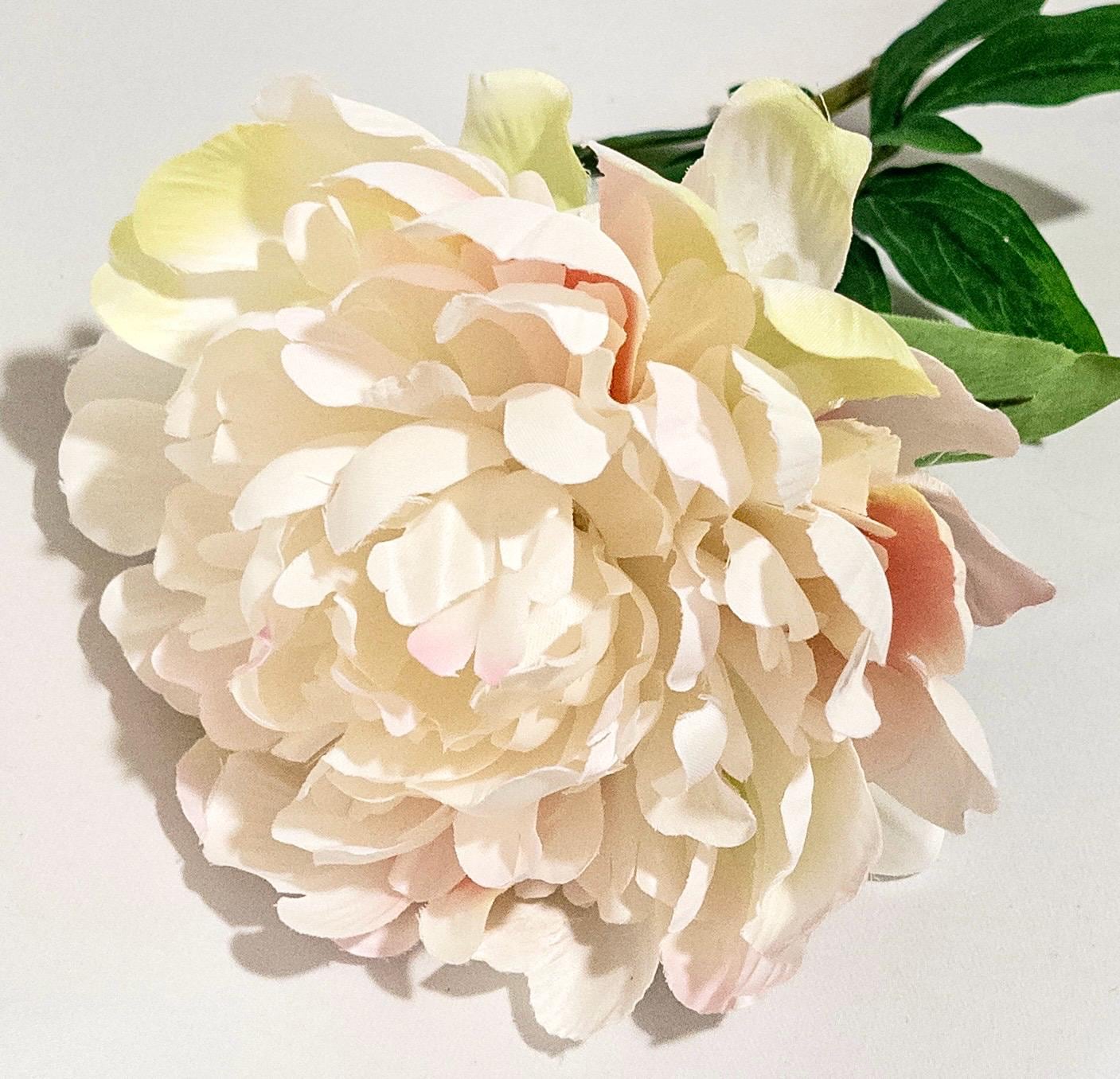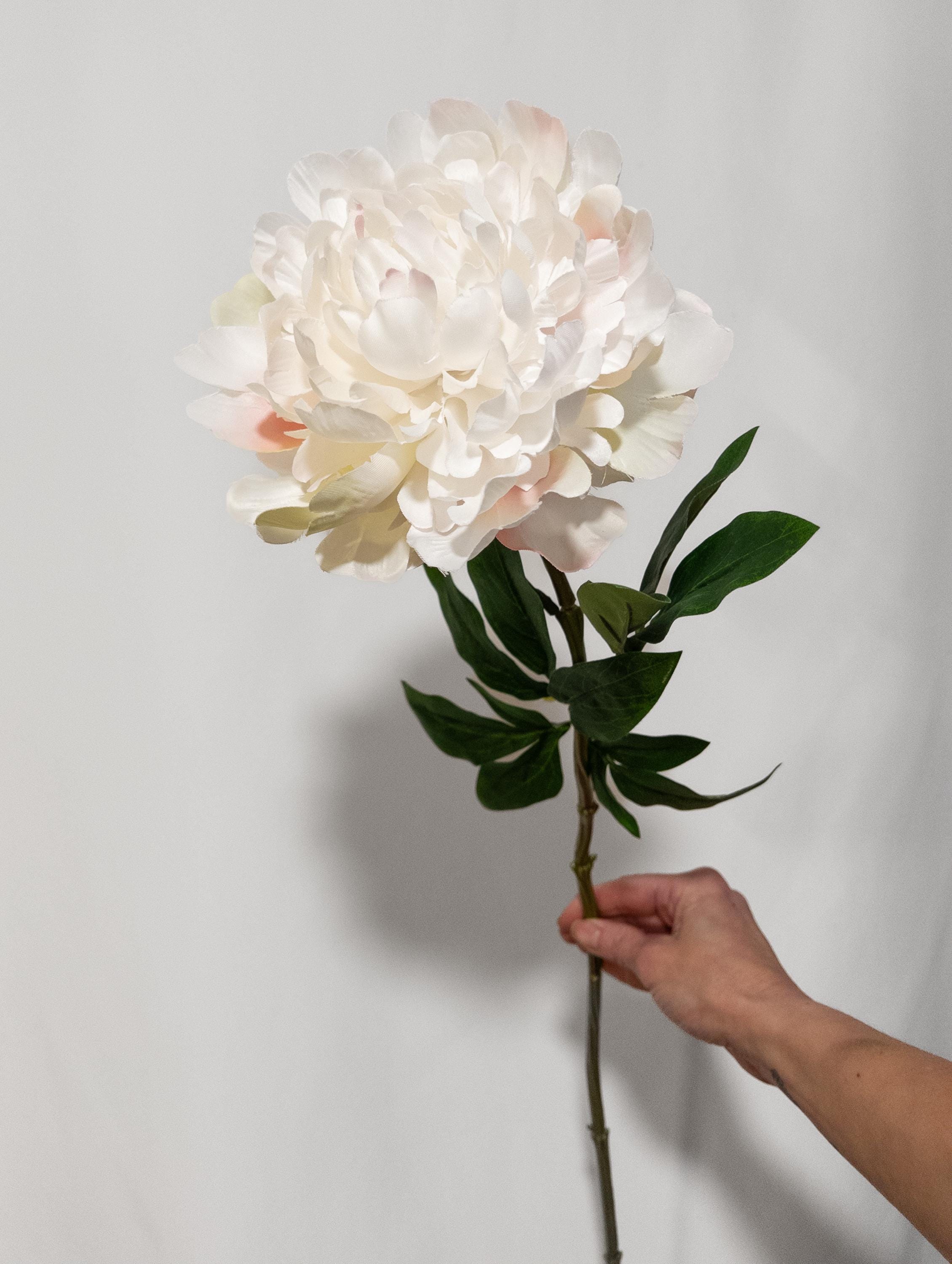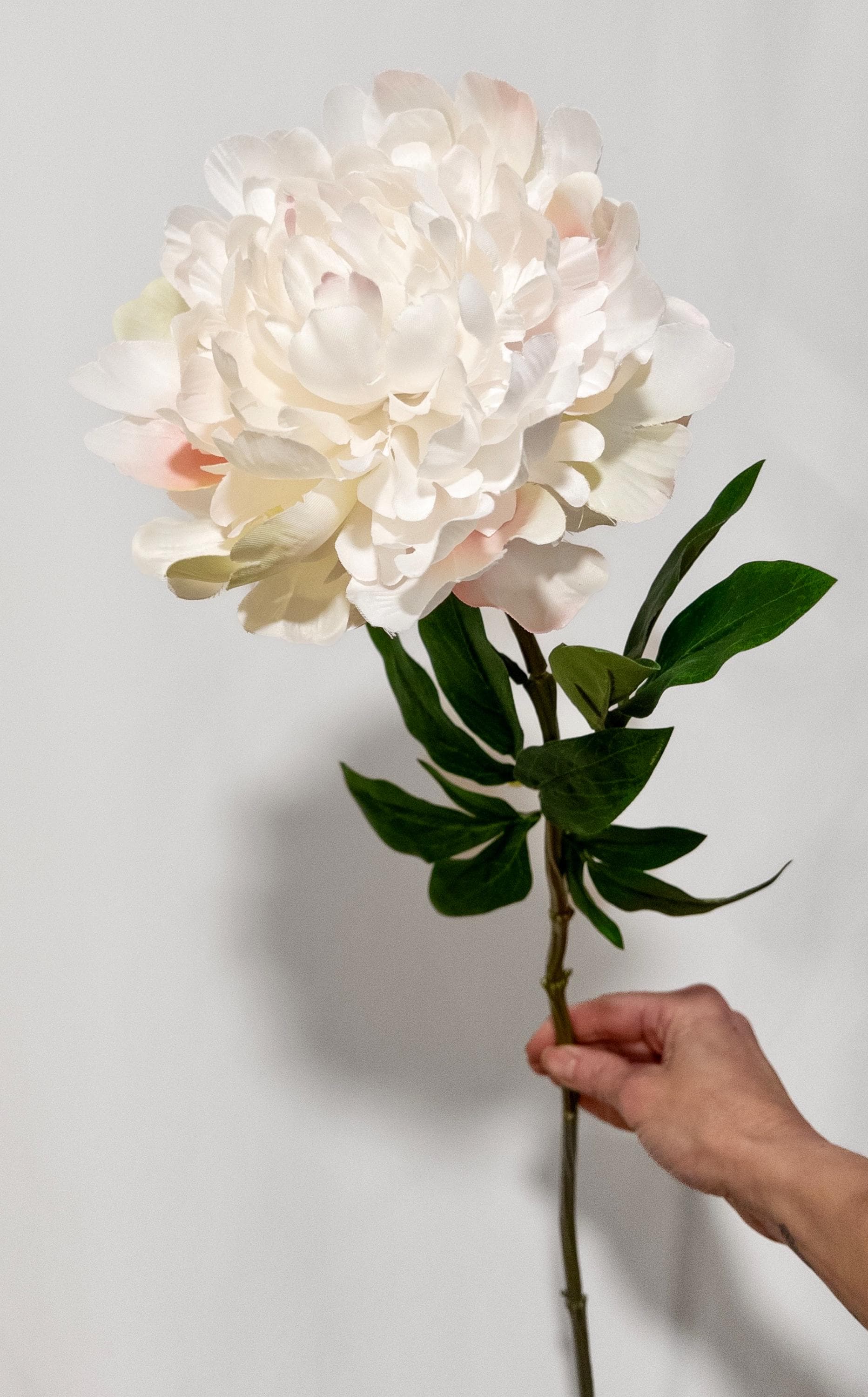 Bring lasting beauty into your space with these large artificial peony stems, each featuring a lush 7-inch bloom in soft ivory white with subtle blush and pale yellow-green accents. The 29.5-inch length offers versatile styling—perfect for tall vases, wedding centerpieces, or dramatic home arrangements. Each stem includes vibrant green foliage and a sturdy, bendable base for easy arranging.