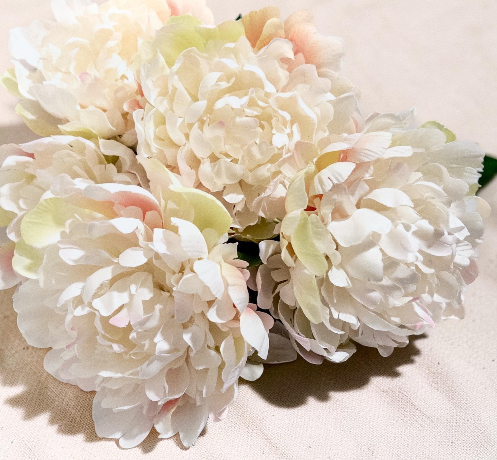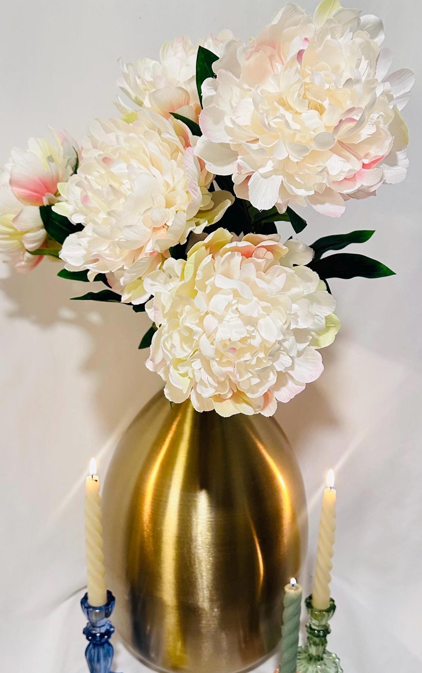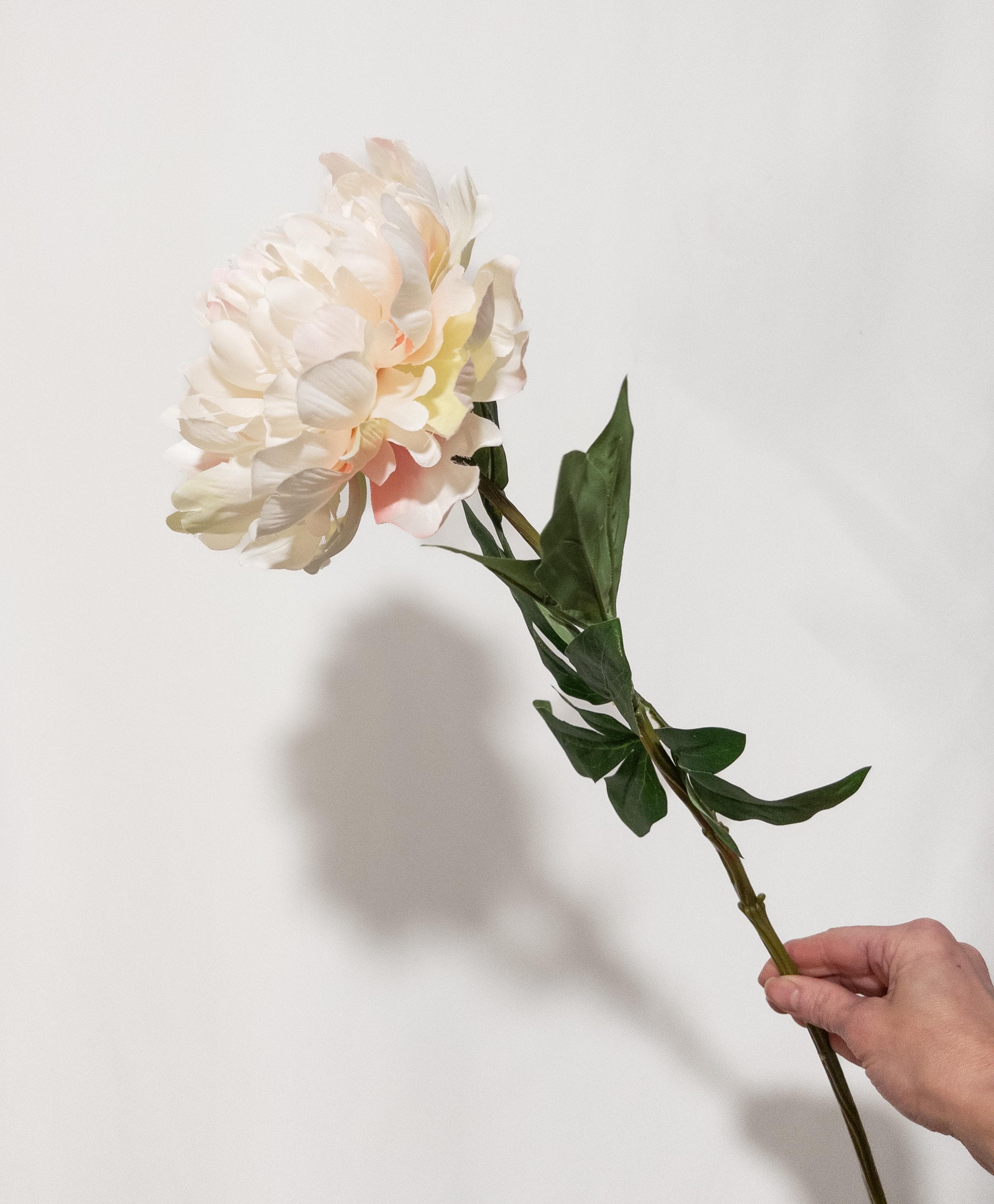 Bring lasting beauty into your space with these large artificial peony stems, each featuring a lush 7-inch bloom in soft ivory white with subtle blush and pale yellow-green accents. The 29.5-inch length offers versatile styling—perfect for tall vases, wedding centerpieces, or dramatic home arrangements. Each stem includes vibrant green foliage and a sturdy, bendable base for easy arranging.