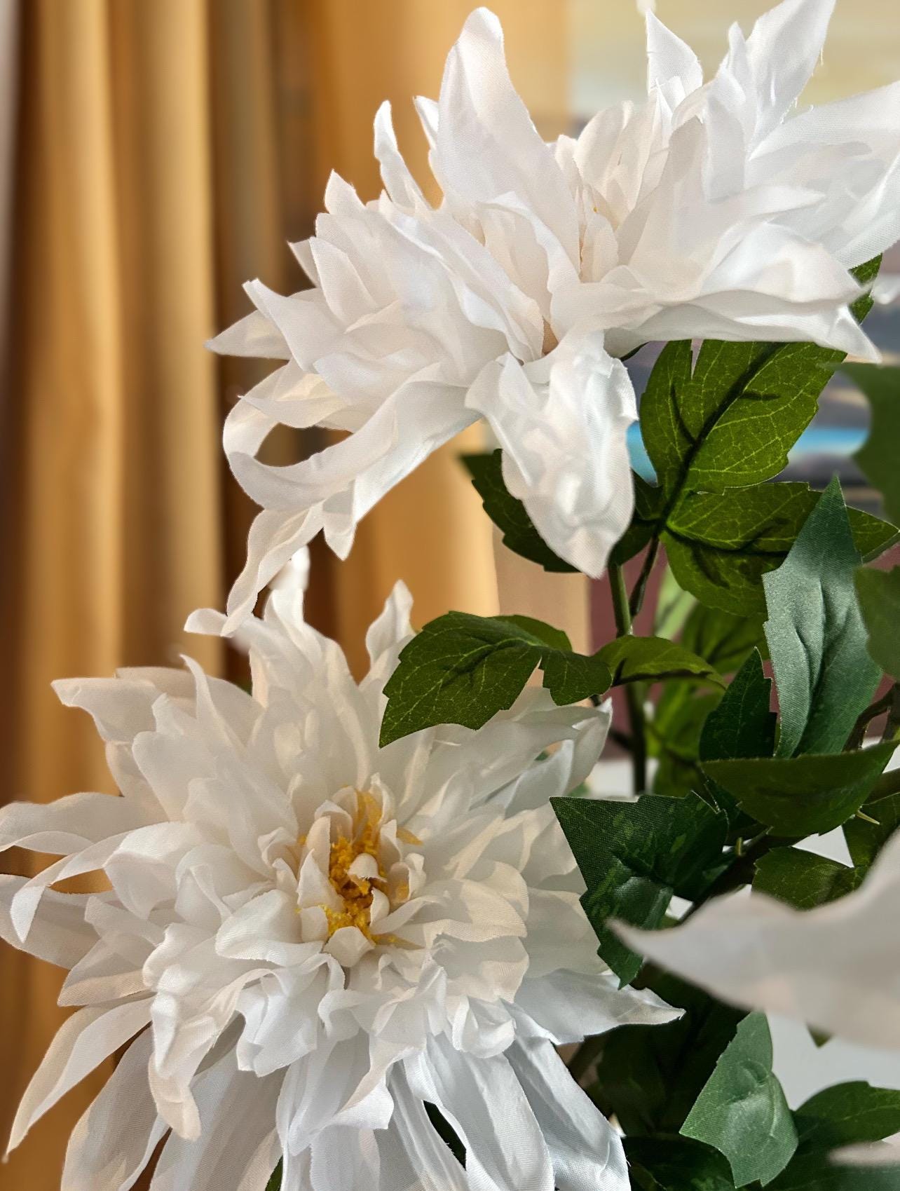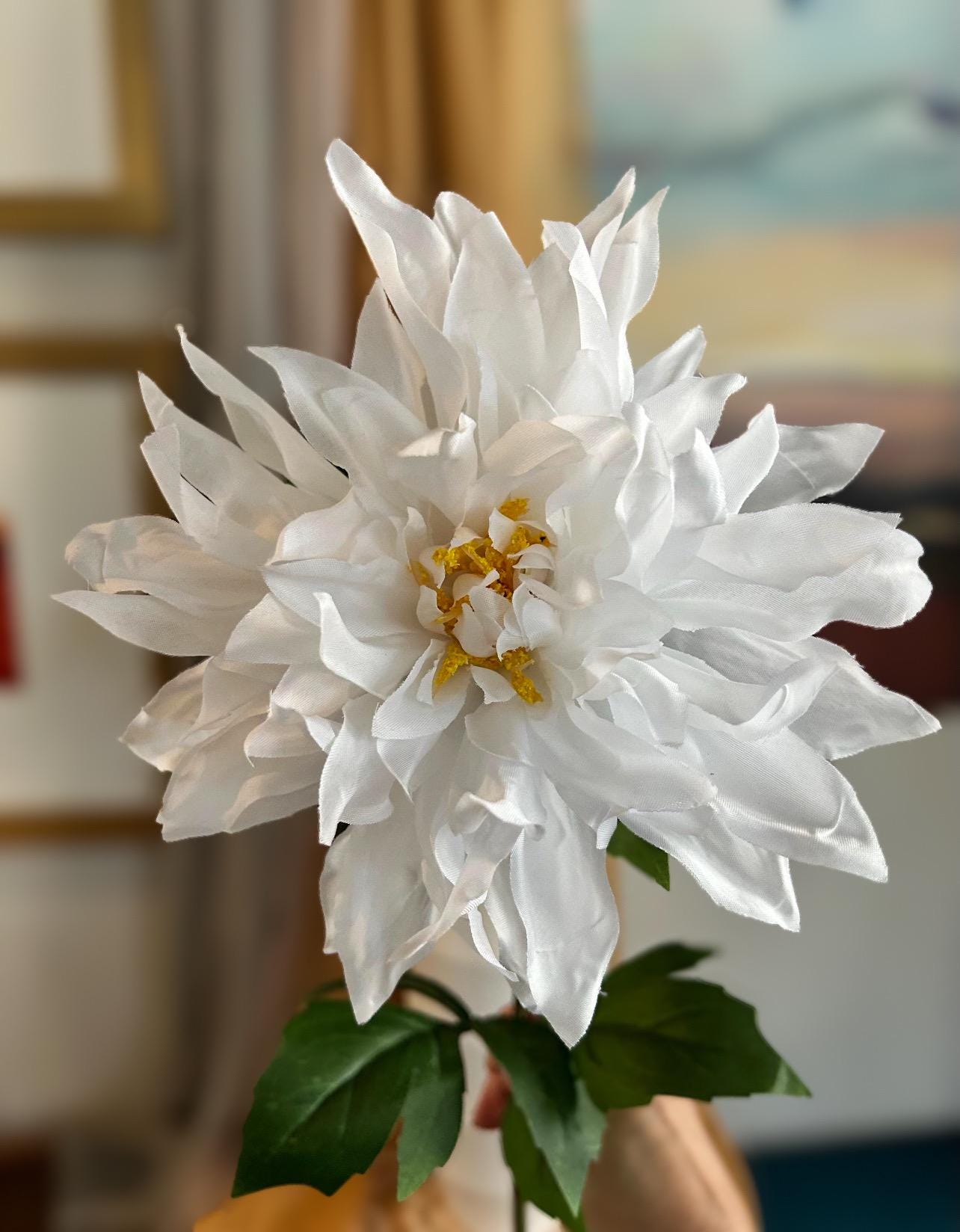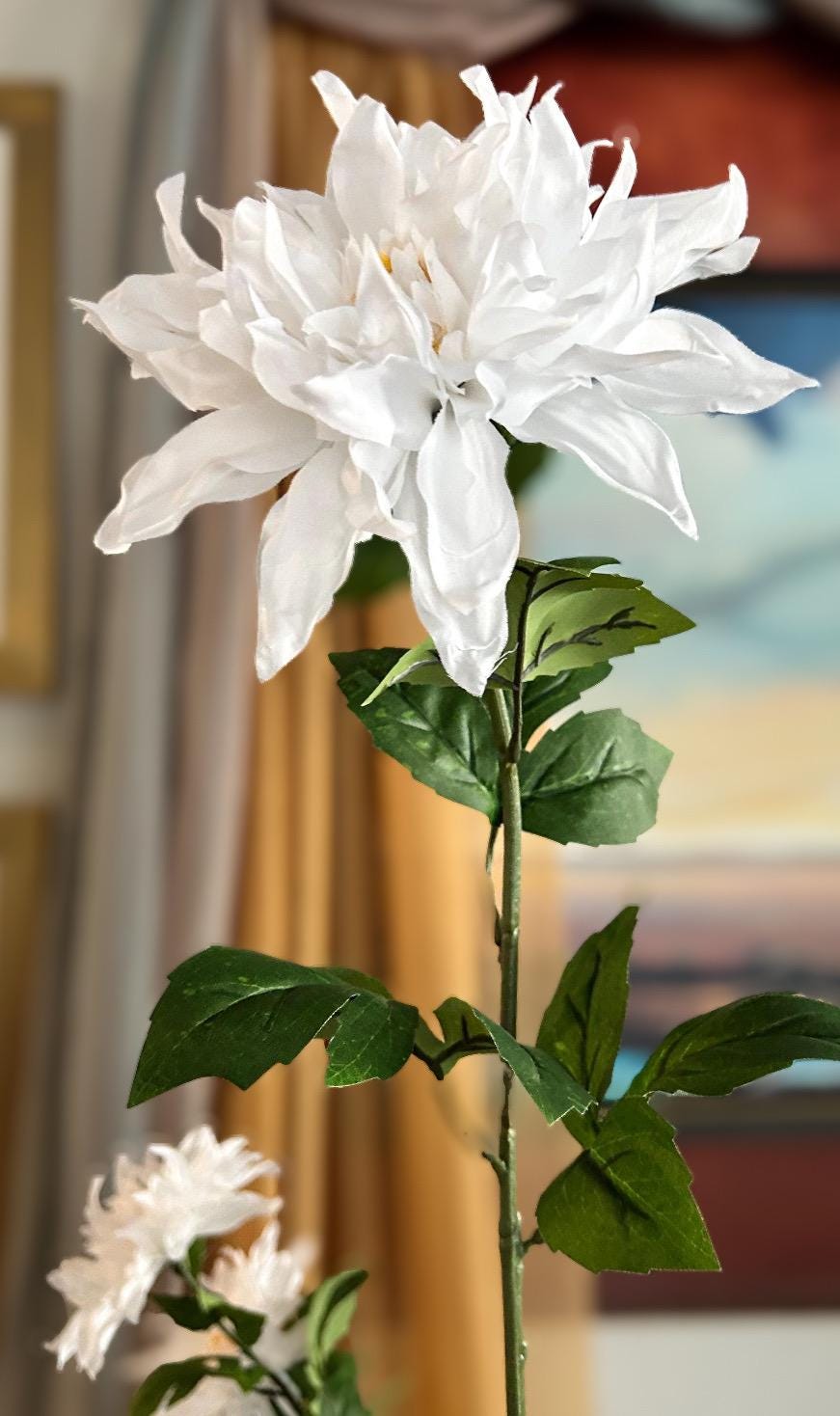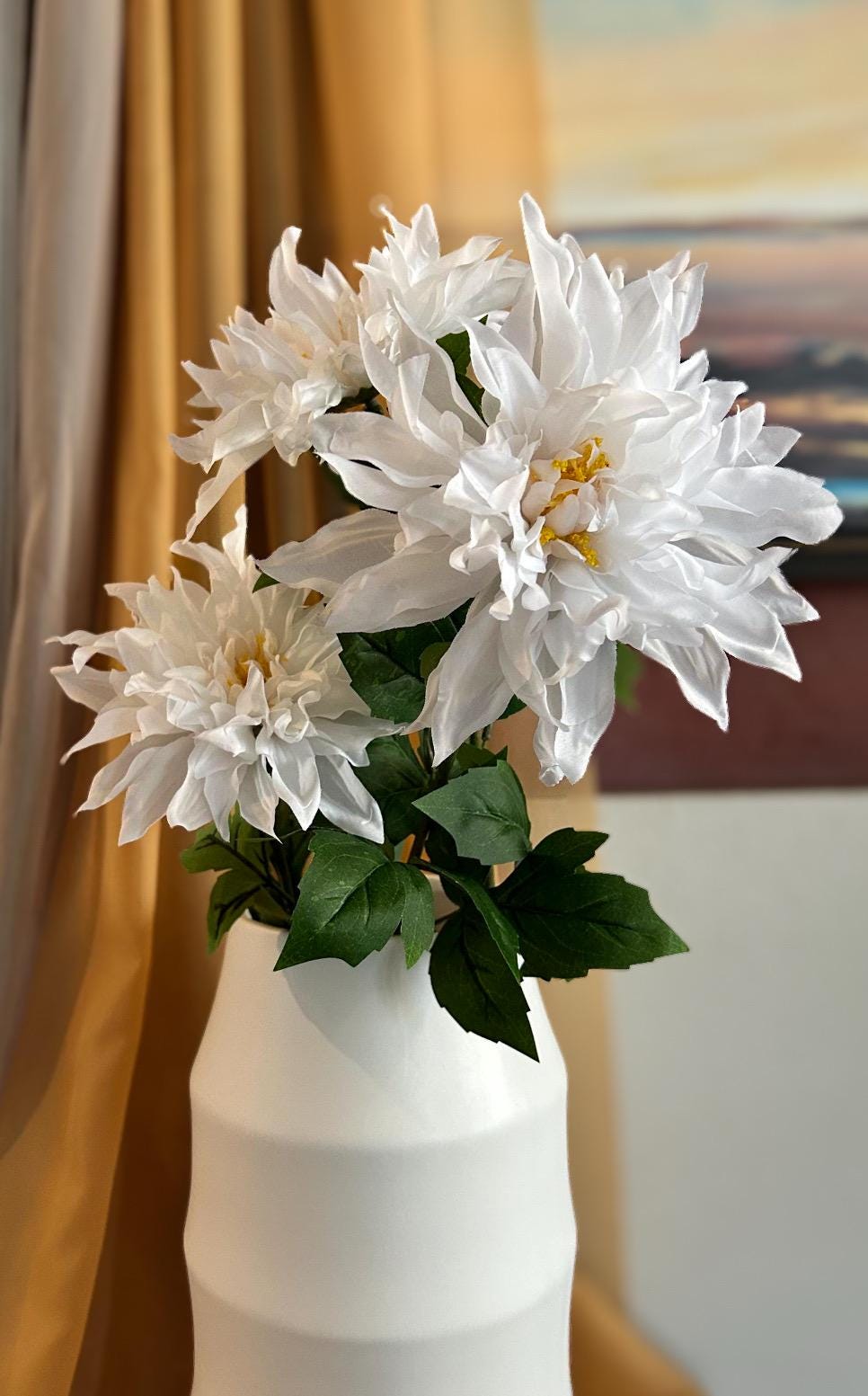 Bring timeless beauty to your space with these striking faux white dahlia stems. Each stem stands 29 inches tall and features a full, layered bloom approximately 7 inches in diameter. The soft ivory petals fan out in lush, sculptural waves, anchored by deep green leaves and a natural-looking stem.