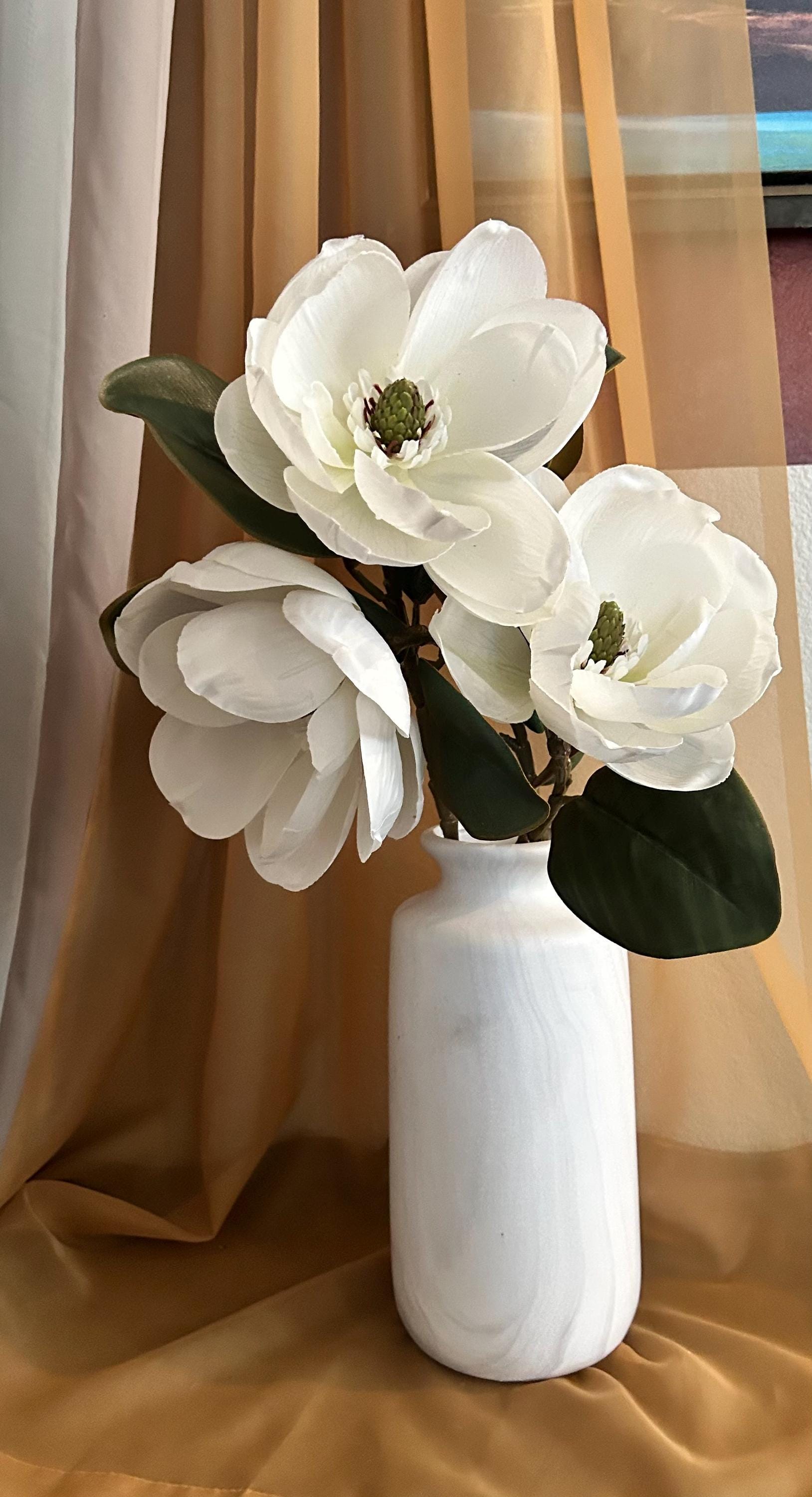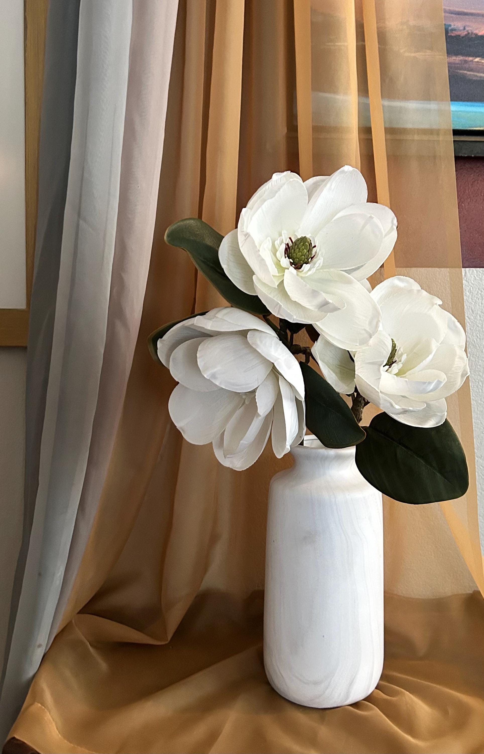 Item Details: ❀࿐ Includes individual artificial magnolia stems ❀࿐ Stem height: approx. 29.5” ❀࿐ Bloom diameter: approx. 7.5” ❀࿐ Soft, natural-touch white petals ❀࿐ Realistic green and copper-backed leaves ❀࿐ Flexible wire stem for easy shaping ❀࿐ Vase not included