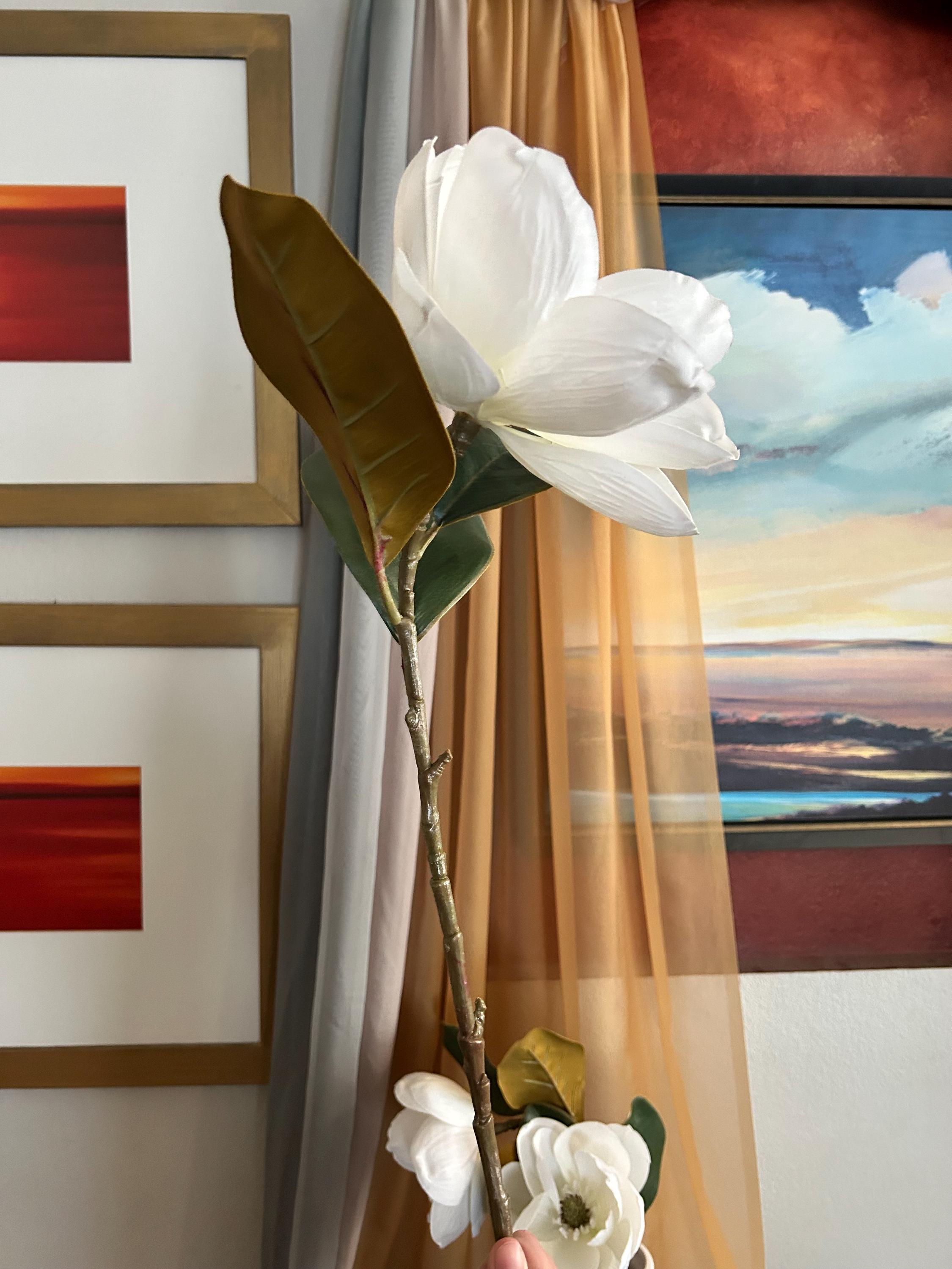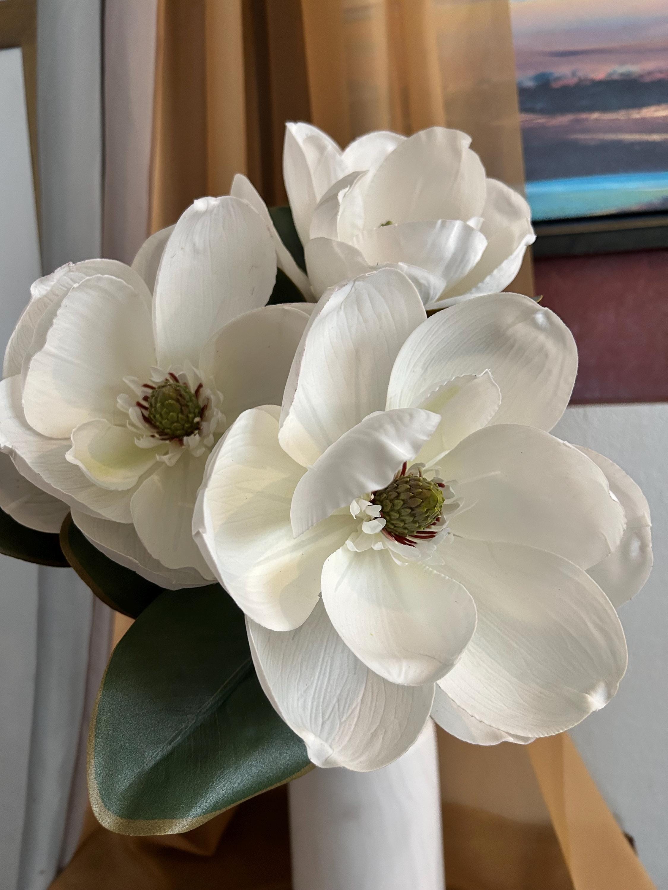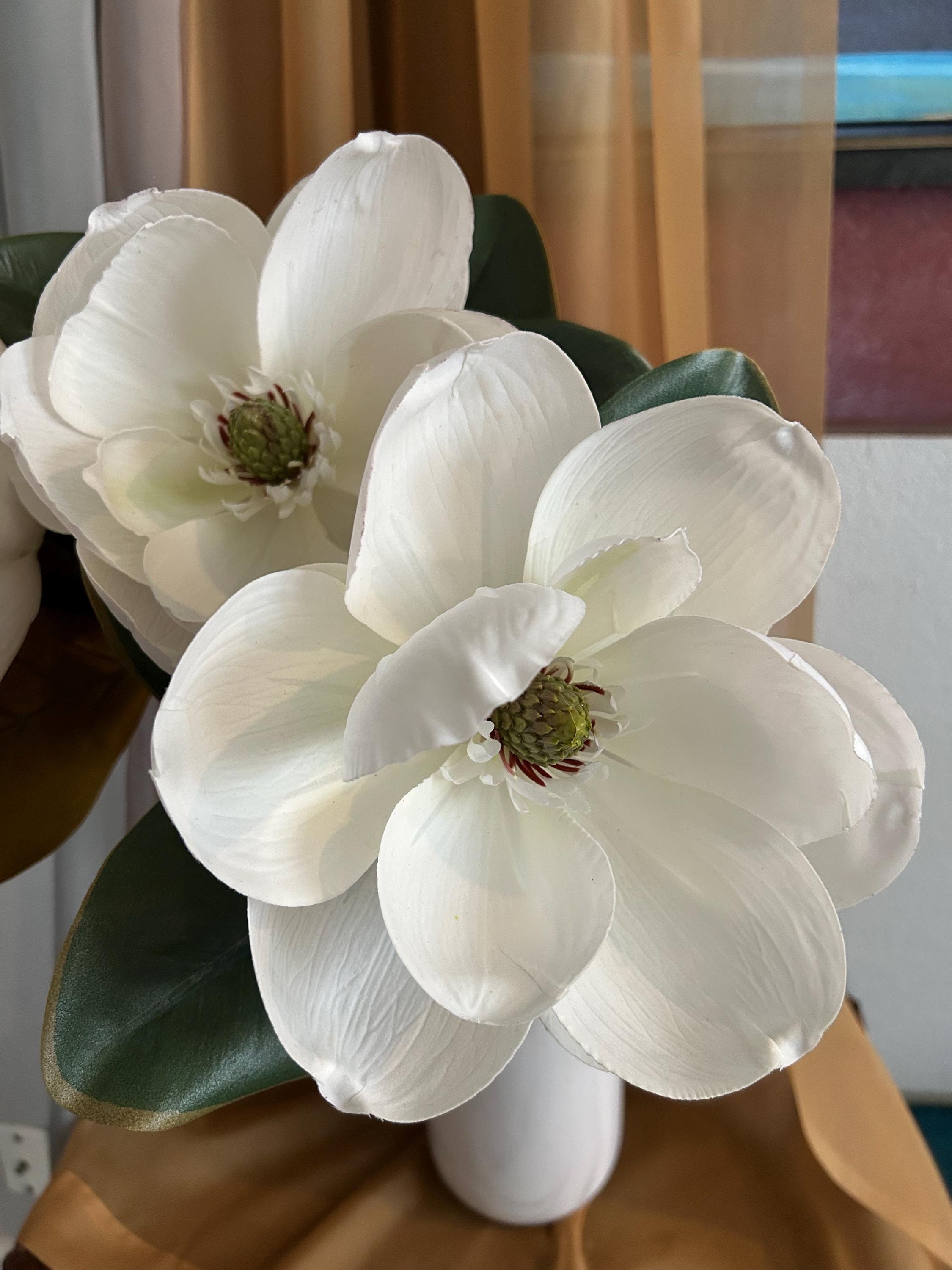 Bring timeless Southern elegance into your space with these large faux magnolia stems. Each stem measures approximately 29.5 inches tall and features a generous 7.5-inch white bloom with beautifully soft-to-the-touch petals. The realistic texture and detailing—from the velvety magnolia leaves to the lifelike cone centers—make these stems a sophisticated choice for home décor or event styling.
