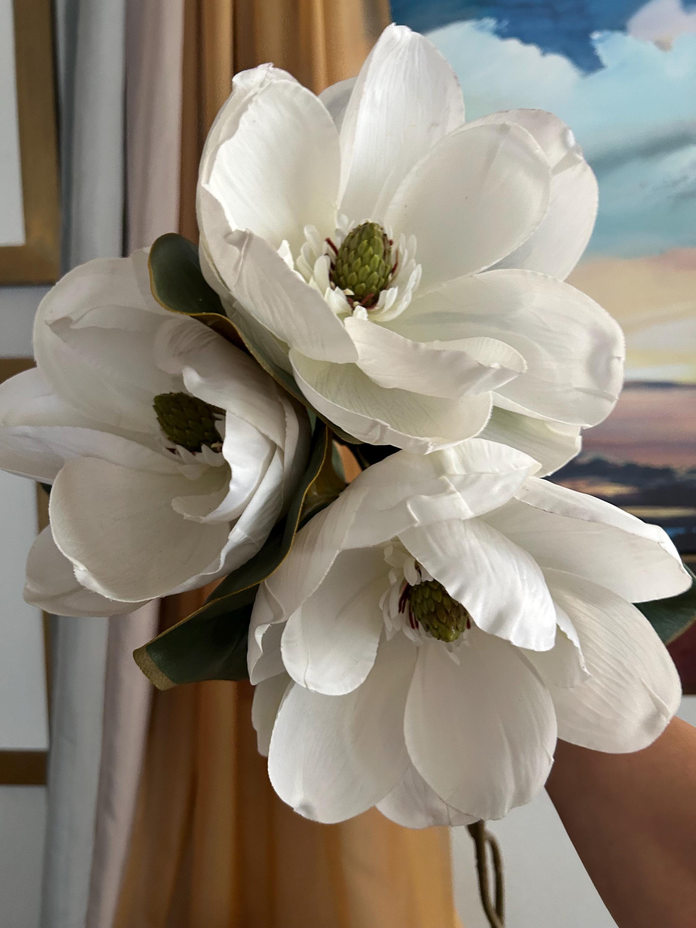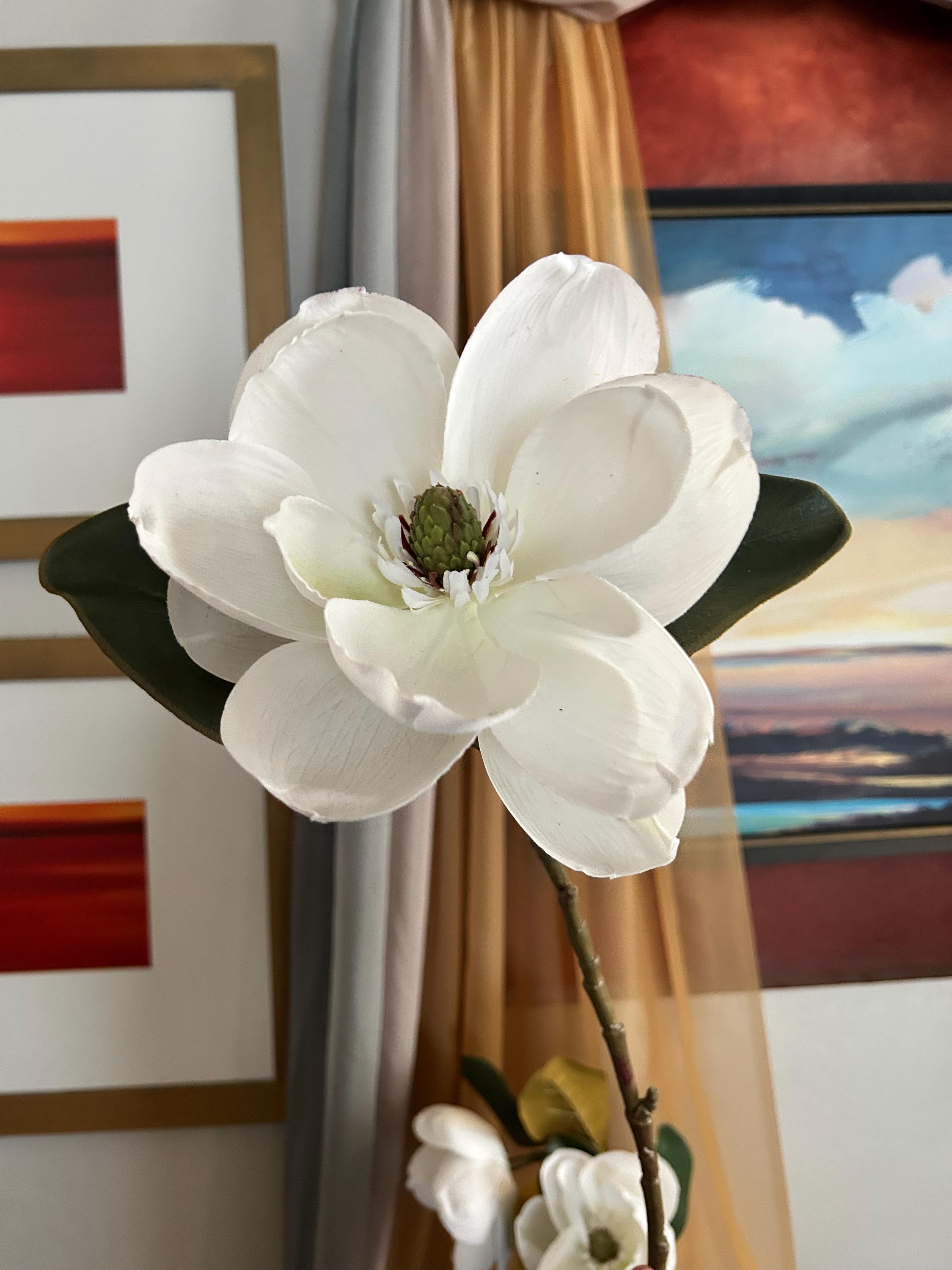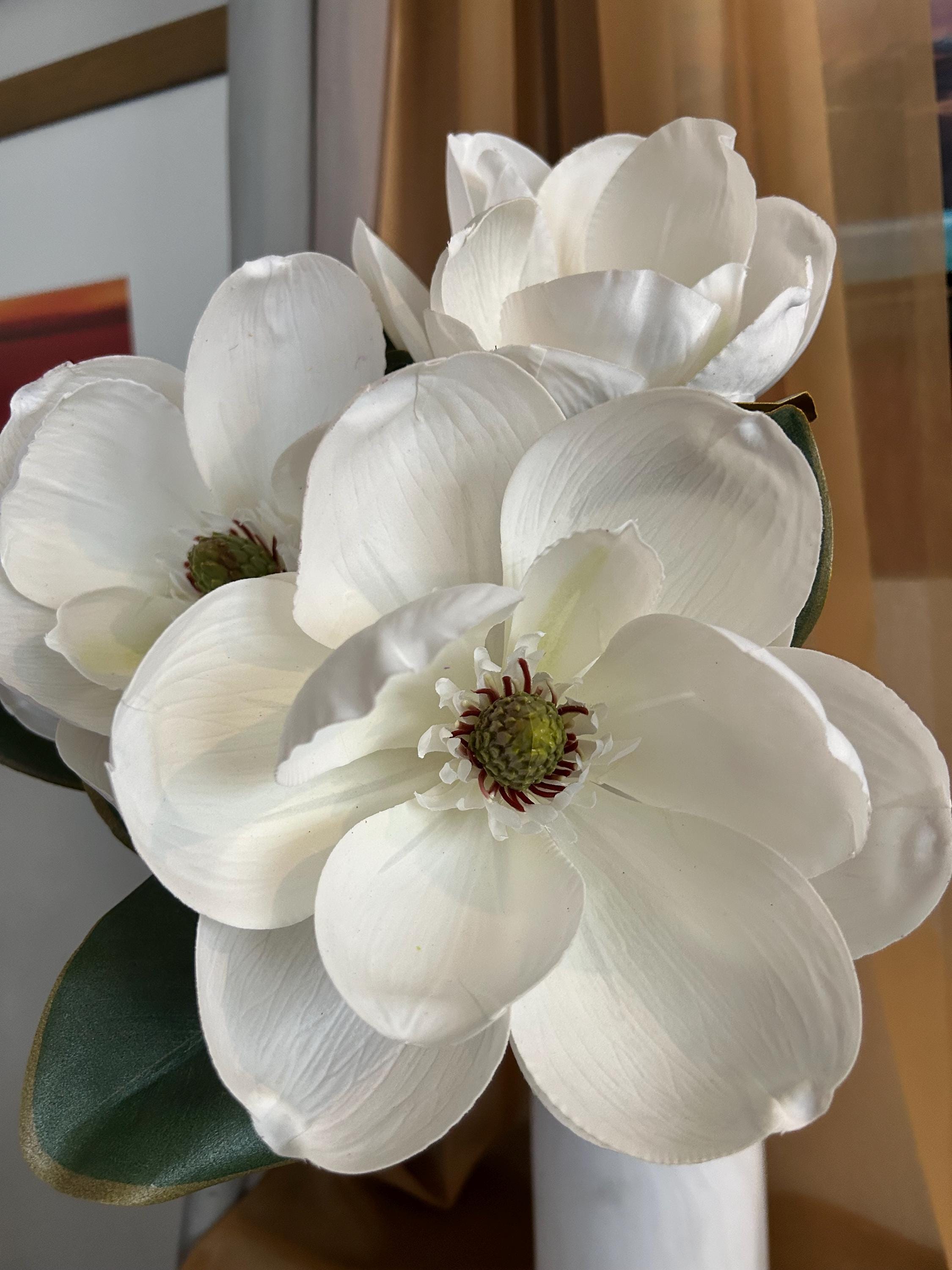Bring timeless Southern elegance into your space with these large faux magnolia stems. Each stem measures approximately 29.5 inches tall and features a generous 7.5-inch white bloom with beautifully soft-to-the-touch petals. The realistic texture and detailing—from the velvety magnolia leaves to the lifelike cone centers—make these stems a sophisticated choice for home décor or event styling.