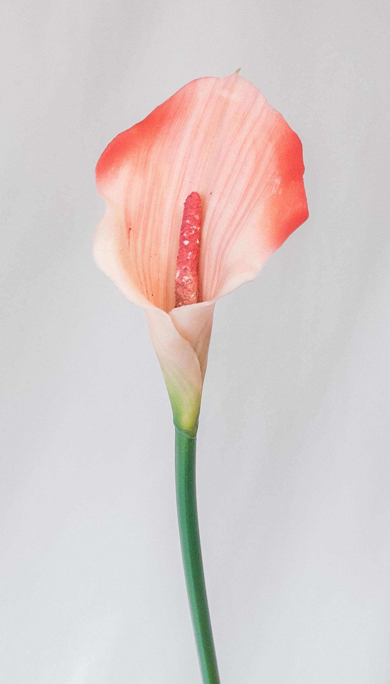 Add a striking accent to your floral designs with this Pink Faux Calla Lily stem. Measuring approximately 19 inches long, each stem features a 3-inch-wide bloom with a vibrant ombré fade from creamy blush to vivid pink. The smooth green stem transitions to a pale base, mimicking the look of a fresh cut flower, for a hyper-realistic finish.