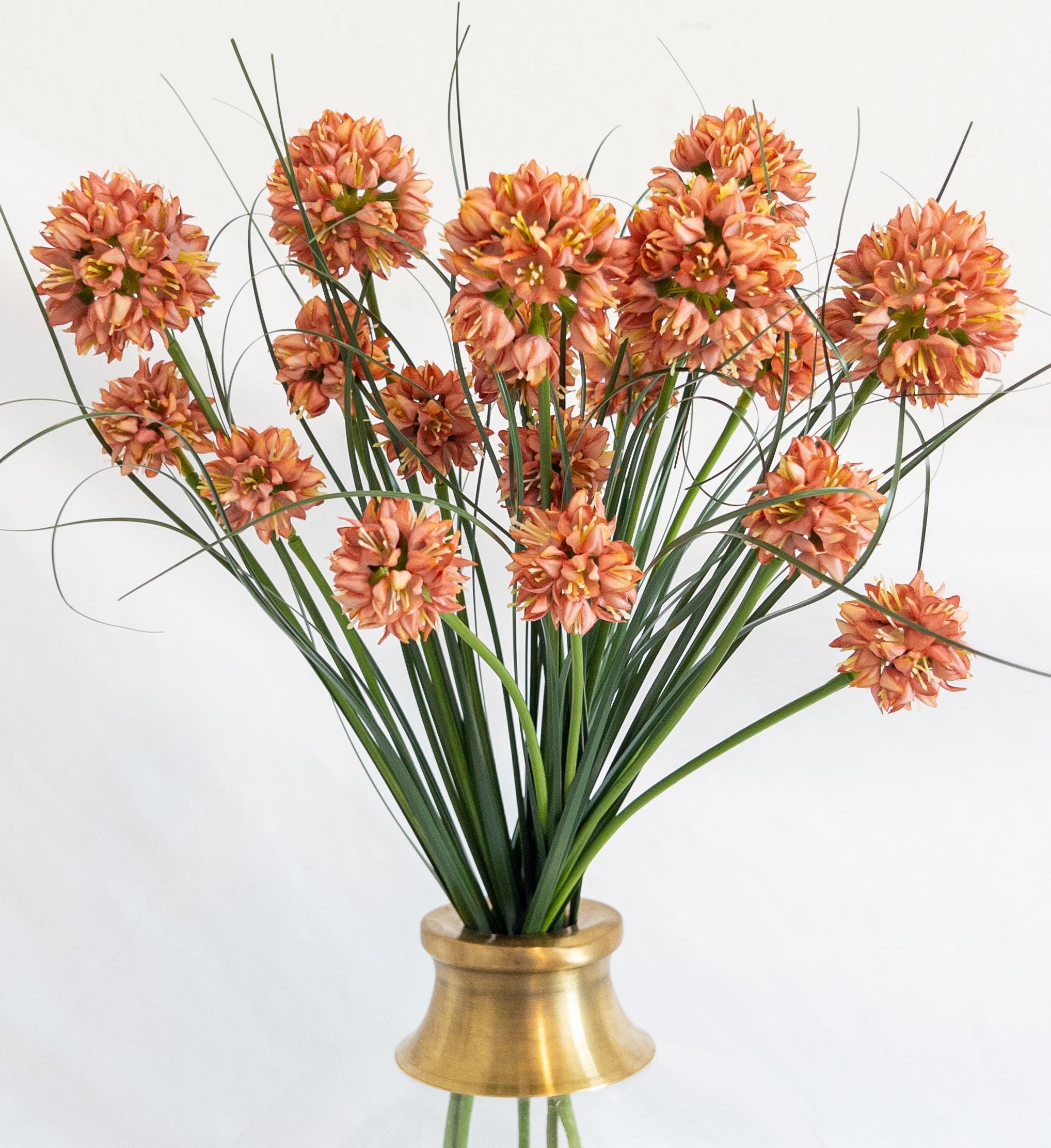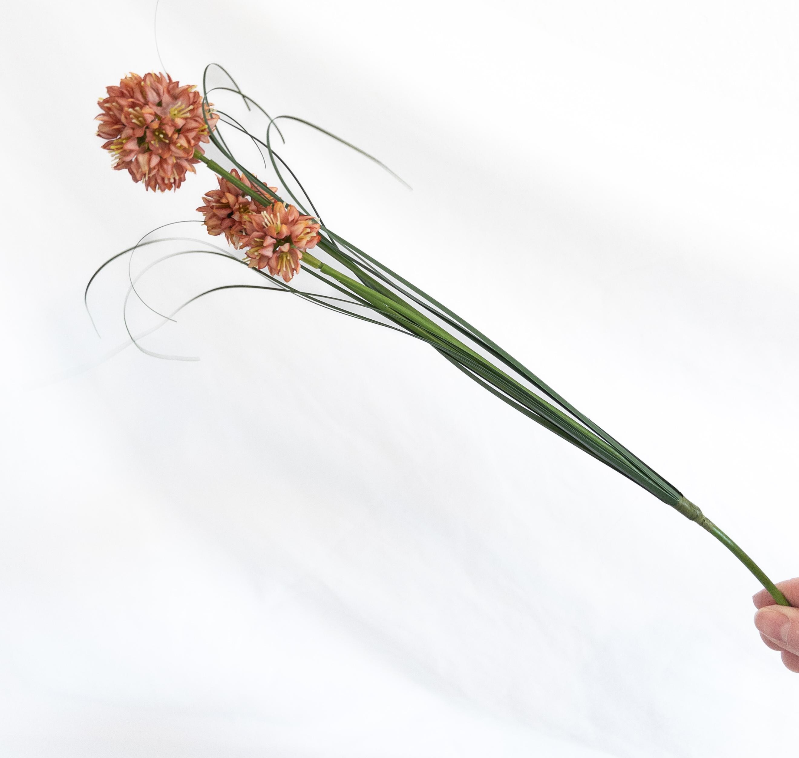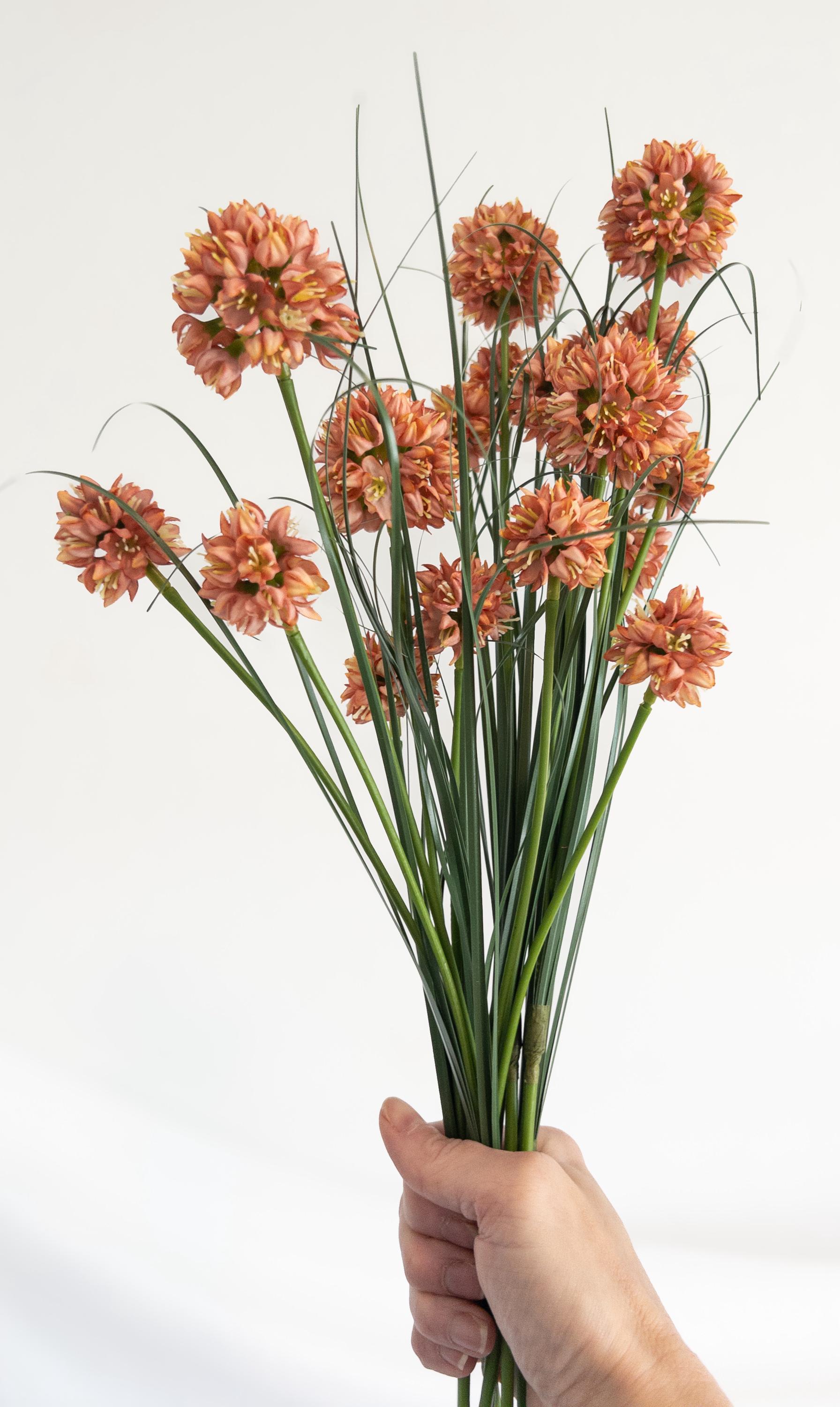 Bring a breezy, meadow-fresh feel to your space with this faux allium onion grass stem. Each stem stands approximately 19 inches tall and features three globe-shaped blooms with soft, fluttery petals in peachy pink and coral hues —perfect for adding gentle texture and whimsy to your arrangements.
