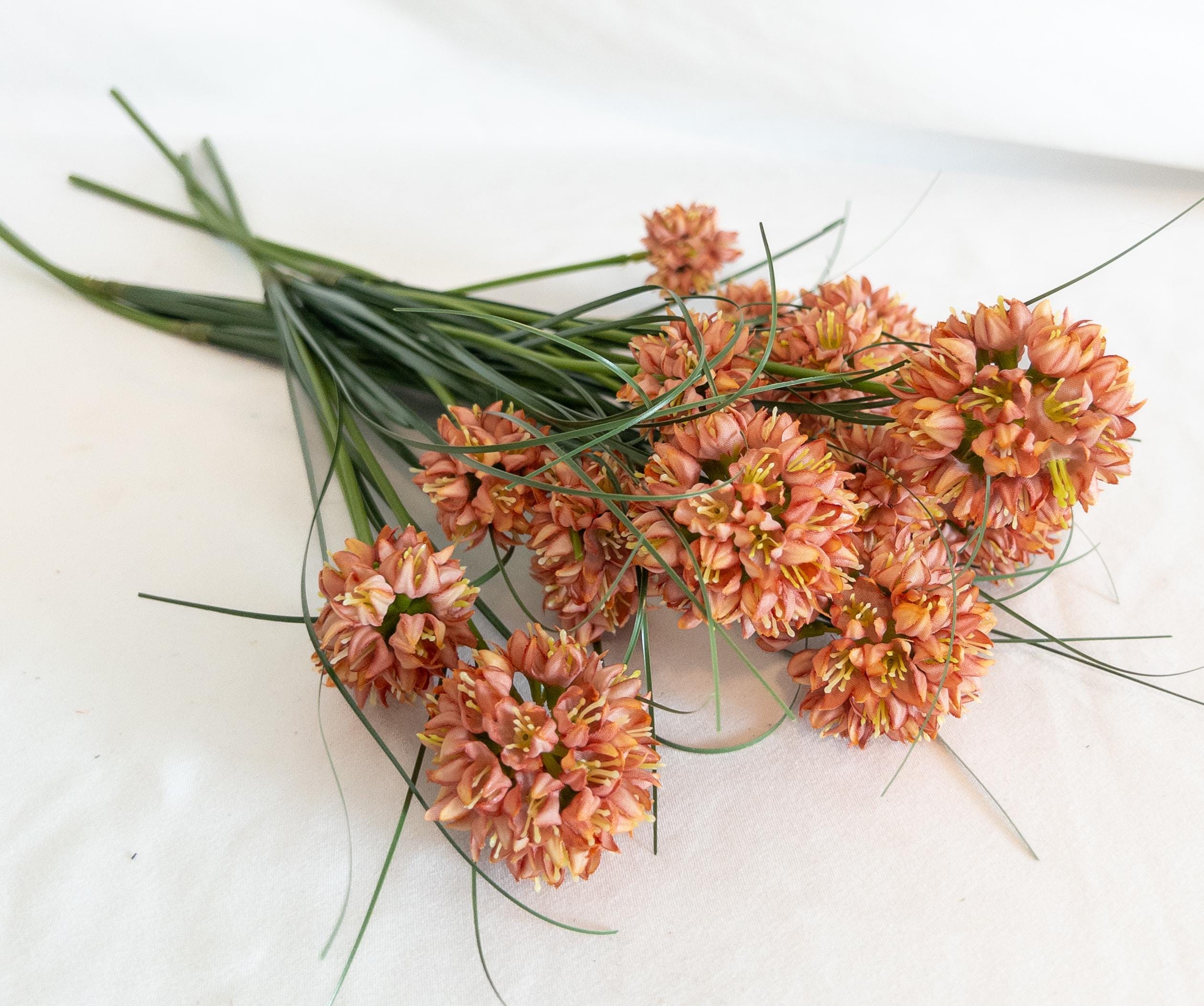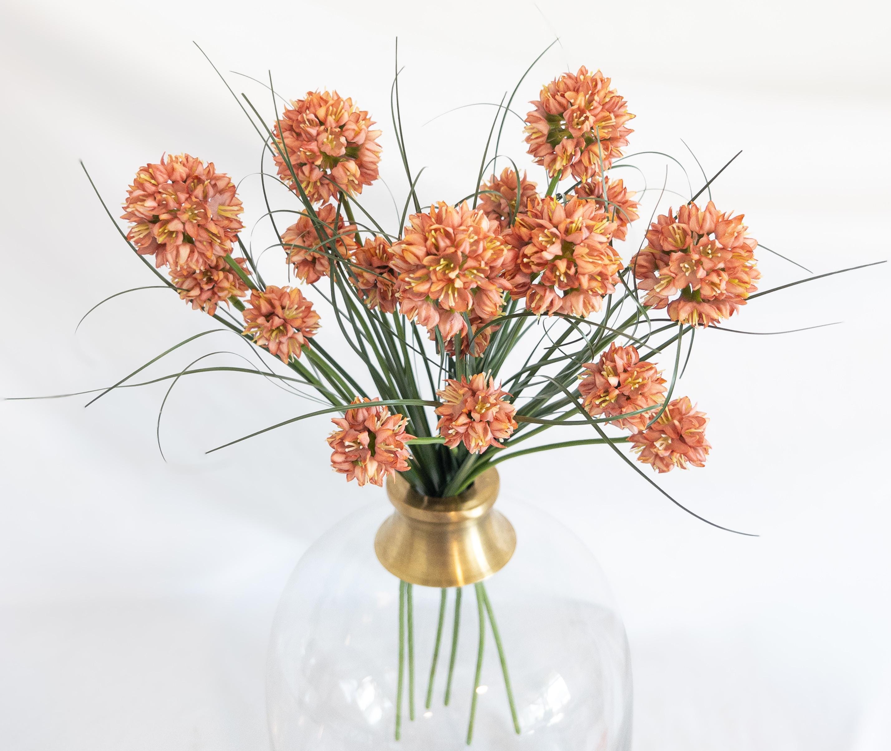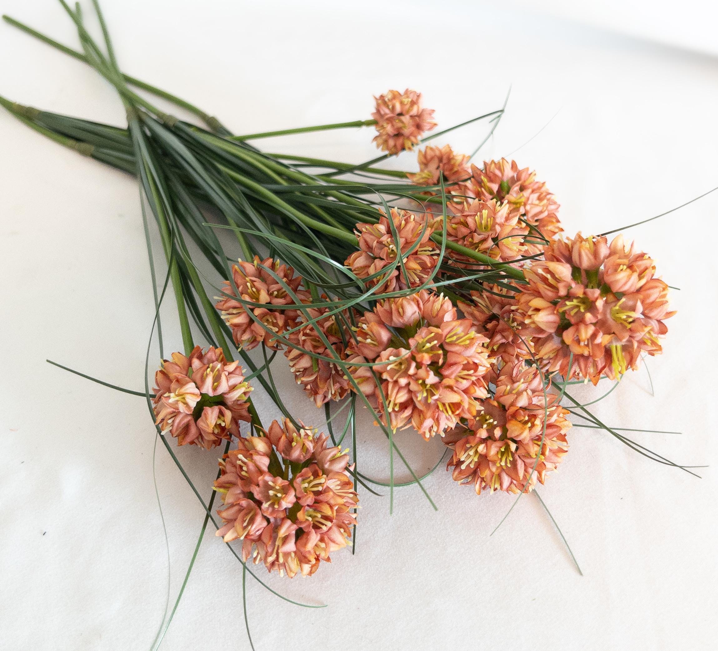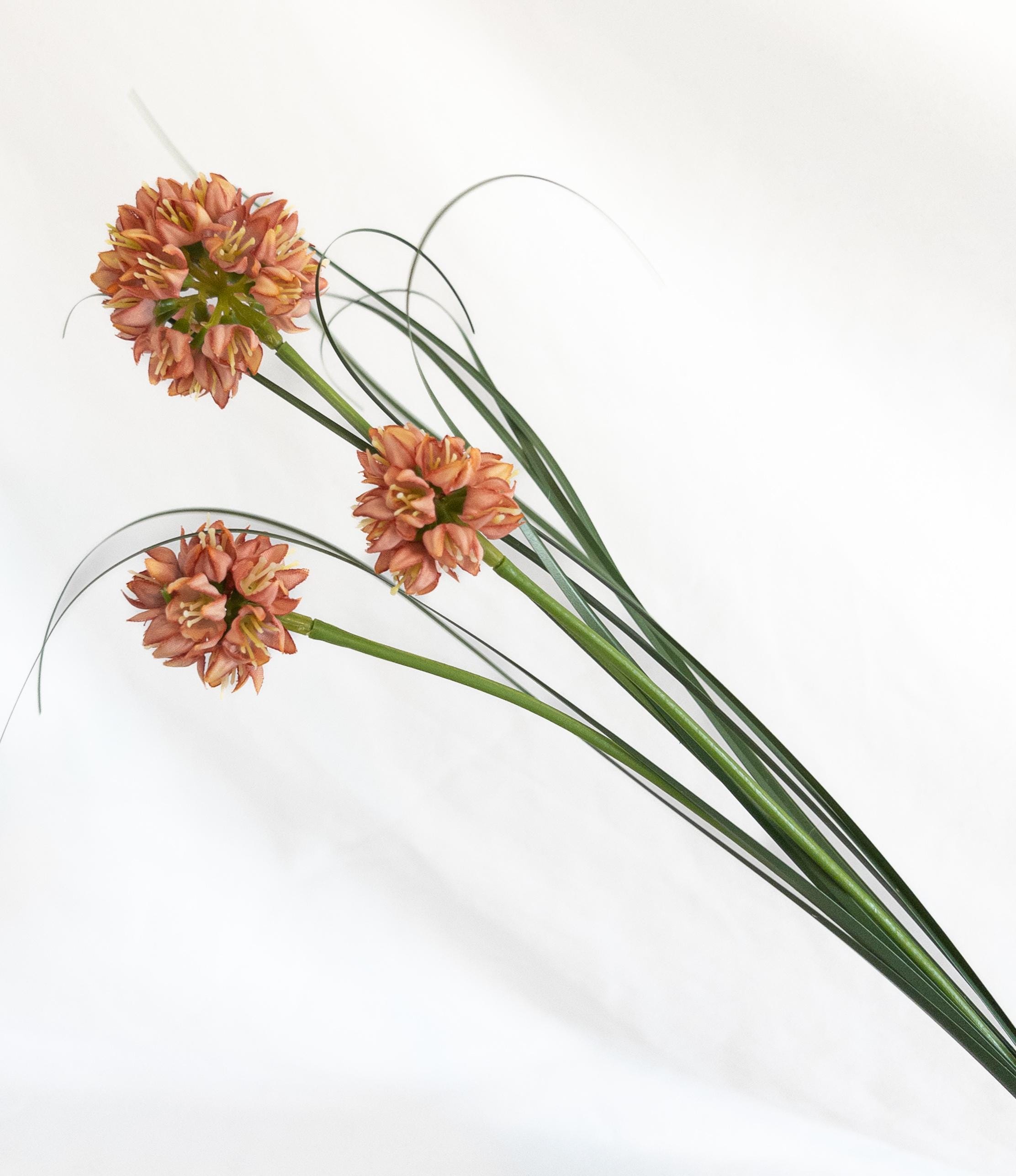 Details: • Sold individually - listing is for 1 stem • Height: approx. 19 inches • Each stem includes 3 blooms • Bloom diameter: 1.5” to 2” • Soft peach, pink and coral tones • Whimsical onion grass details • Indoor use only