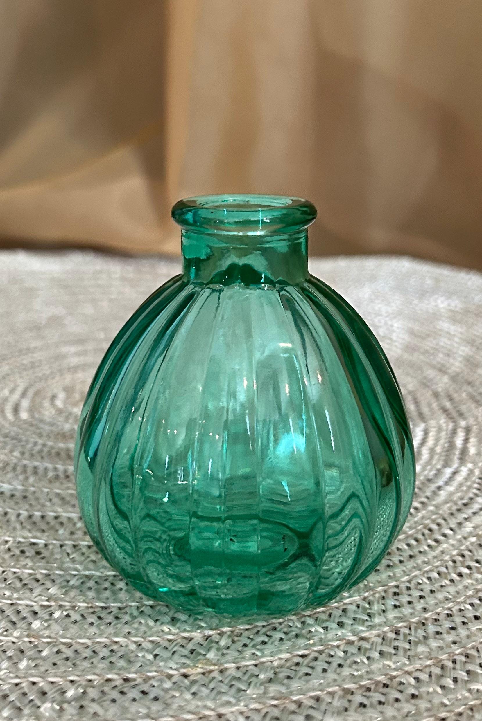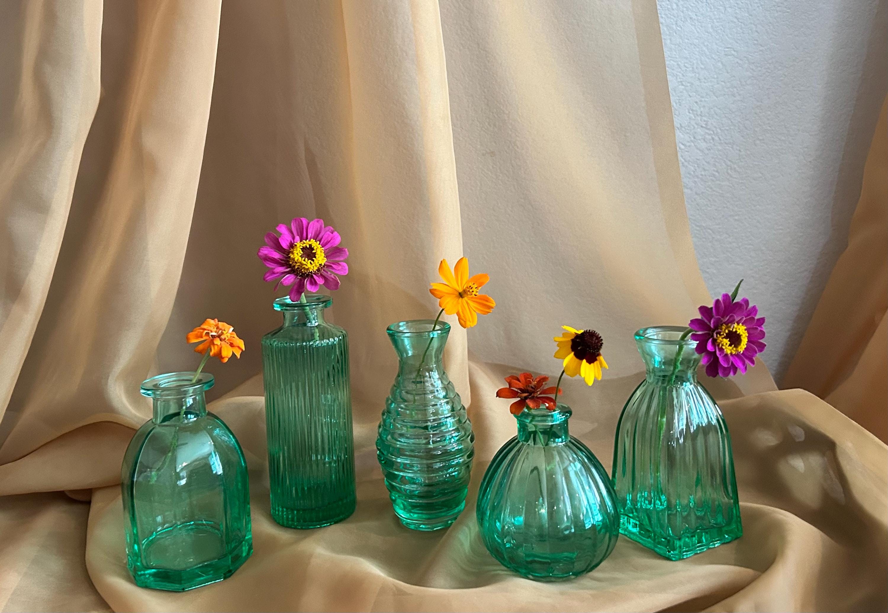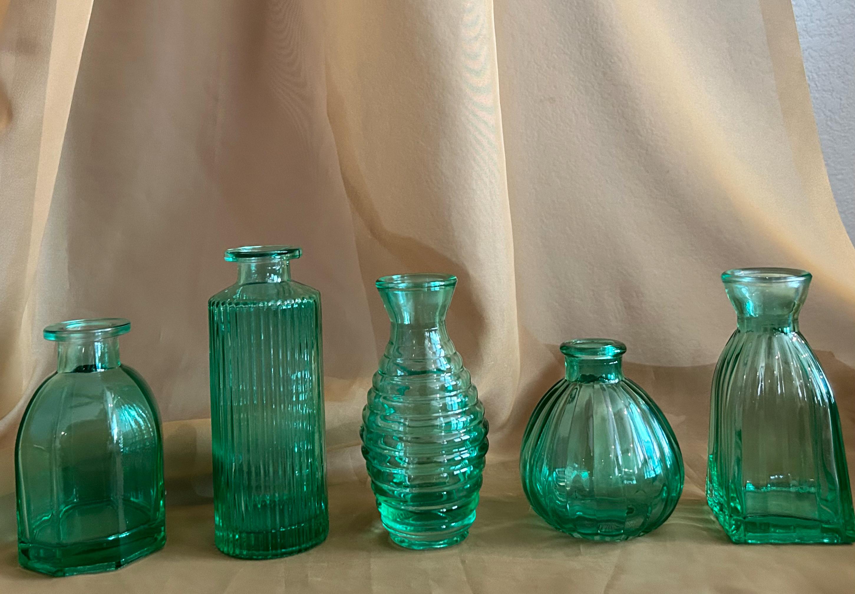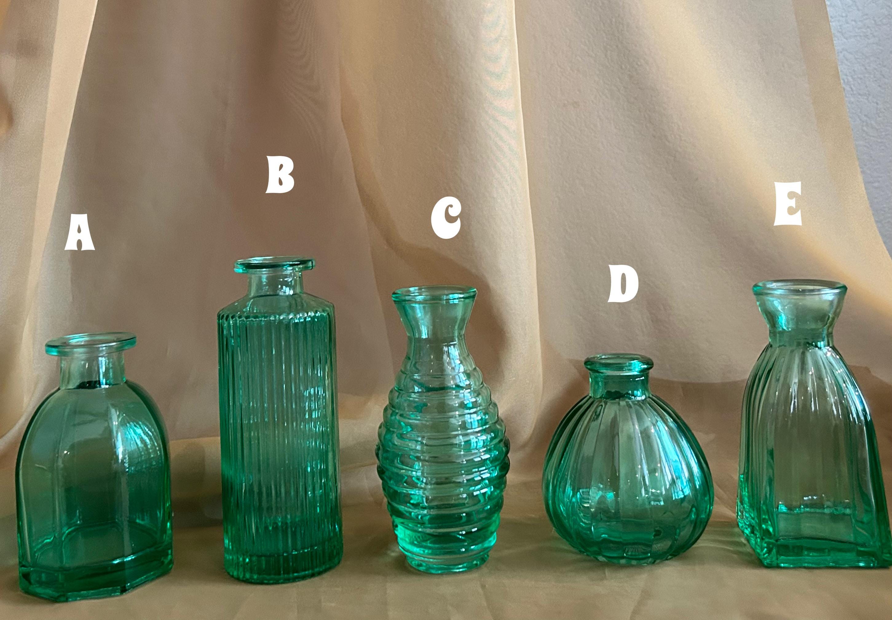 Add a touch of timeless charm with these lovely emerald-teal bud vases, each uniquely shaped to complement a variety of arrangements and vignettes. Their soft sea-glass coloring and sculptural forms make them perfect for displaying single stems, petite wildflowers, or simply enjoying as decorative glassware.