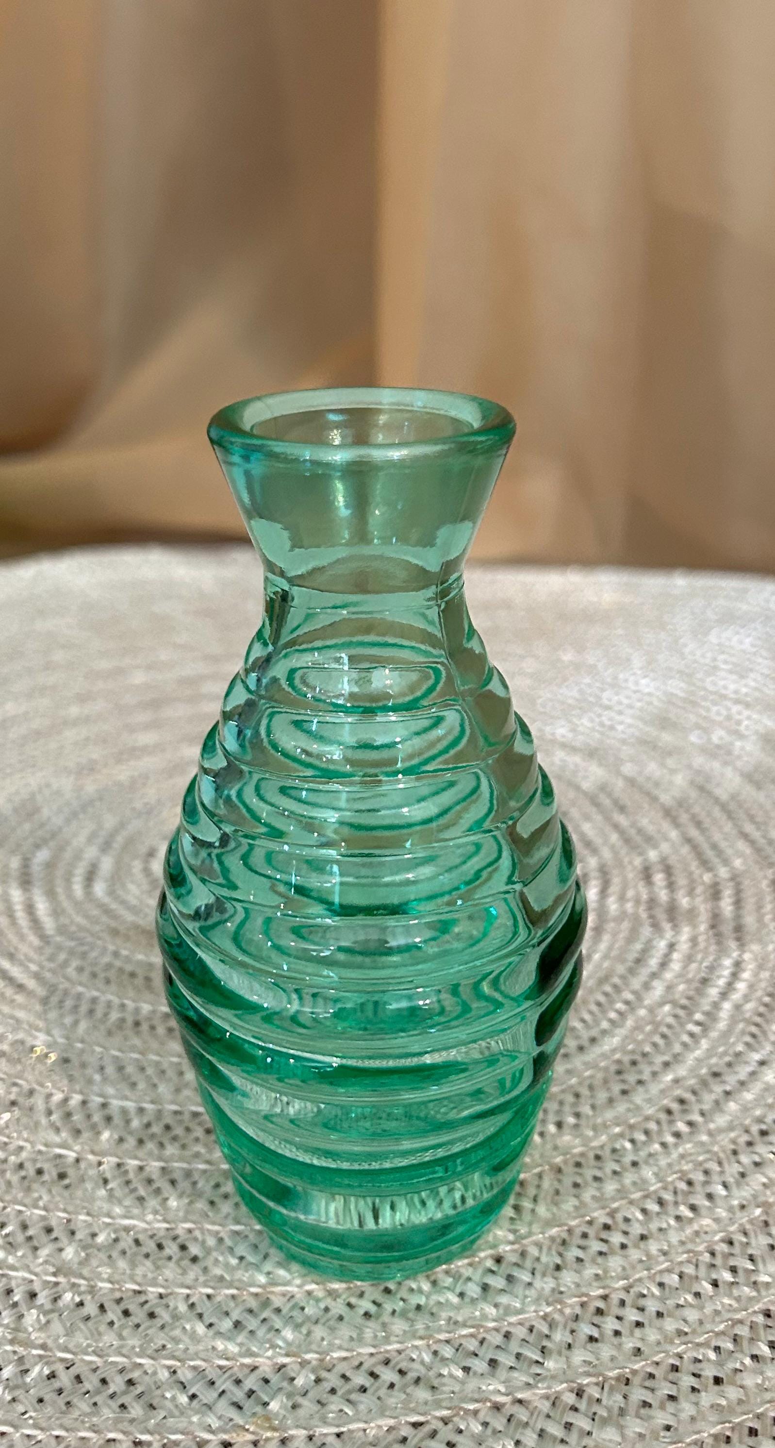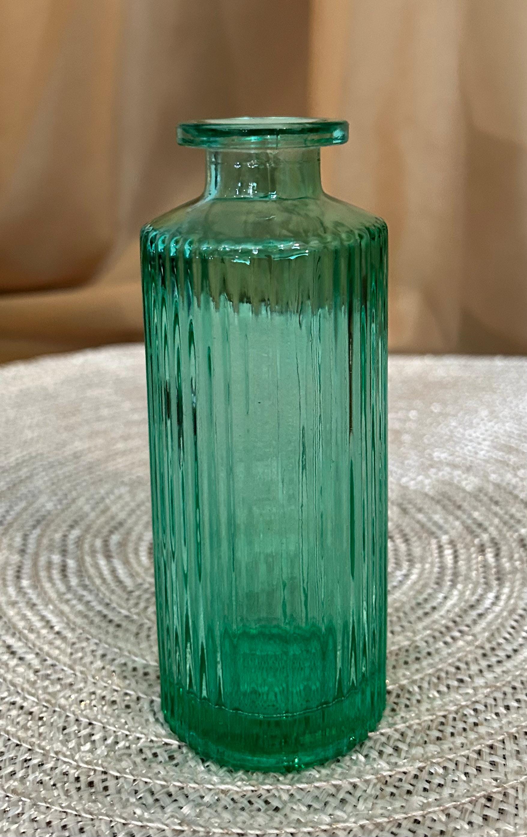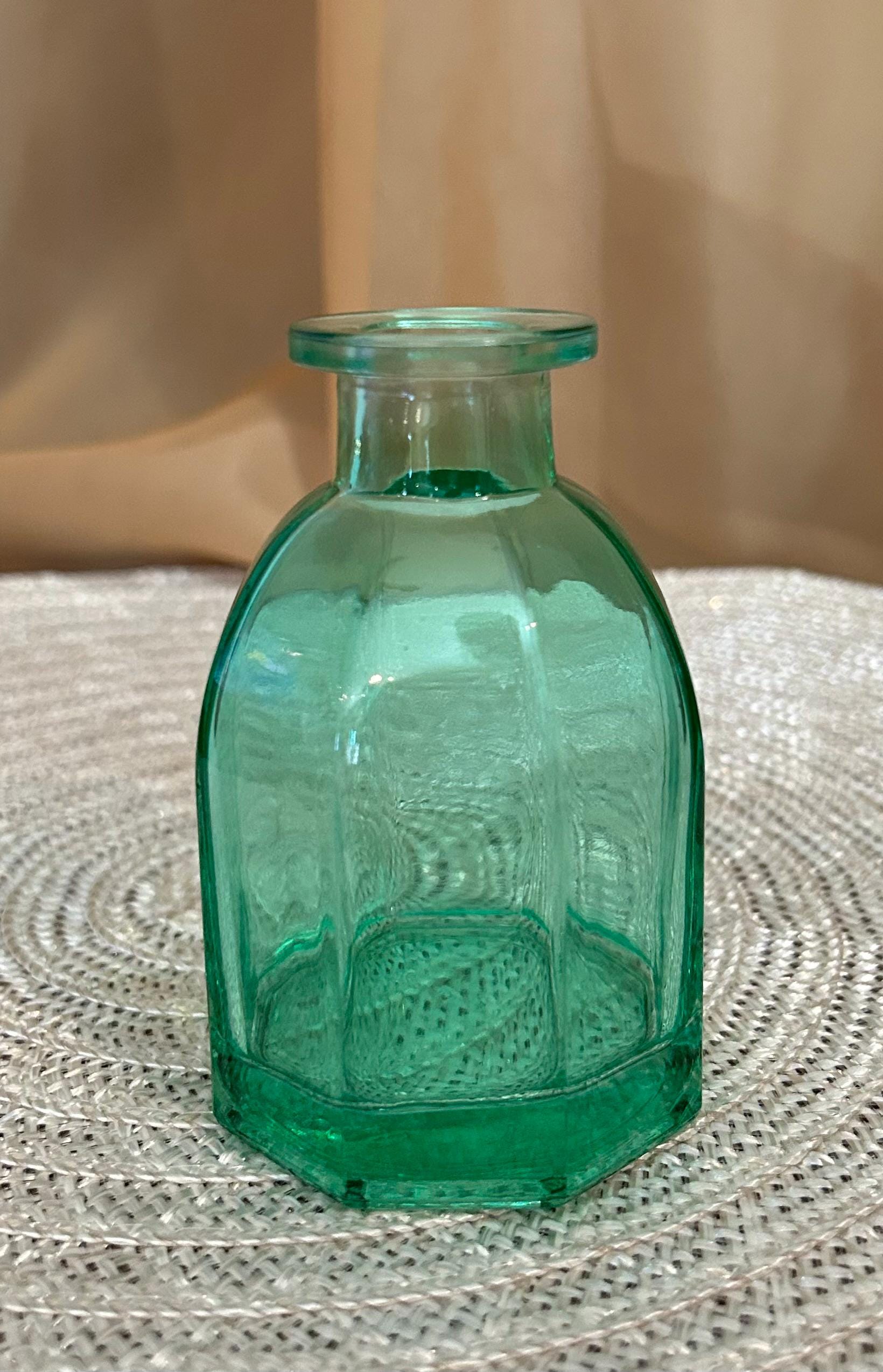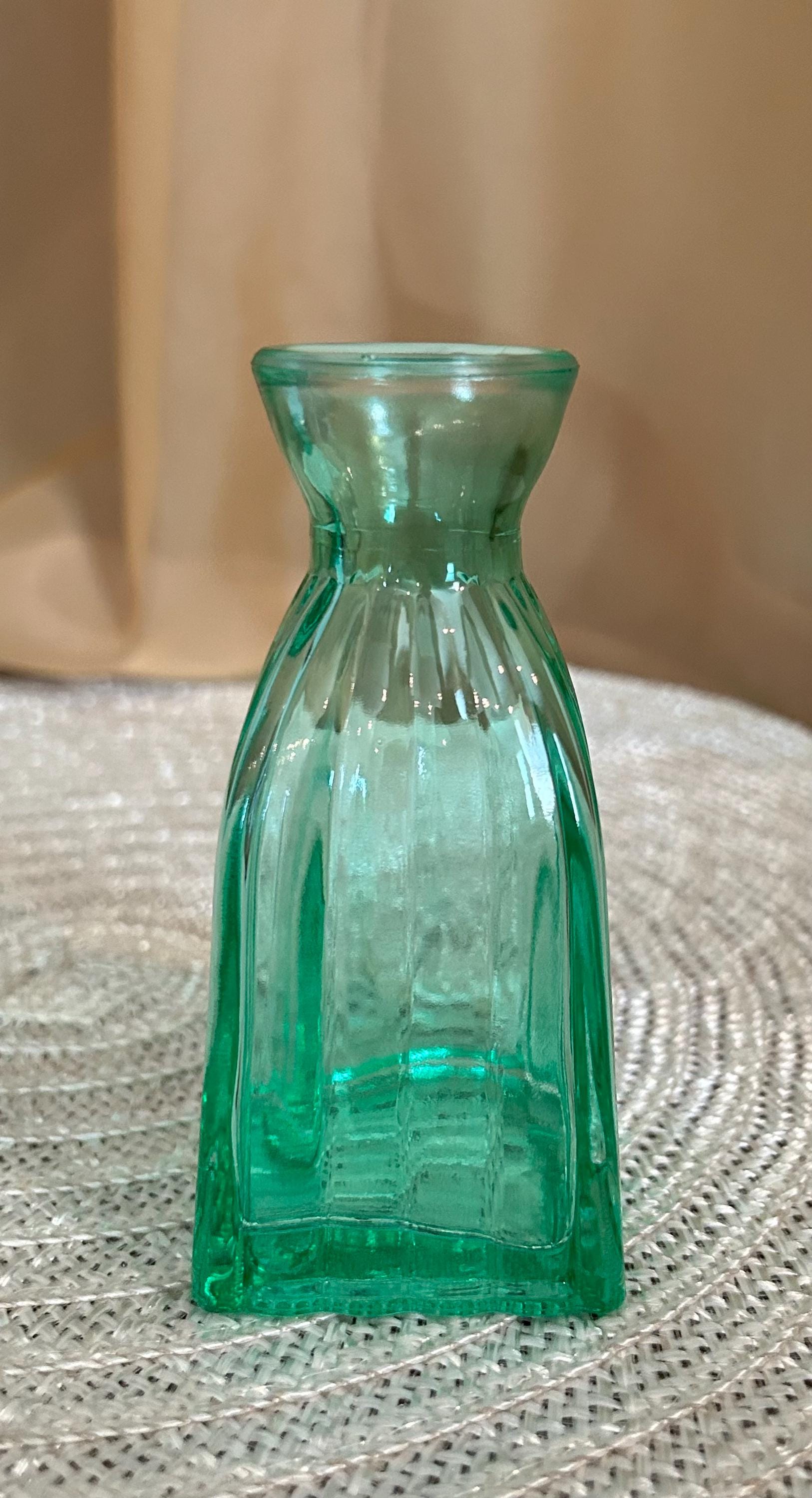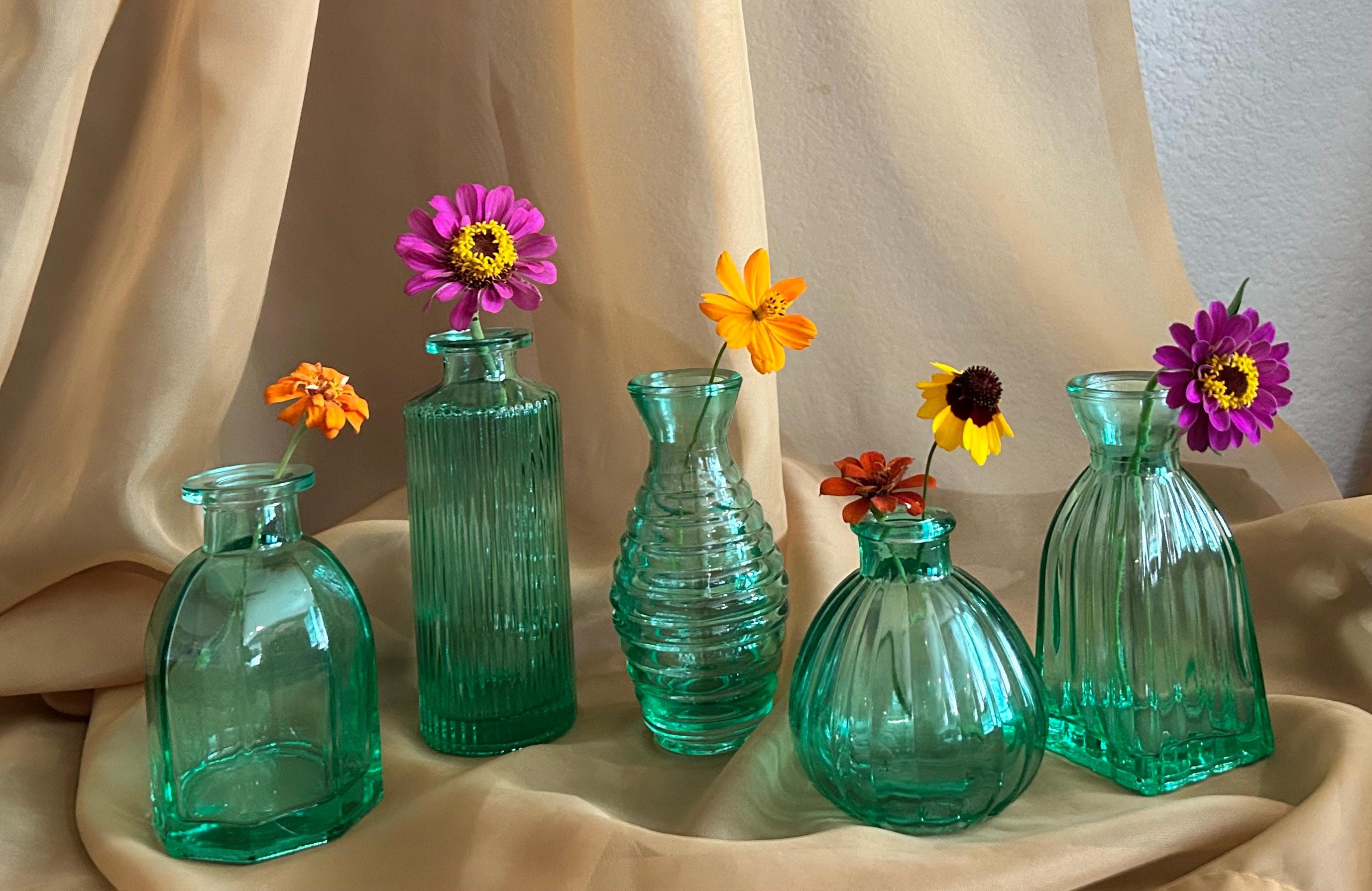 Add a touch of timeless charm with these lovely emerald-teal bud vases, each uniquely shaped to complement a variety of arrangements and vignettes. Their soft sea-glass coloring and sculptural forms make them perfect for displaying single stems, petite wildflowers, or simply enjoying as decorative glassware.