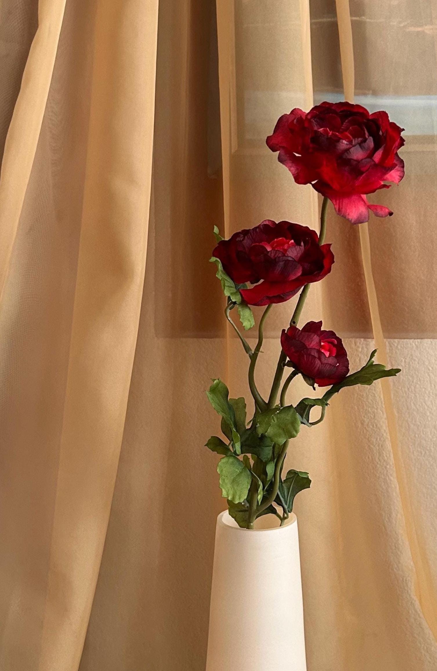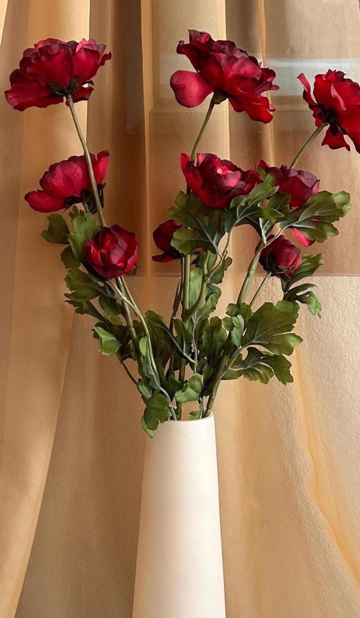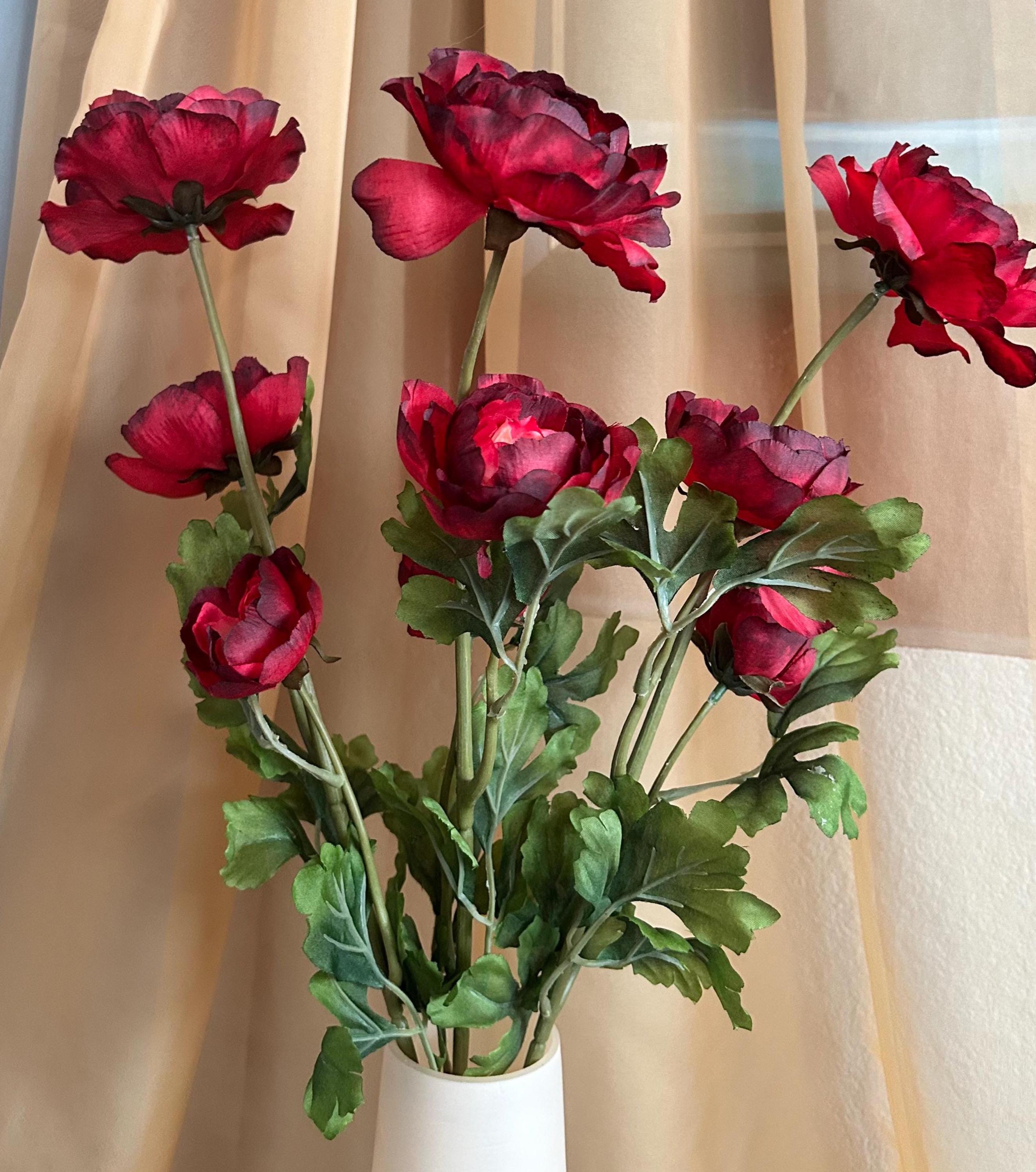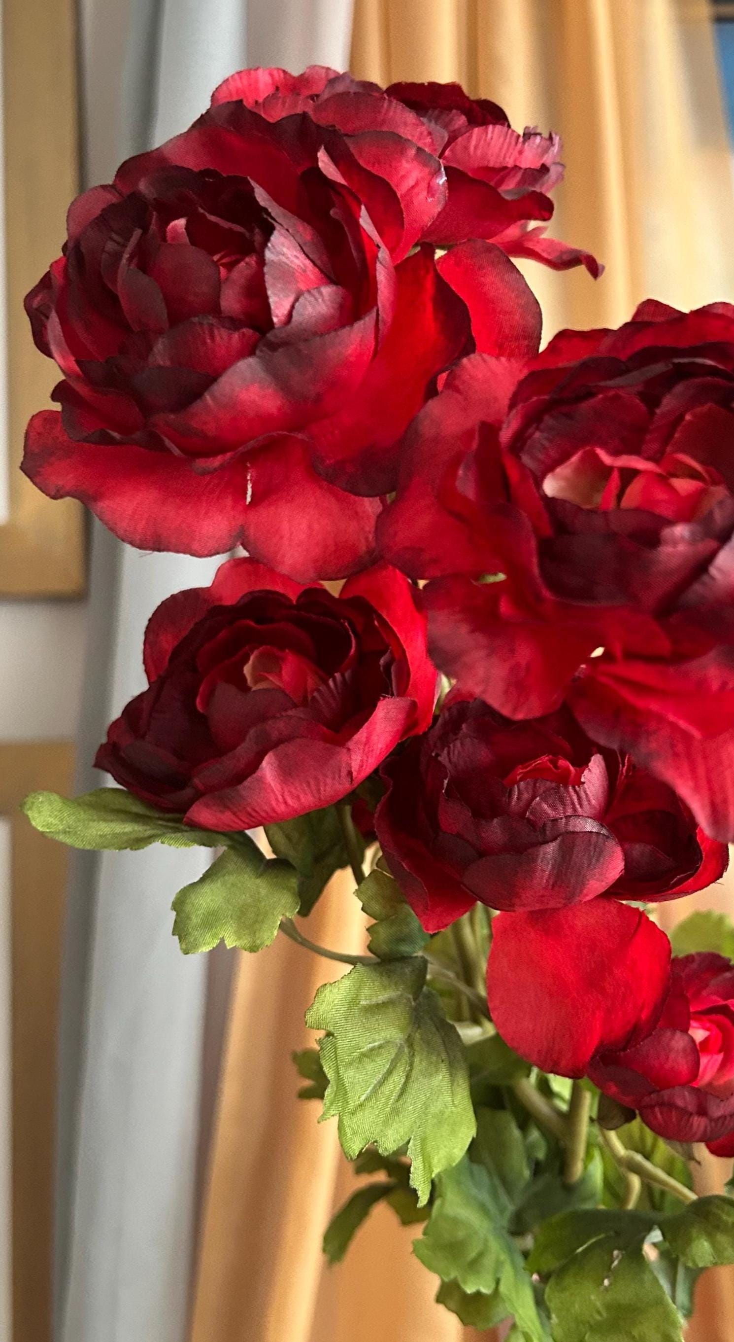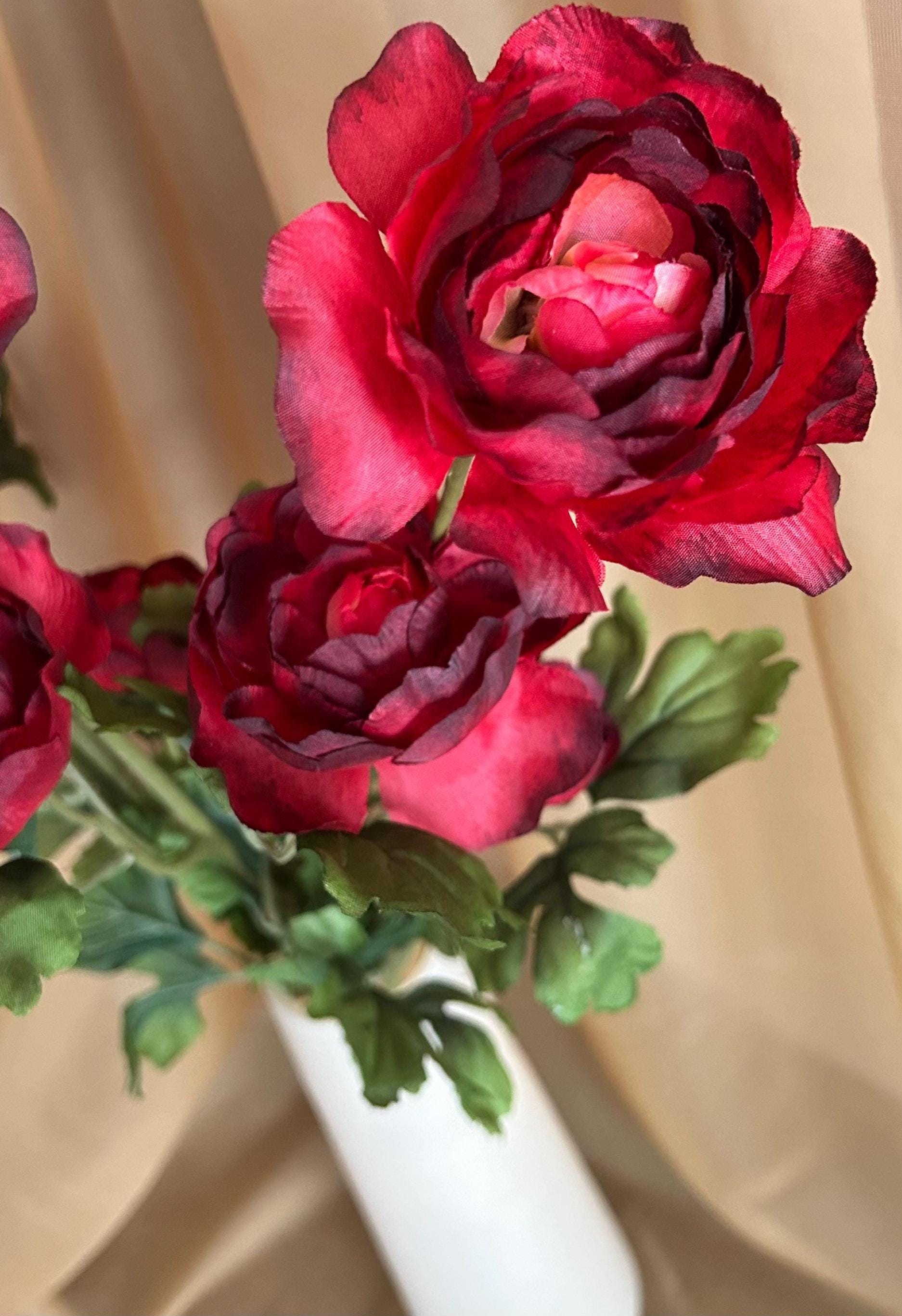 Deep, rich, and effortlessly romantic - this deep red ranunculus stem is here to bring bold beauty to your space. Each 28-inch stem features three full blooms ranging from approximately 2 to 4 inches wide, with layered petals in dramatic shades of crimson, wine, and burgundy.