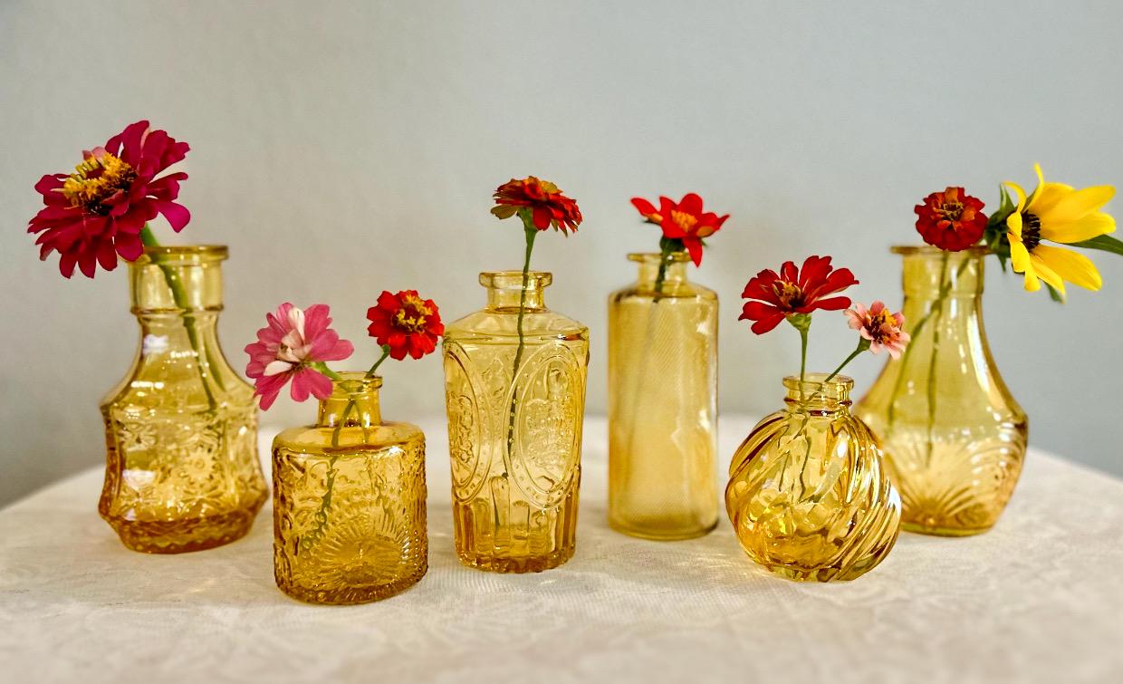 Add a warm golden glow to your home décor with these amber glass bud vases. Each vase features a unique vintage-inspired shape and textured design, perfect for displaying a single bloom, dried flowers, or simply shining on its own.