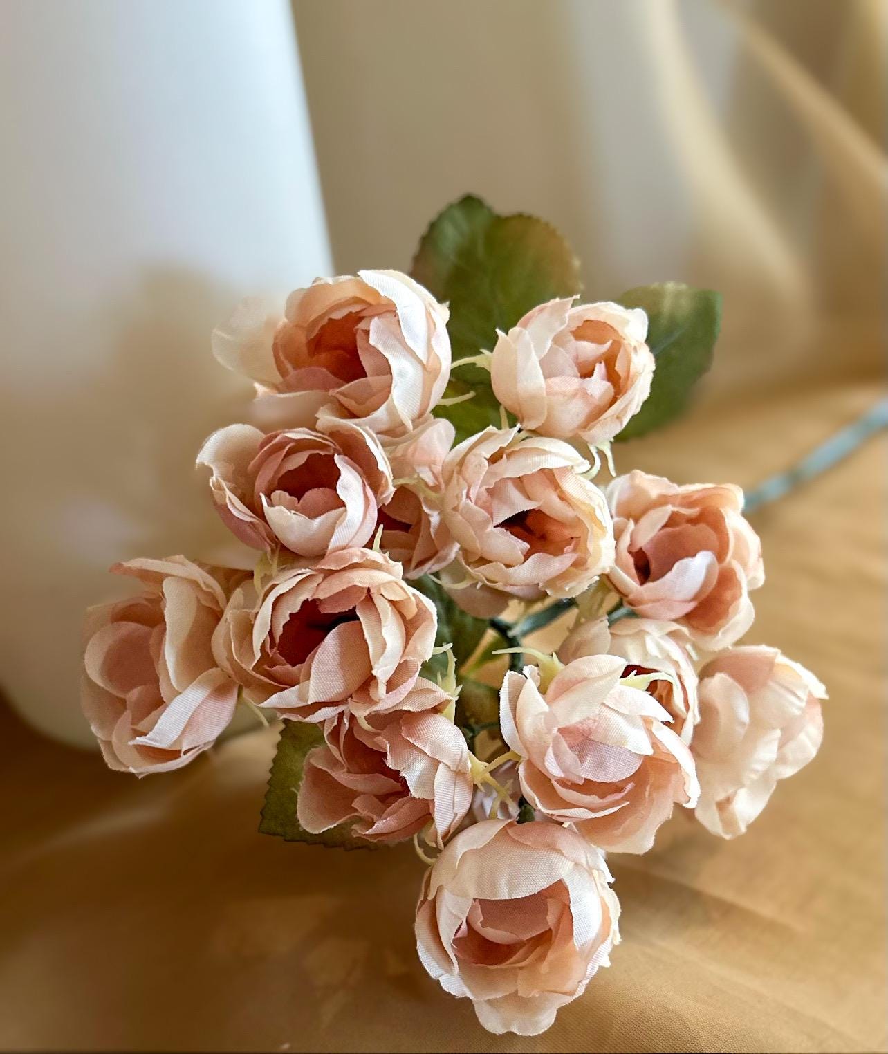 This sweet mini rose spray is sure to bring timeless romance into your décor. Featuring soft blush-pink blooms, each approximately 3 ¼ inches wide, this stem captures the delicate charm of fresh roses in a lasting faux design. The spray includes multiple layered blossoms accented by lifelike green leaves, making it a versatile choice for floral arrangements, wedding bouquets, or everyday home styling.