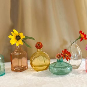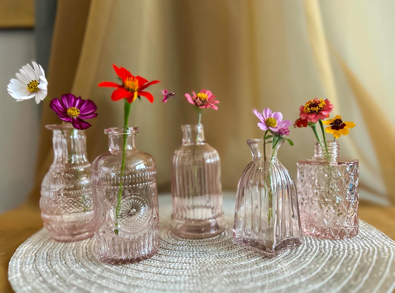 These delicate blush pink glass bud vases bring a touch of charm and warmth to any space. Each vase features its own unique pattern and shape, making them perfect for showcasing single stems, tiny garden blooms, or dried flowers. Their petite size and vintage-inspired design make them a lovely accent for wedding tables, parties, or everyday home décor.