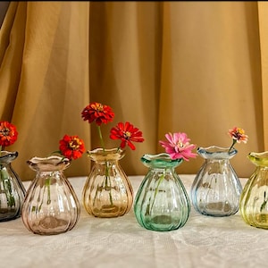 These delicate blush pink glass bud vases bring a touch of charm and warmth to any space. Each vase features its own unique pattern and shape, making them perfect for showcasing single stems, tiny garden blooms, or dried flowers. Their petite size and vintage-inspired design make them a lovely accent for wedding tables, parties, or everyday home décor.