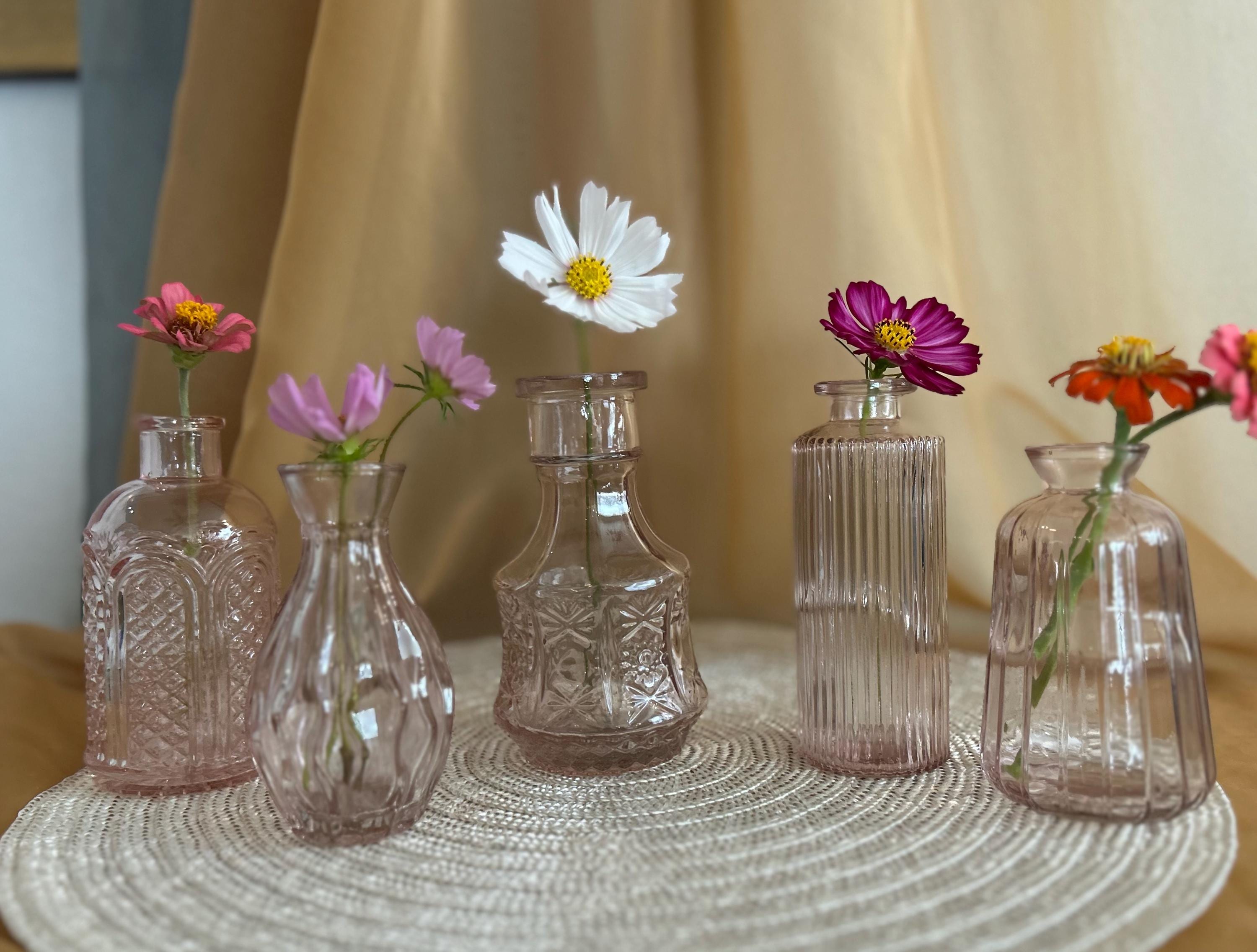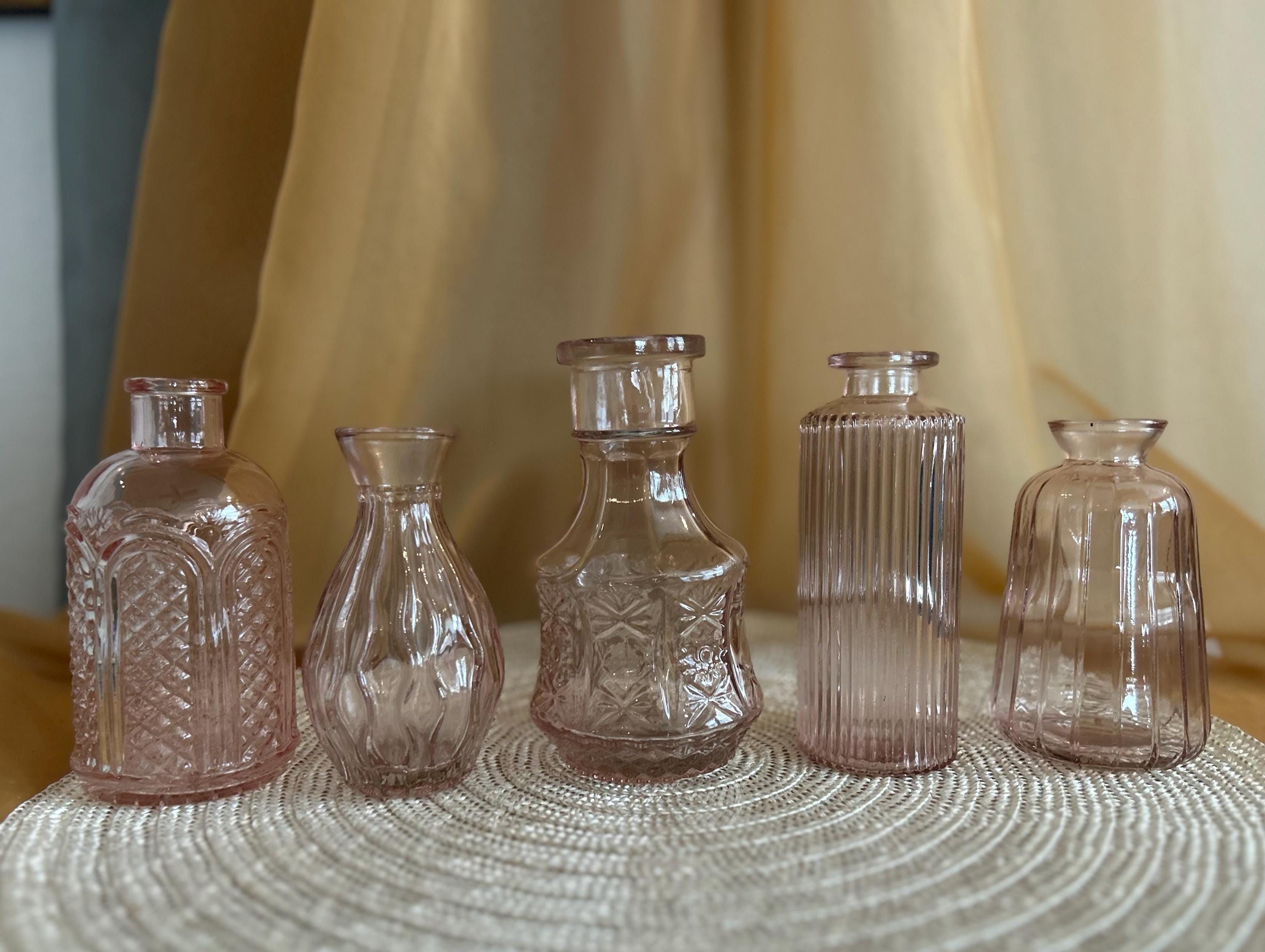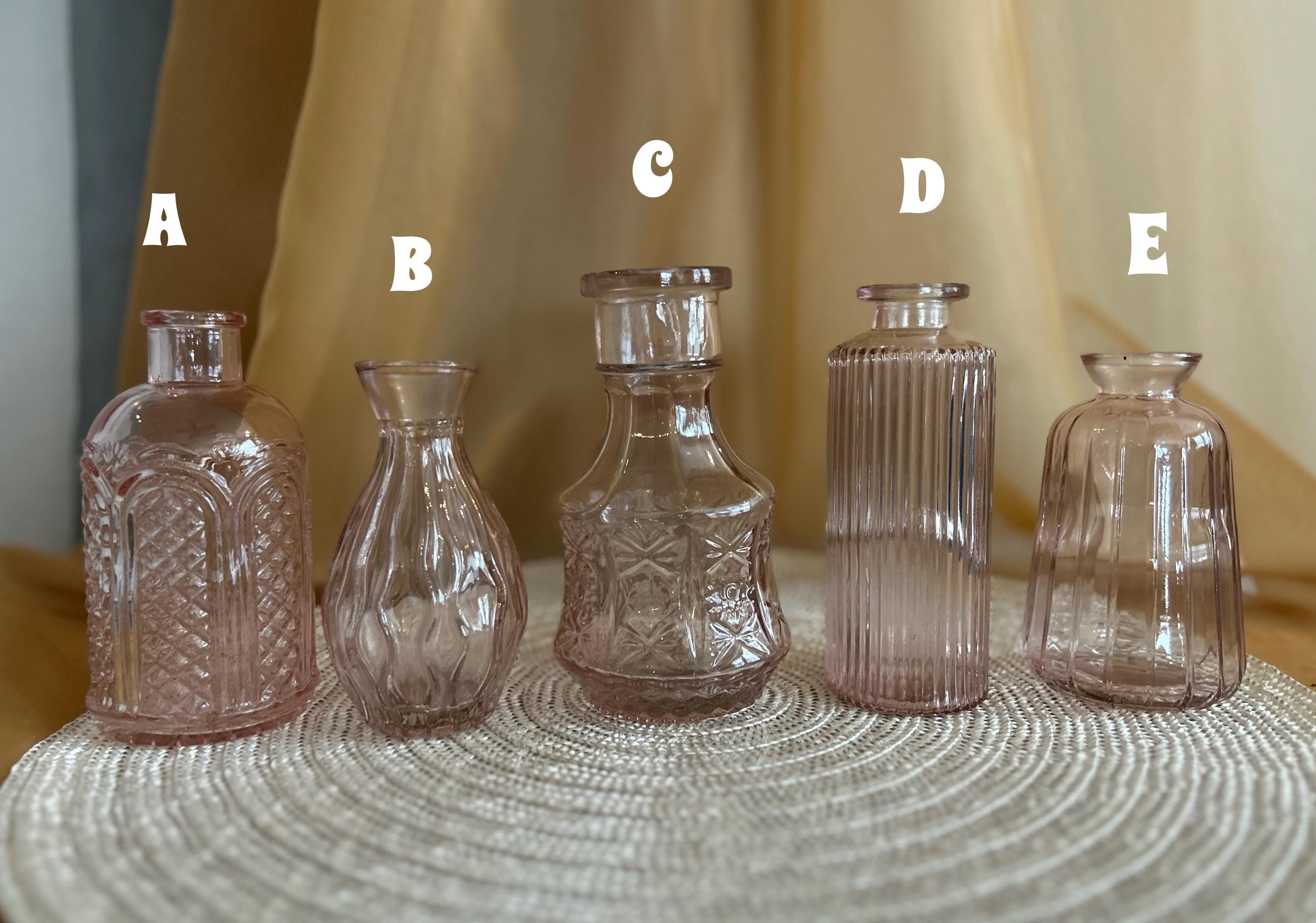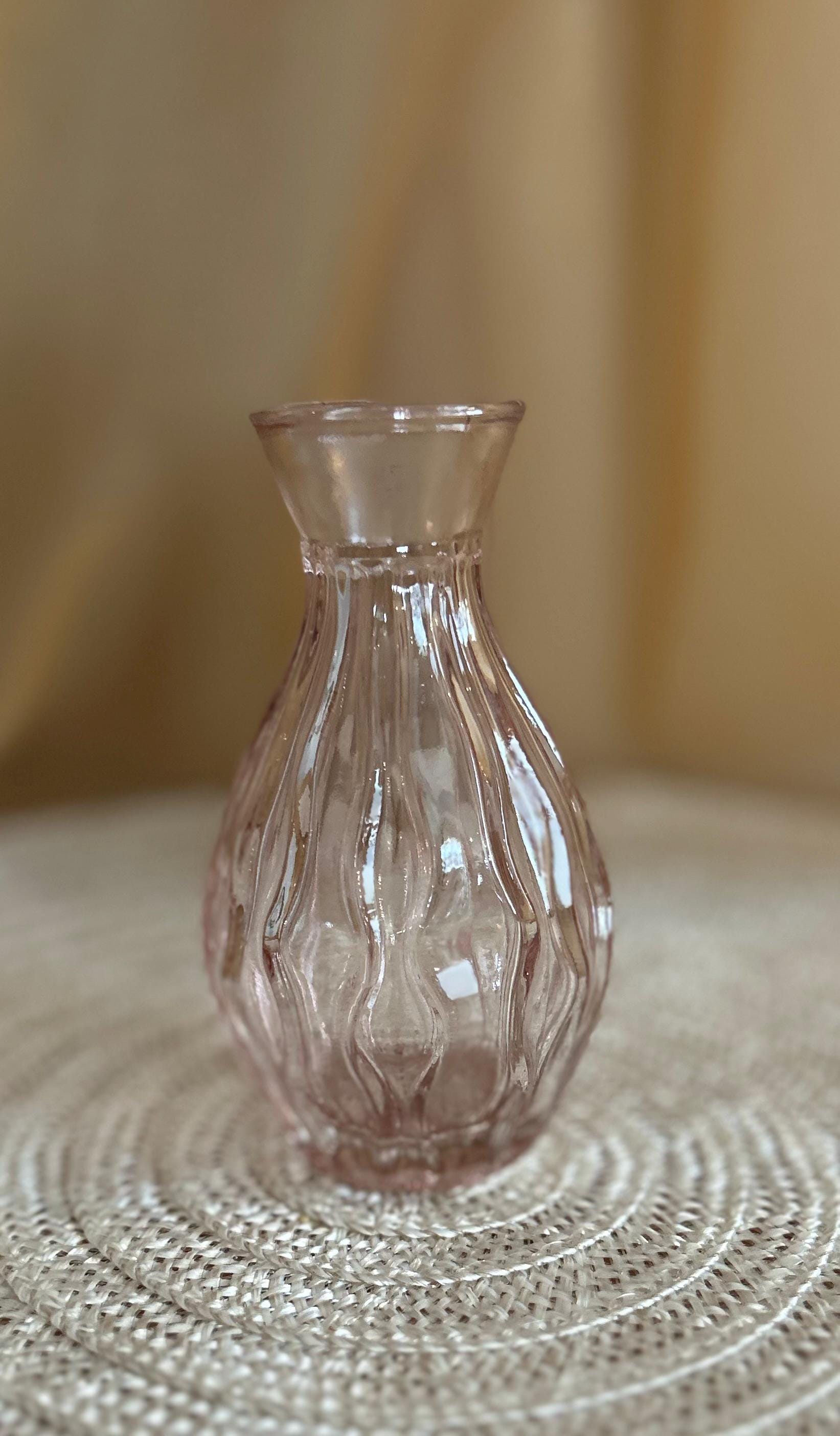These delicate blush pink glass bud vases bring a touch of charm and warmth to any space. Each vase features its own unique pattern and shape, making them perfect for showcasing single stems, tiny garden blooms, or dried flowers. Their petite size and vintage-inspired design make them a lovely accent for wedding tables, parties, or everyday home décor.