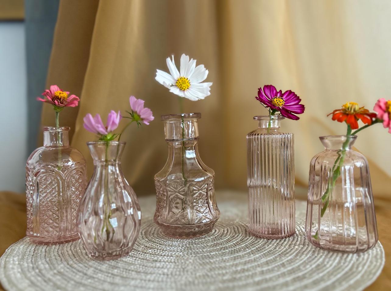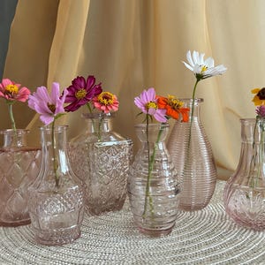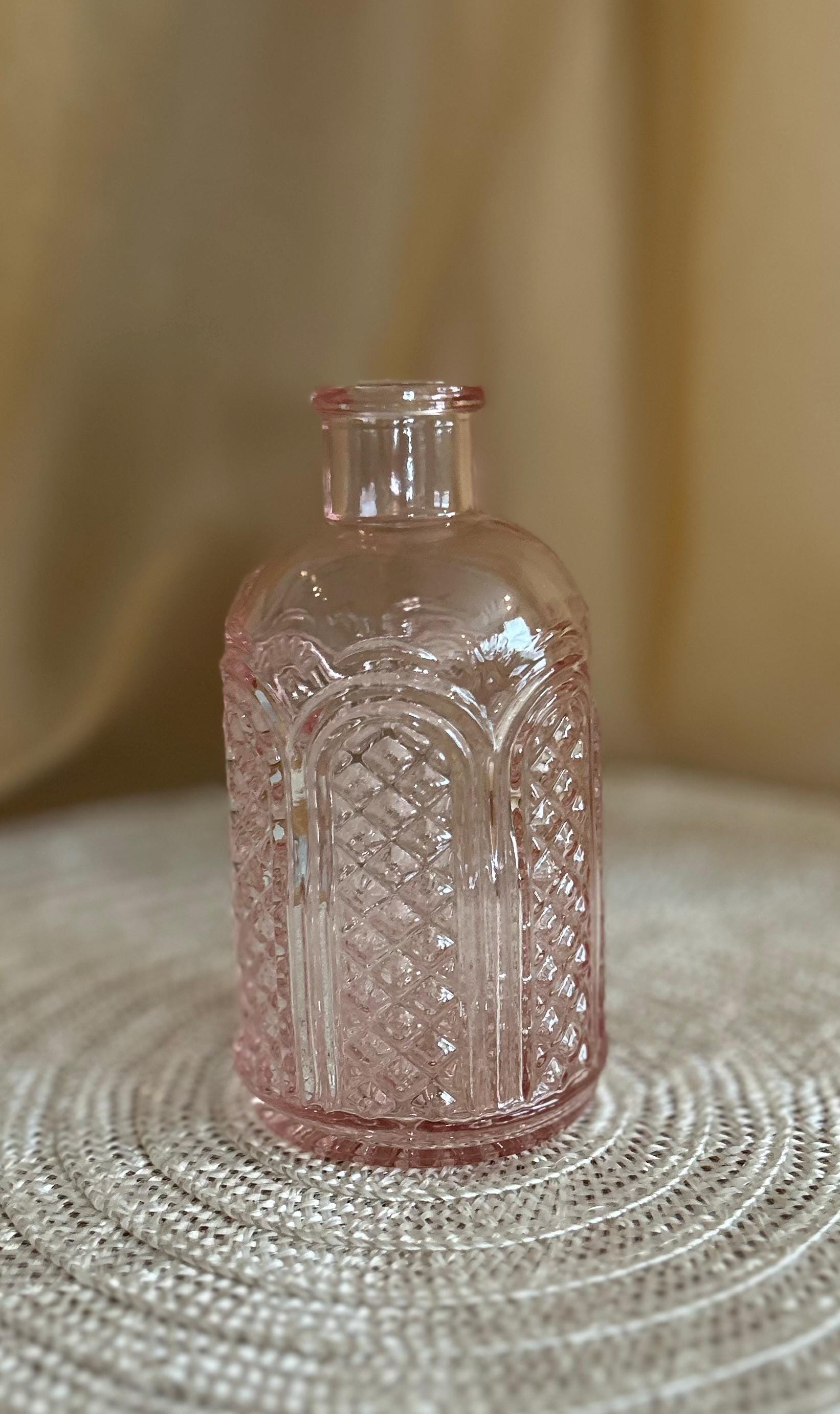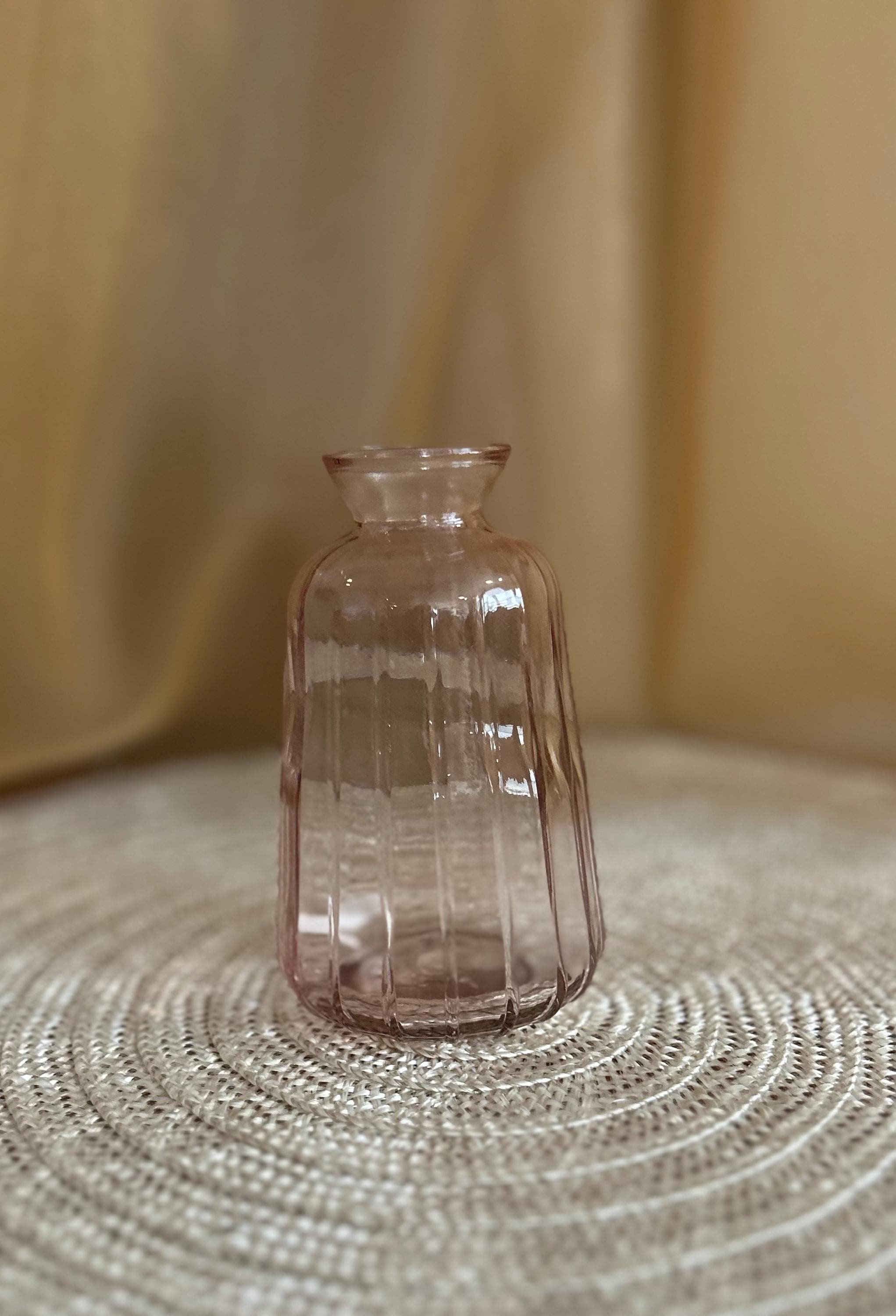 These delicate blush pink glass bud vases bring a touch of charm and warmth to any space. Each vase features its own unique pattern and shape, making them perfect for showcasing single stems, tiny garden blooms, or dried flowers. Their petite size and vintage-inspired design make them a lovely accent for wedding tables, parties, or everyday home décor.