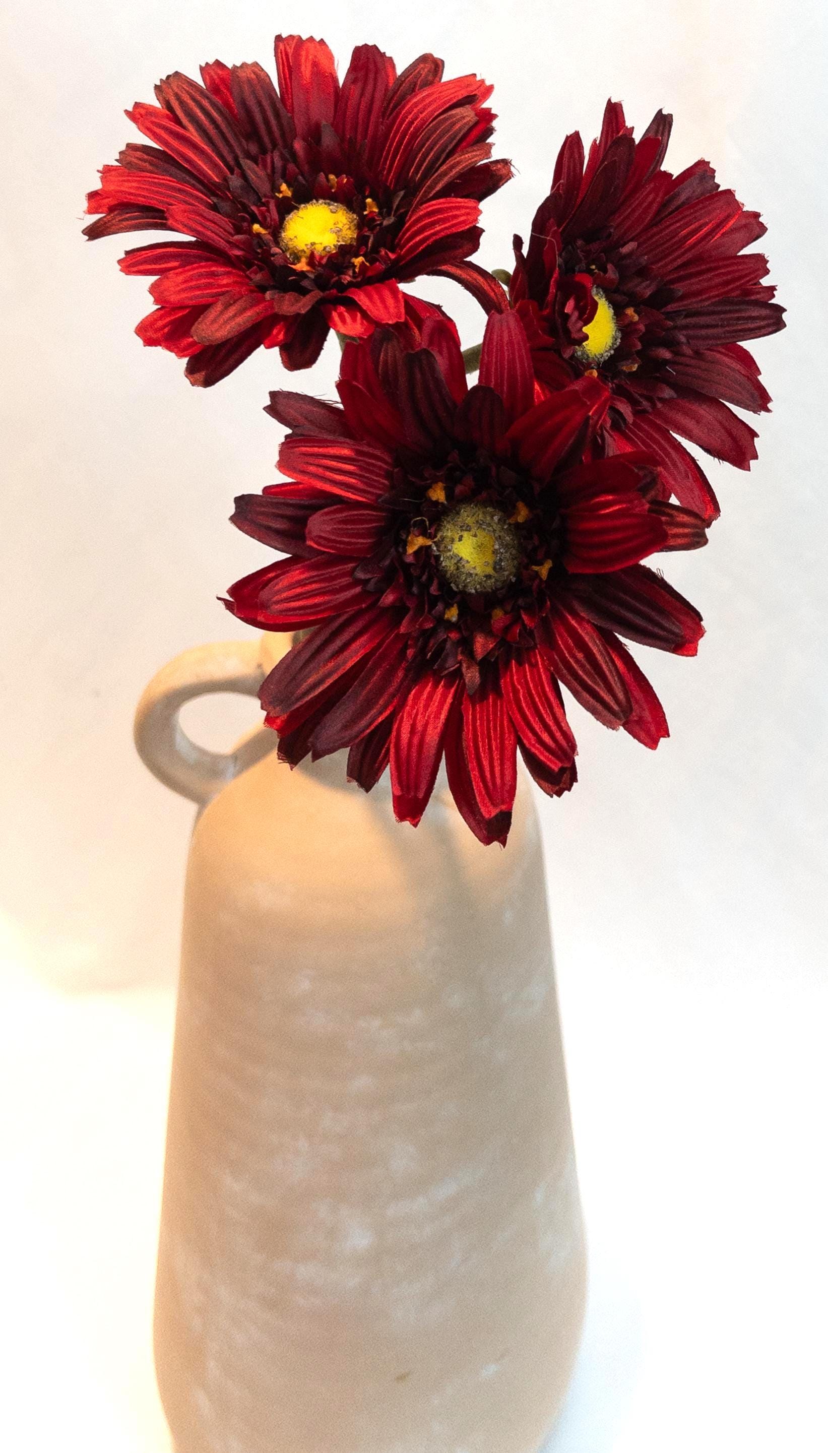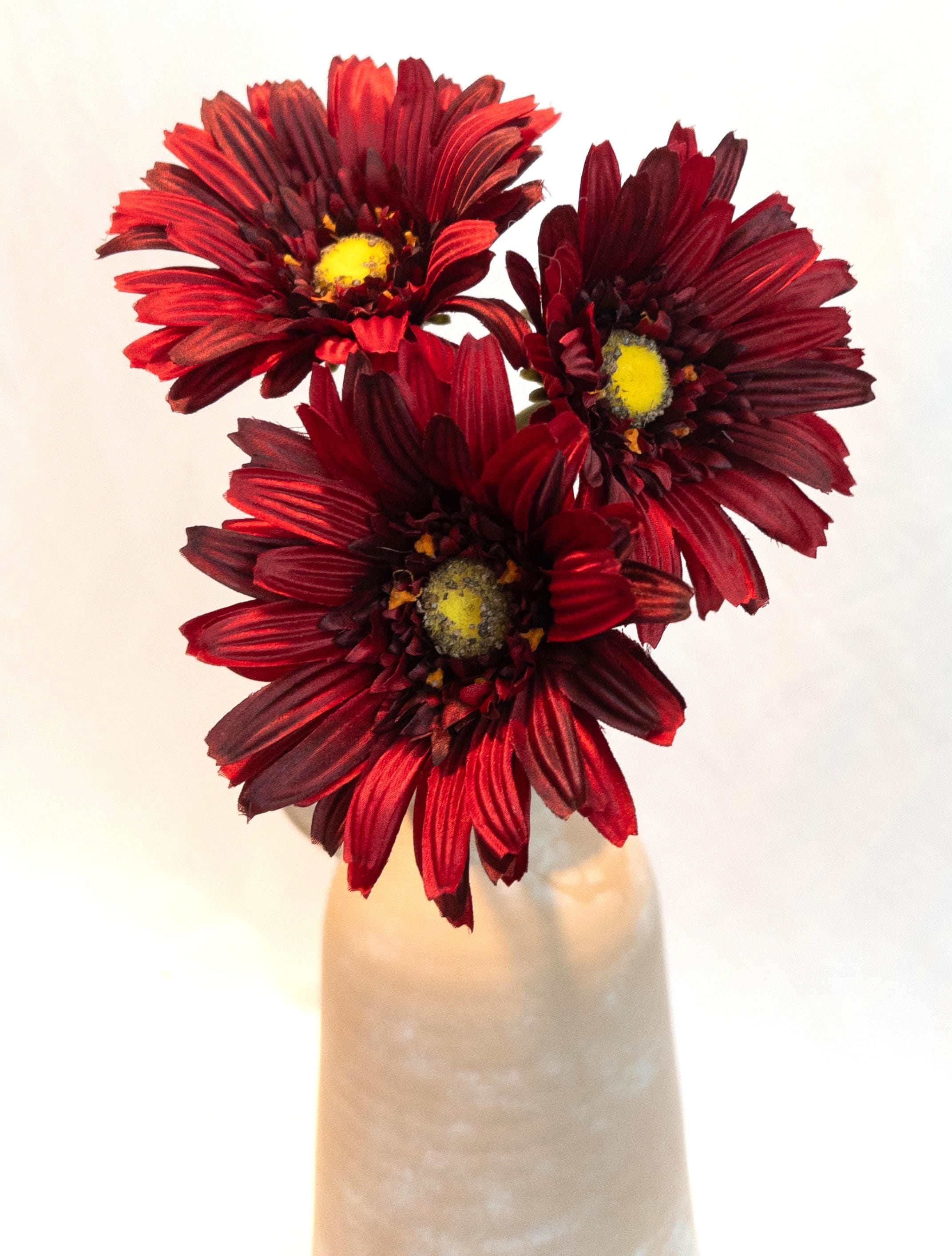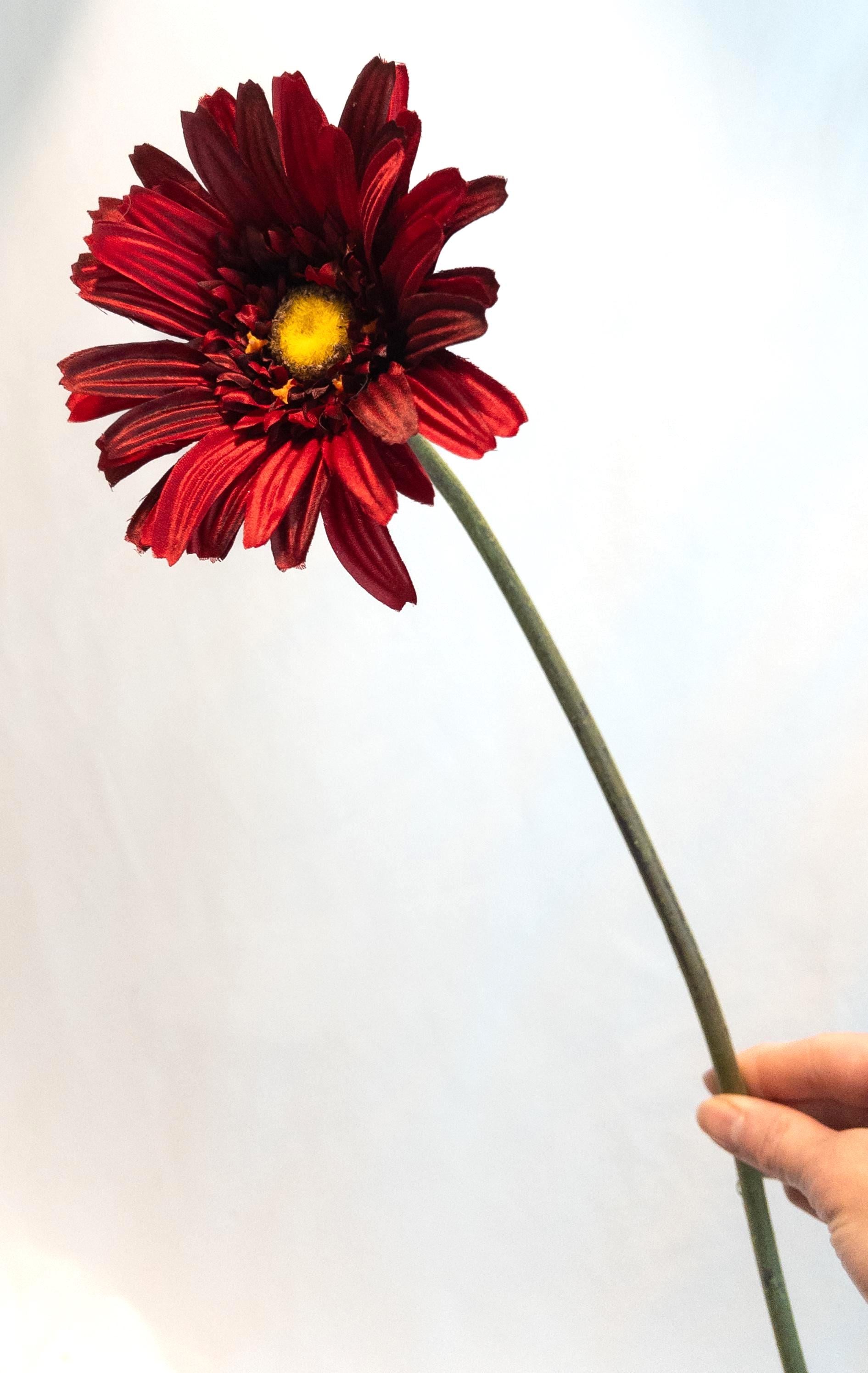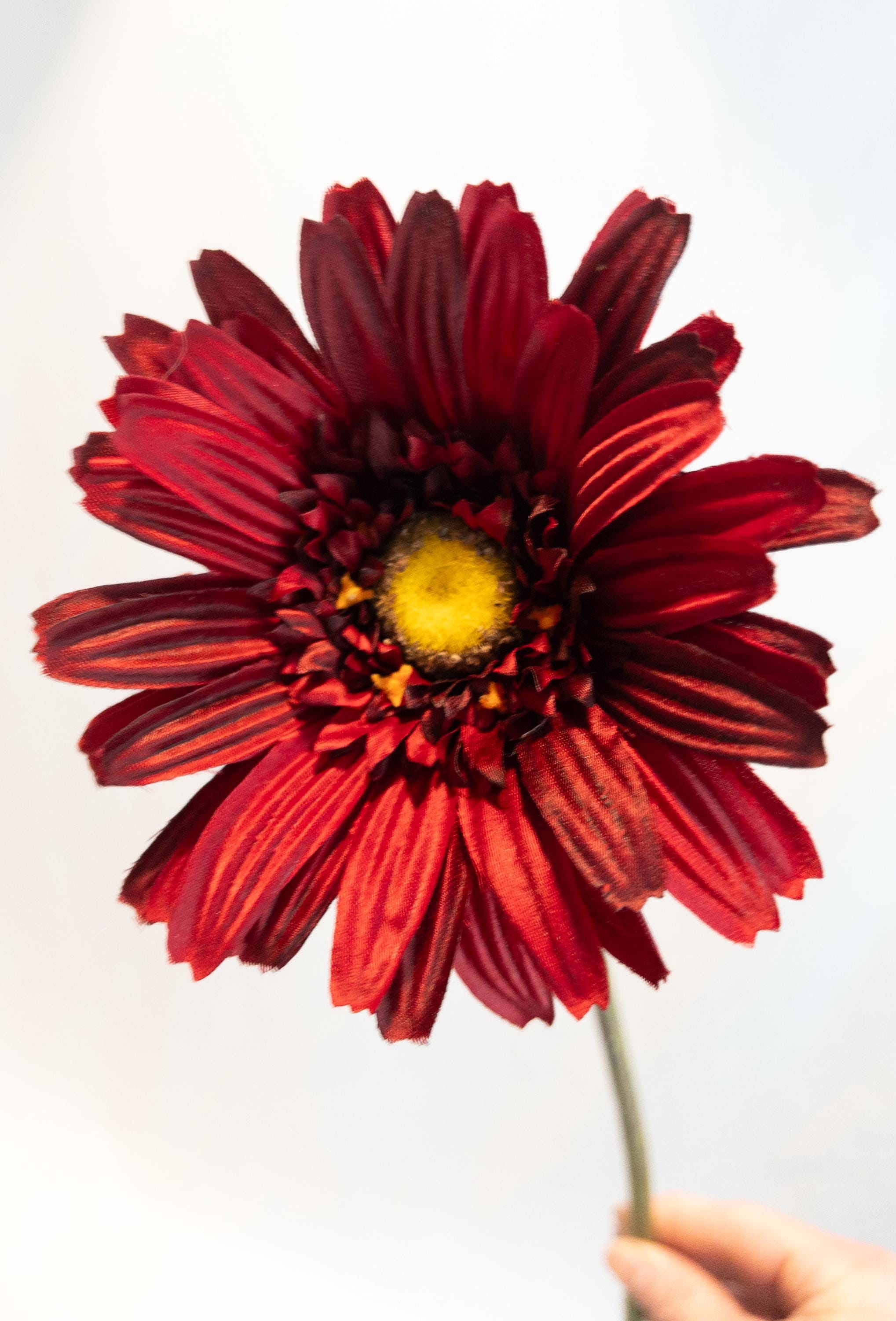 This stunning deep red Gerber daisy stem exudes bold elegance. Standing 23 inches tall with a generously sized 5-inch bloom, this faux flower captures the beauty of nature in a lasting, maintenance-free design. Its rich red petals with a golden-yellow center add striking color and charm, whether displayed solo in a slender vase or paired with other florals for a vibrant arrangement.