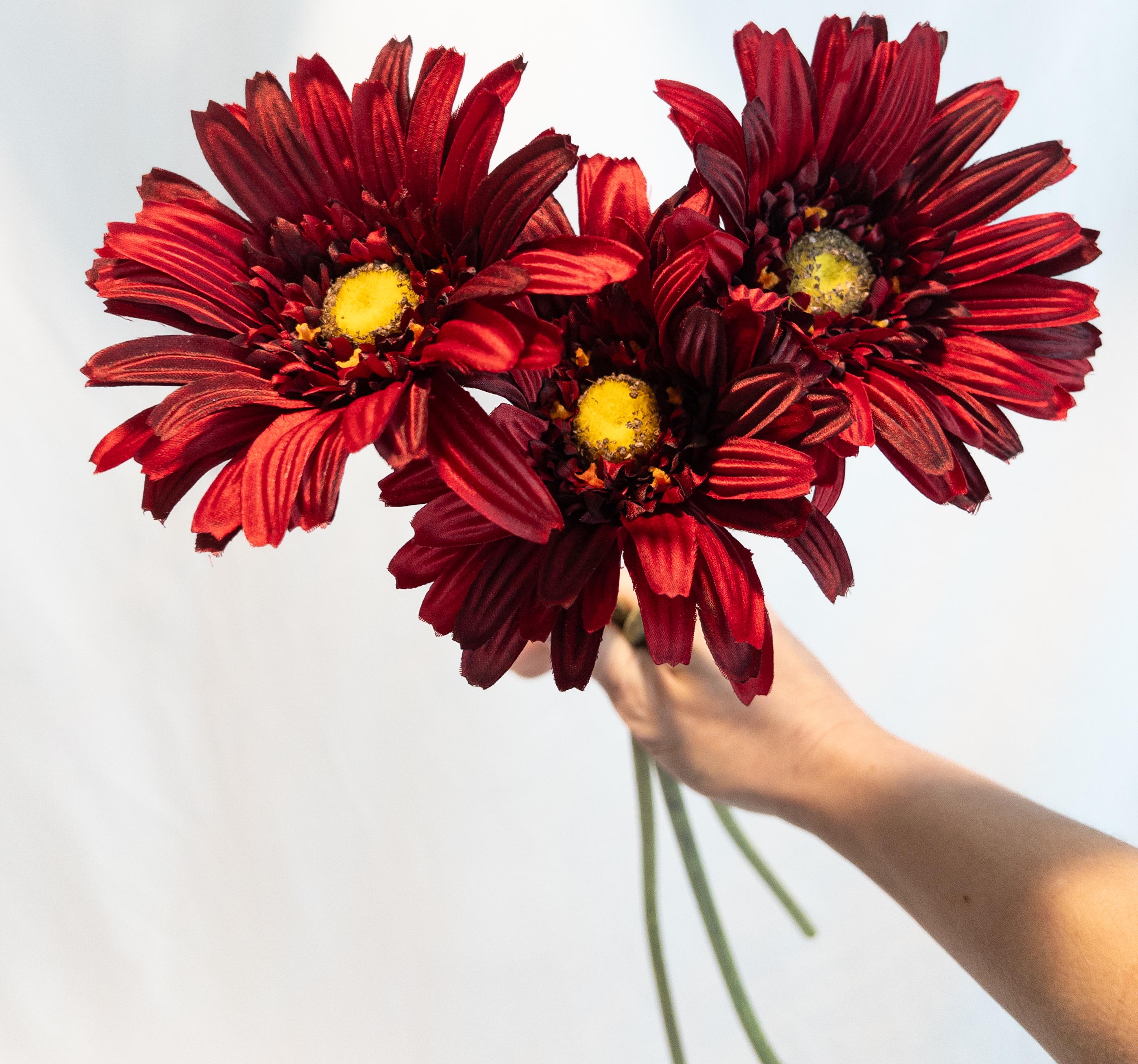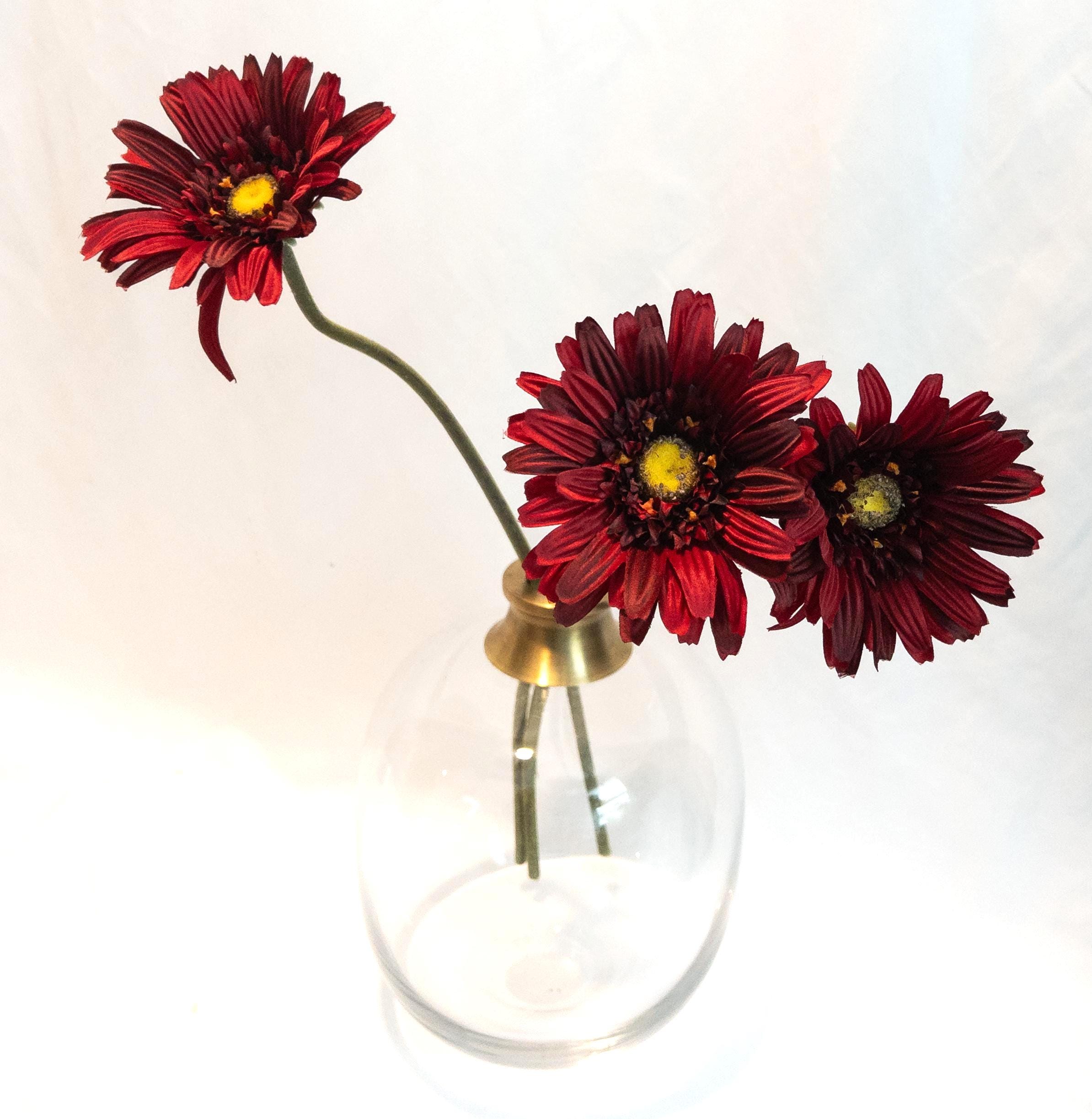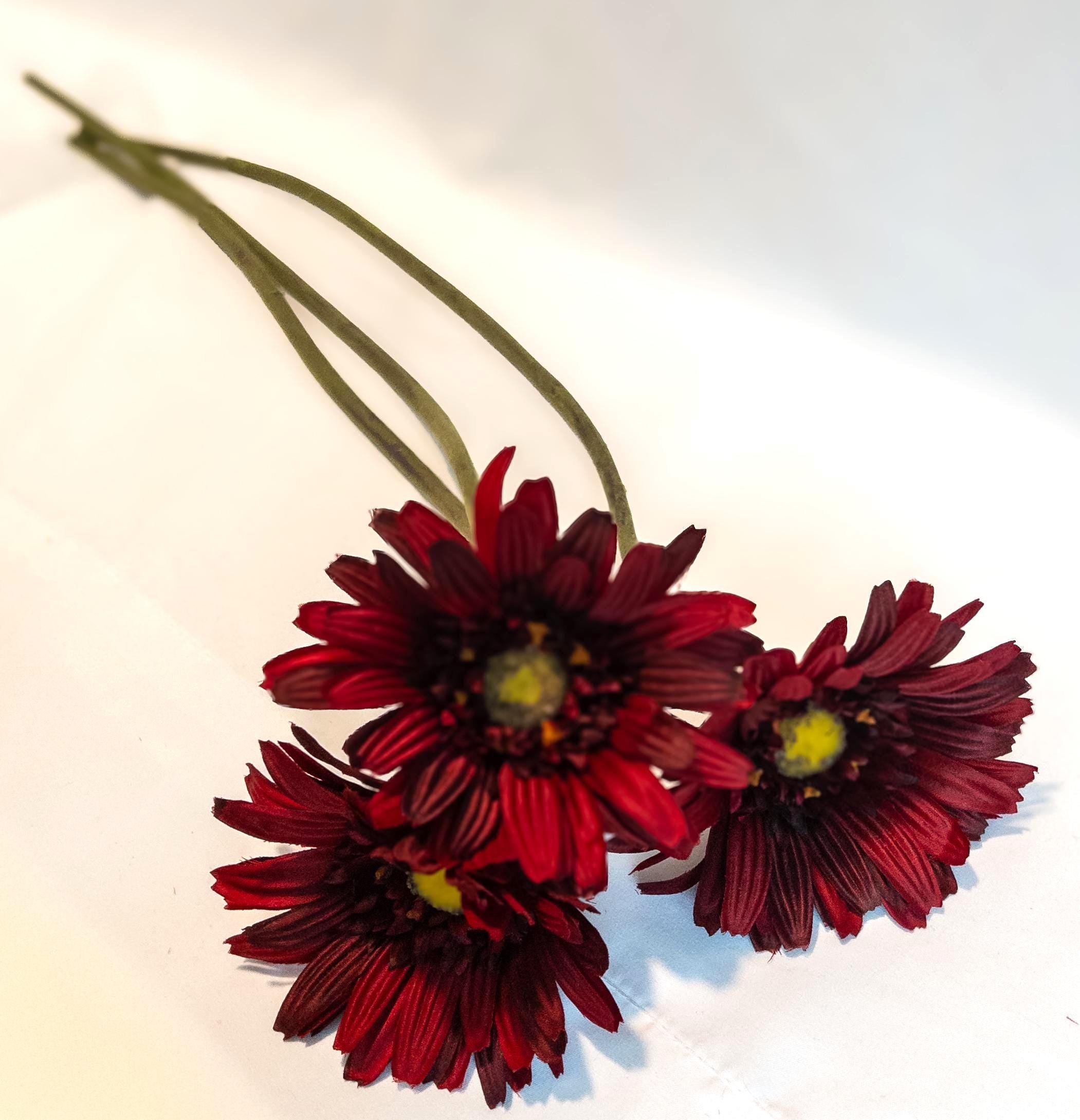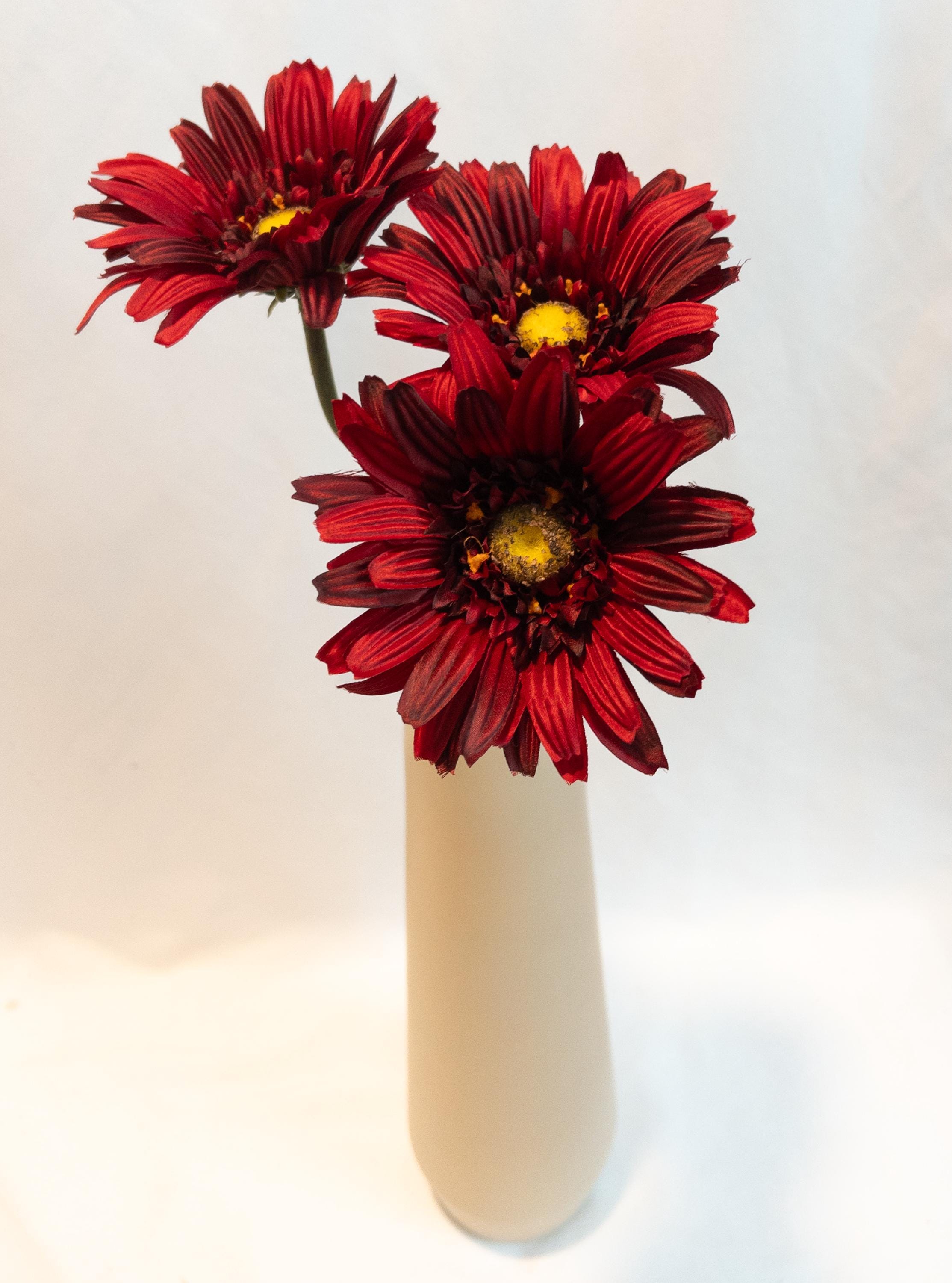 This stunning deep red Gerber daisy stem exudes bold elegance. Standing 23 inches tall with a generously sized 5-inch bloom, this faux flower captures the beauty of nature in a lasting, maintenance-free design. Its rich red petals with a golden-yellow center add striking color and charm, whether displayed solo in a slender vase or paired with other florals for a vibrant arrangement.
