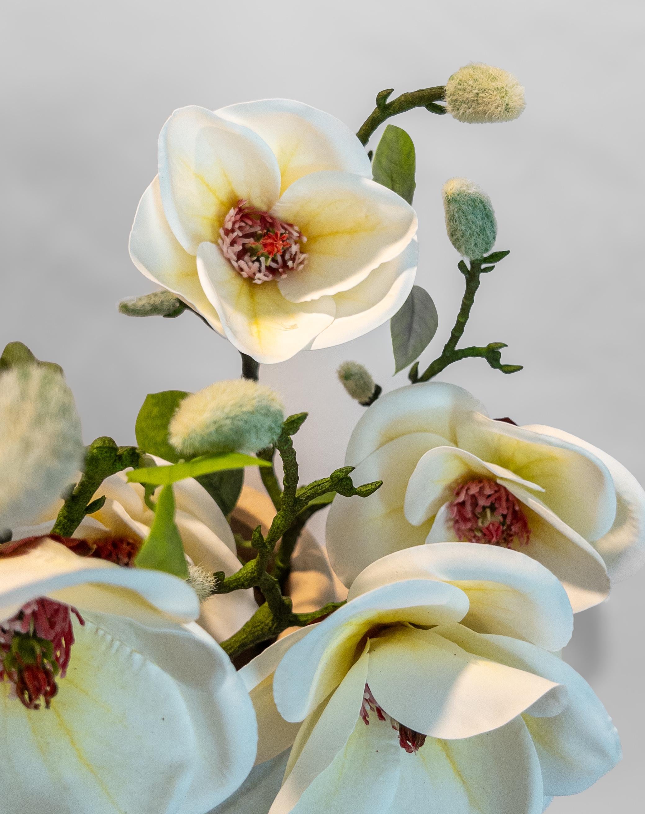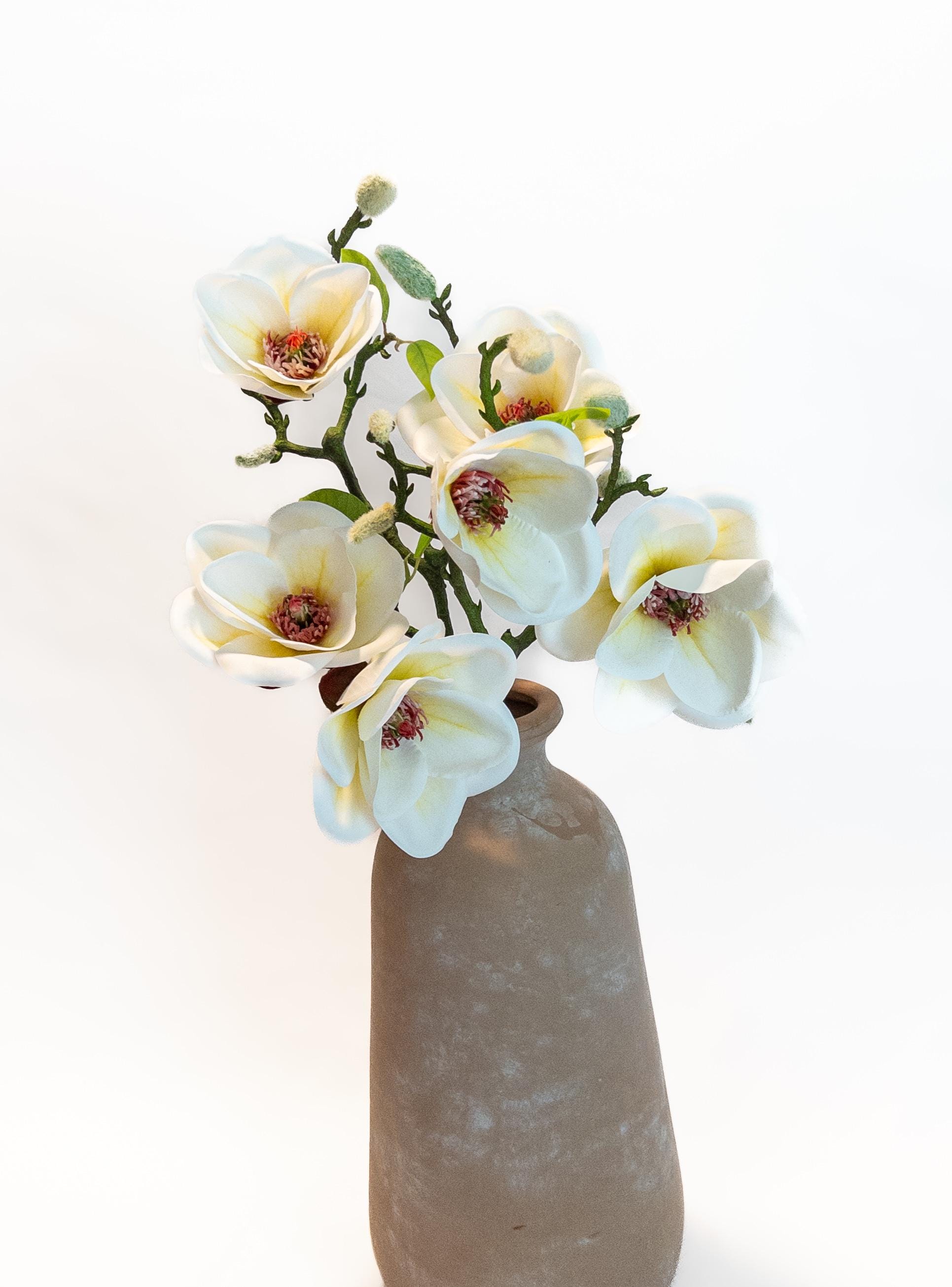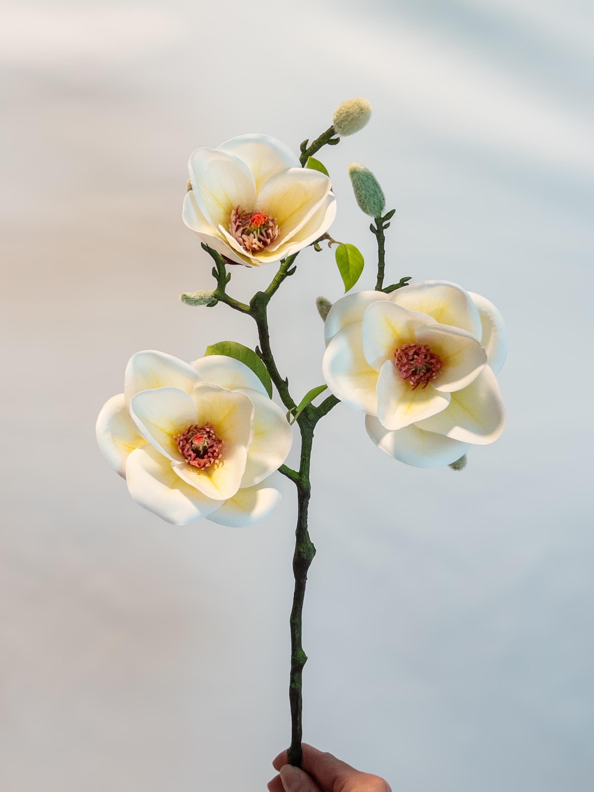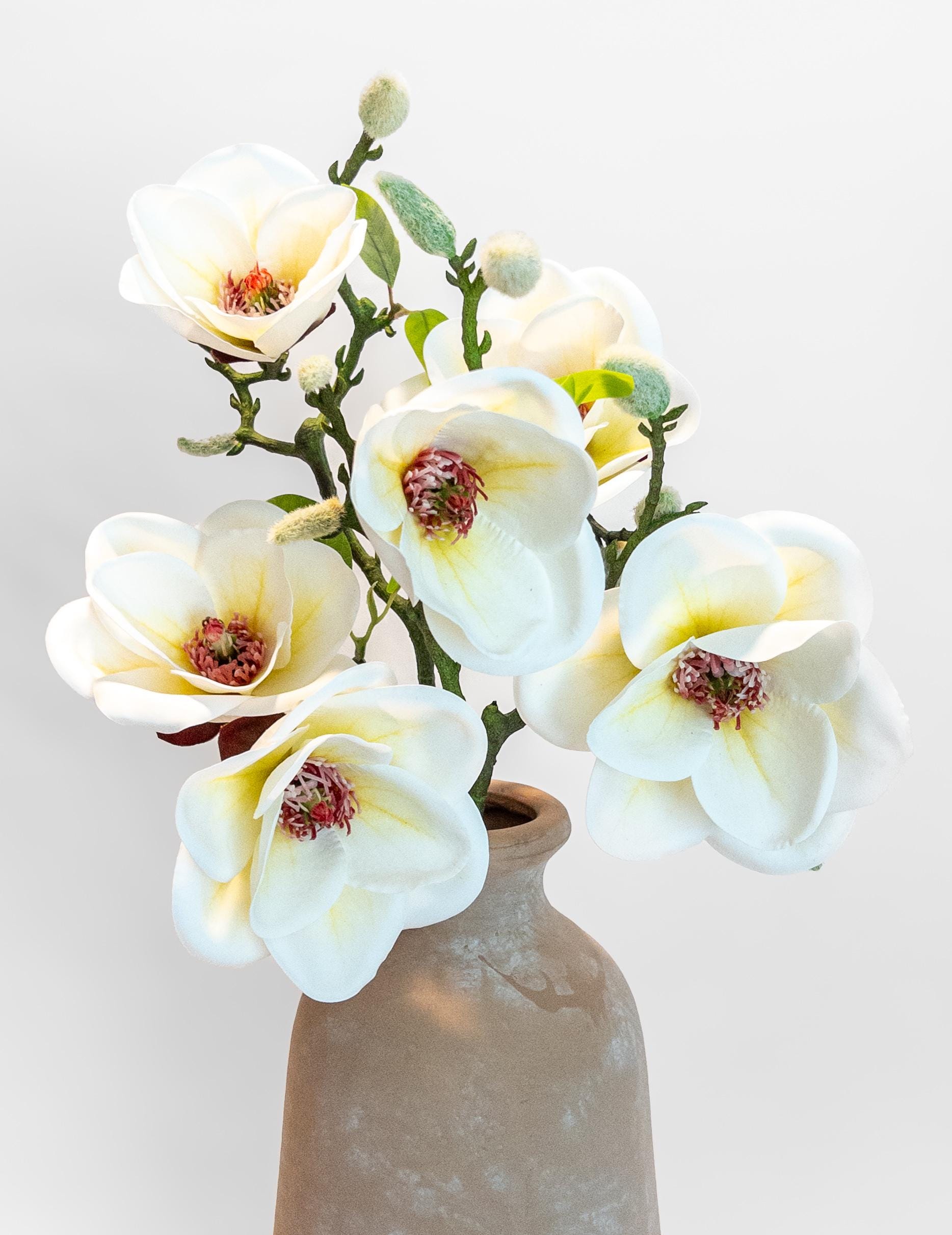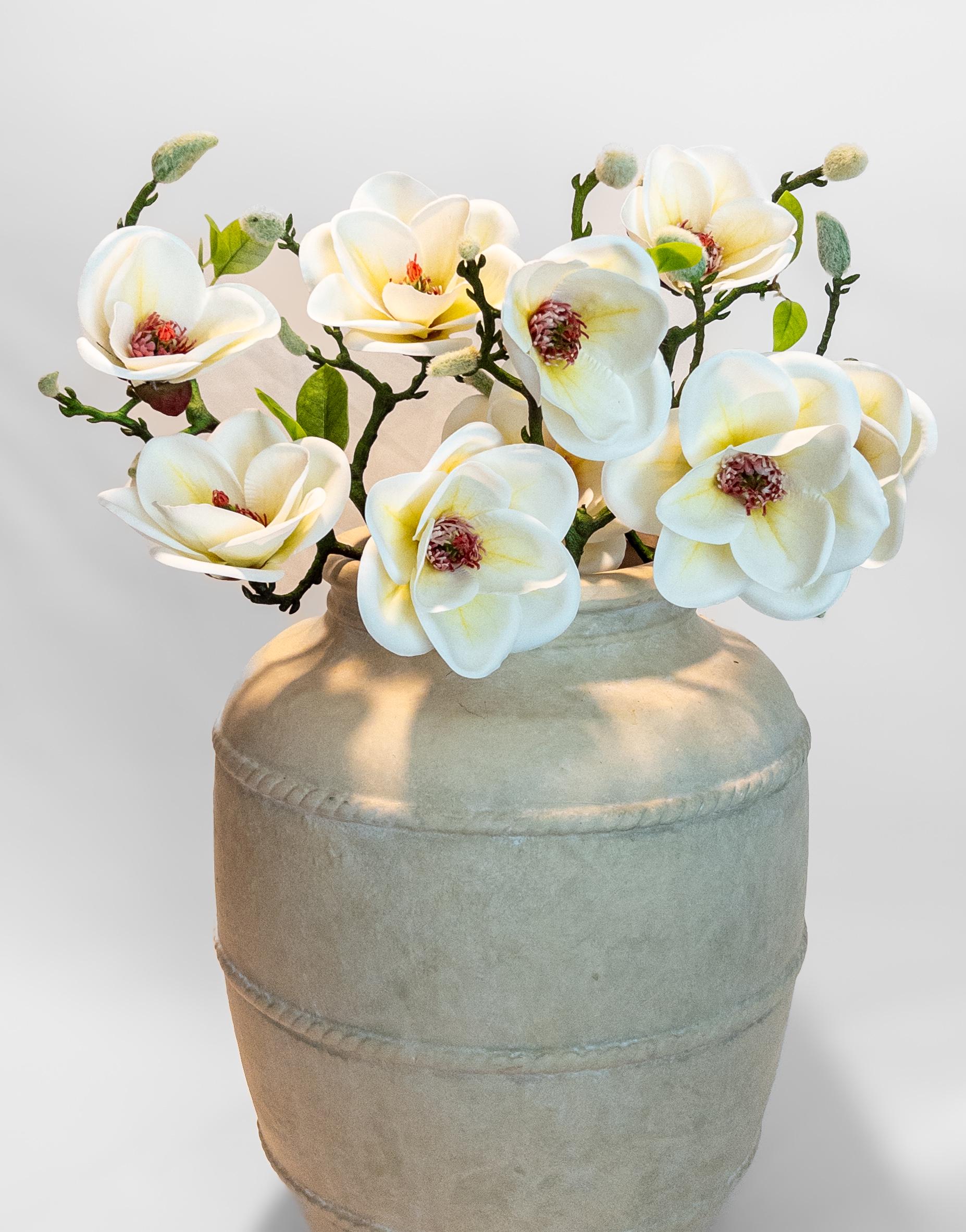 Bring timeless elegance to your home with this cream magnolia spray stem. Standing 20 inches tall, this lifelike branch features three exquisite magnolia blooms, ranging from 3 ½ to 4 ½ inches across, with soft cream petals kissed with subtle yellow accents and warm pink centers. The realistic texture, natural branching, and fuzzy magnolia buds make this stem a versatile piece for year-round styling.