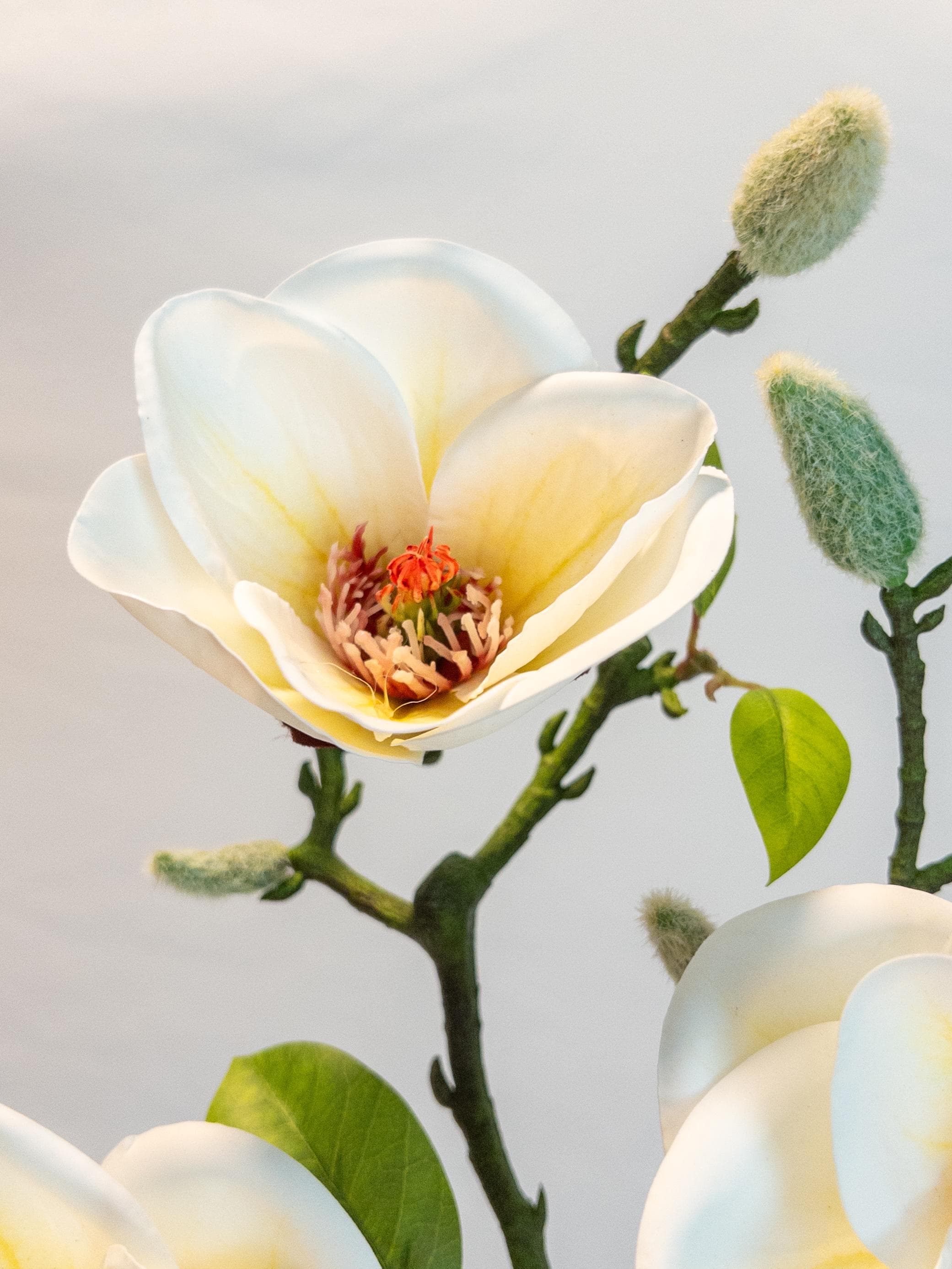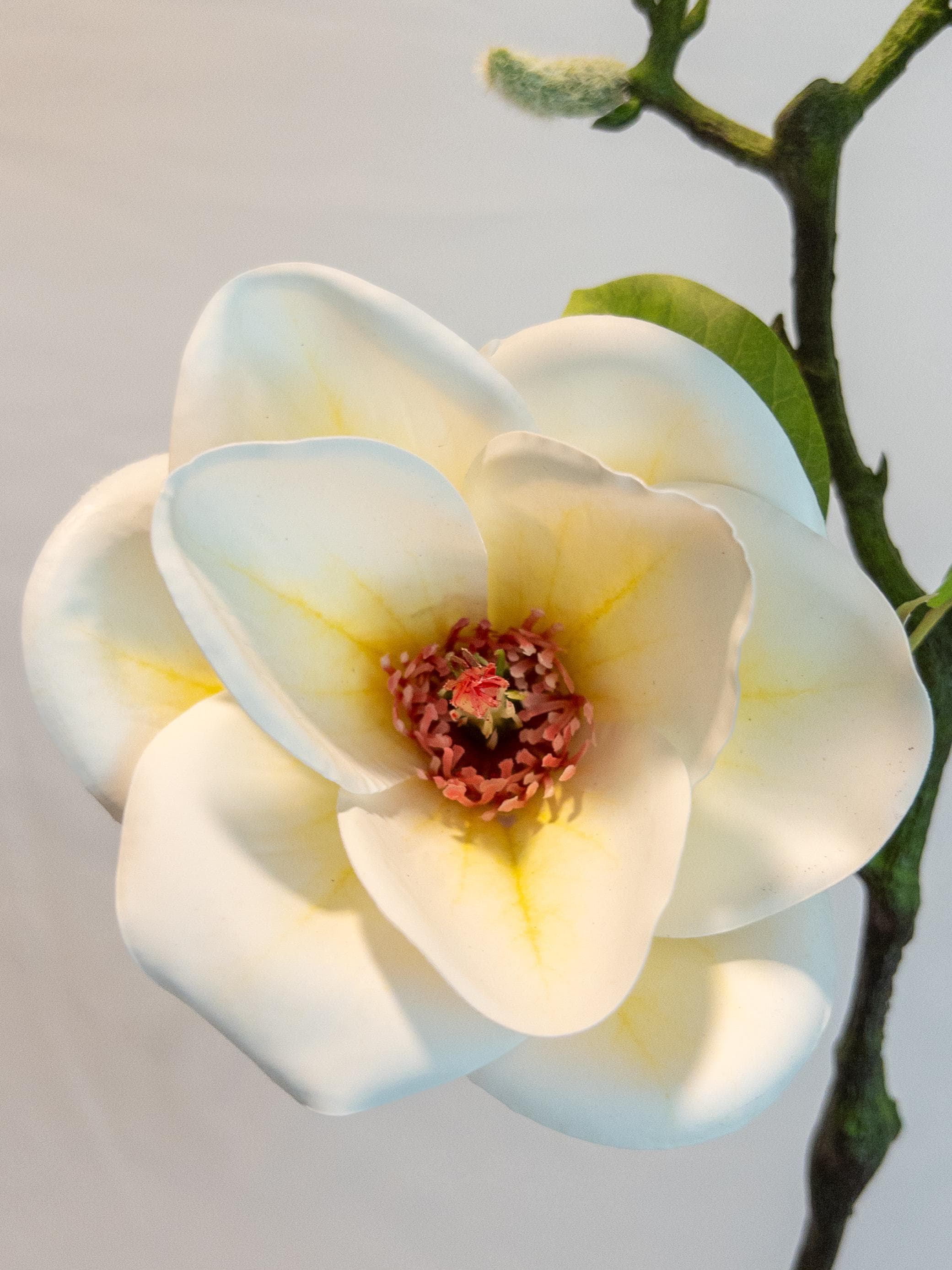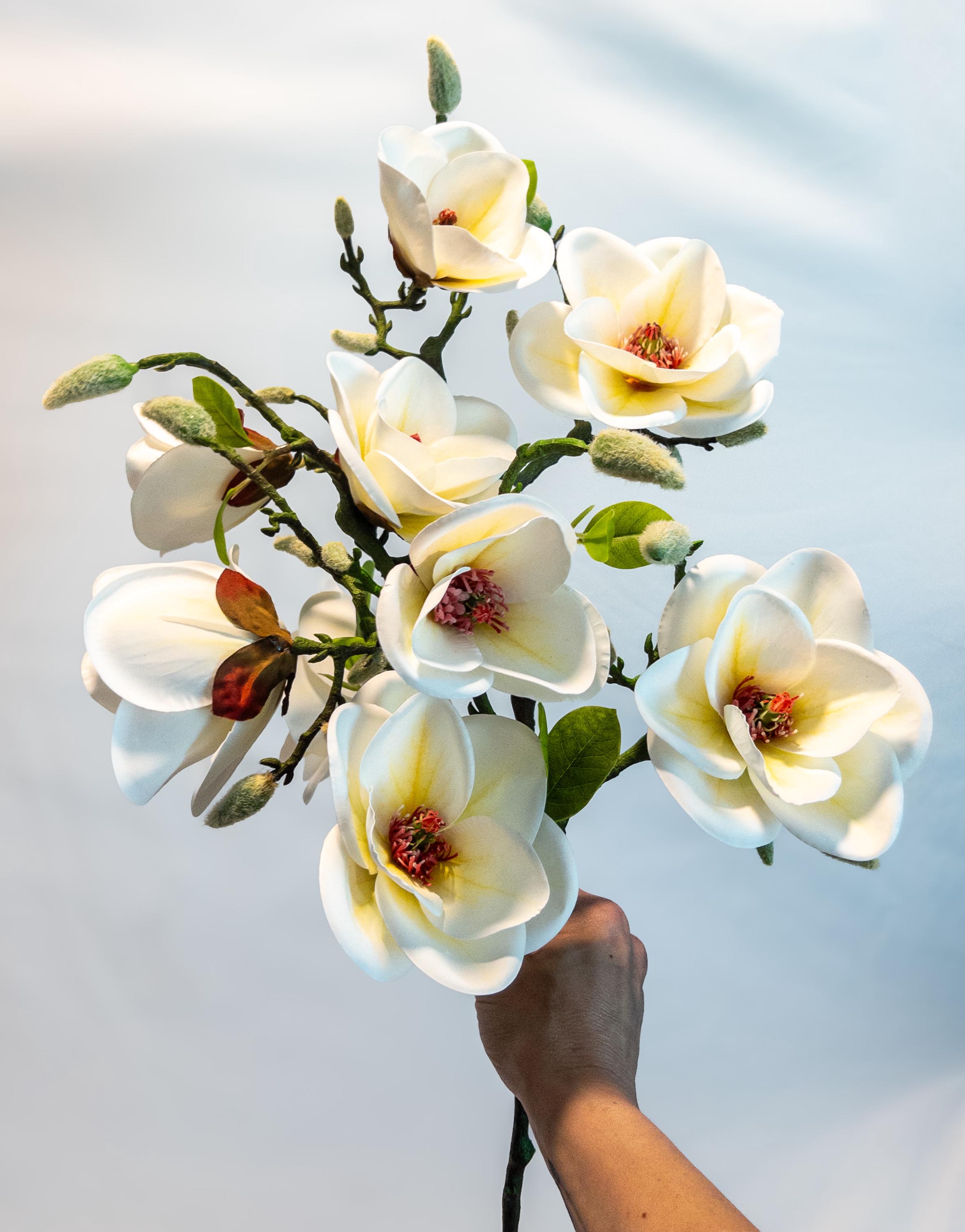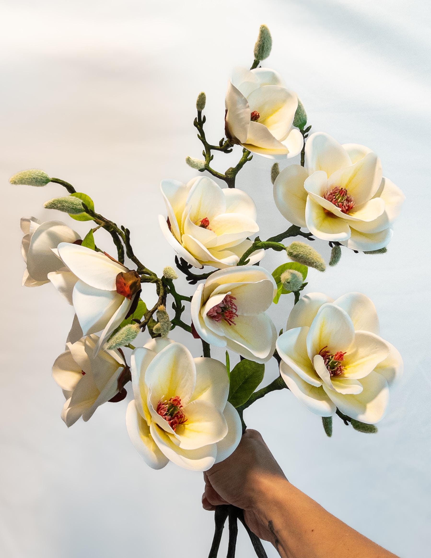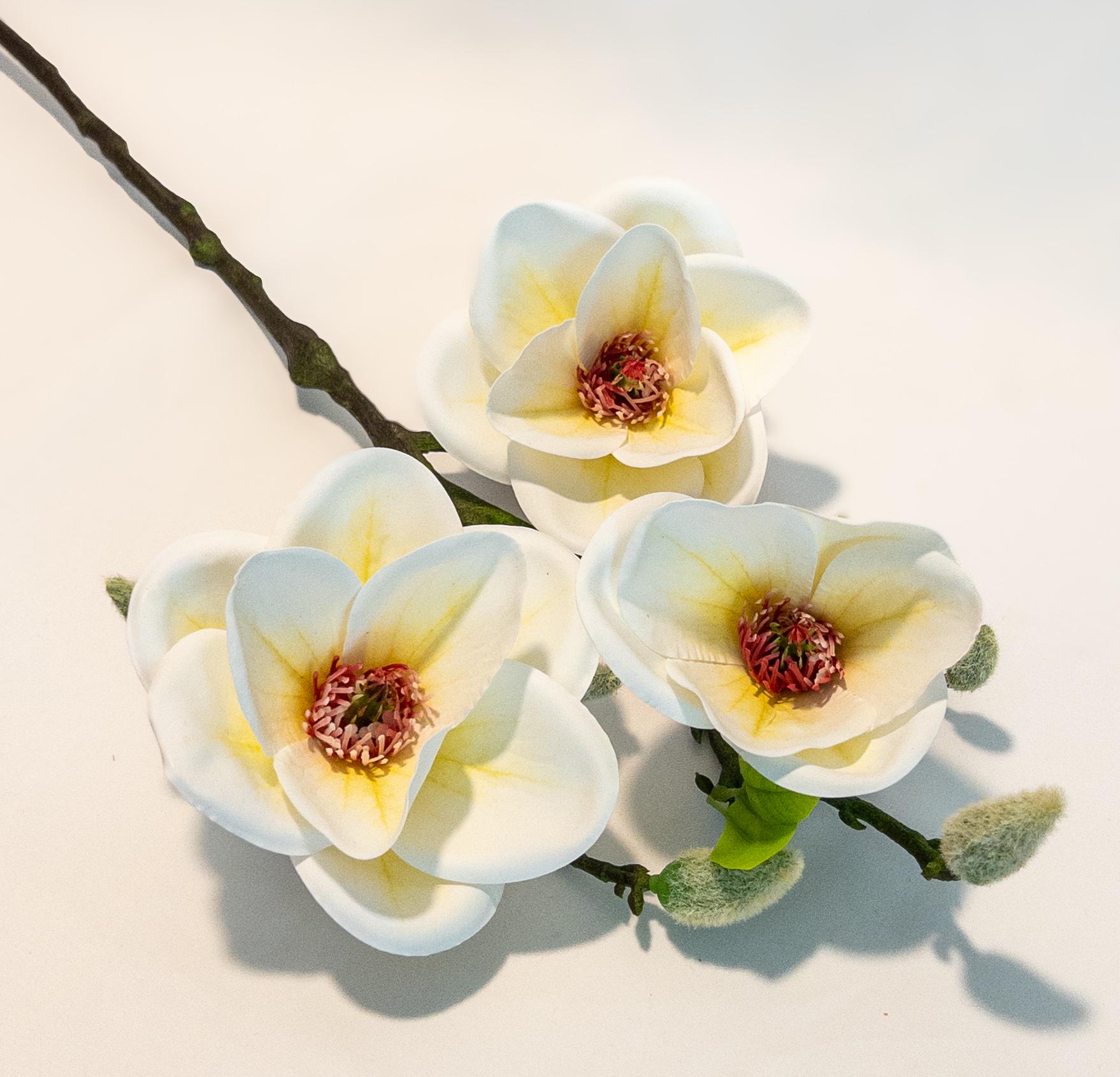 Bring timeless elegance to your home with this cream magnolia spray stem. Standing 20 inches tall, this lifelike branch features three exquisite magnolia blooms, ranging from 3 ½ to 4 ½ inches across, with soft cream petals kissed with subtle yellow accents and warm pink centers. The realistic texture, natural branching, and fuzzy magnolia buds make this stem a versatile piece for year-round styling.