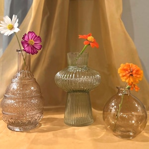 Warm, rich, and full of charm—these amber glass bud vases are a gorgeous nod to vintage style with timeless appeal. Each vase in this collection has its own distinct shape and texture, making them perfect for displaying single stems, tiny bouquets, or simply adding a touch of golden glow to your shelf or tablescape.