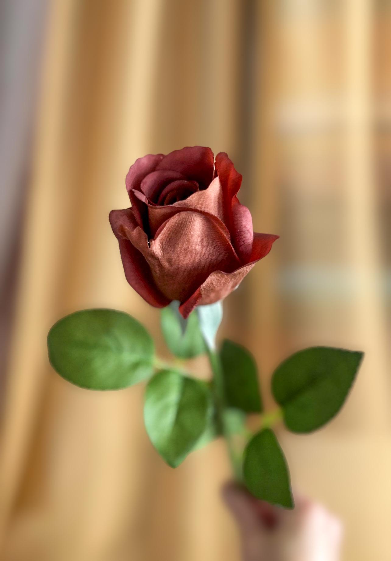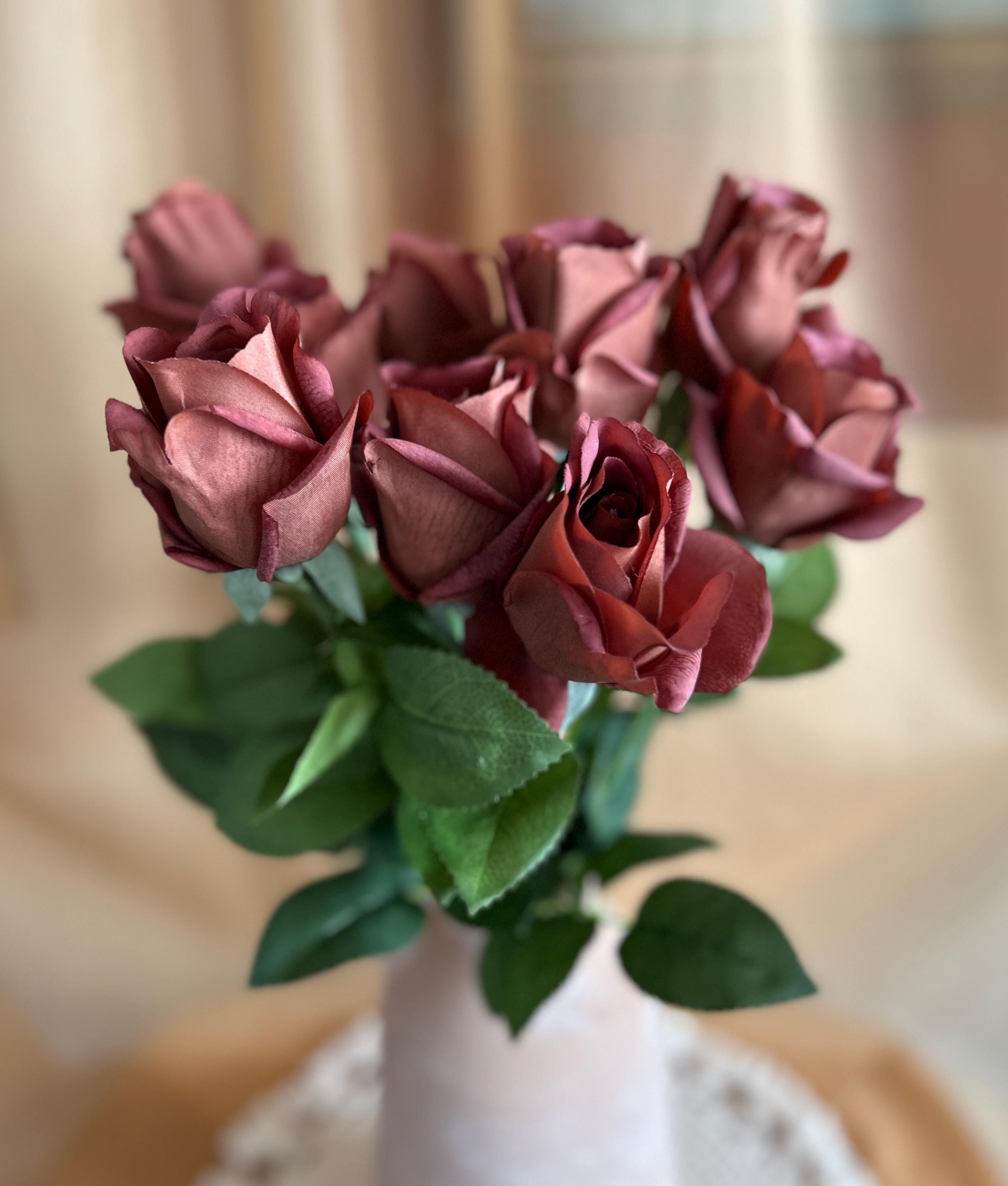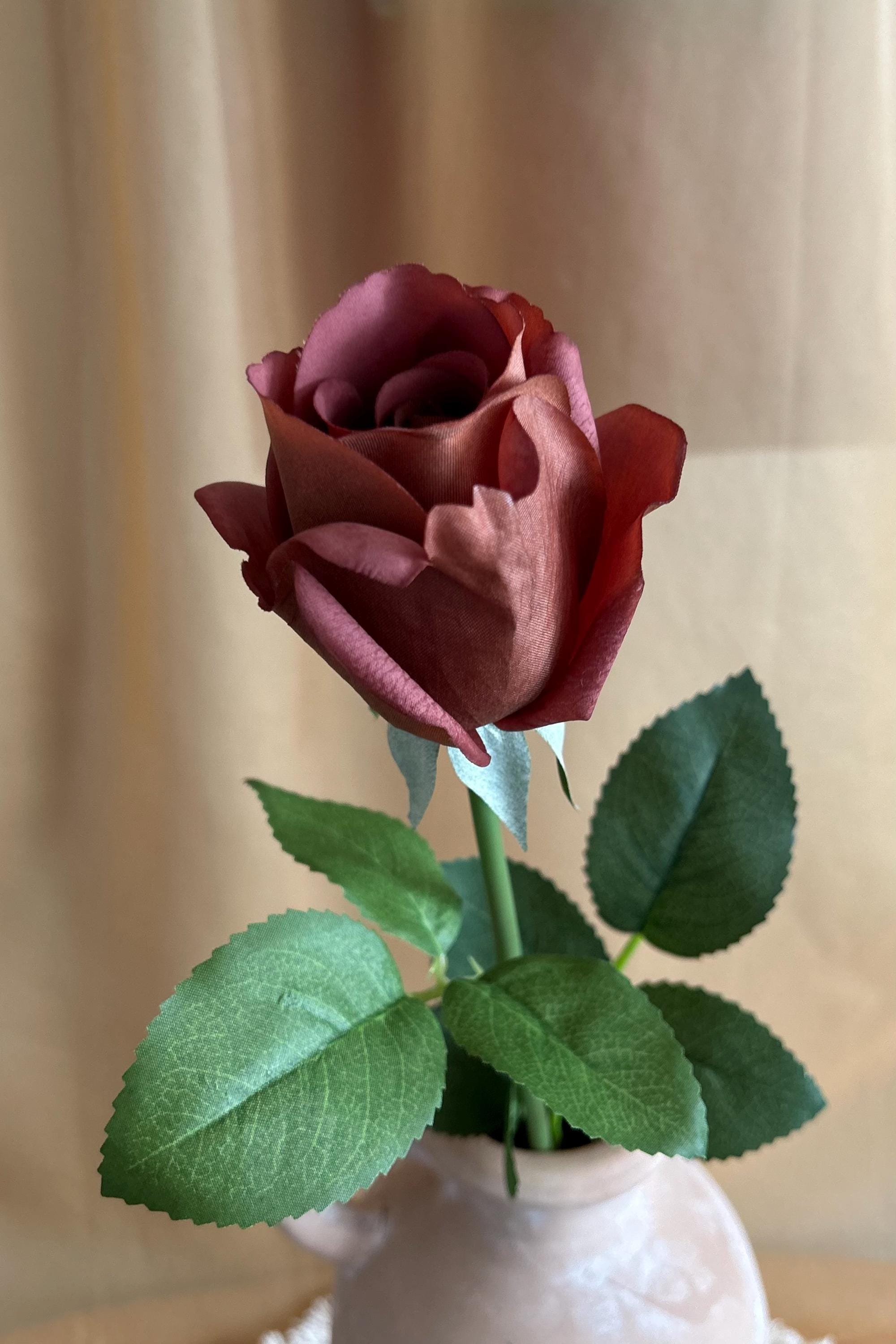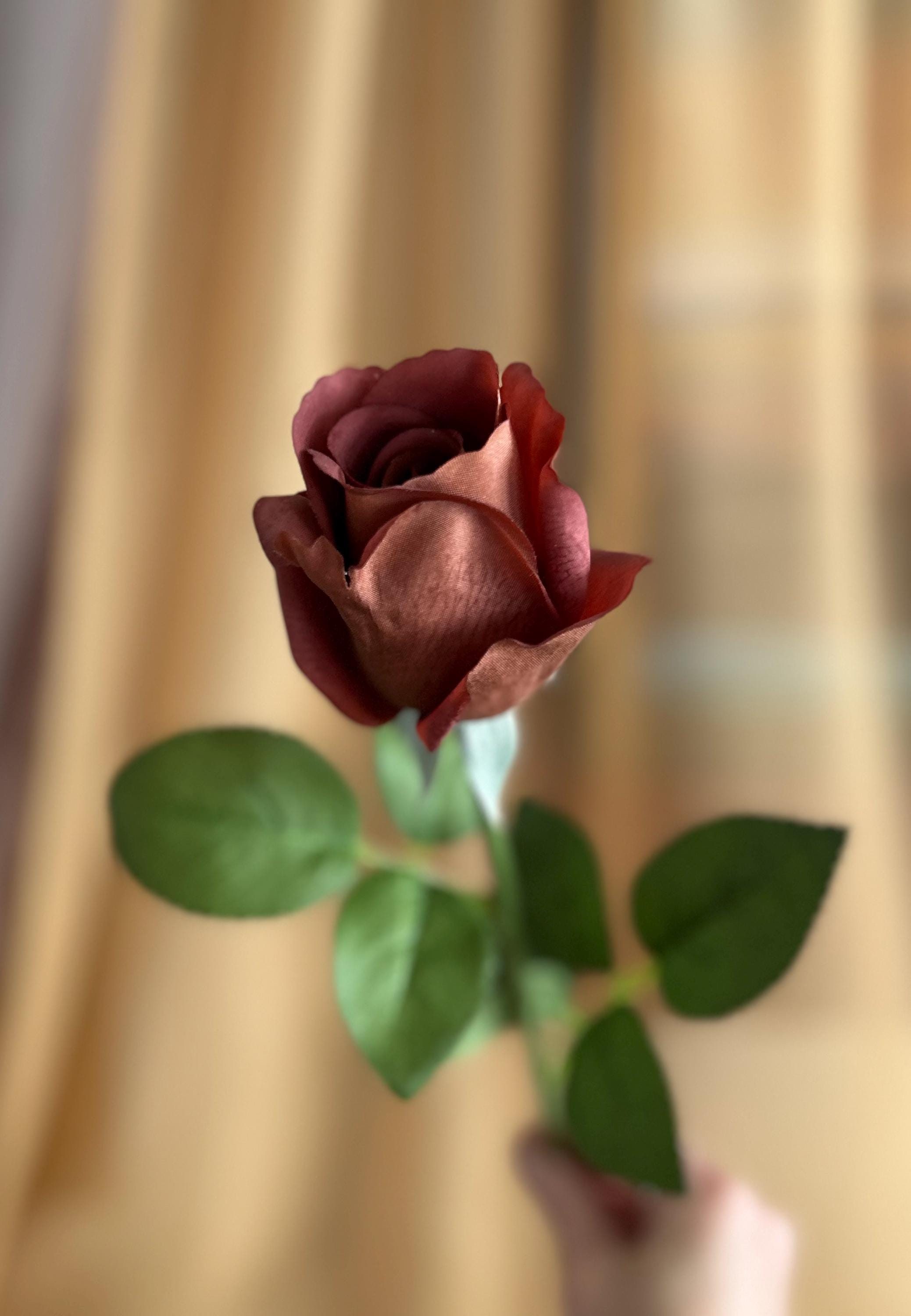 Add a touch of rich sophistication to your floral collection with this dark mocha rose stem. Measuring approximately 21 ½ inches long, this realistic faux rose features a moisturized touch velvety bloom about 3 inches wide, offering a striking deep mocha-brown hue with warm undertones. The lush green leaves and sturdy stem bring lifelike detail, making it perfect for both modern and vintage-inspired arrangements.