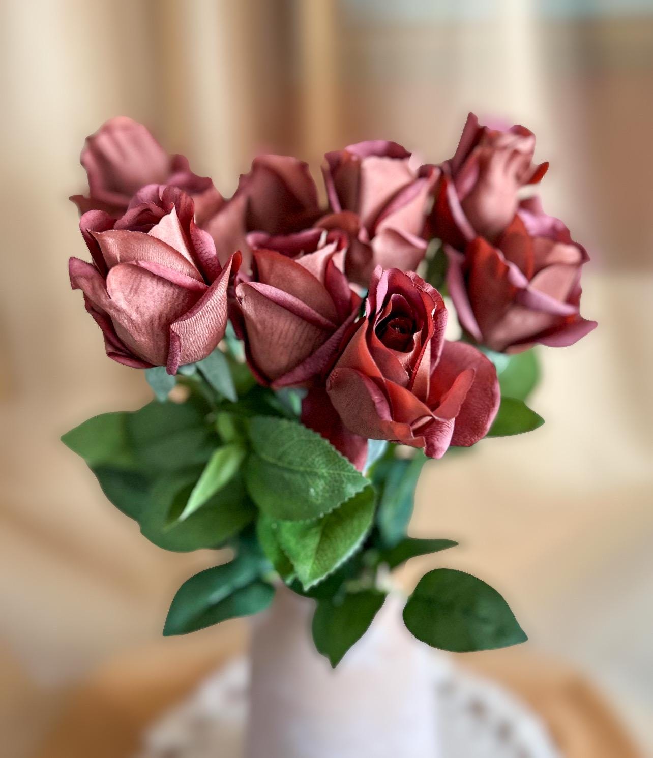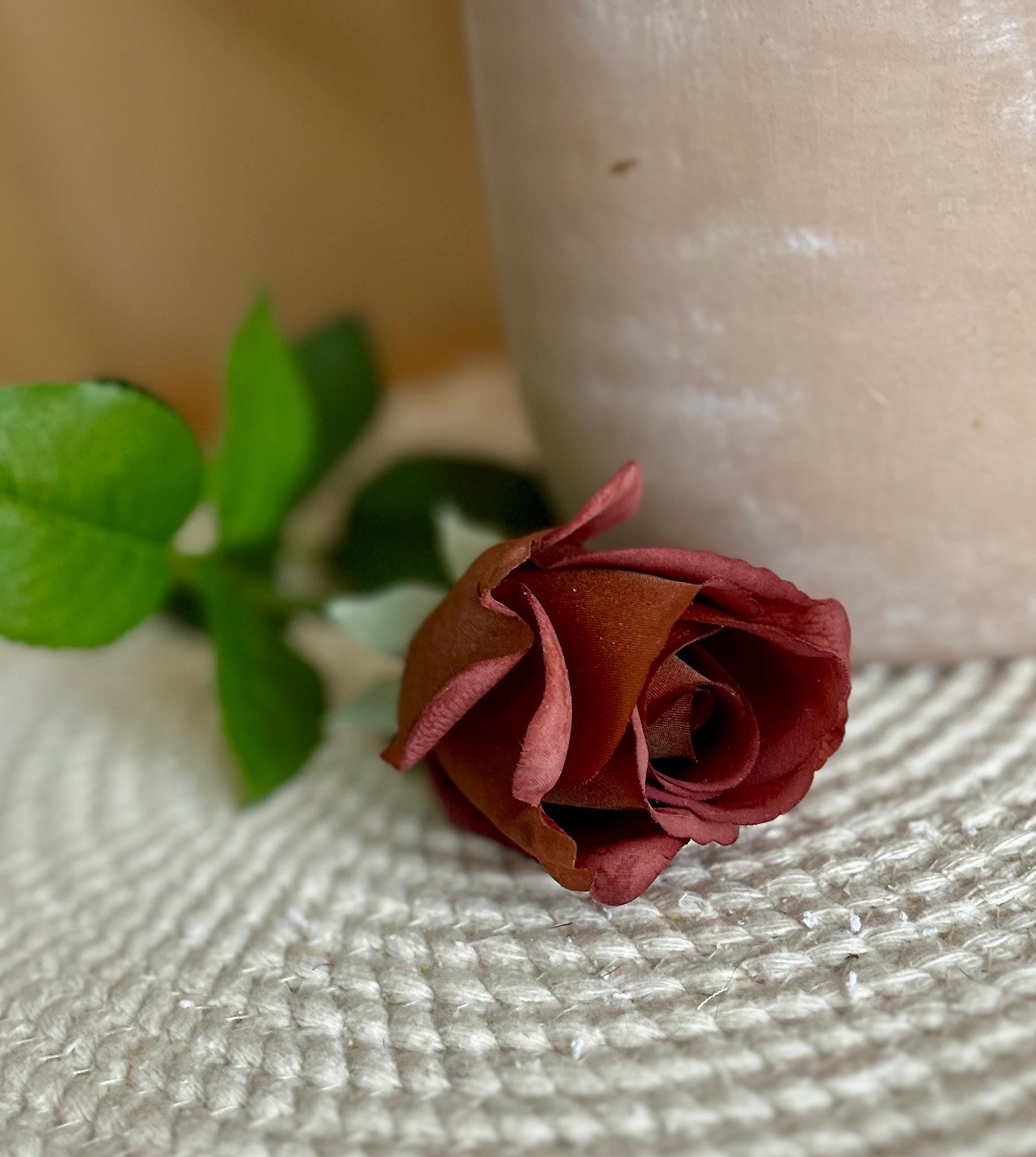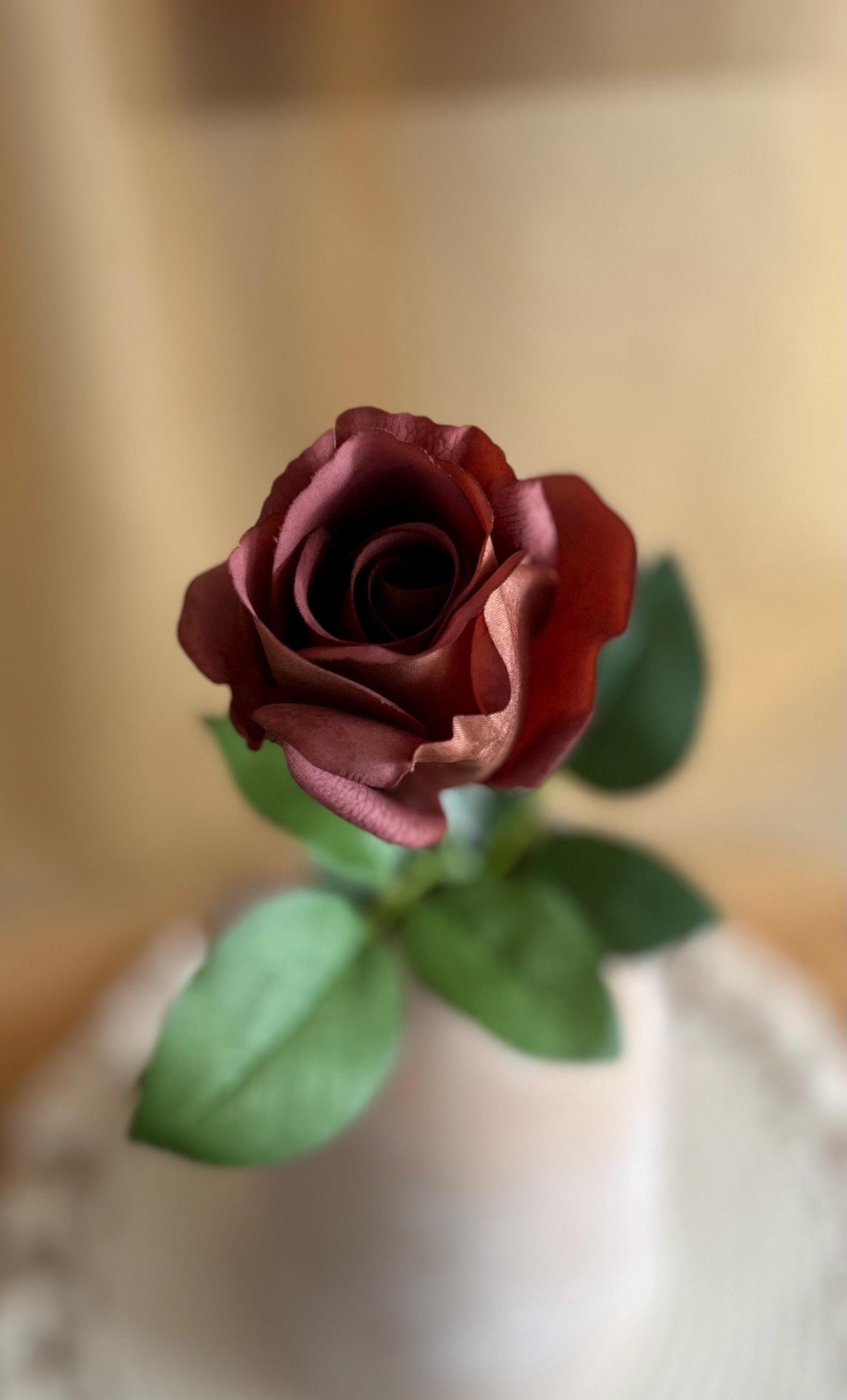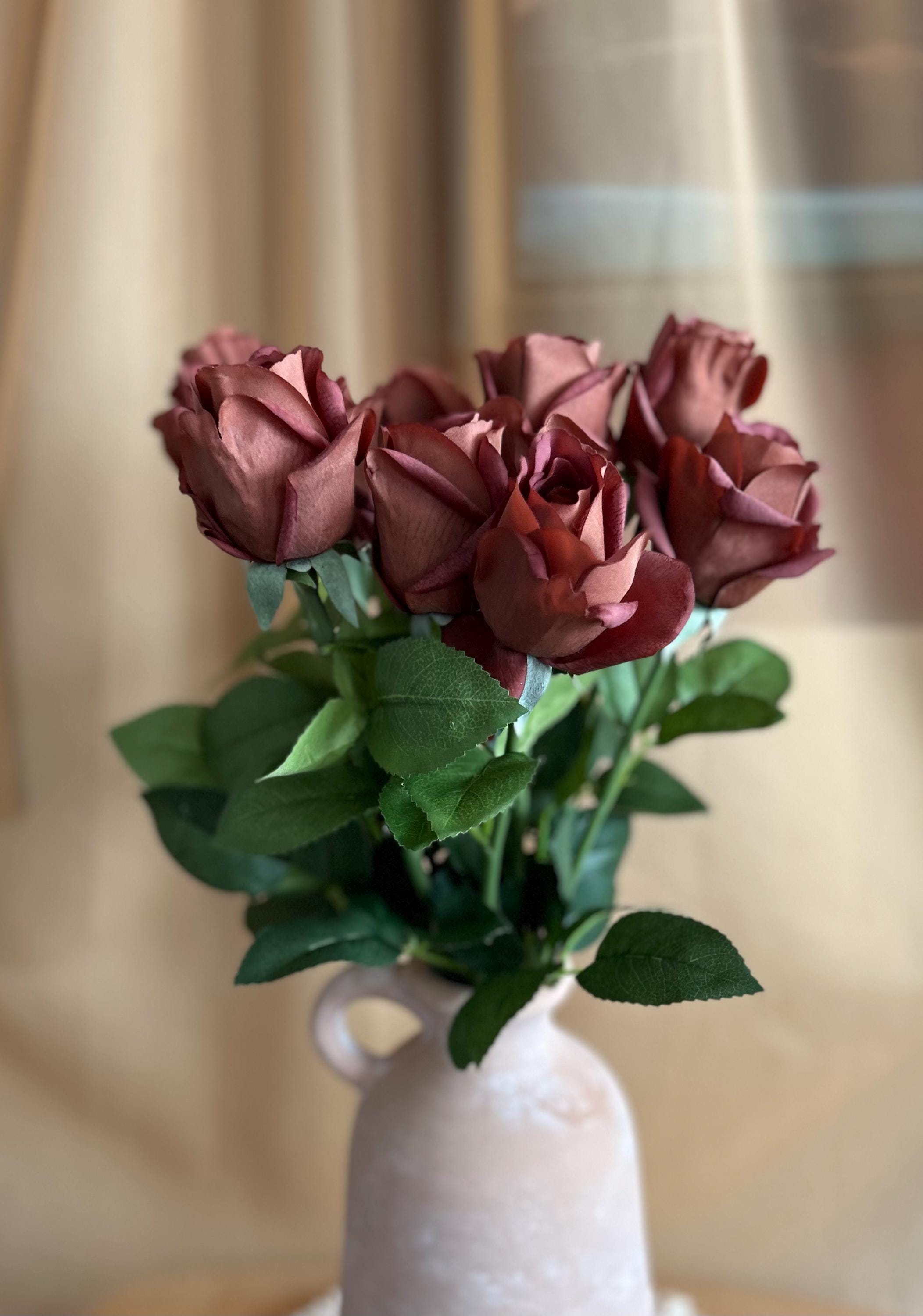 Add a touch of rich sophistication to your floral collection with this dark mocha rose stem. Measuring approximately 21 ½ inches long, this realistic faux rose features a moisturized touch velvety bloom about 3 inches wide, offering a striking deep mocha-brown hue with warm undertones. The lush green leaves and sturdy stem bring lifelike detail, making it perfect for both modern and vintage-inspired arrangements.
