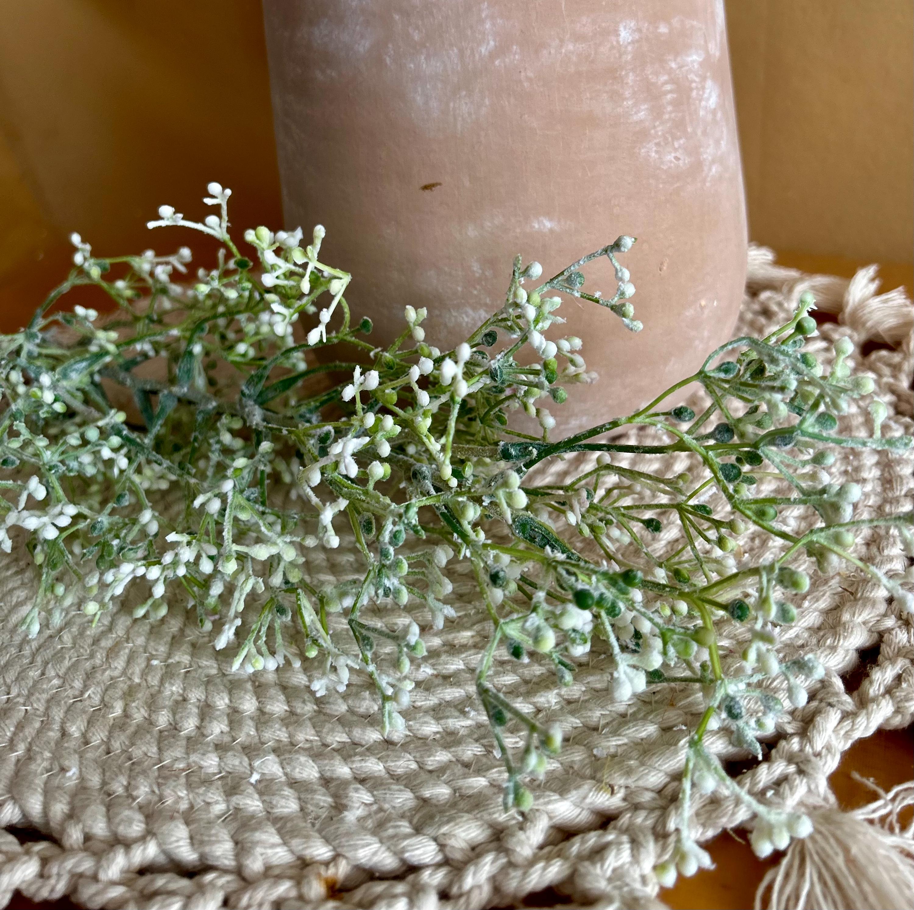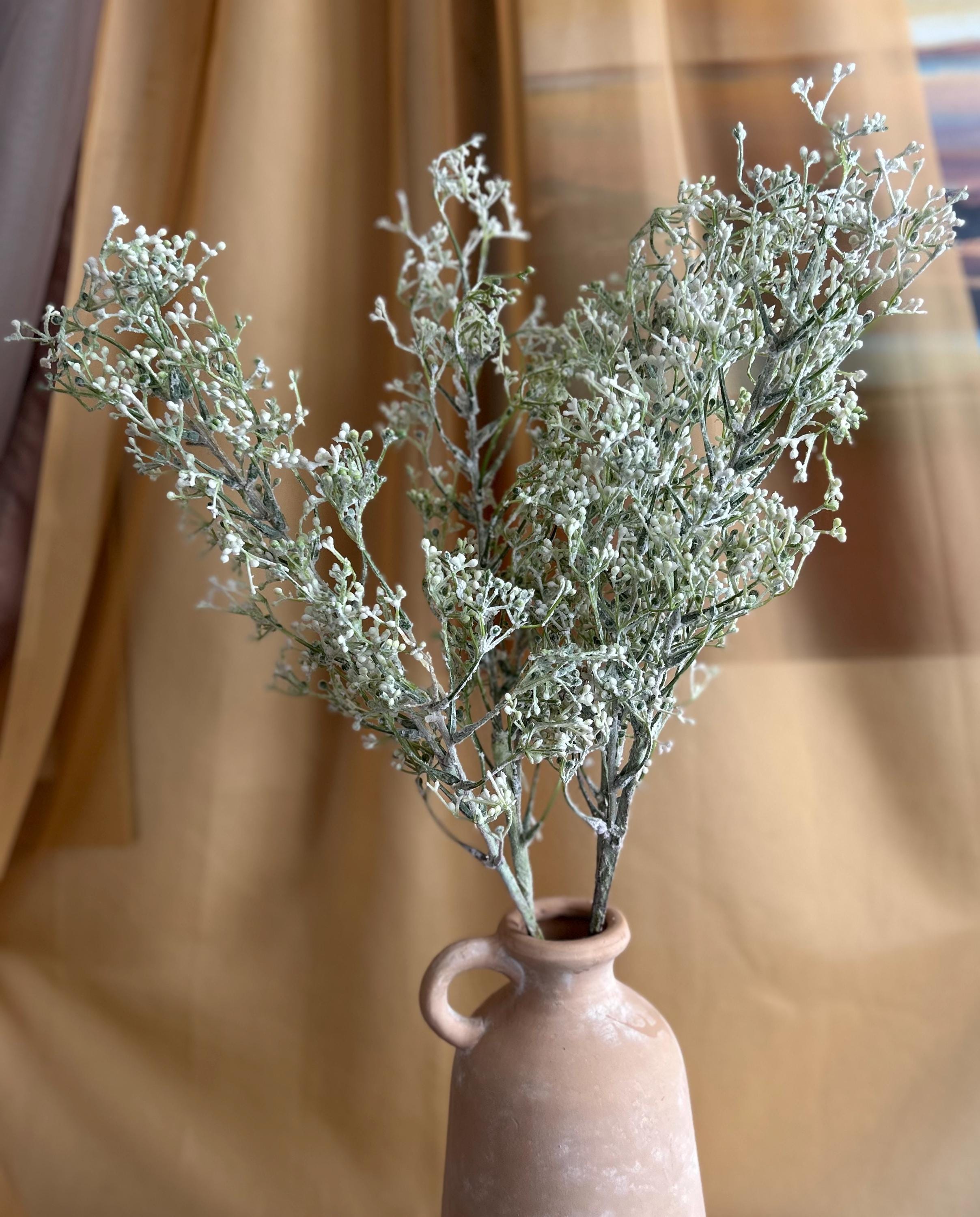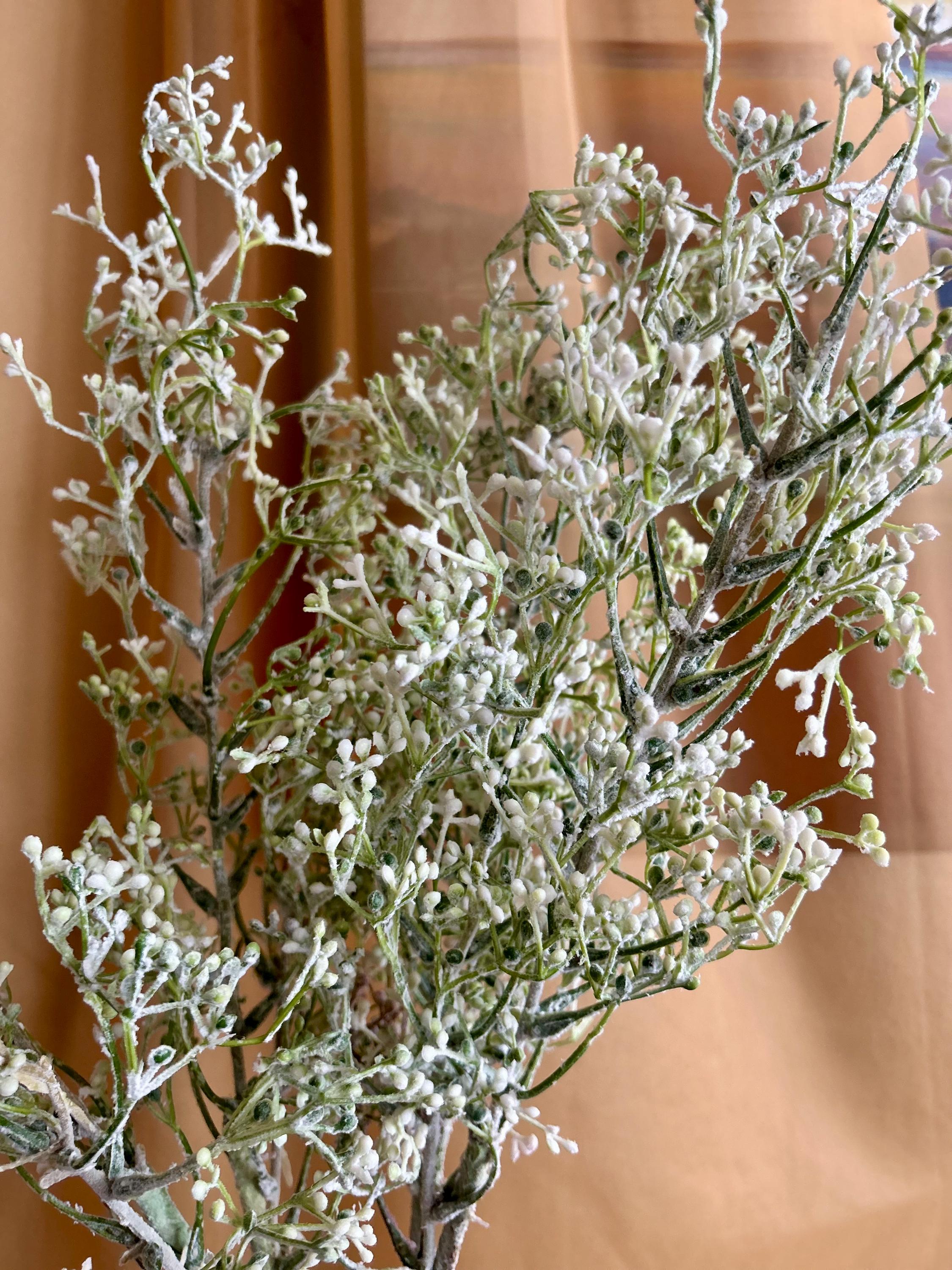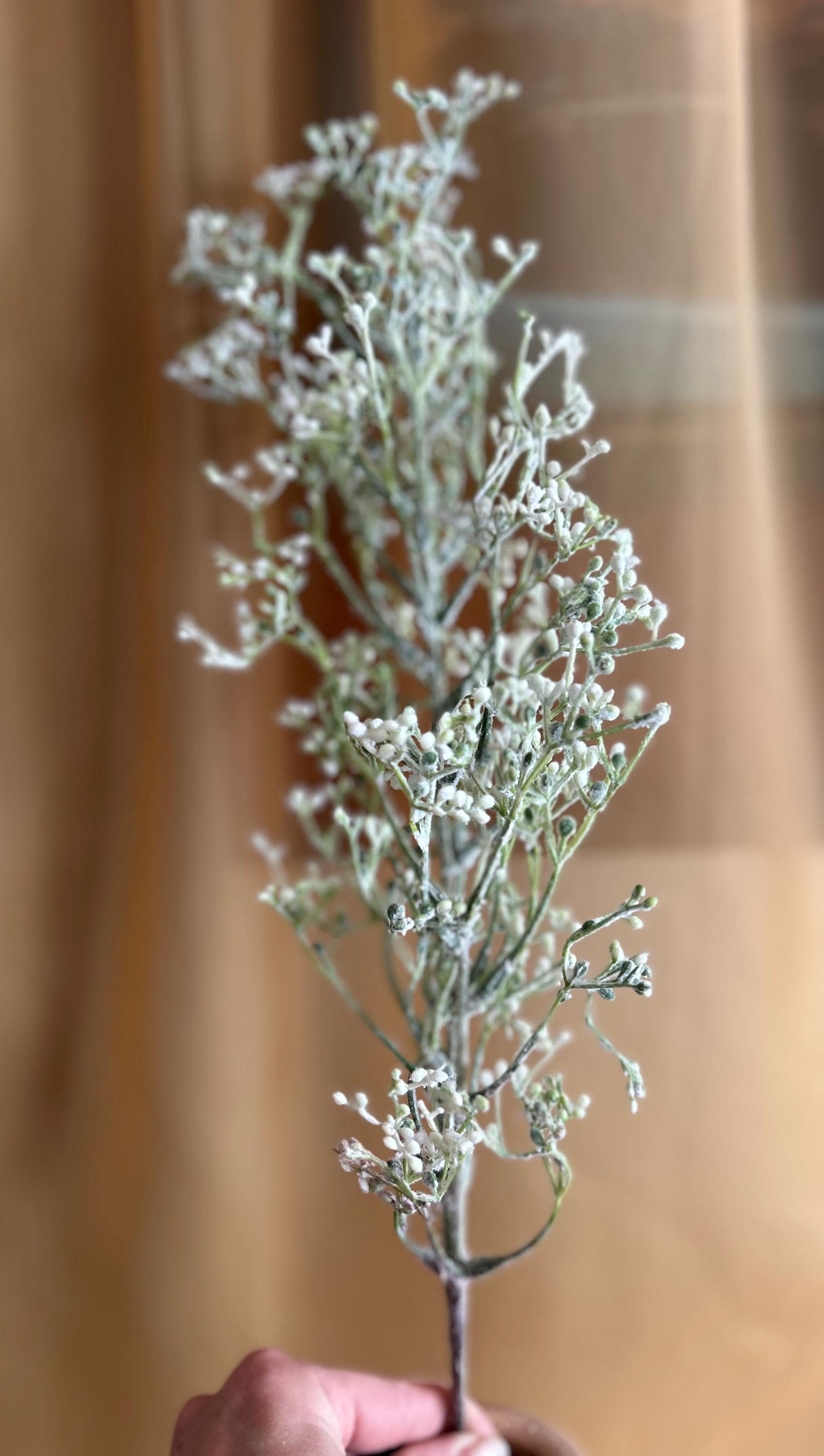 Bring a touch of wintry charm to your arrangements with this frosty white seeded greenery stem. Measuring approximately 28 inches long and 5 inches across (depending on shaping), this stem features delicate seed clusters coated in a soft frosted finish, creating a snowy, woodland-inspired look.