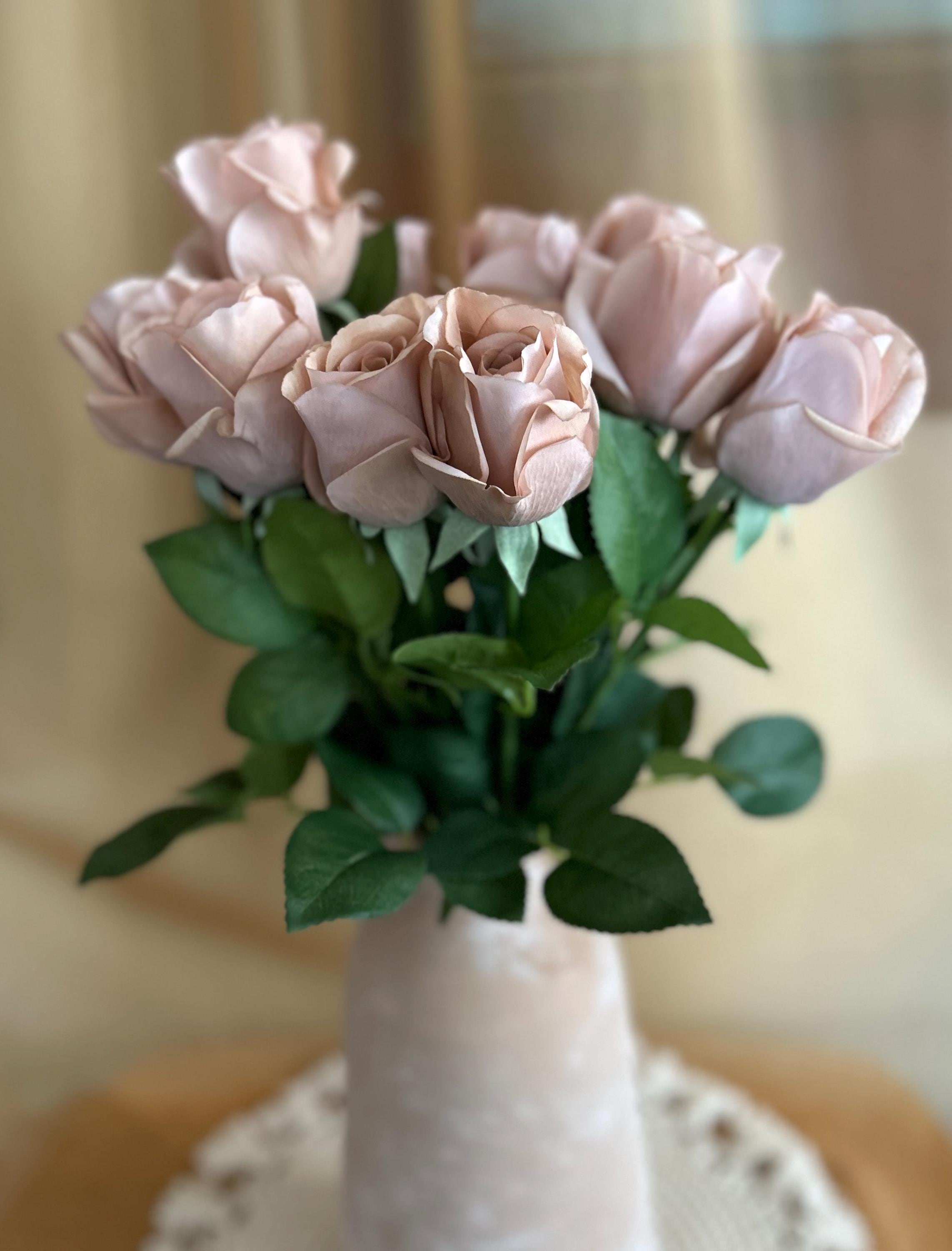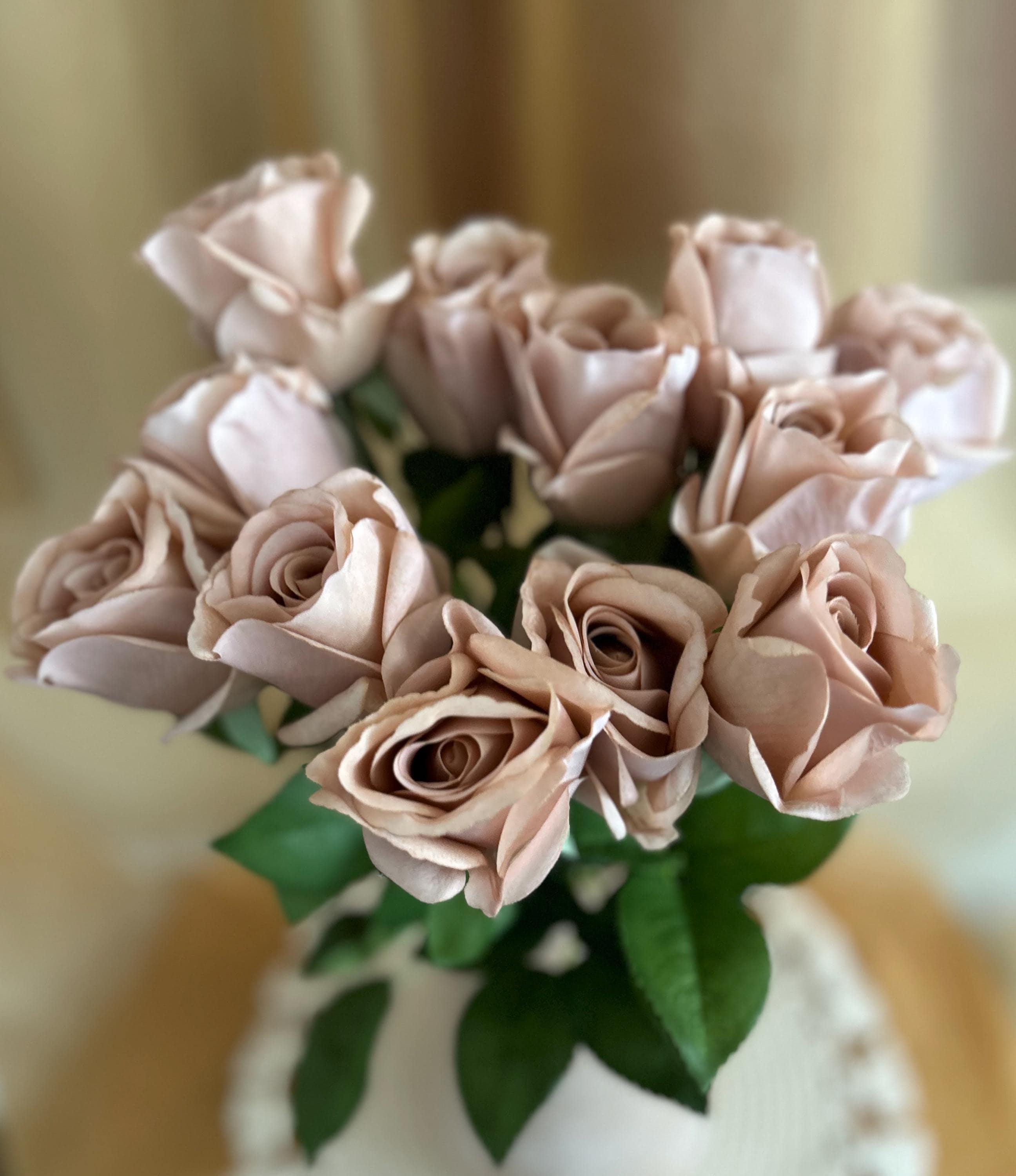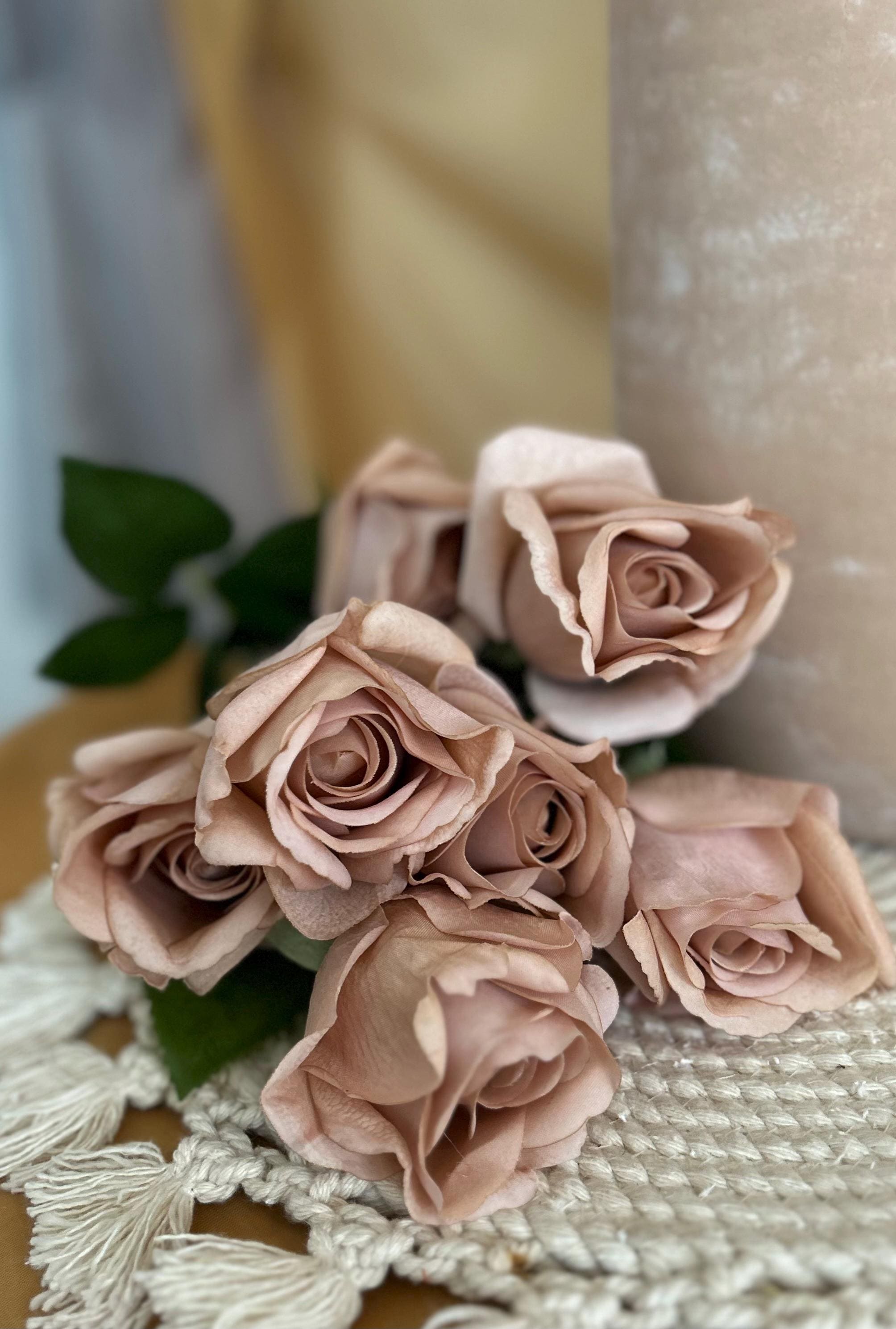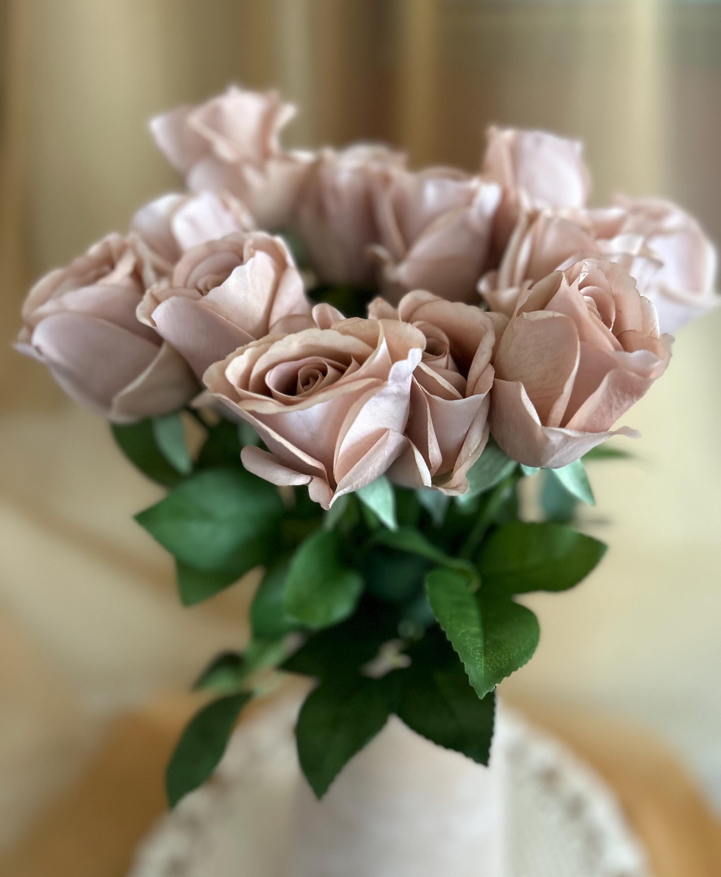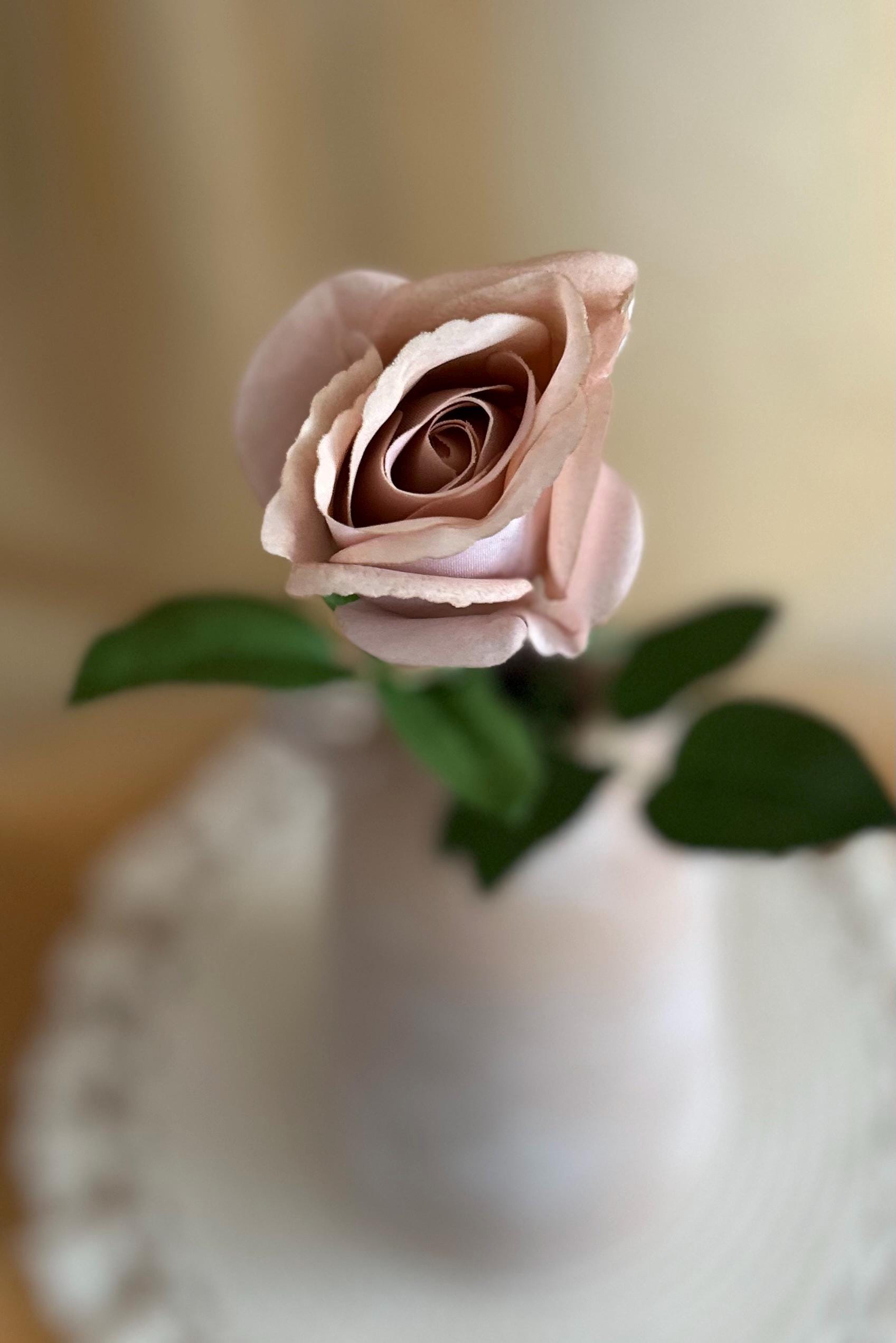 Add a touch of rich sophistication to your floral collection with this light mocha rose stem. Measuring approximately 21 ½ inches long, this realistic faux rose features a moisturized touch velvety bloom about 3 inches wide, offering a gorgeous light mocha hue with blush pink undertones. The lush green leaves and sturdy stem bring lifelike detail, making it perfect for both modern and vintage-inspired arrangements.