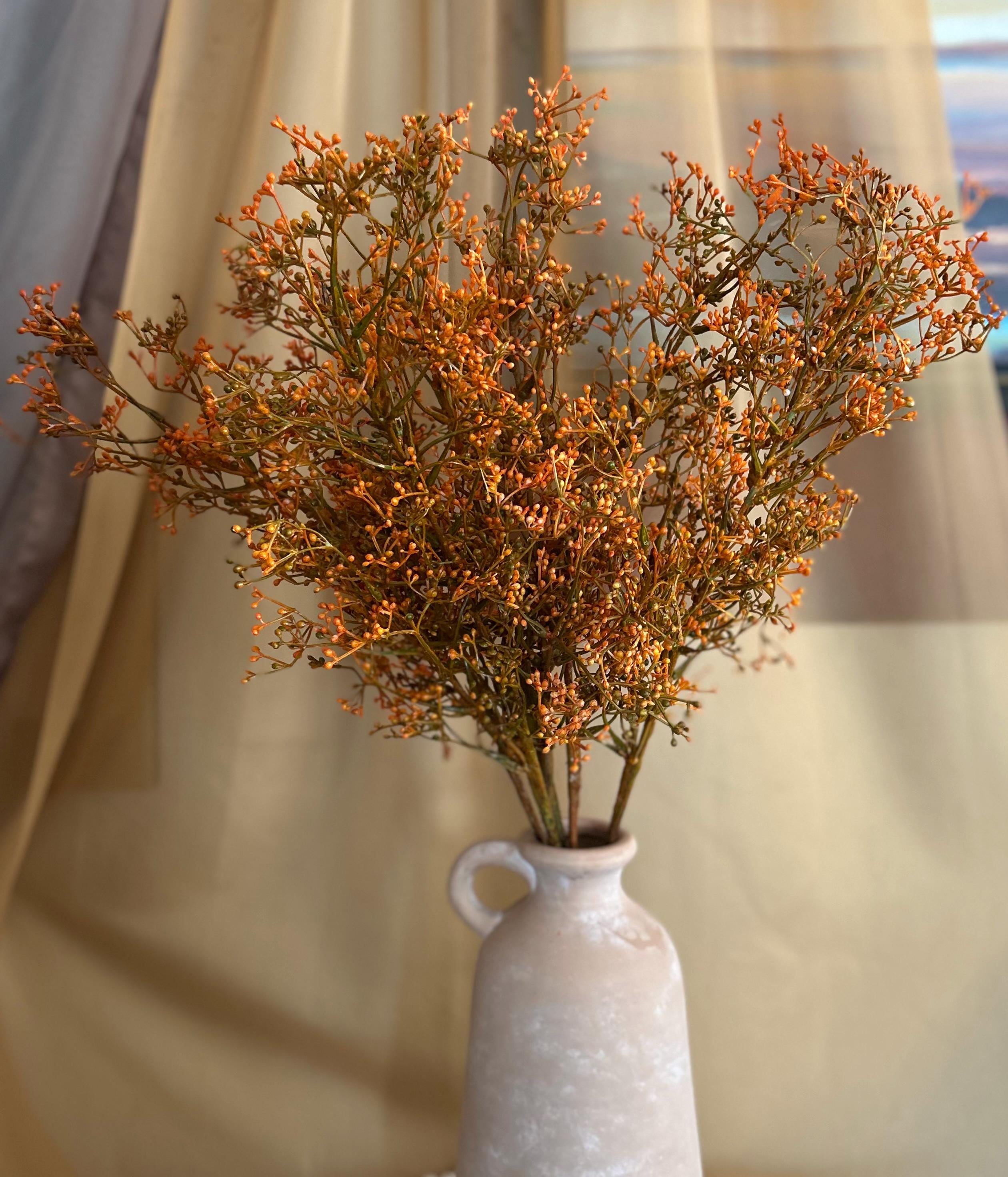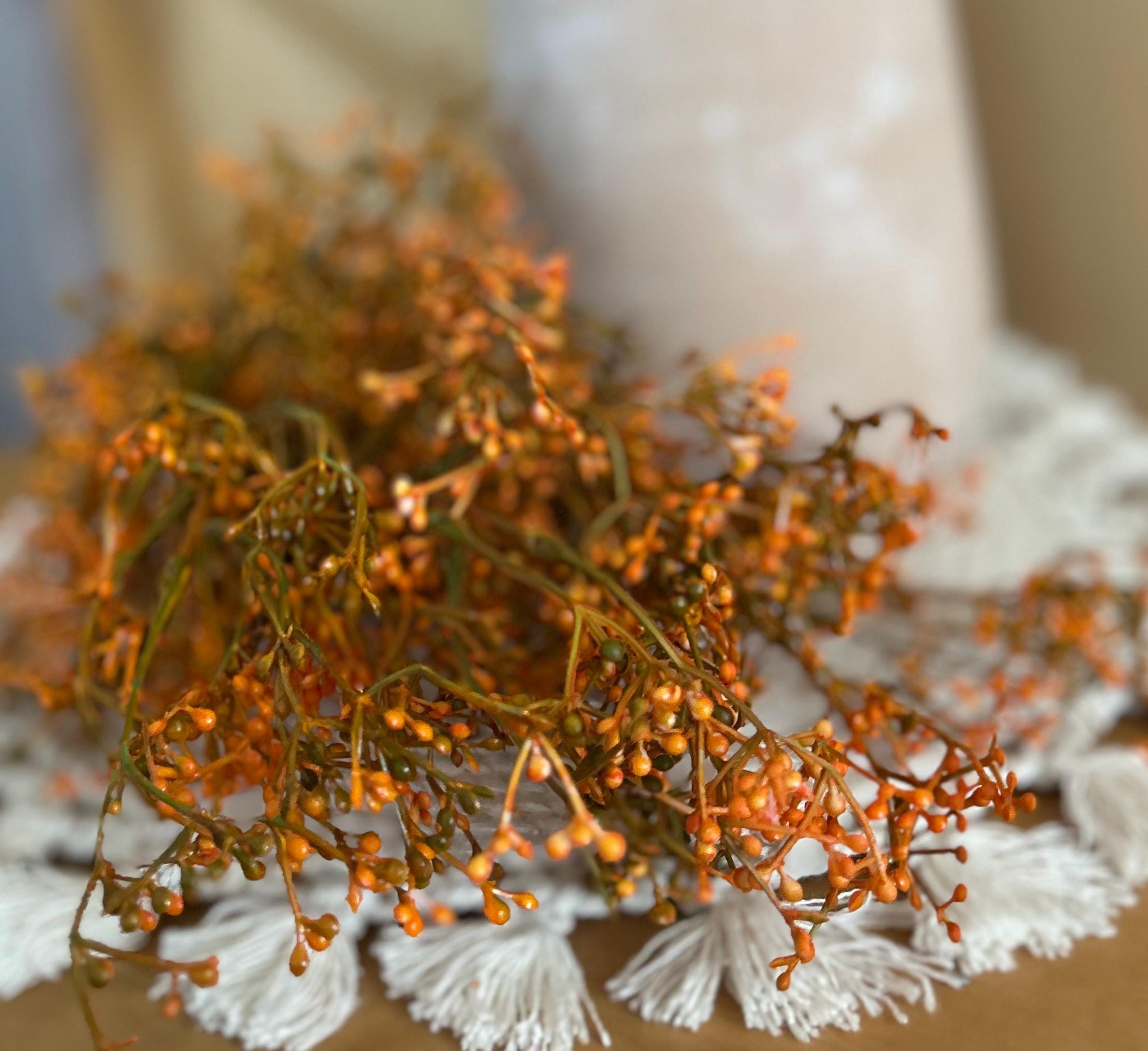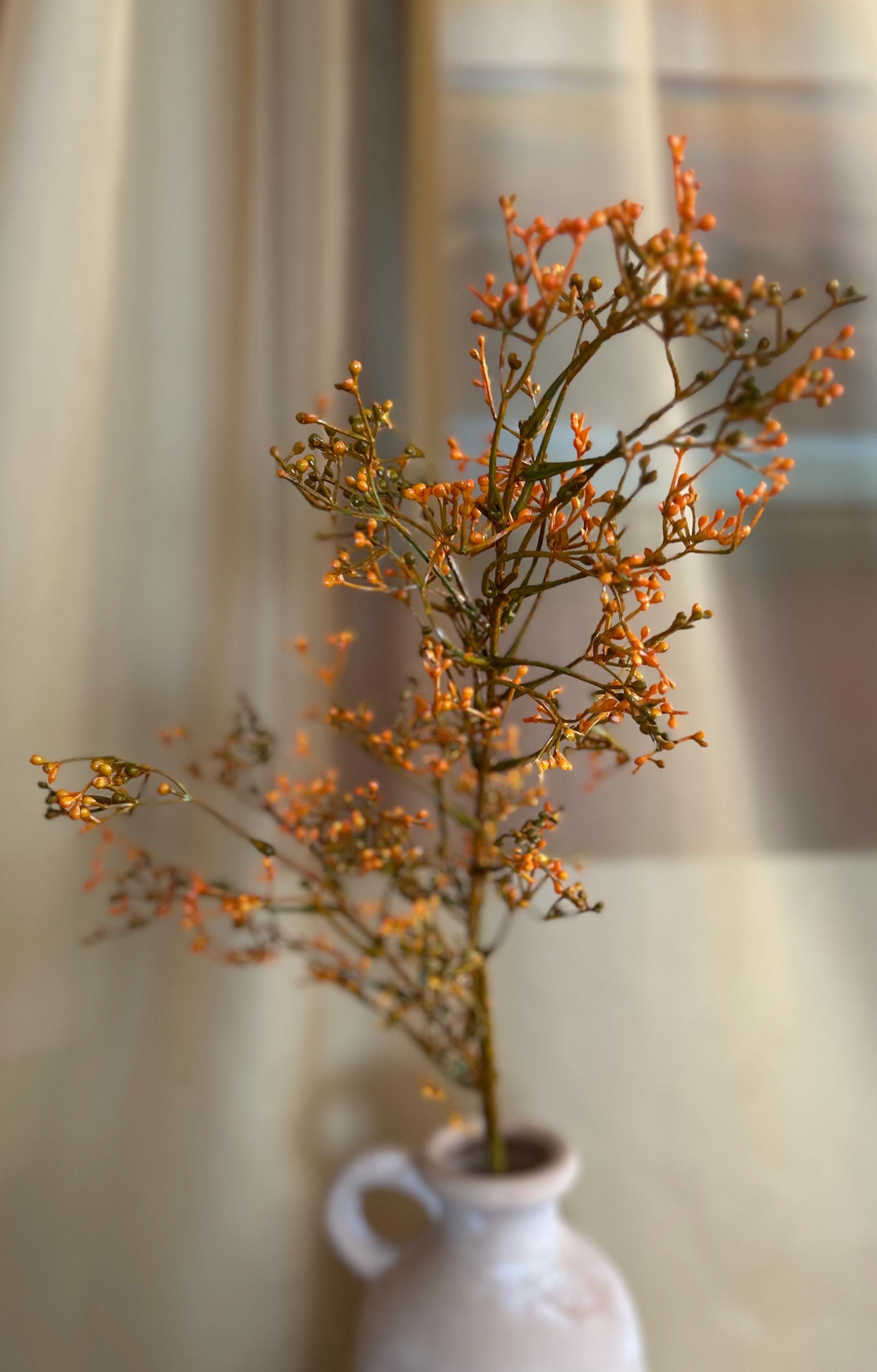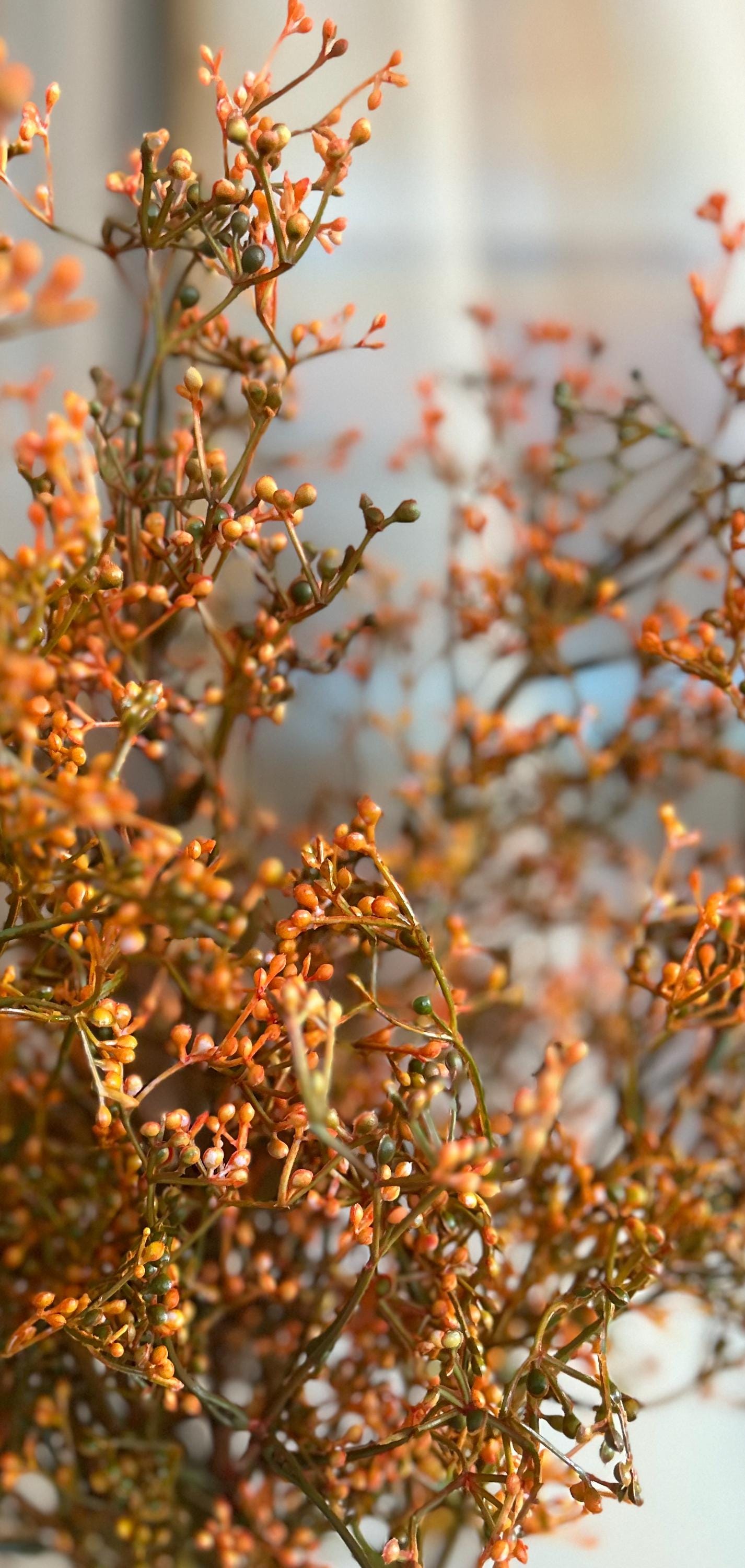 Bring the warmth of autumn indoors with this 28-inch, deep fall orange filler foliage branch. With its rich orange berry clusters and slender stems, this spray is the perfect seasonal accent to add texture, depth, and a natural harvest feel to any floral design.
