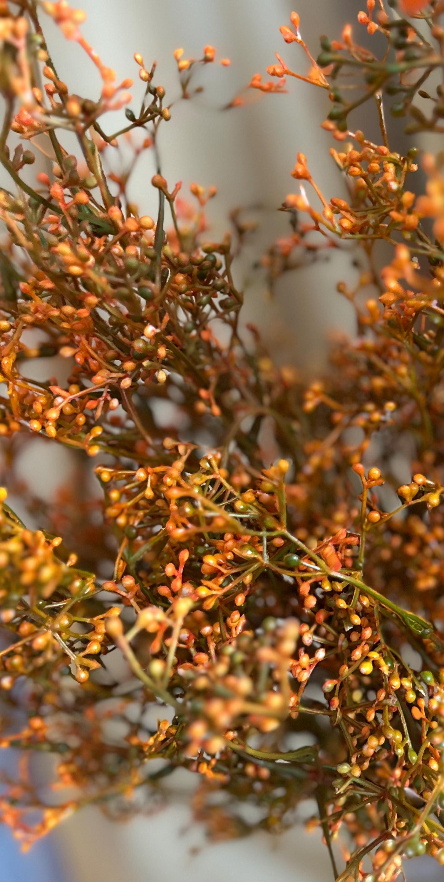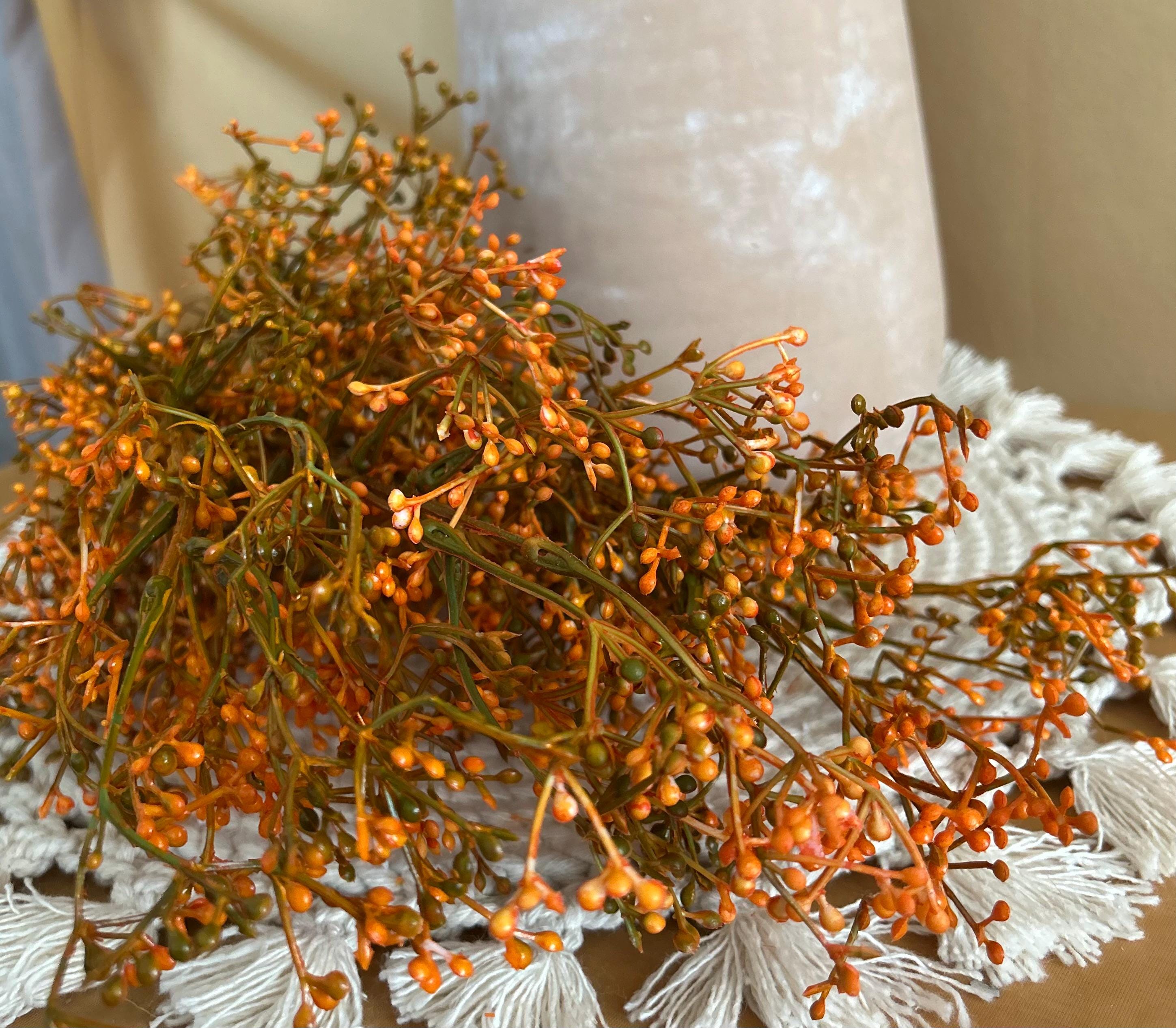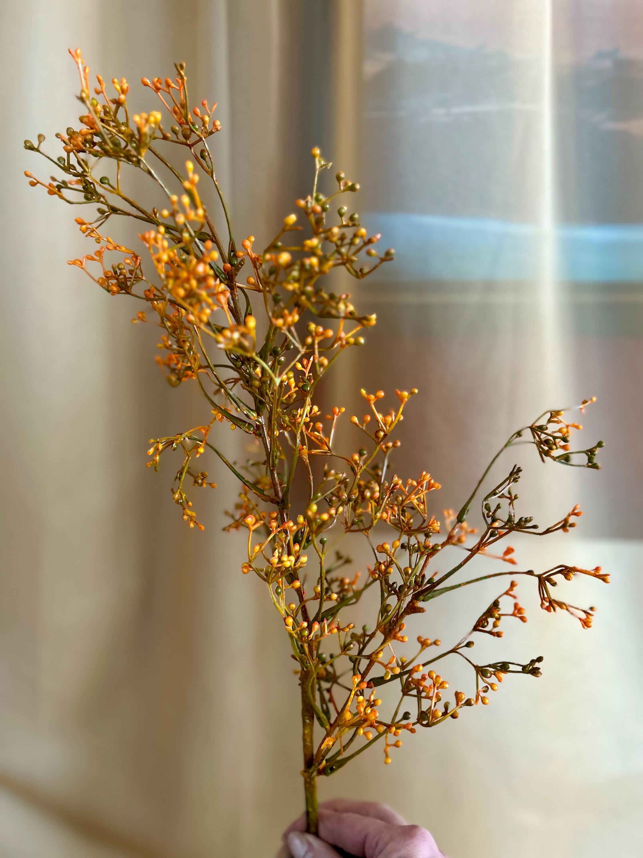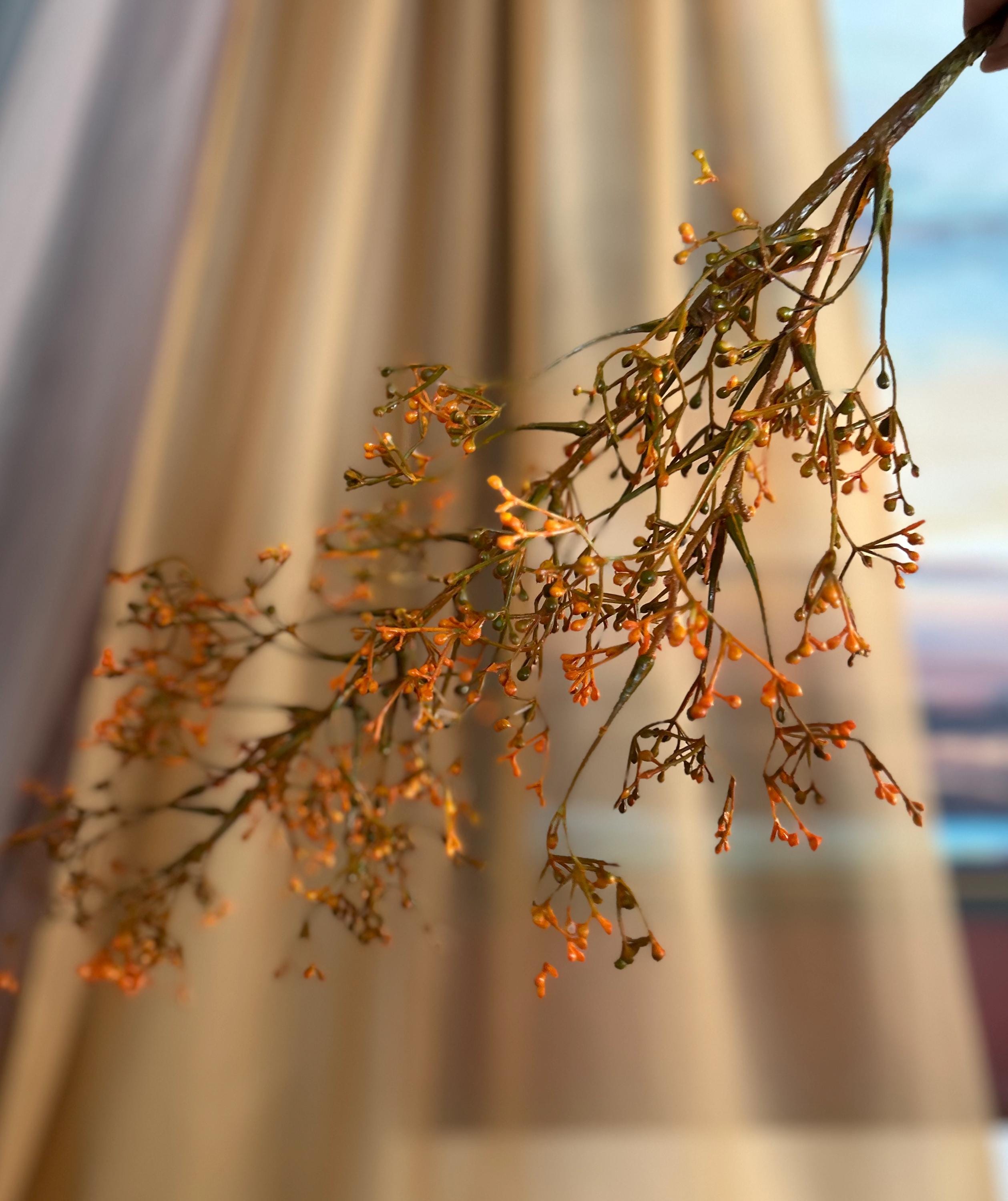 Bring the warmth of autumn indoors with this 28-inch, deep fall orange filler foliage branch. With its rich orange berry clusters and slender stems, this spray is the perfect seasonal accent to add texture, depth, and a natural harvest feel to any floral design.