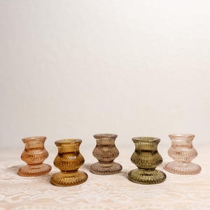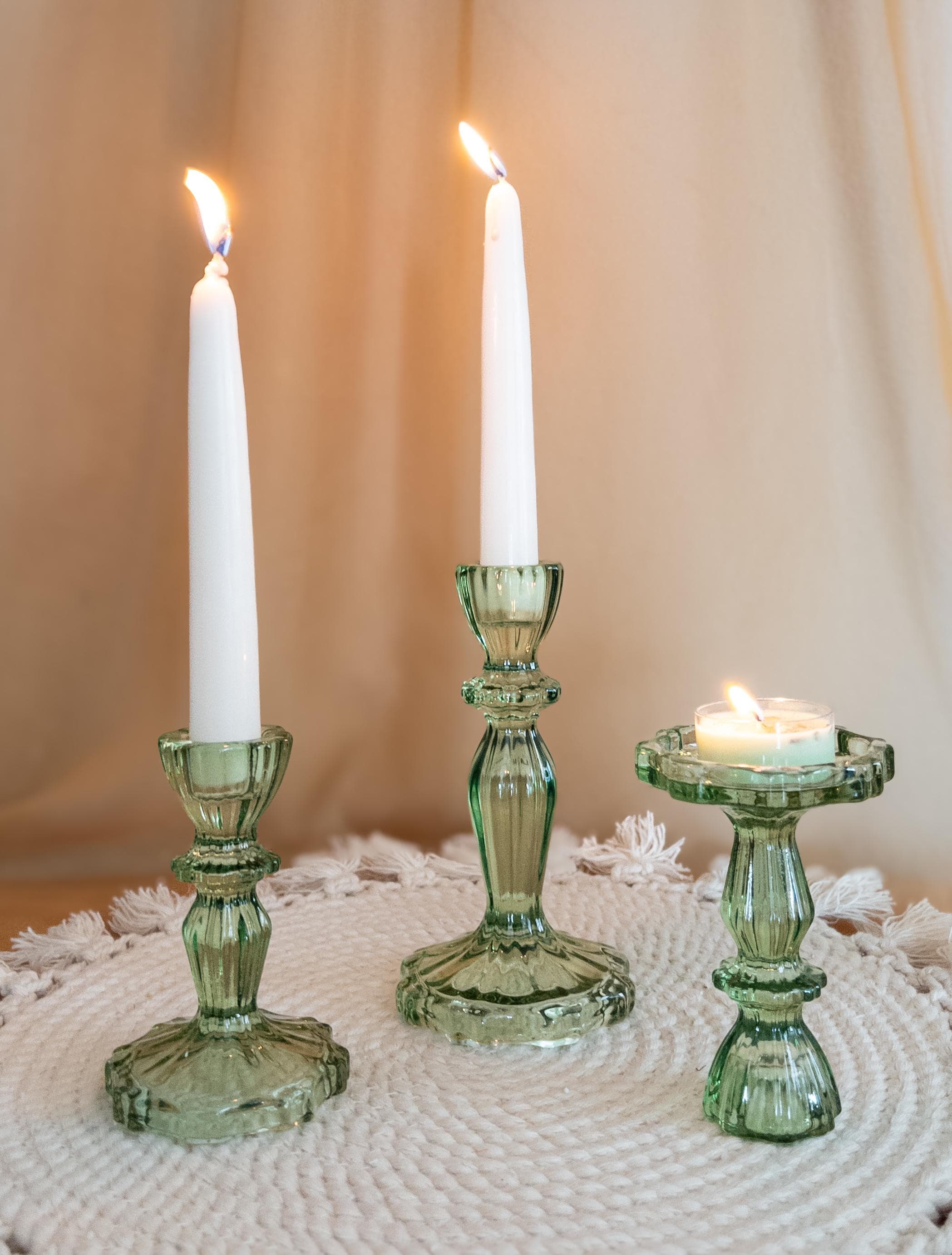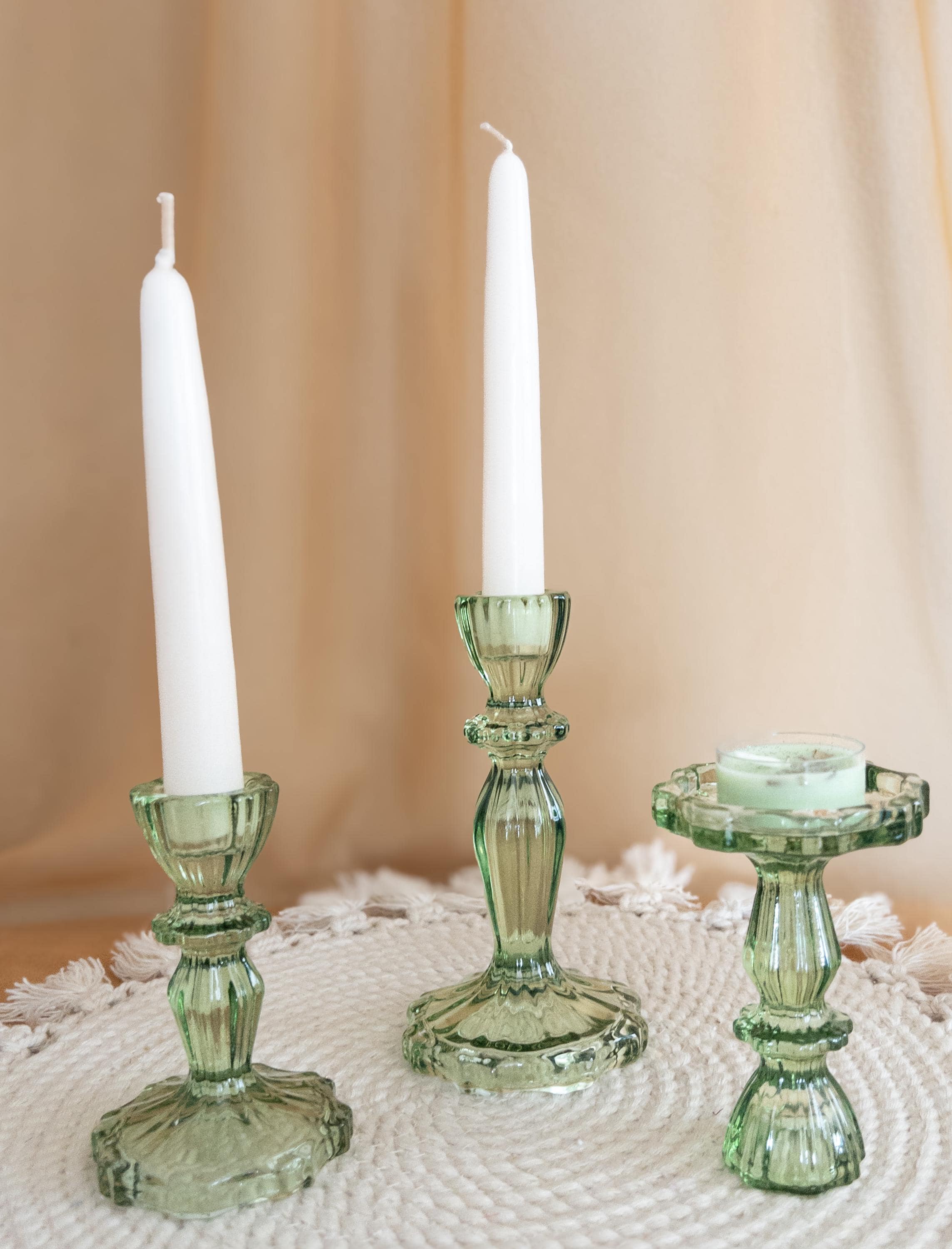 Bring a soft, romantic glow to your tablescape with these vintage-style green pressed glass candlestick holders, available in two sizes and sold individually. Their classic silhouette adds a timeless touch to mantels, dinner tables, weddings, or cozy everyday décor — beautifully catching the light with a subtle green hue.