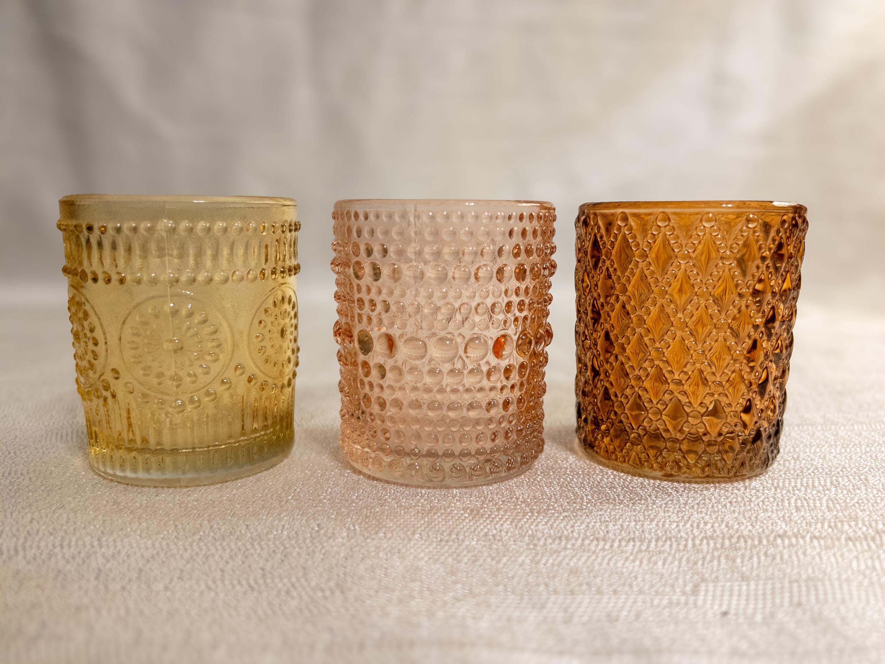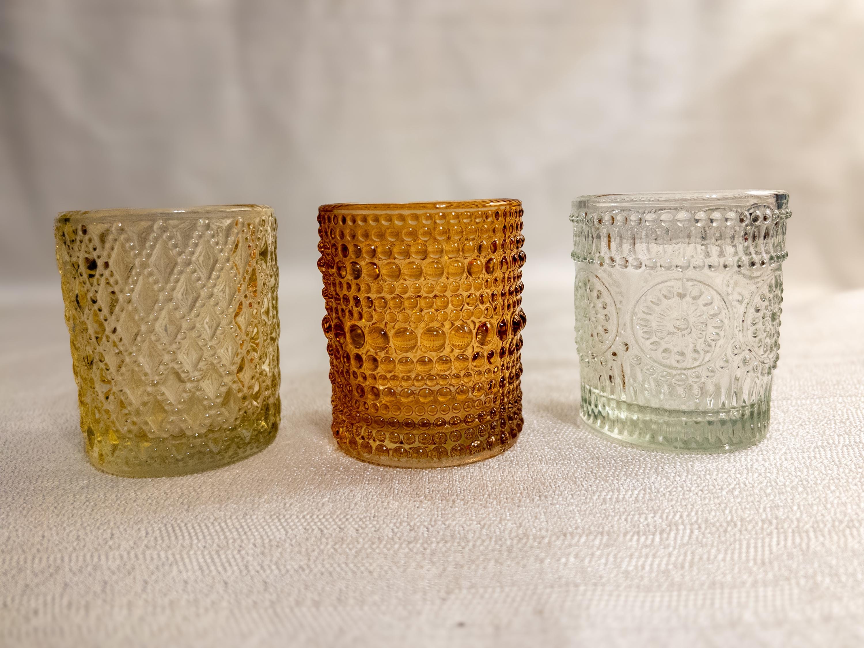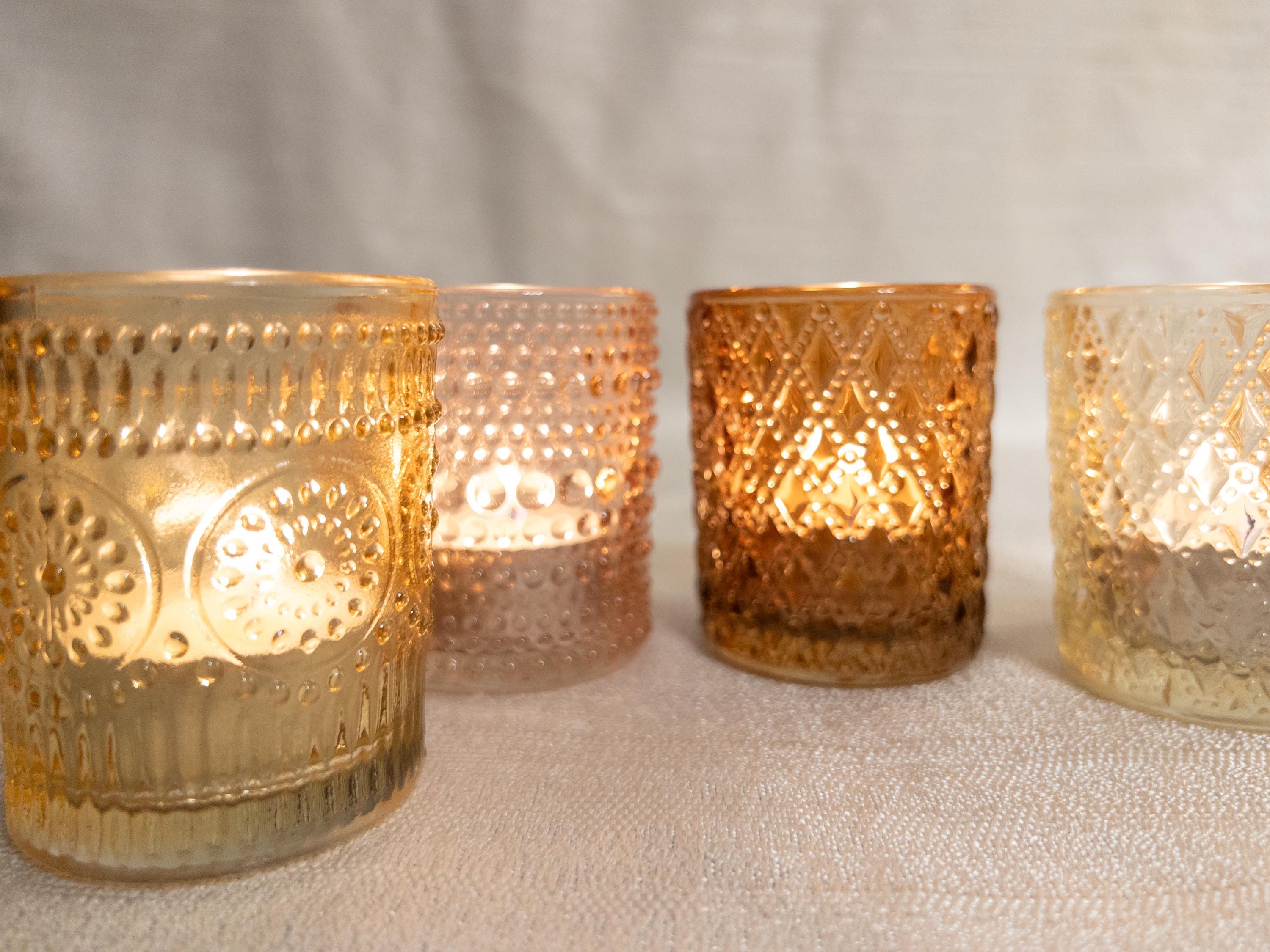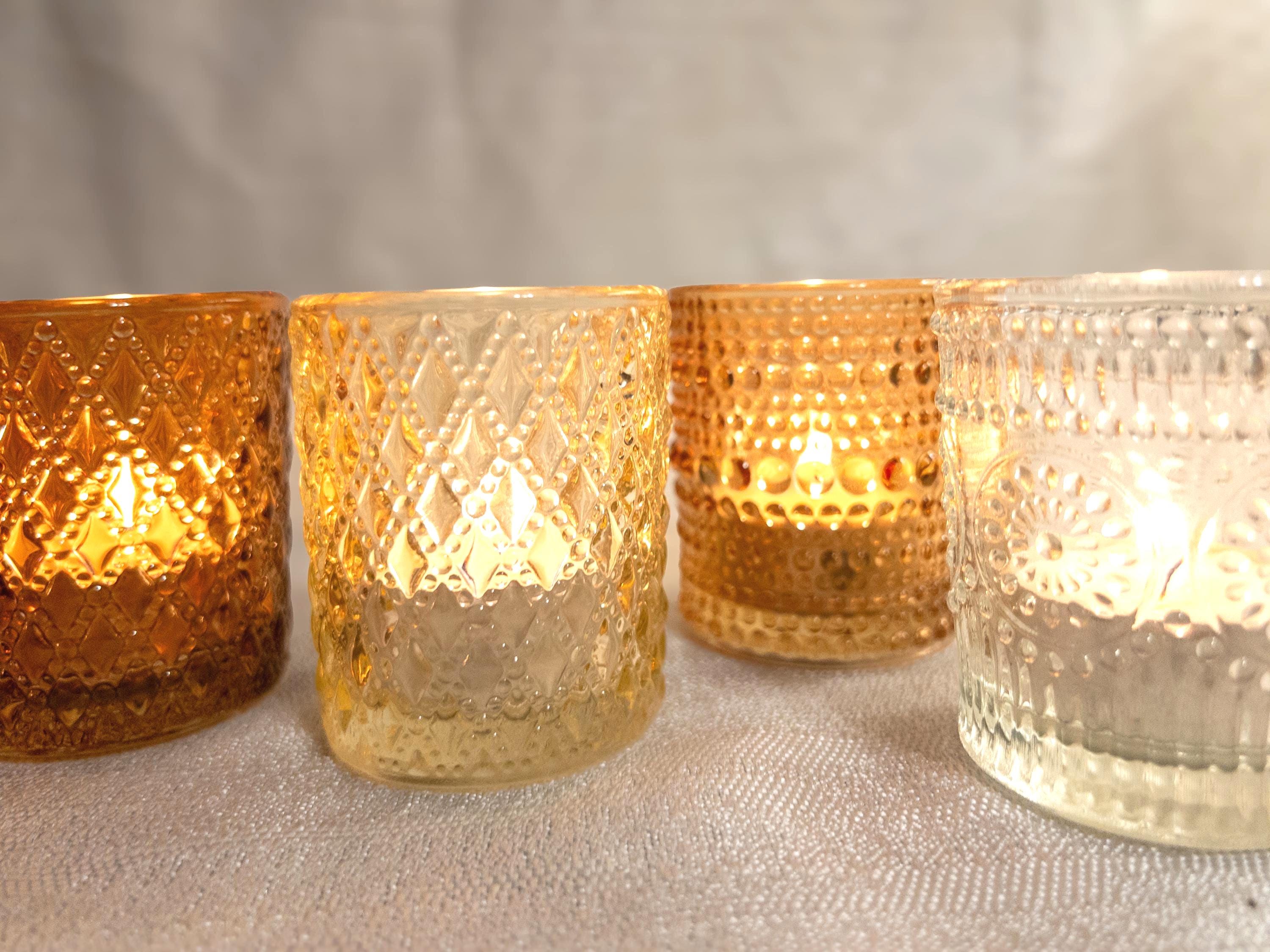 Create a warm, romantic glow with these beautifully textured glass tealight holders. Each one features a unique embossed pattern and soft tinted glass that sparkles beautifully when lit — perfect for cozy evenings, wedding tables, shelf styling, seasonal décor, or gifting.