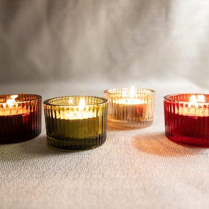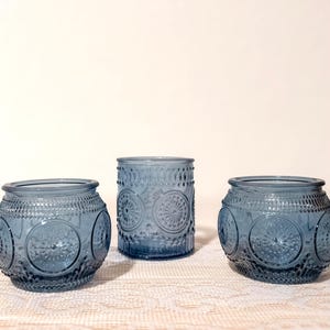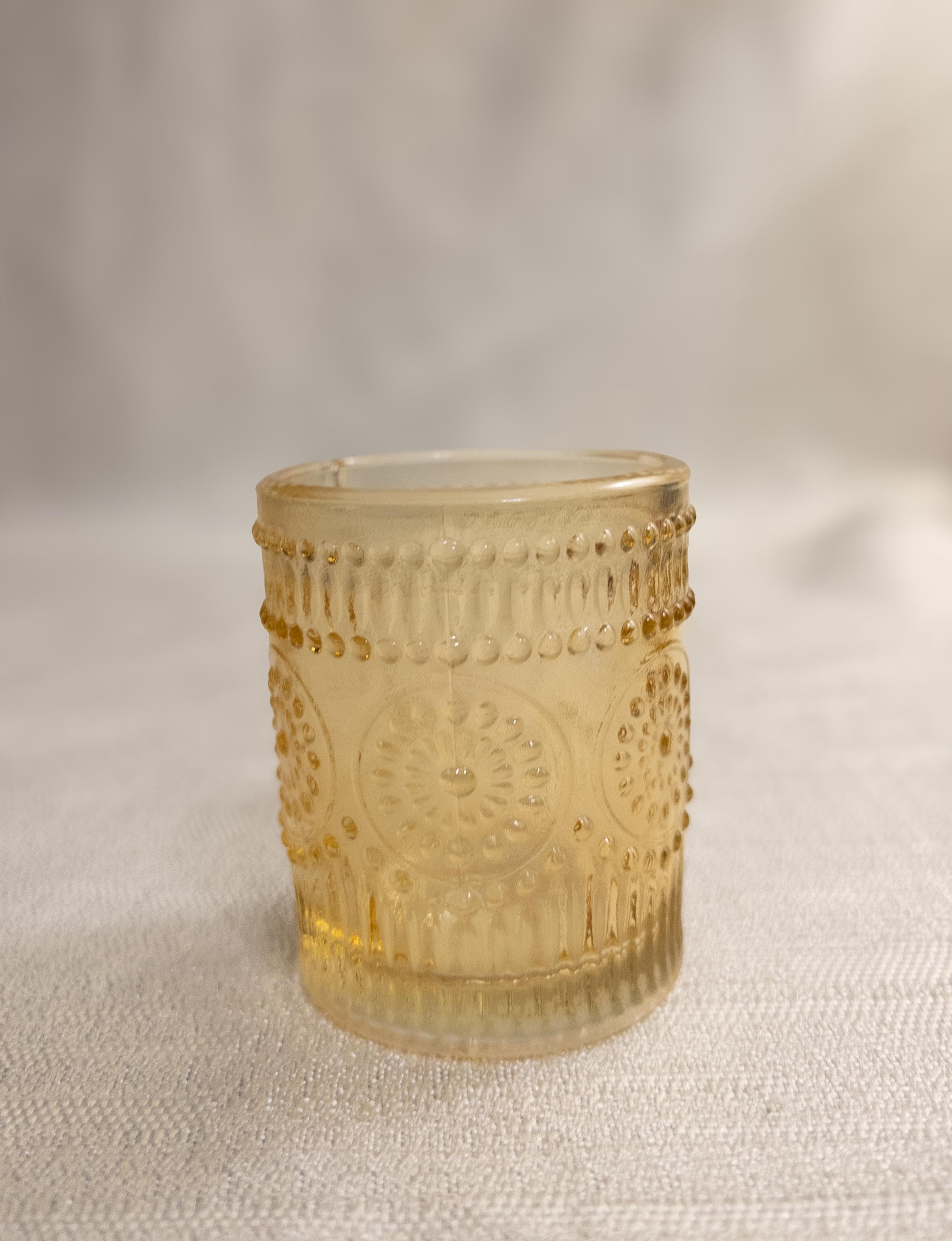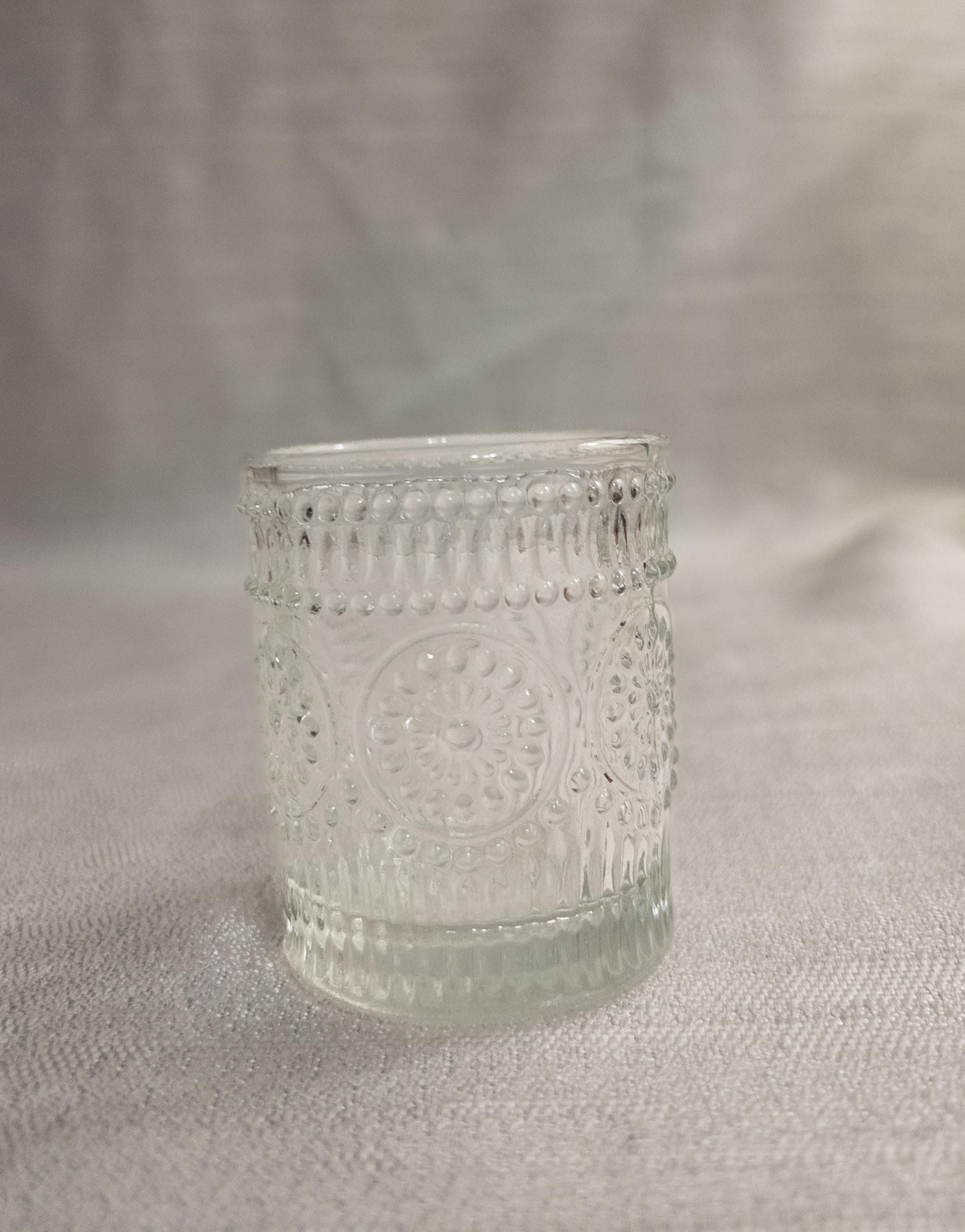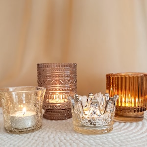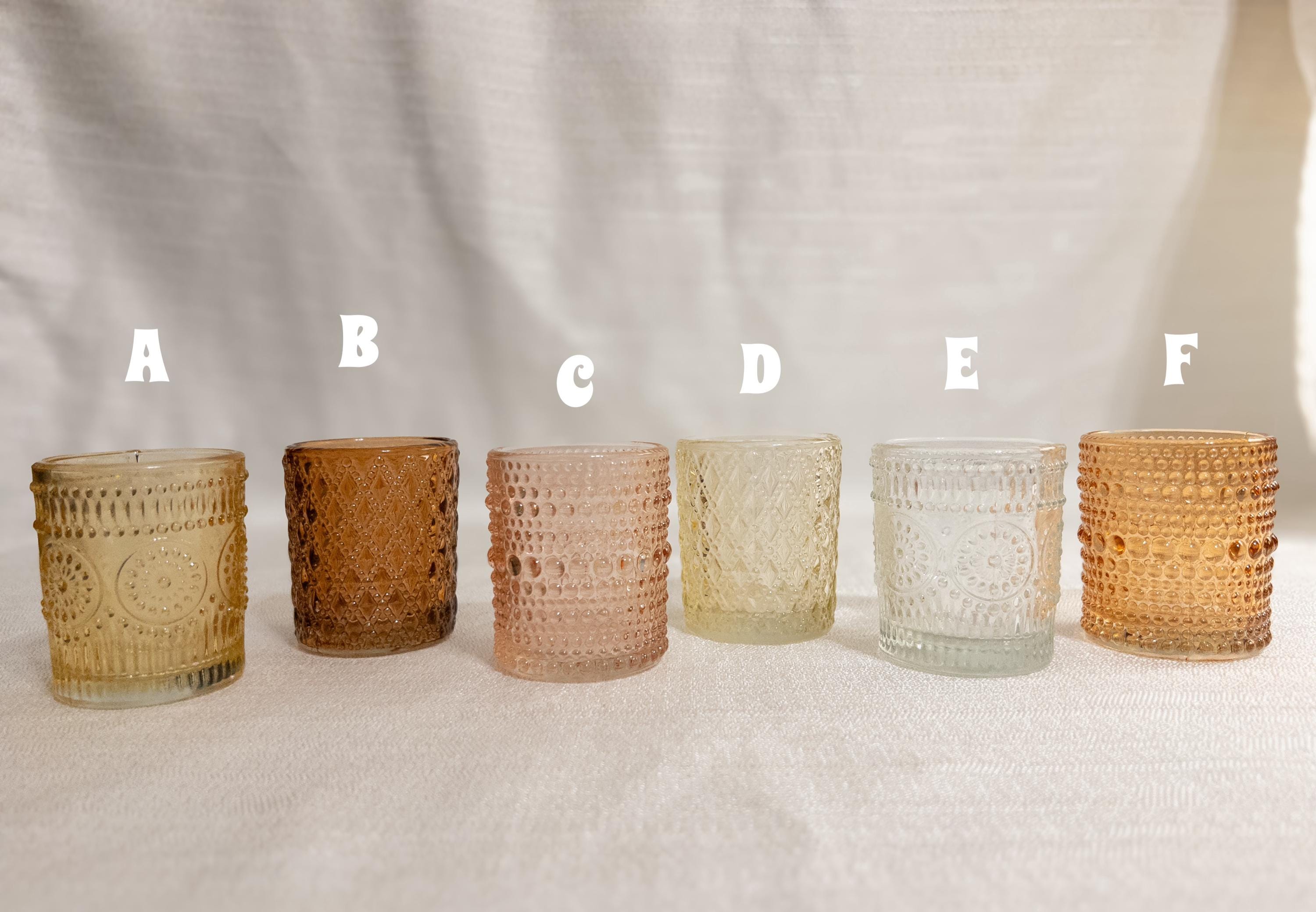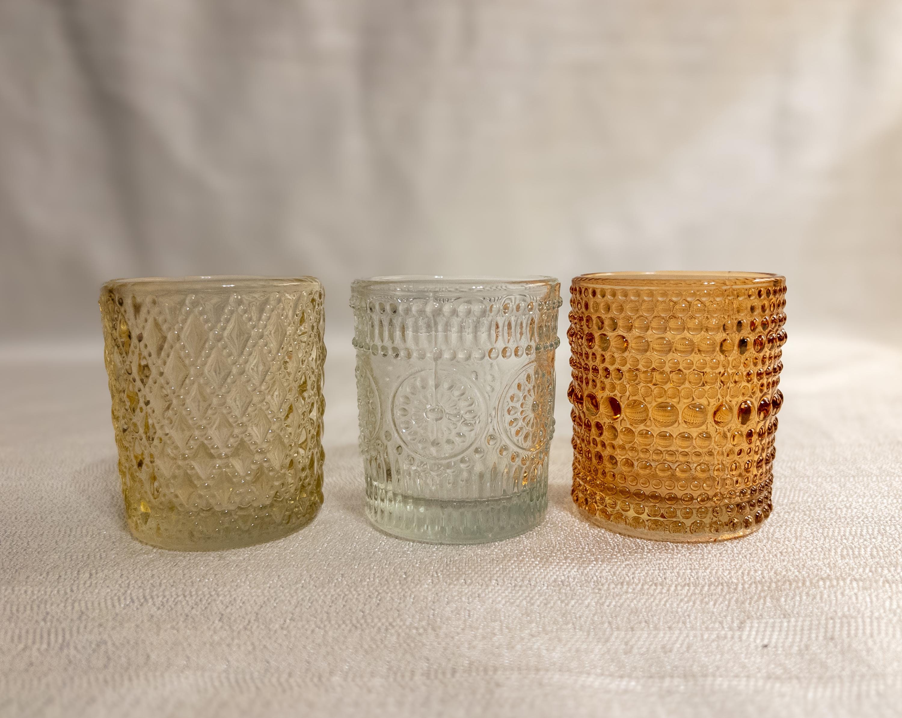 Create a warm, romantic glow with these beautifully textured glass tealight holders. Each one features a unique embossed pattern and soft tinted glass that sparkles beautifully when lit — perfect for cozy evenings, wedding tables, shelf styling, seasonal décor, or gifting.