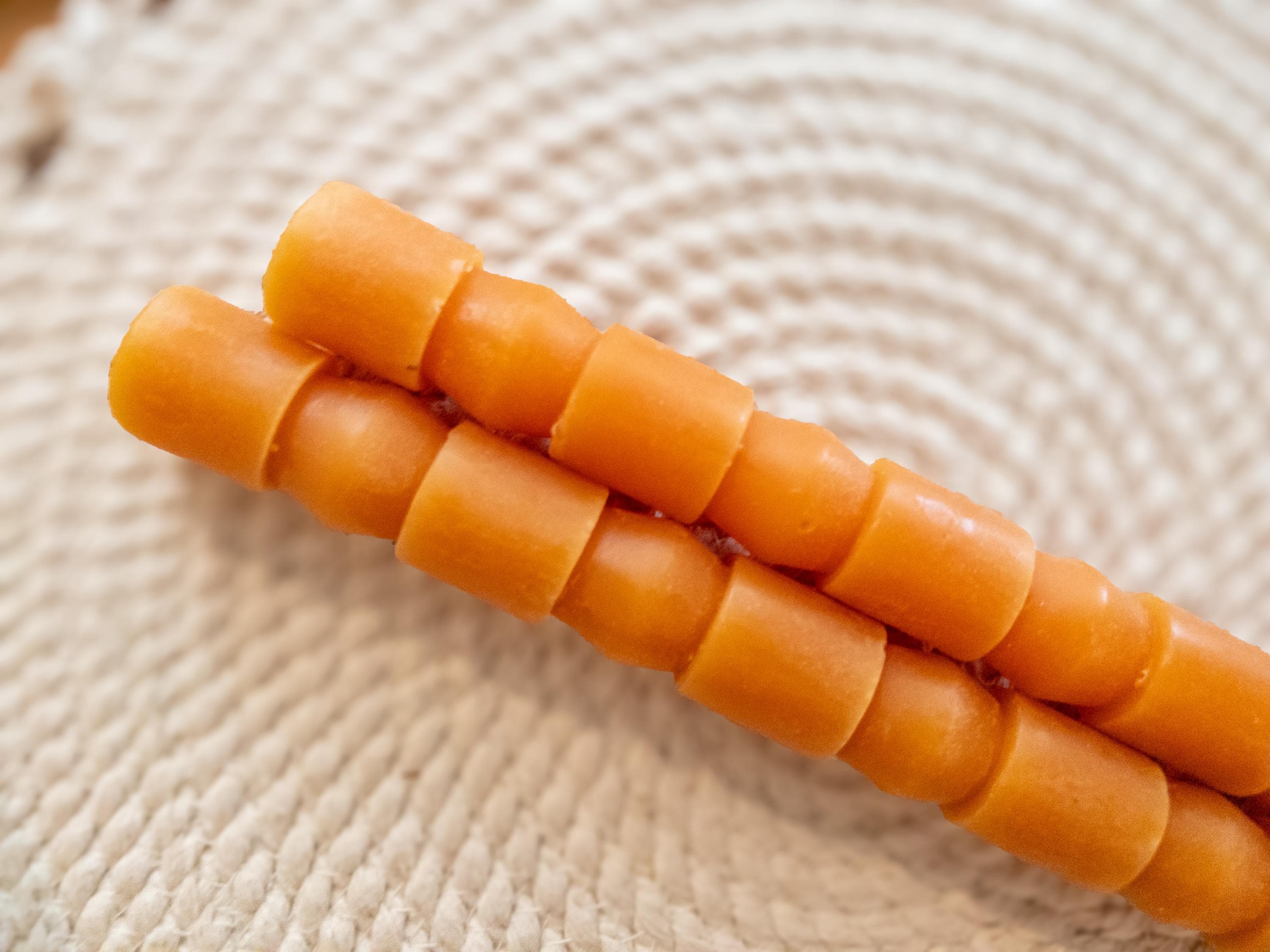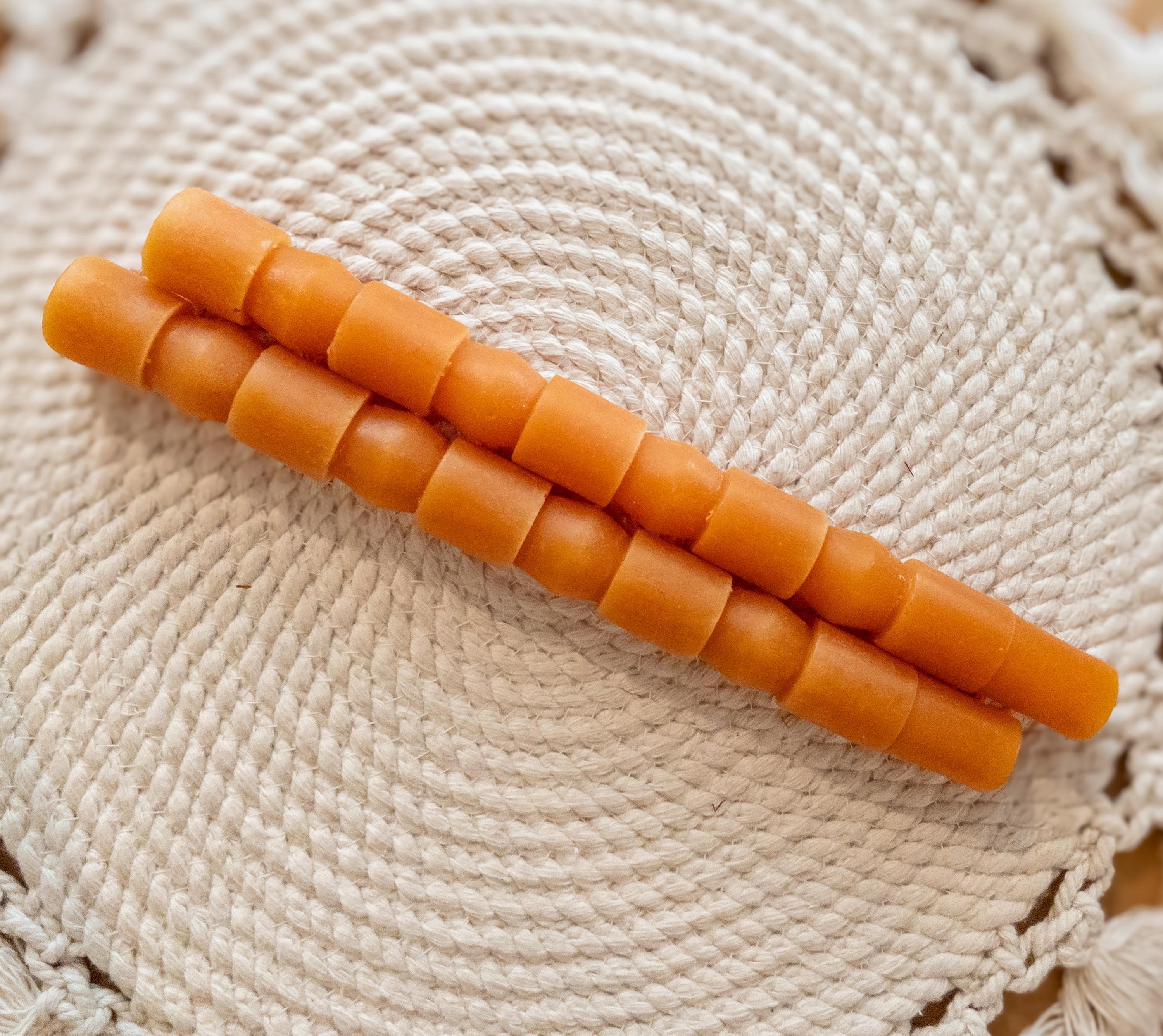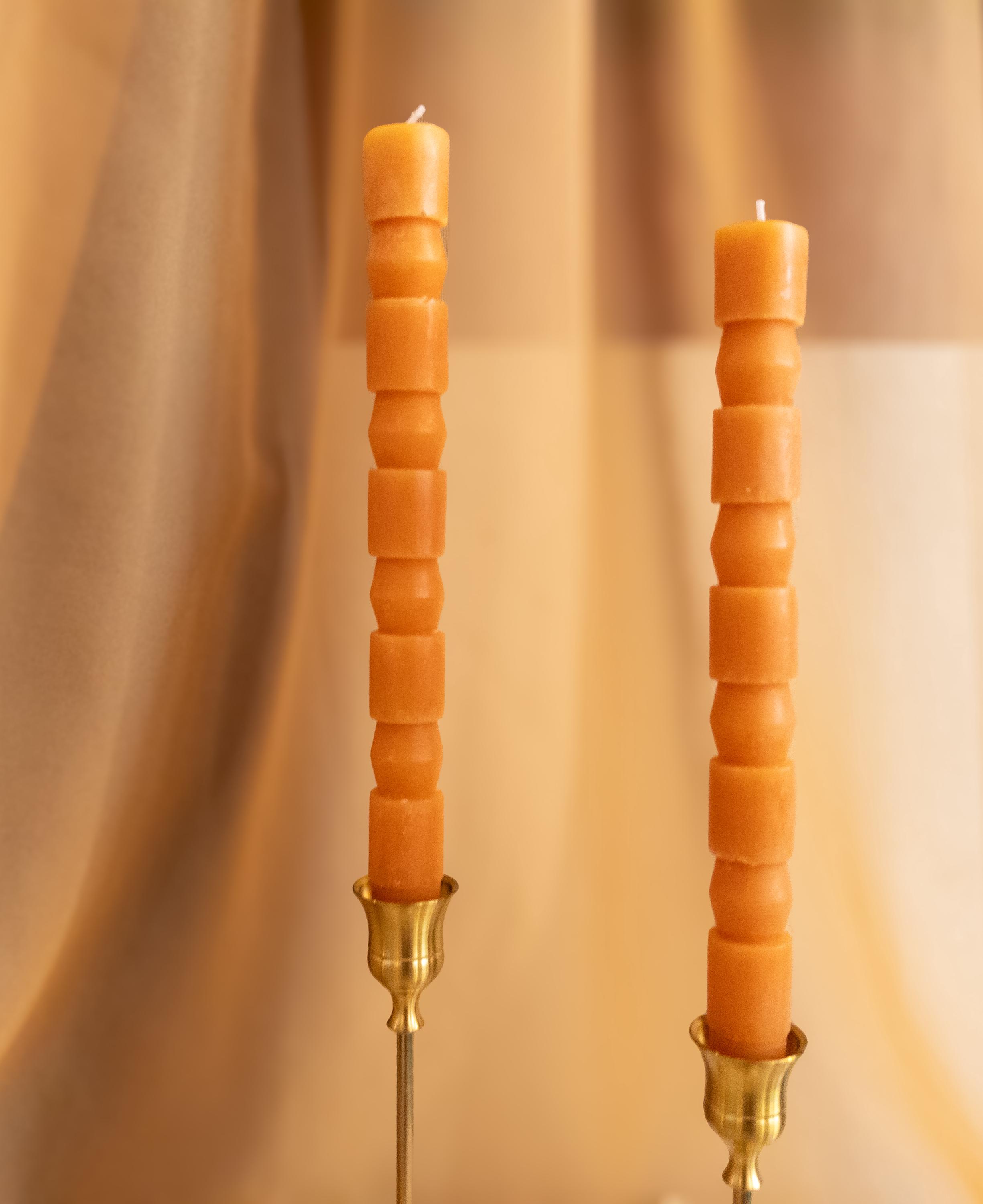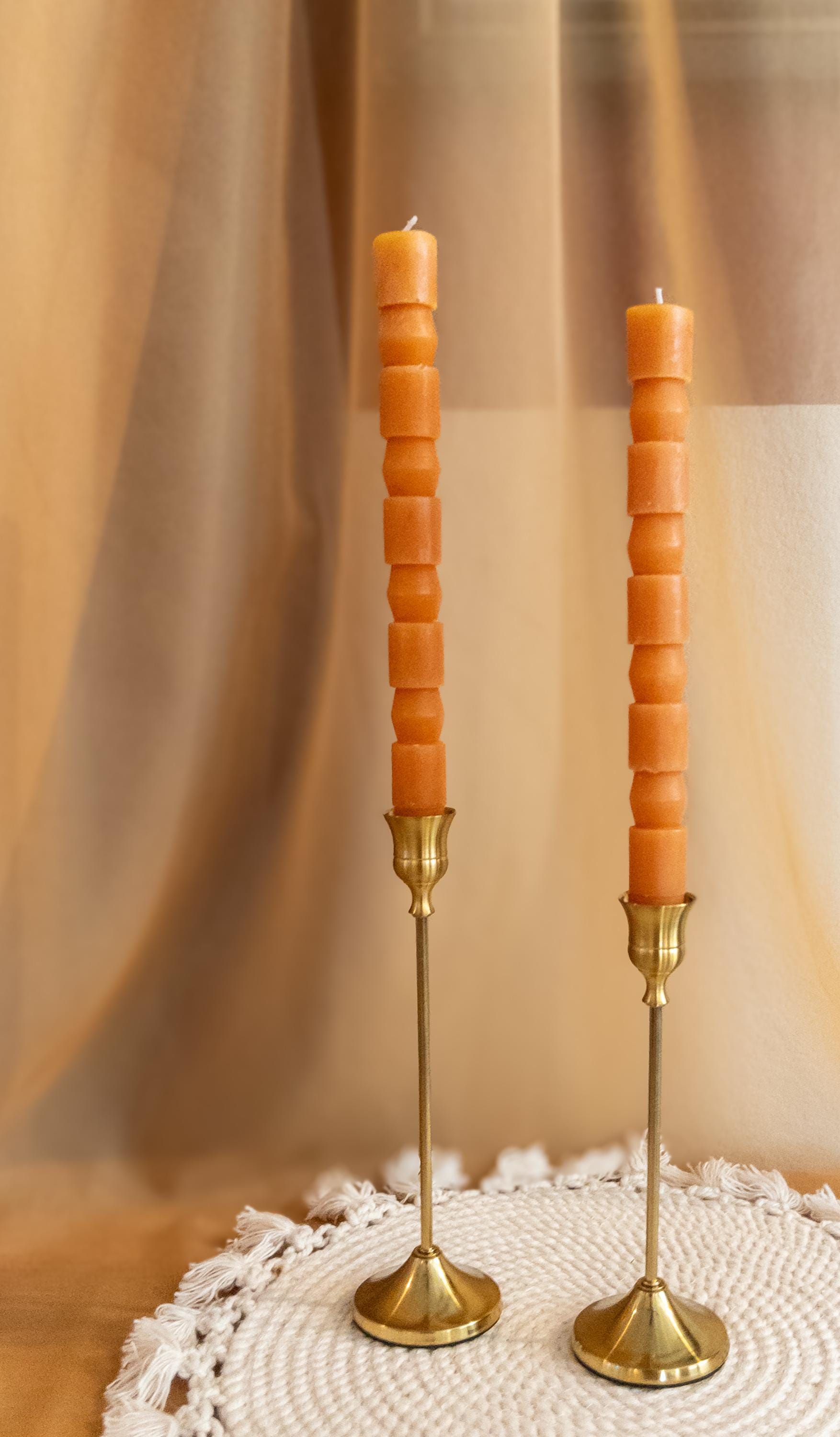 Warm and modern, these 10-inch sculptural taper candles in a rich autumn amber / pumpkin orange hue bring a cozy seasonal touch to any tablescape or mantel. Their stacked geometric silhouette creates a beautiful sculptural presence even when unlit — perfect for fall gatherings, autumn weddings, or everyday warm-toned styling.