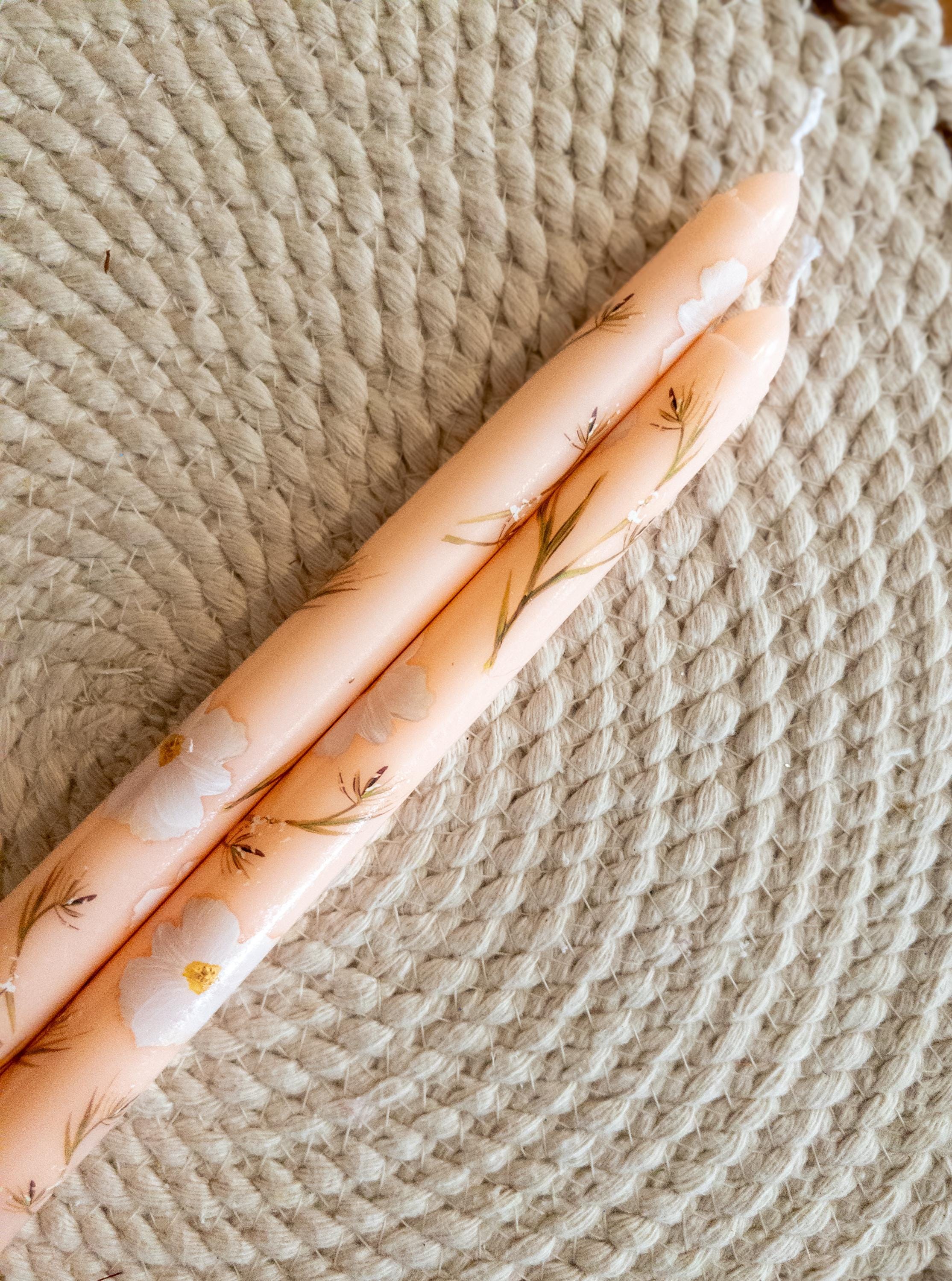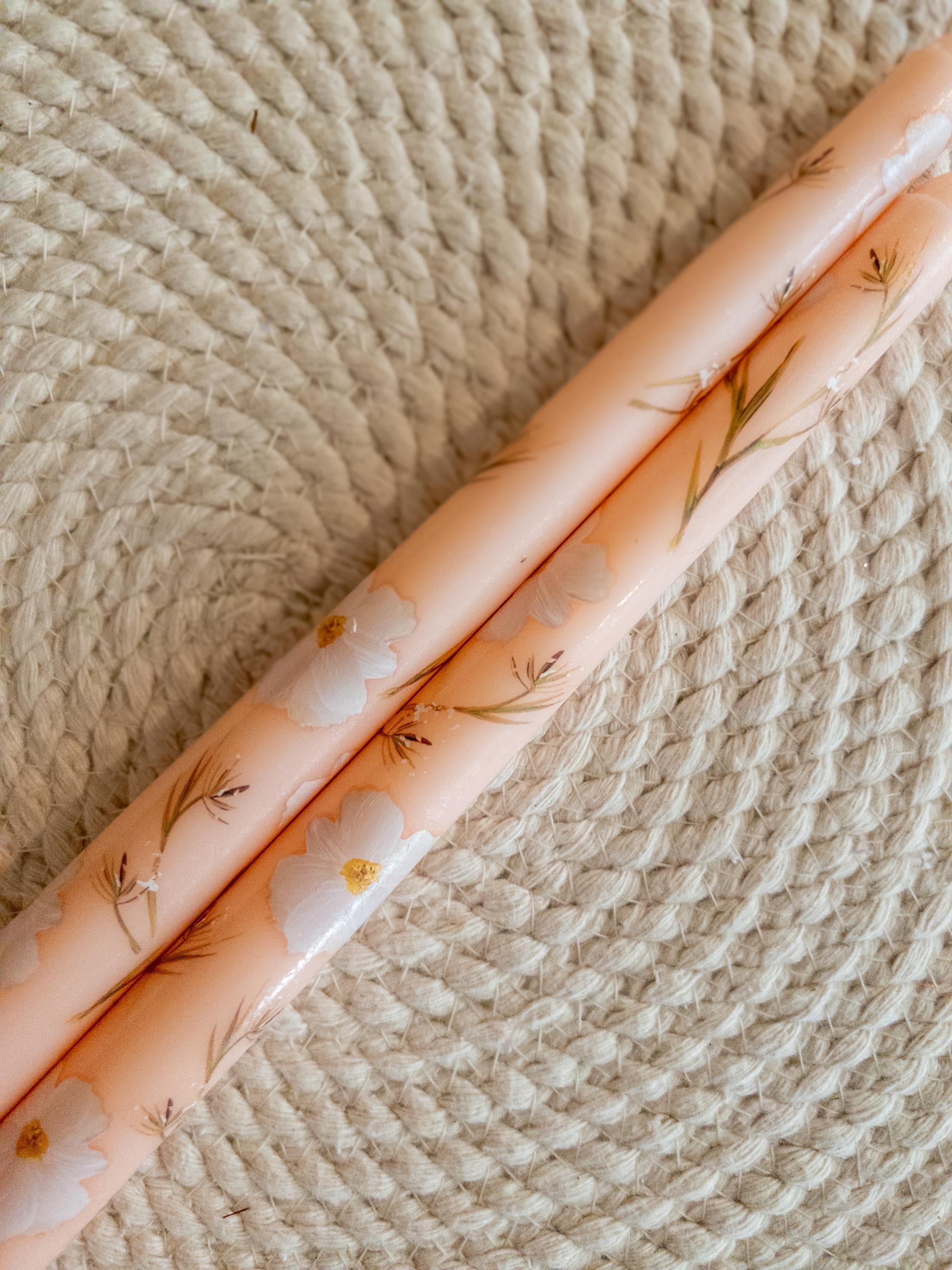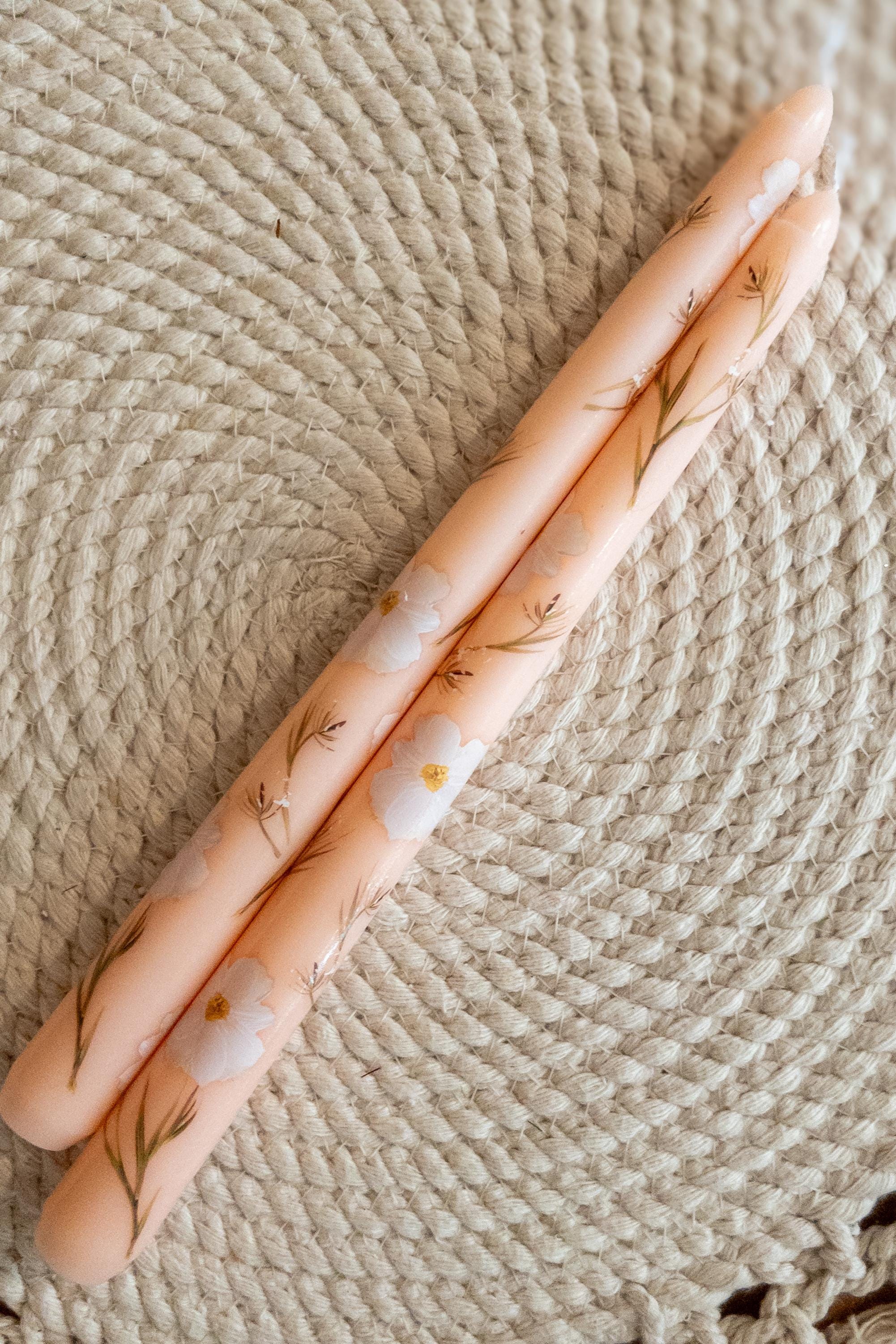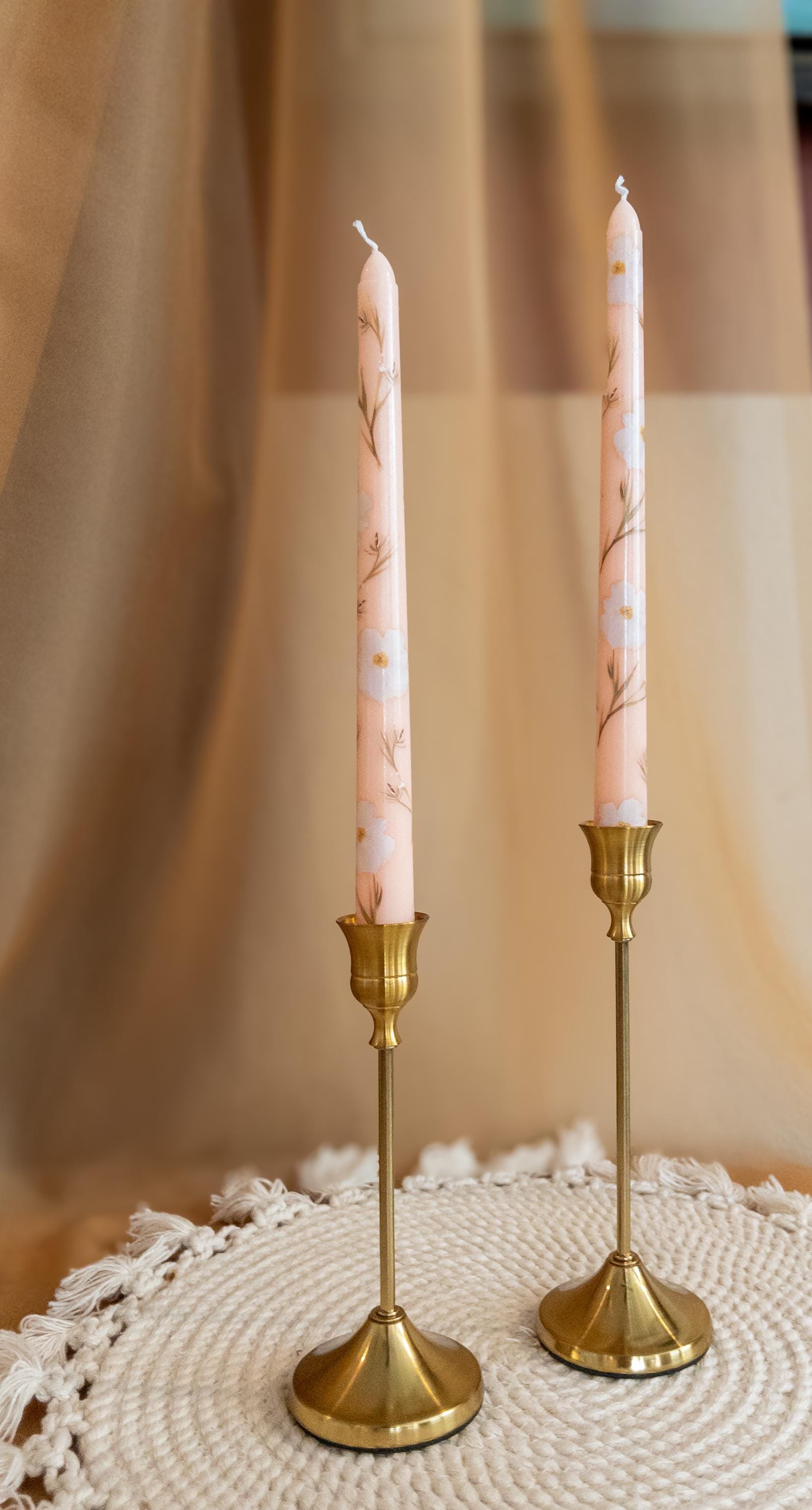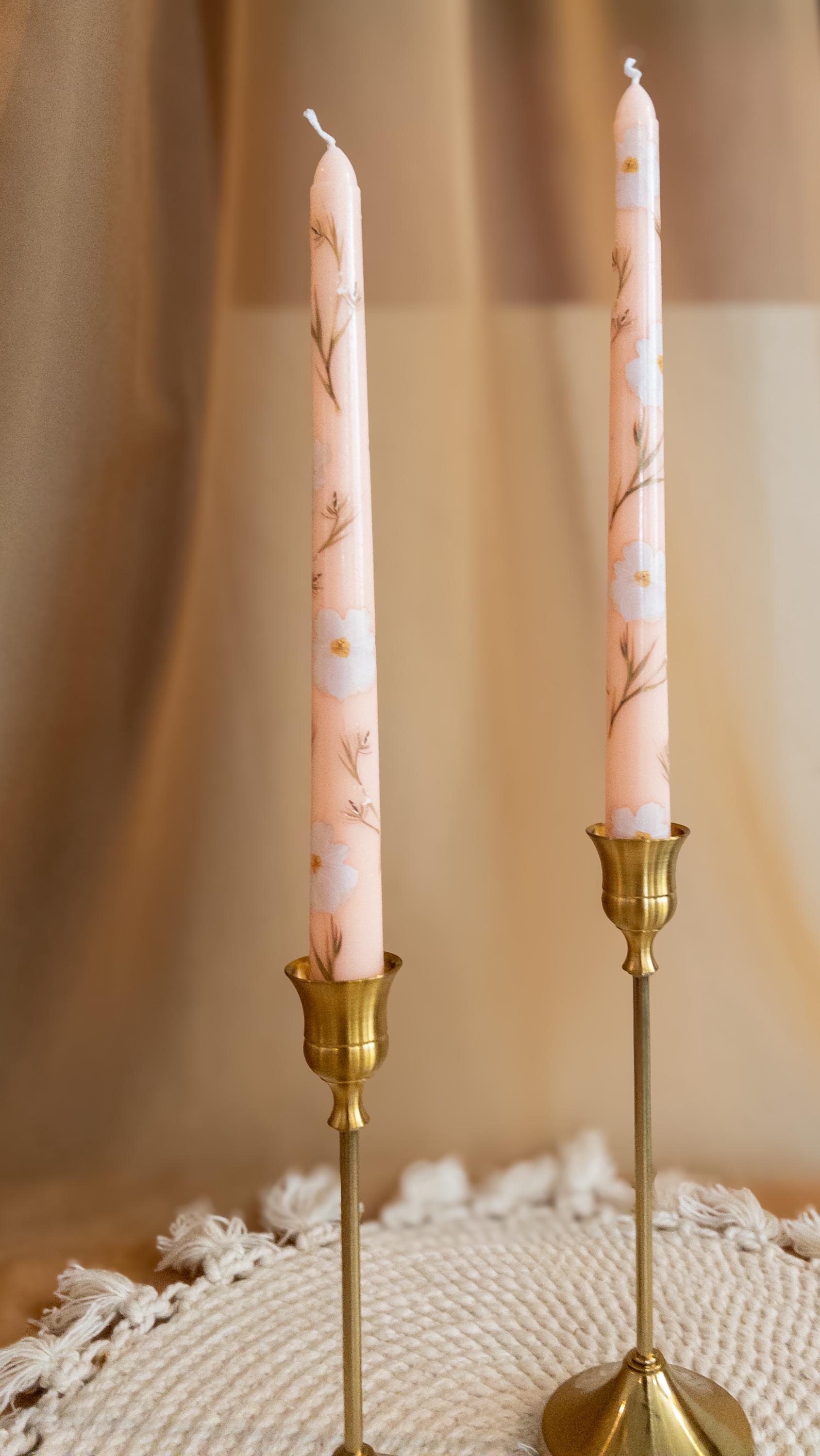 Bring a soft, romantic touch to your décor with these 10-inch blush floral taper candles, sold as a set of two. Each candle features delicate white garden-style blooms with fine greenery accents, creating a gentle, botanical aesthetic perfect for celebrations, garden weddings, or elegant gifting.
