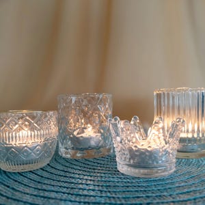 Each holder fits most standard taper candles and adds a nostalgic touch reminiscent of vintage glassware while still being versatile enough for modern décor styles.