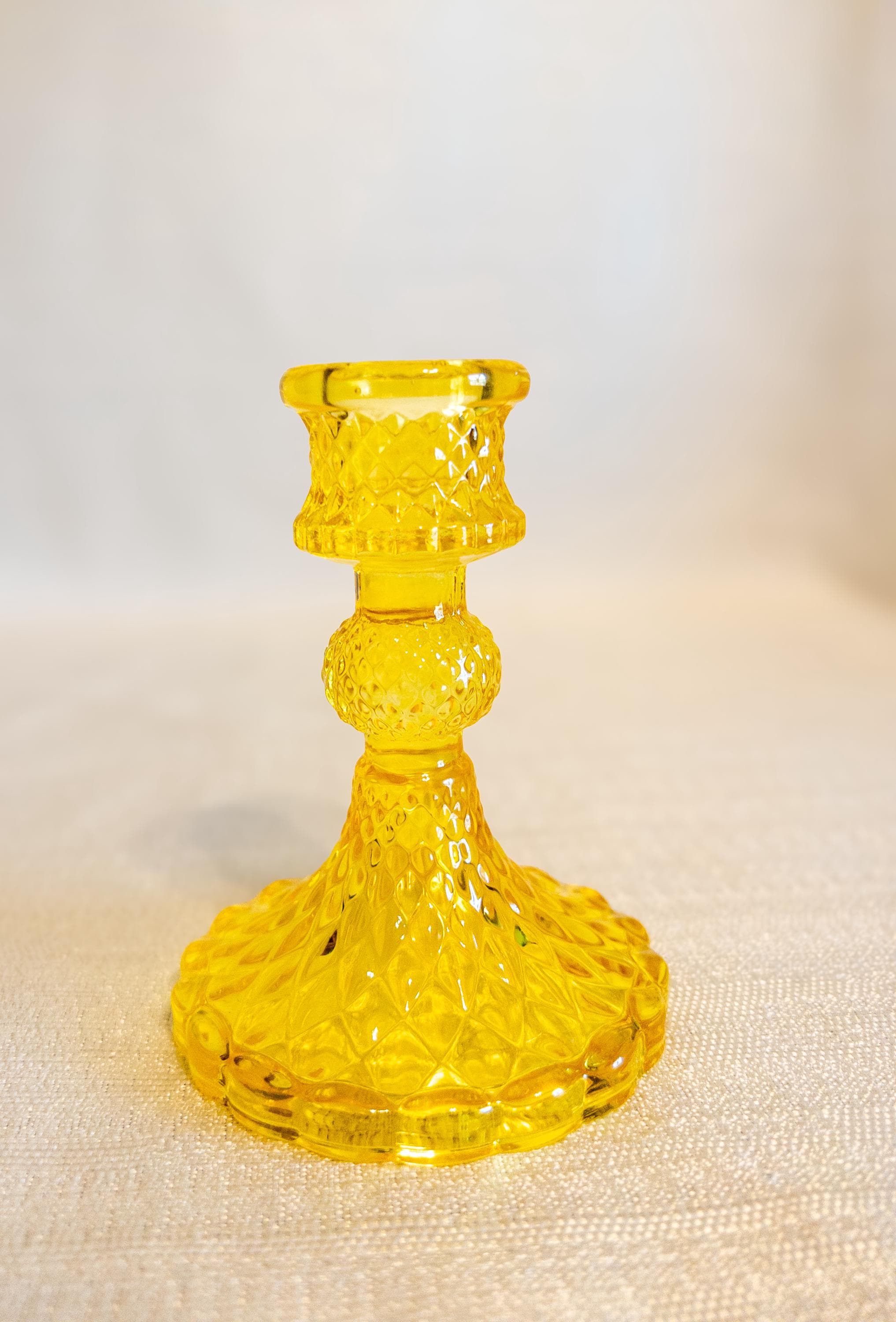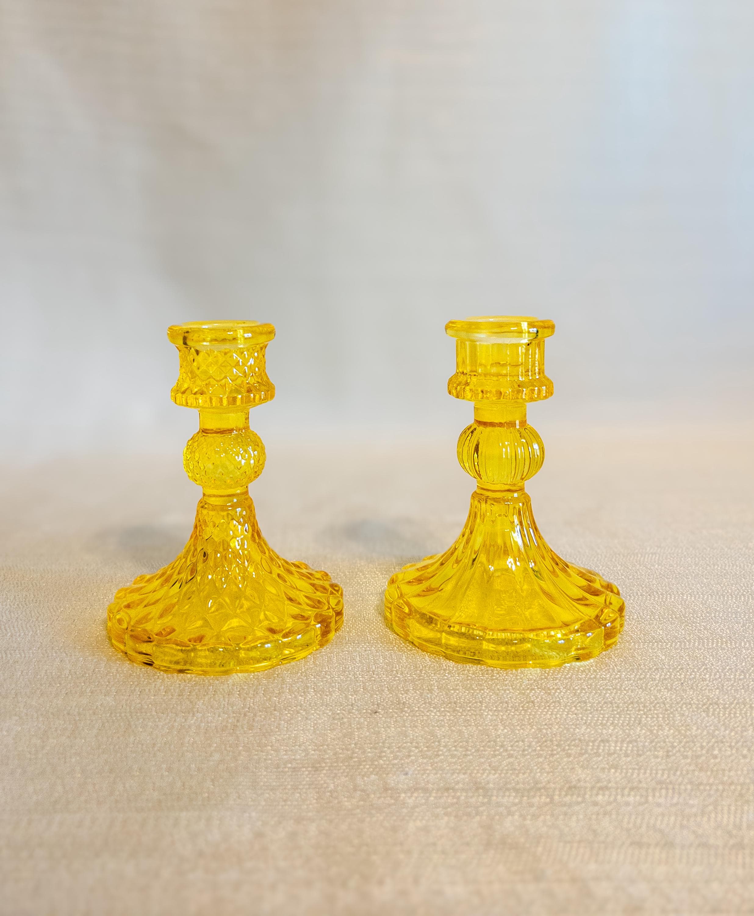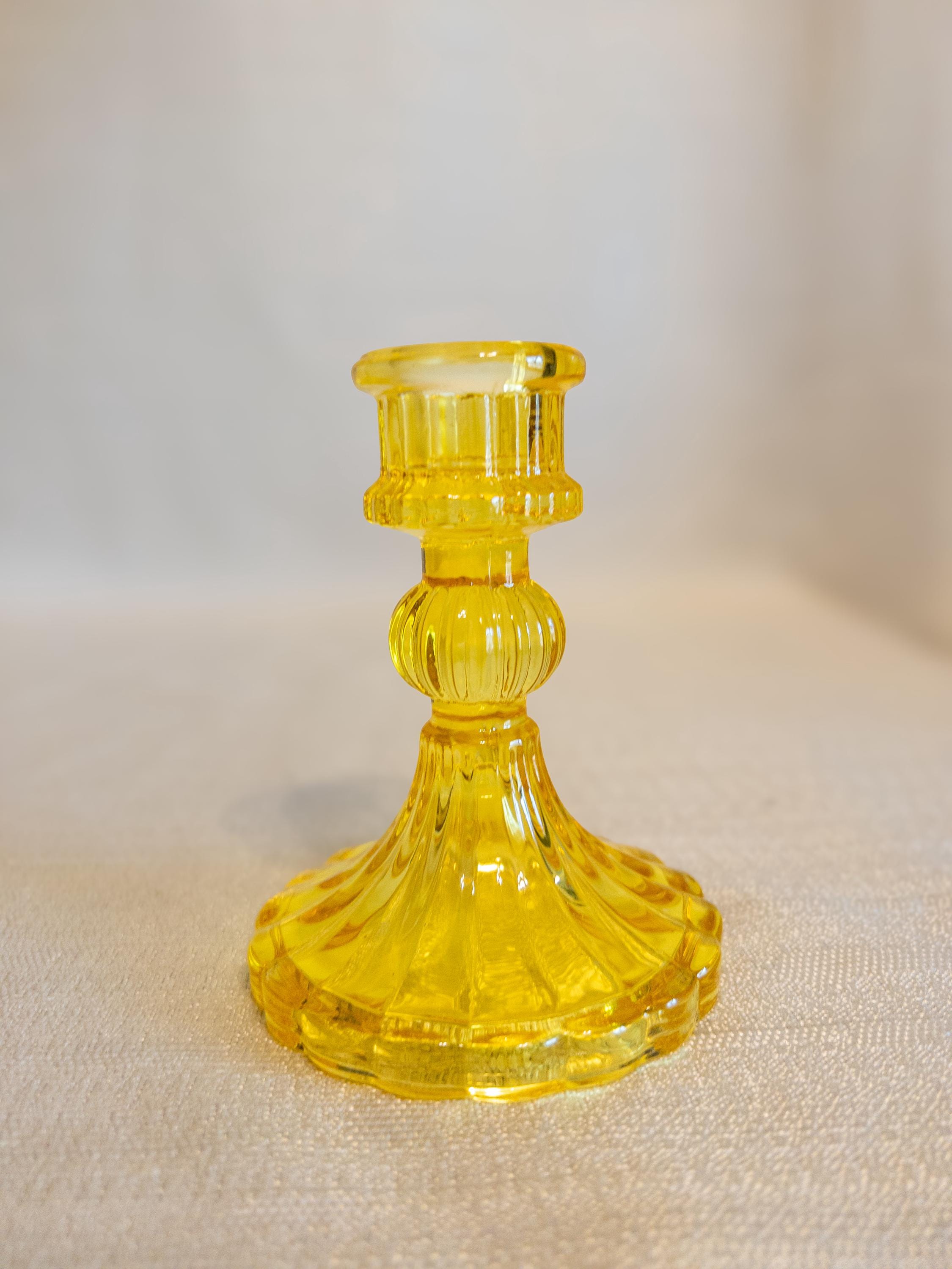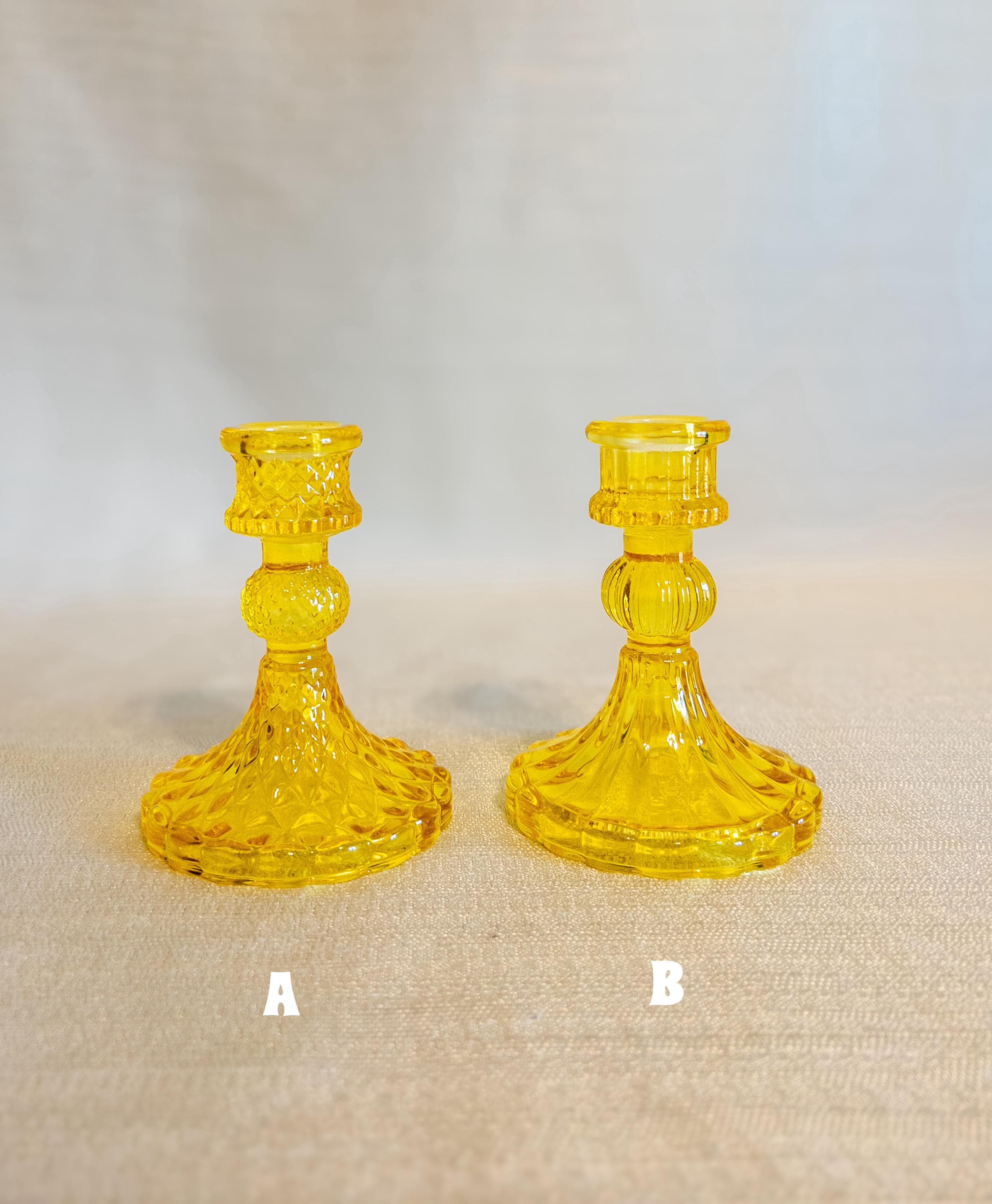 Bring a warm pop of cheerful color to your tablescape with this vintage-style amber glass candlestick holder. With its sunny golden yellow hue, scalloped base, and classic pressed-glass detailing, it makes a beautiful accent piece for mantels, dining tables, shelves, or seasonal décor.