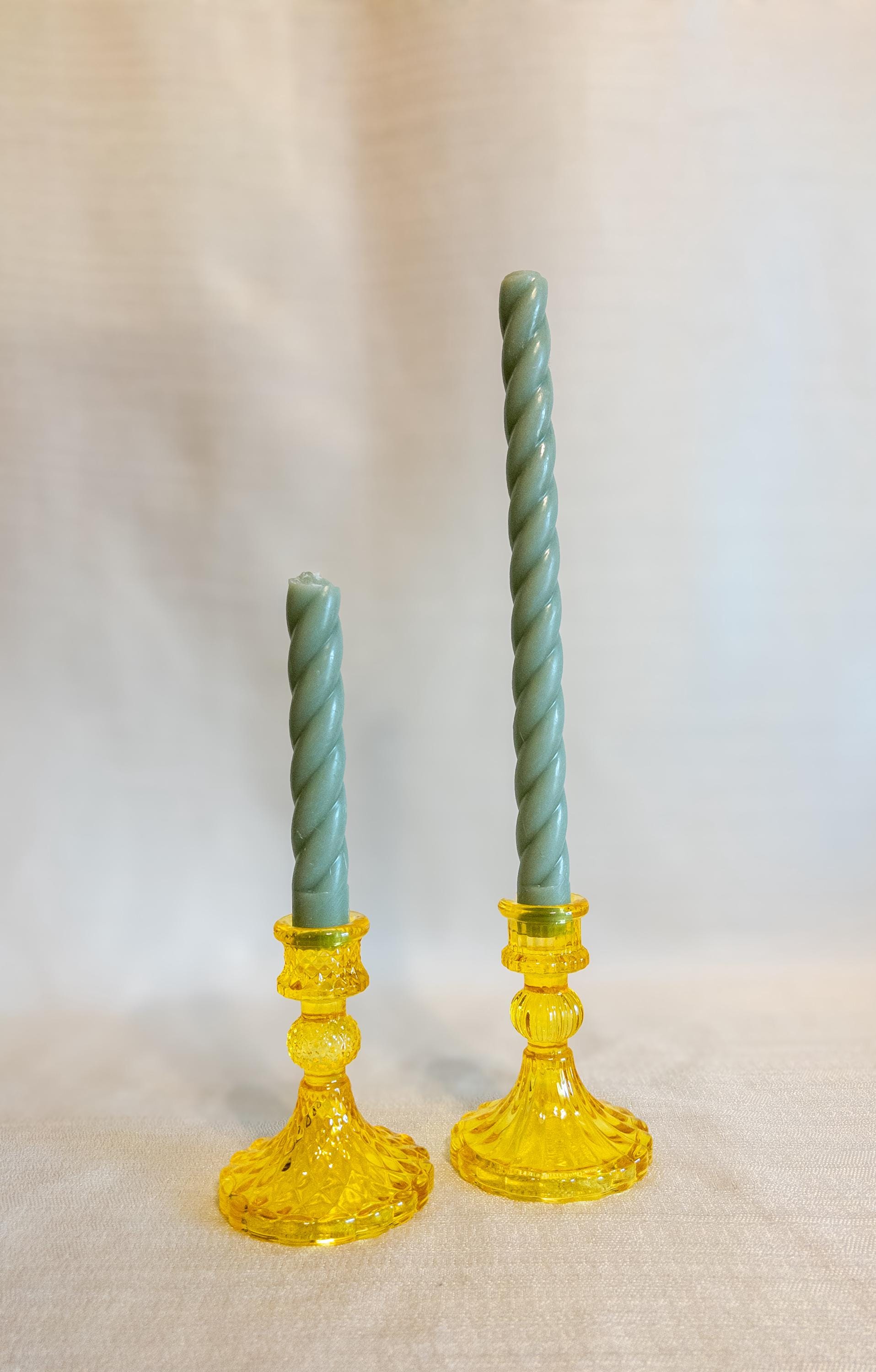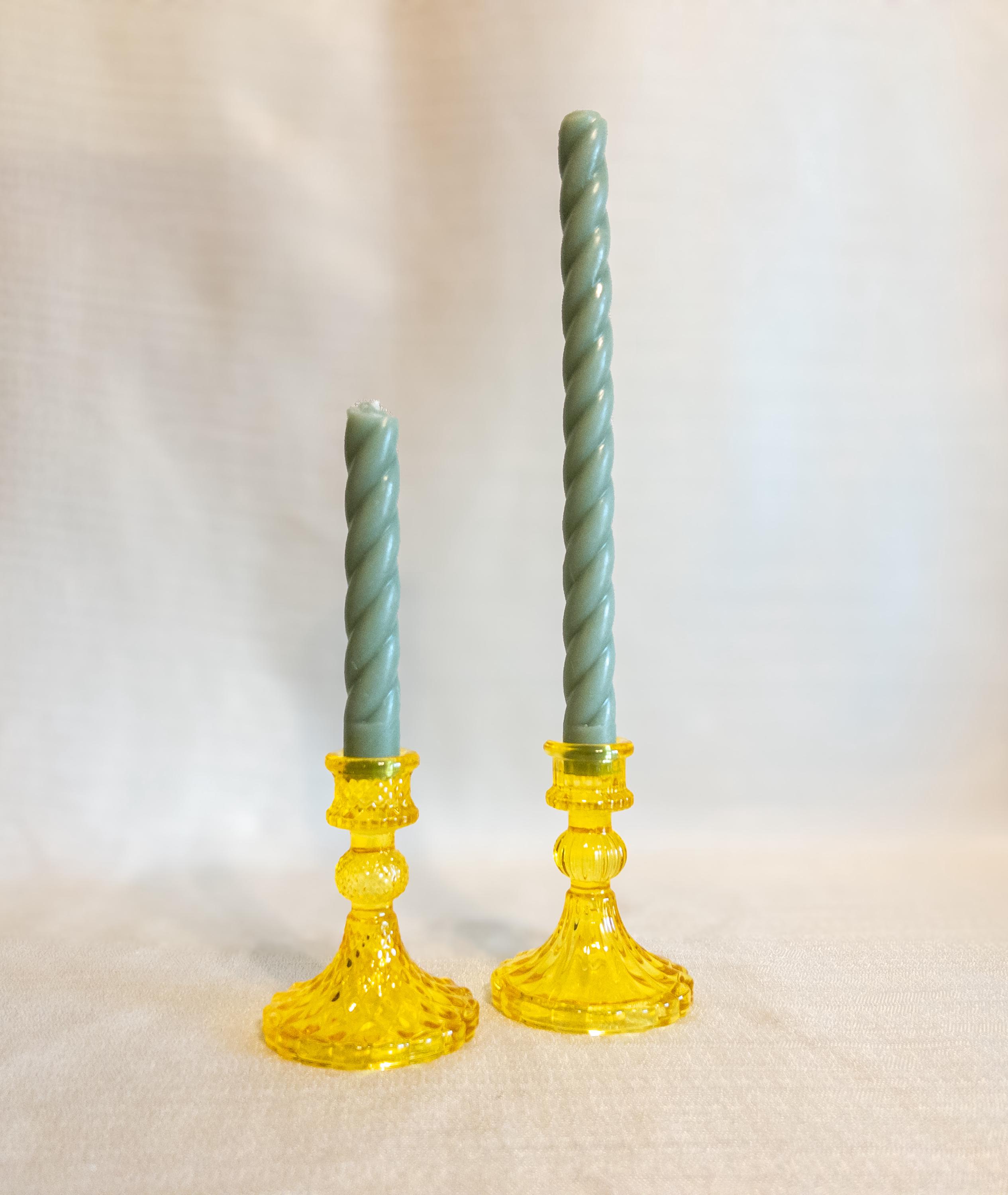 Each holder fits most standard taper candles and adds a nostalgic touch reminiscent of vintage glassware while still being versatile enough for modern décor styles.