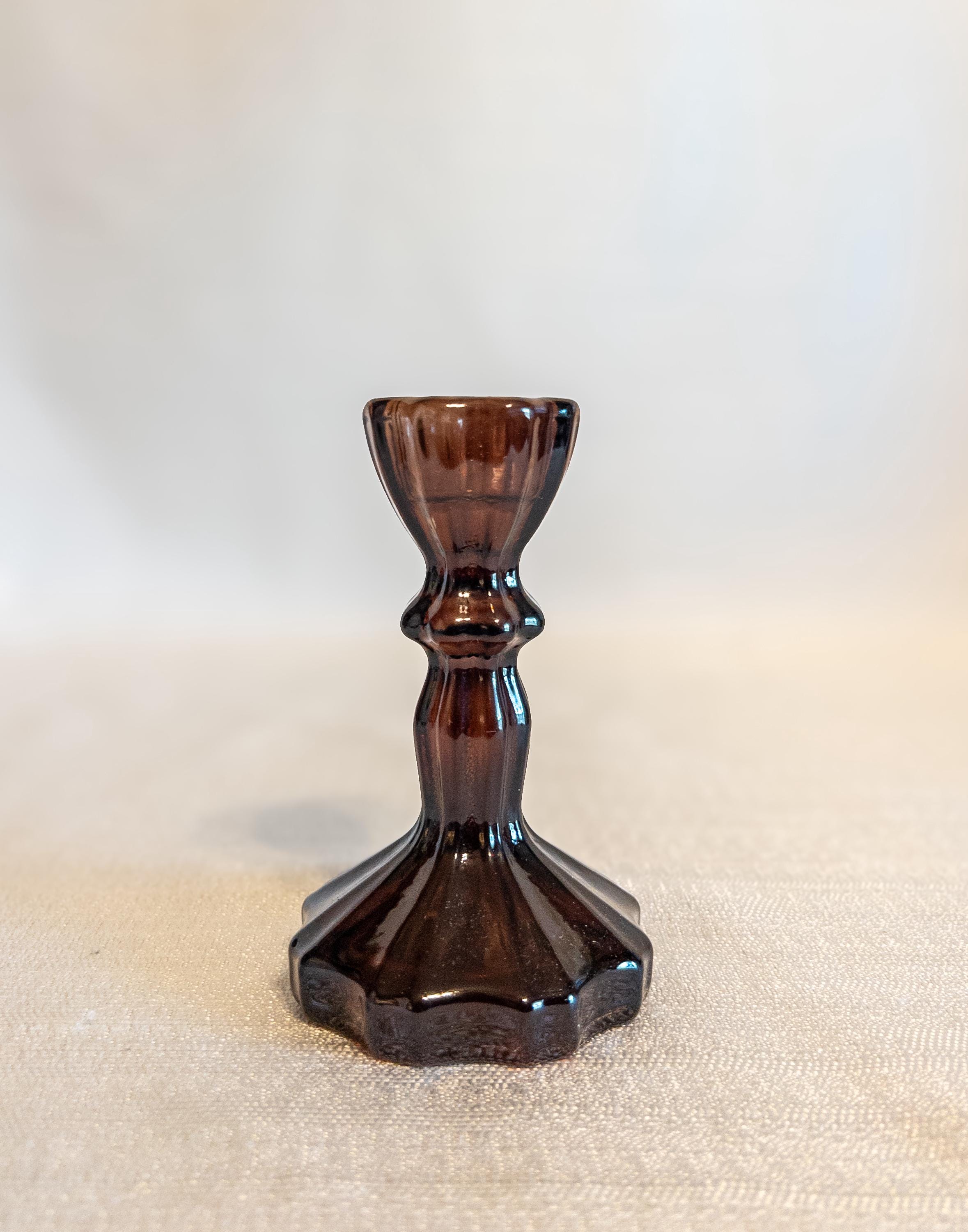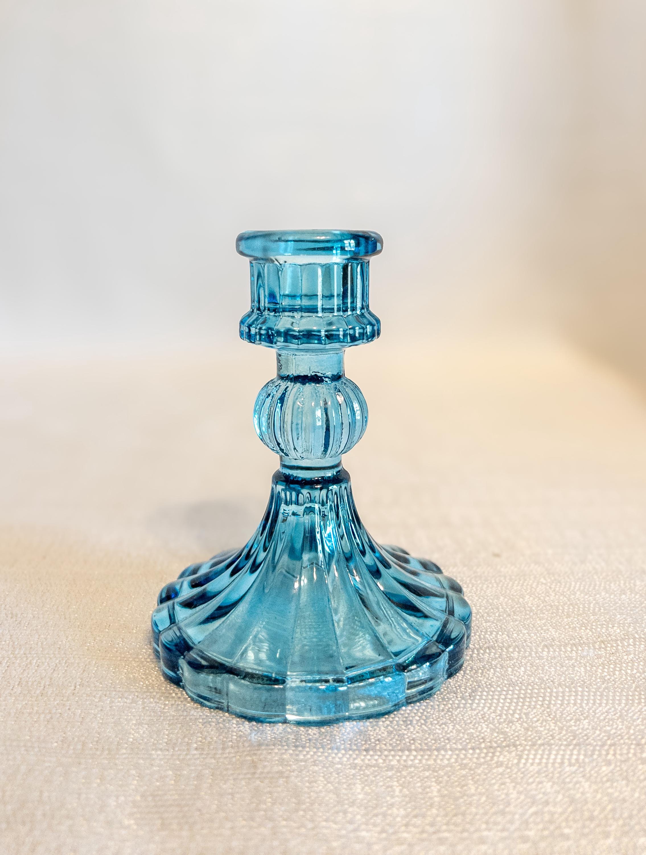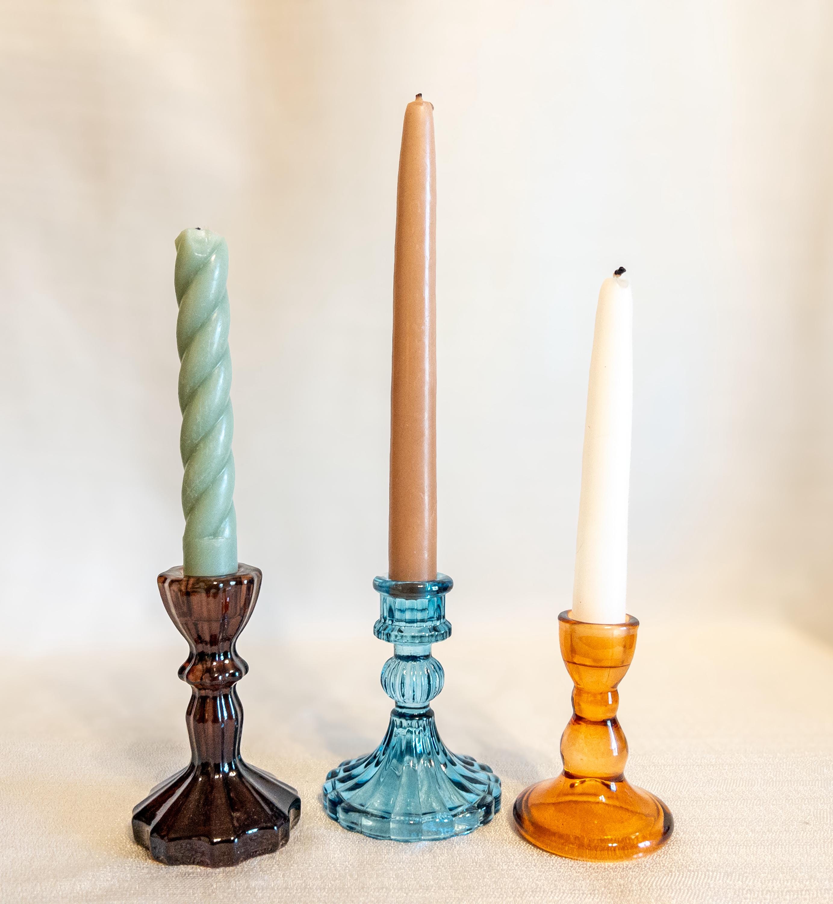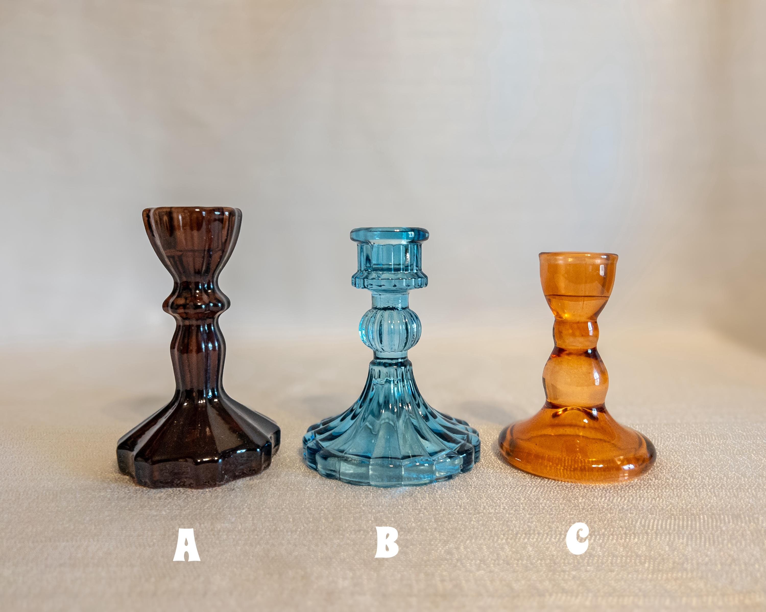 Bring a touch of soft glow and vintage charm to your space with these jewel-tone glass taper candle holders, sold individually so you can curate your own custom pairing or trio. Each piece features a sculpted silhouette with beautiful old-world character — perfect for tablescapes, mantels, coffee tables, weddings, or seasonal décor displays.