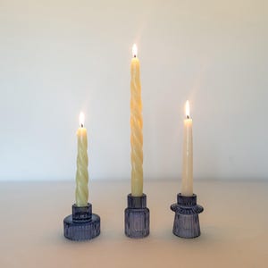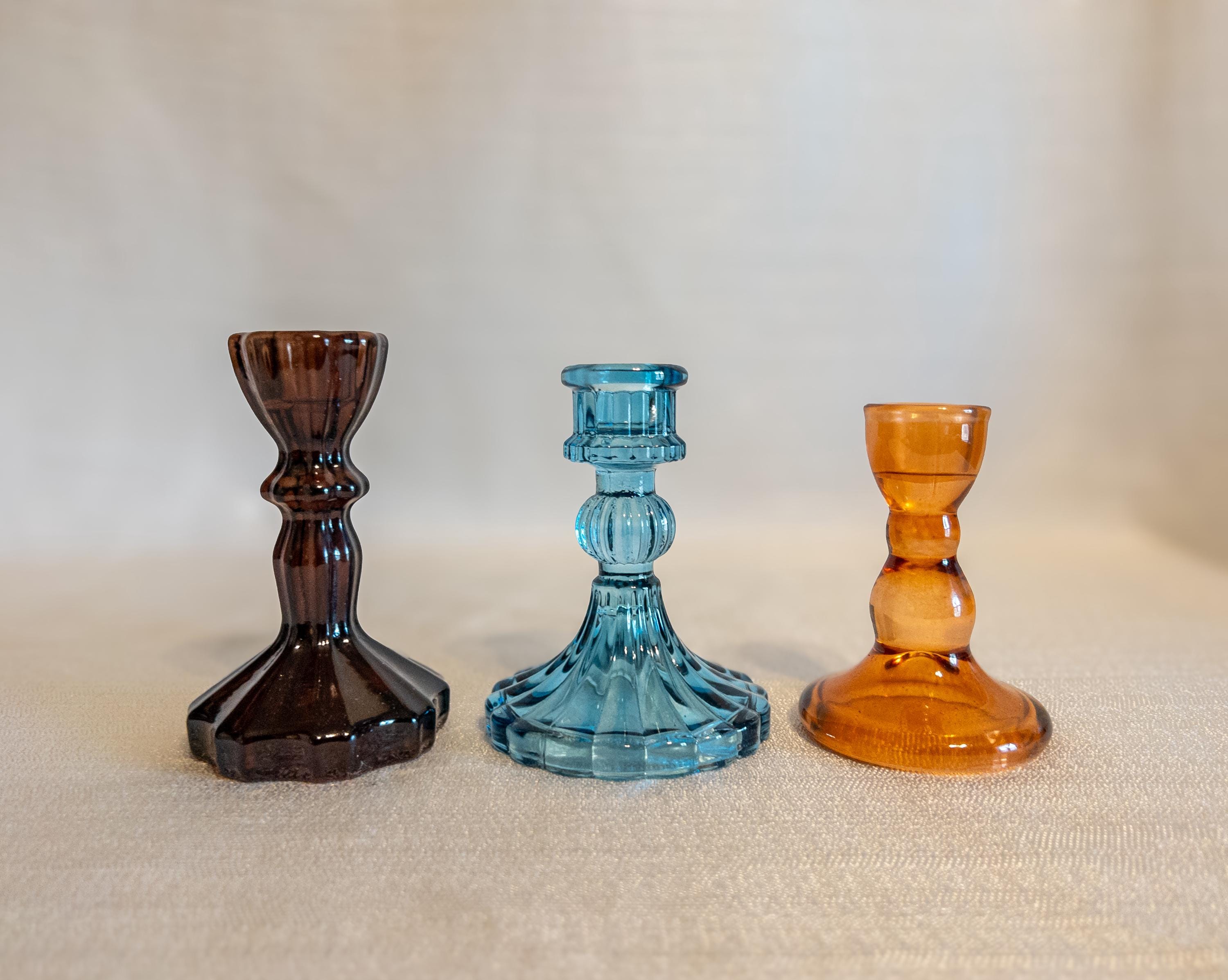 Available in three richly tinted hues that feel both romantic and timeless — plum smoke, ocean blue, and honey amber — these candle holders layer beautifully alongside bud vases and textured florals for an elevated, collected look.
