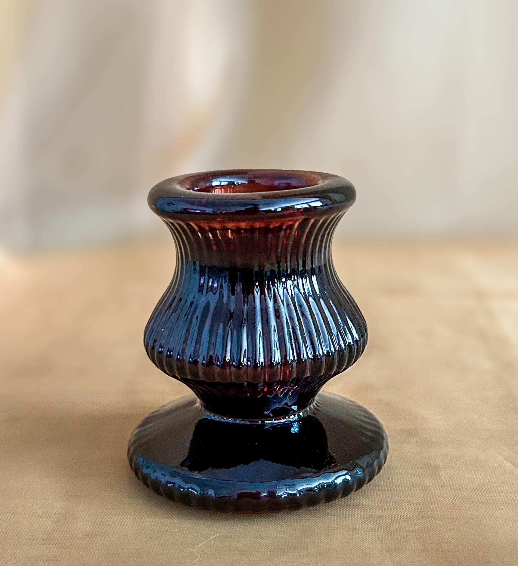 Style A: Deep plum amber glass with ribbed texture — approximately 2¼” high x 2¼” wide
