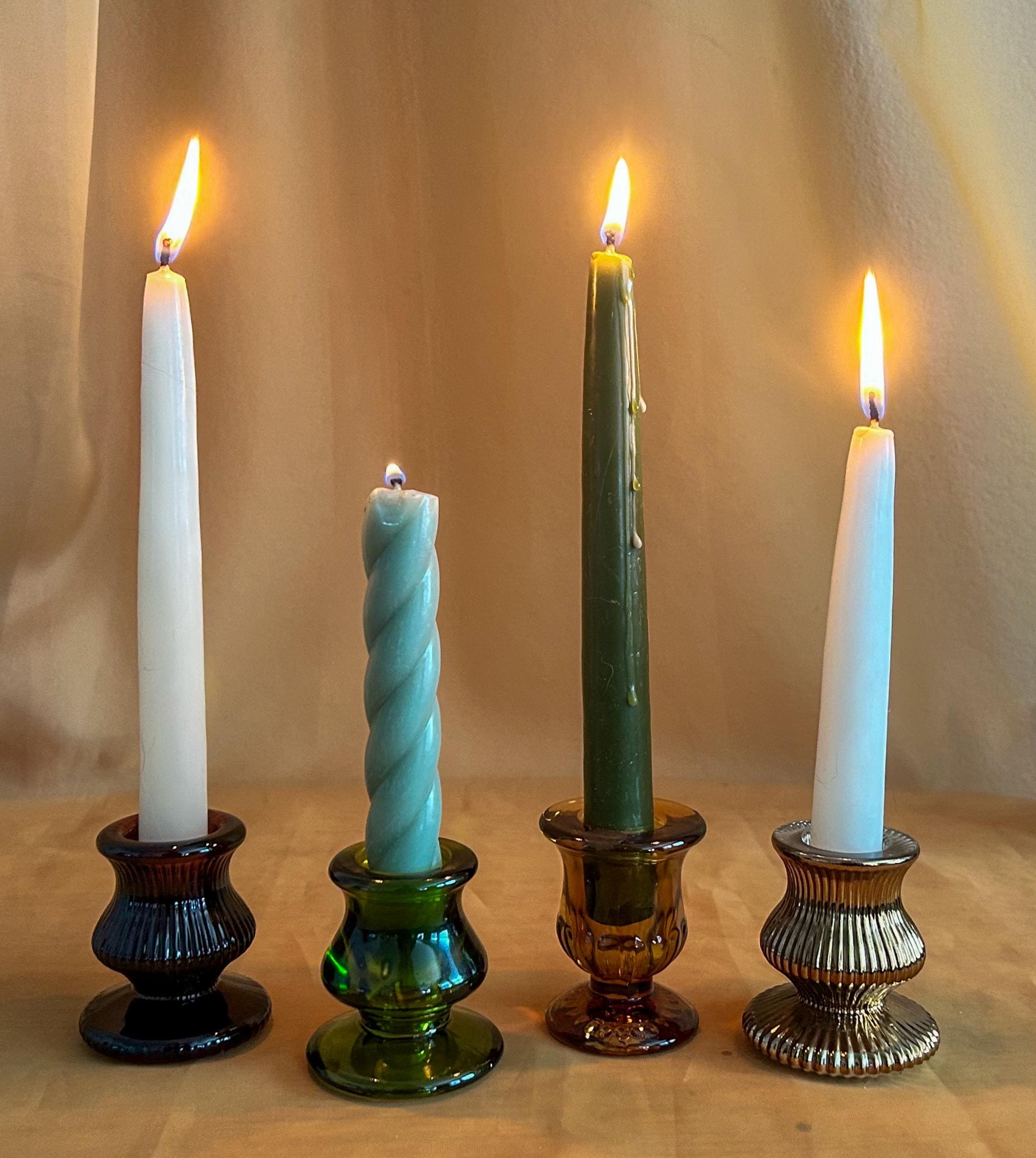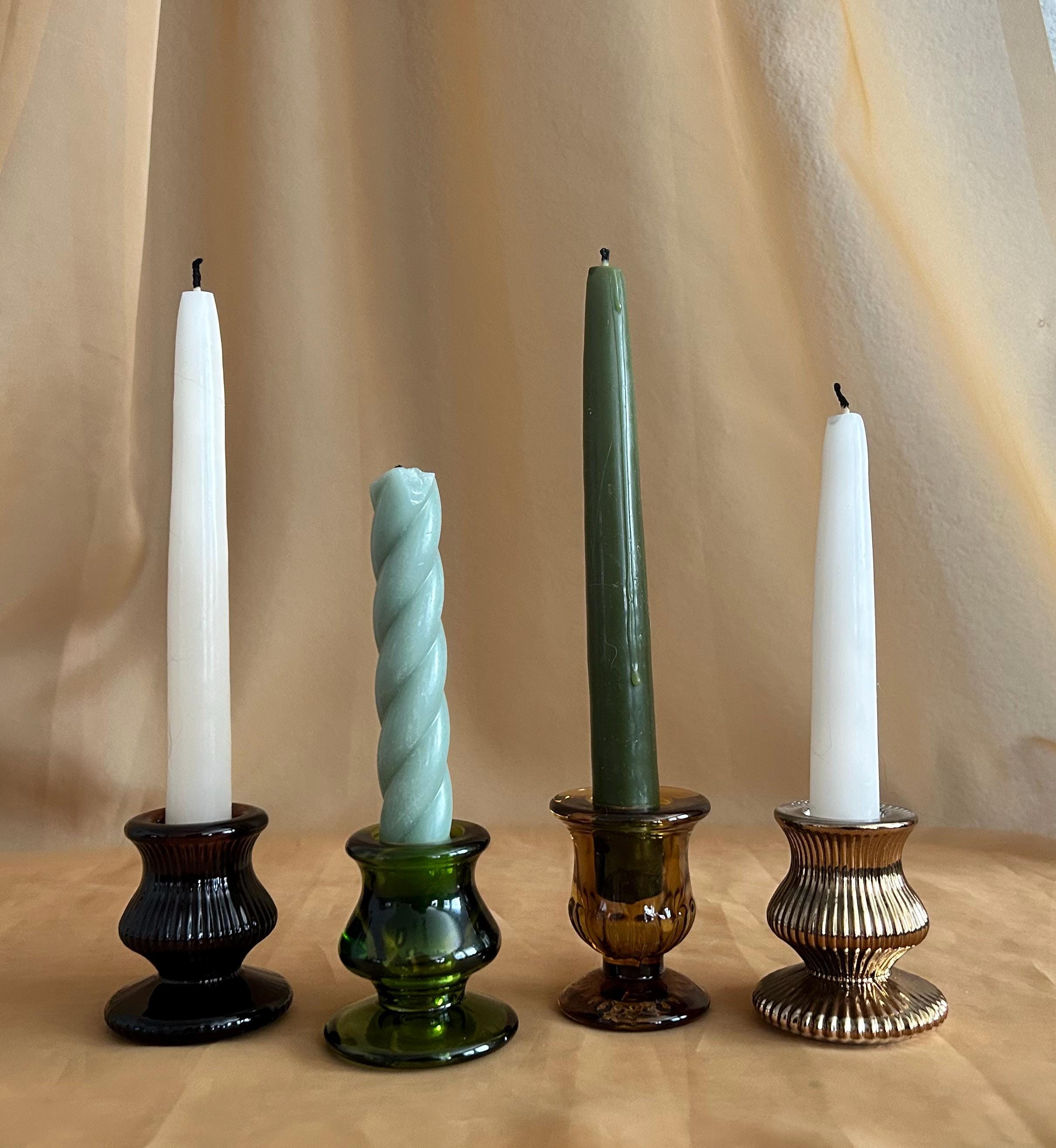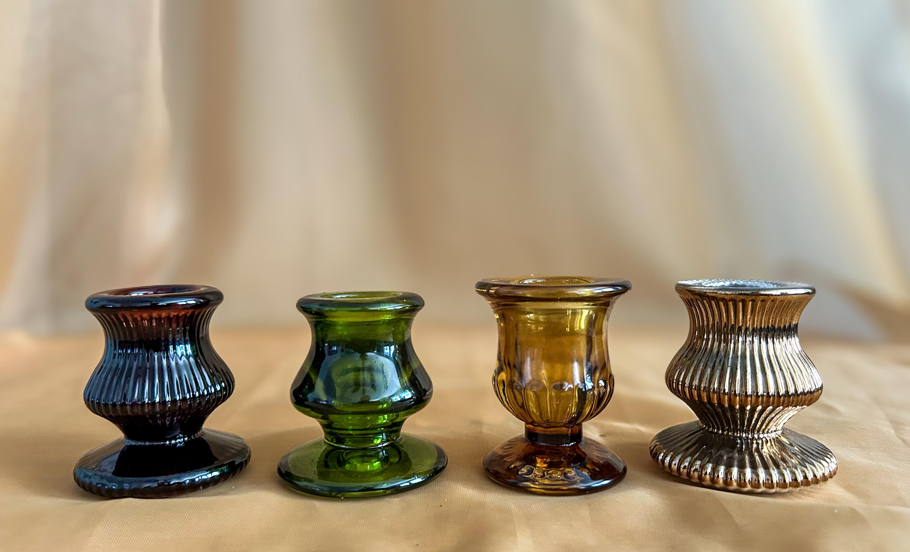 Bring warmth and vintage charm to your tablescape with these jewel-tone glass candle holders — a perfect blend of color, texture, and timeless style. Available in four unique designs, each holder features rich, moody hues that catch the candlelight beautifully. Mix and match for an artful centerpiece or display individually for a simple, elegant glow.