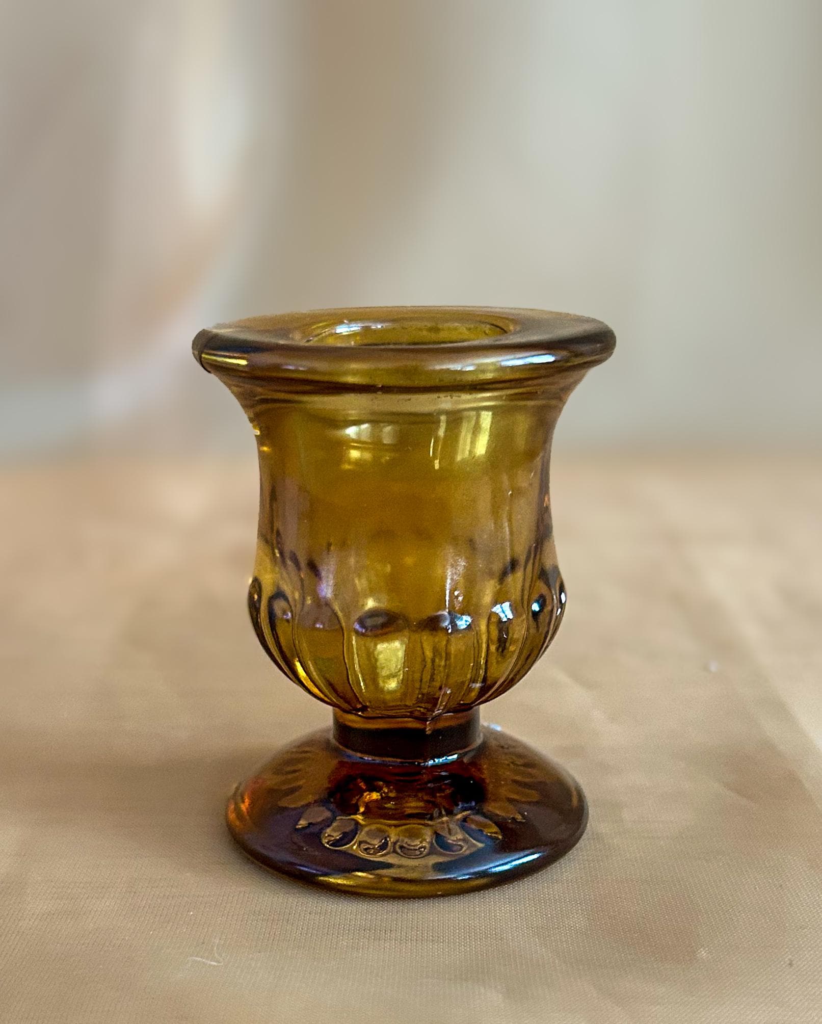 Style C: Amber honey glass with subtle petal embossing — approximately 2½” high x 2¾” wide