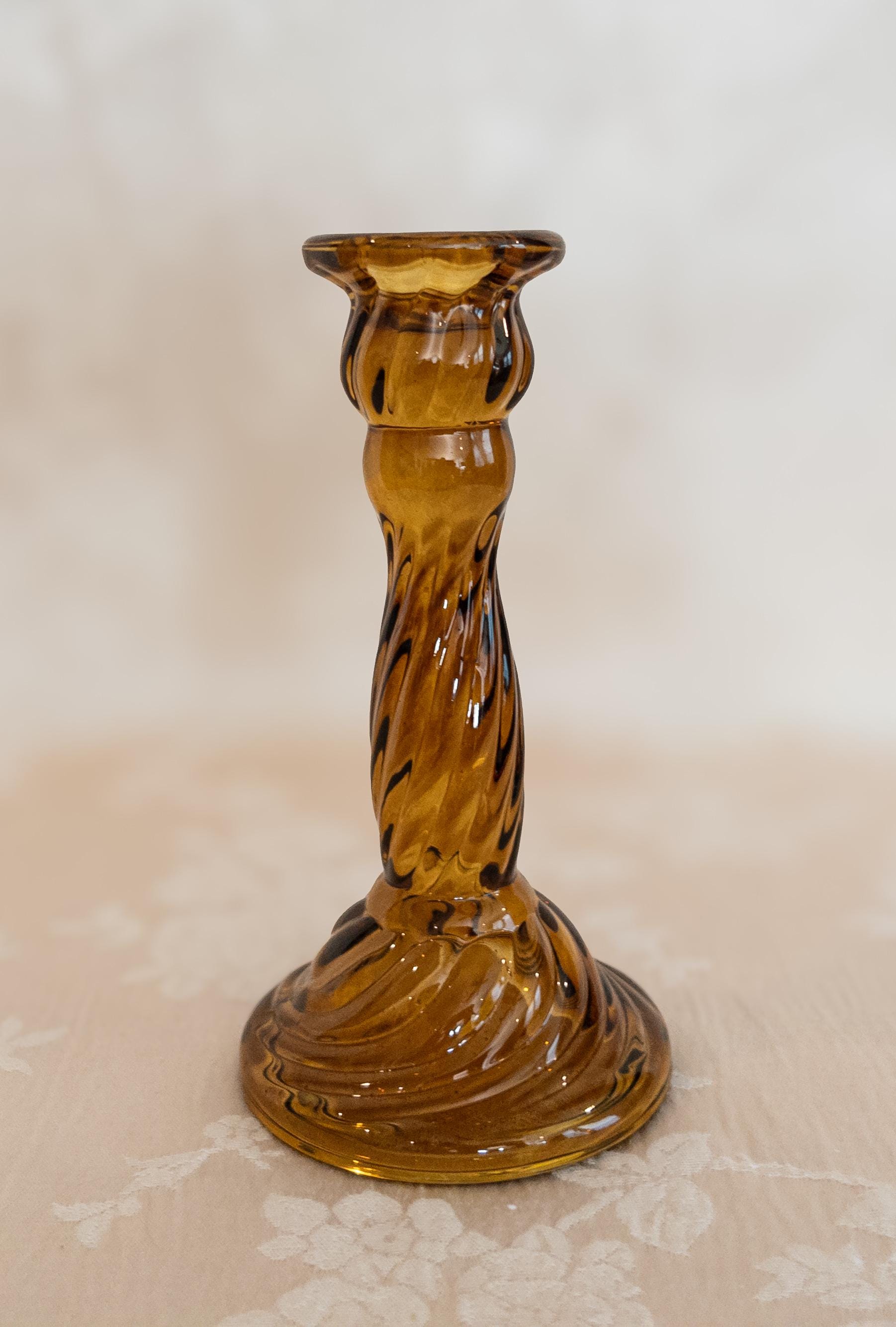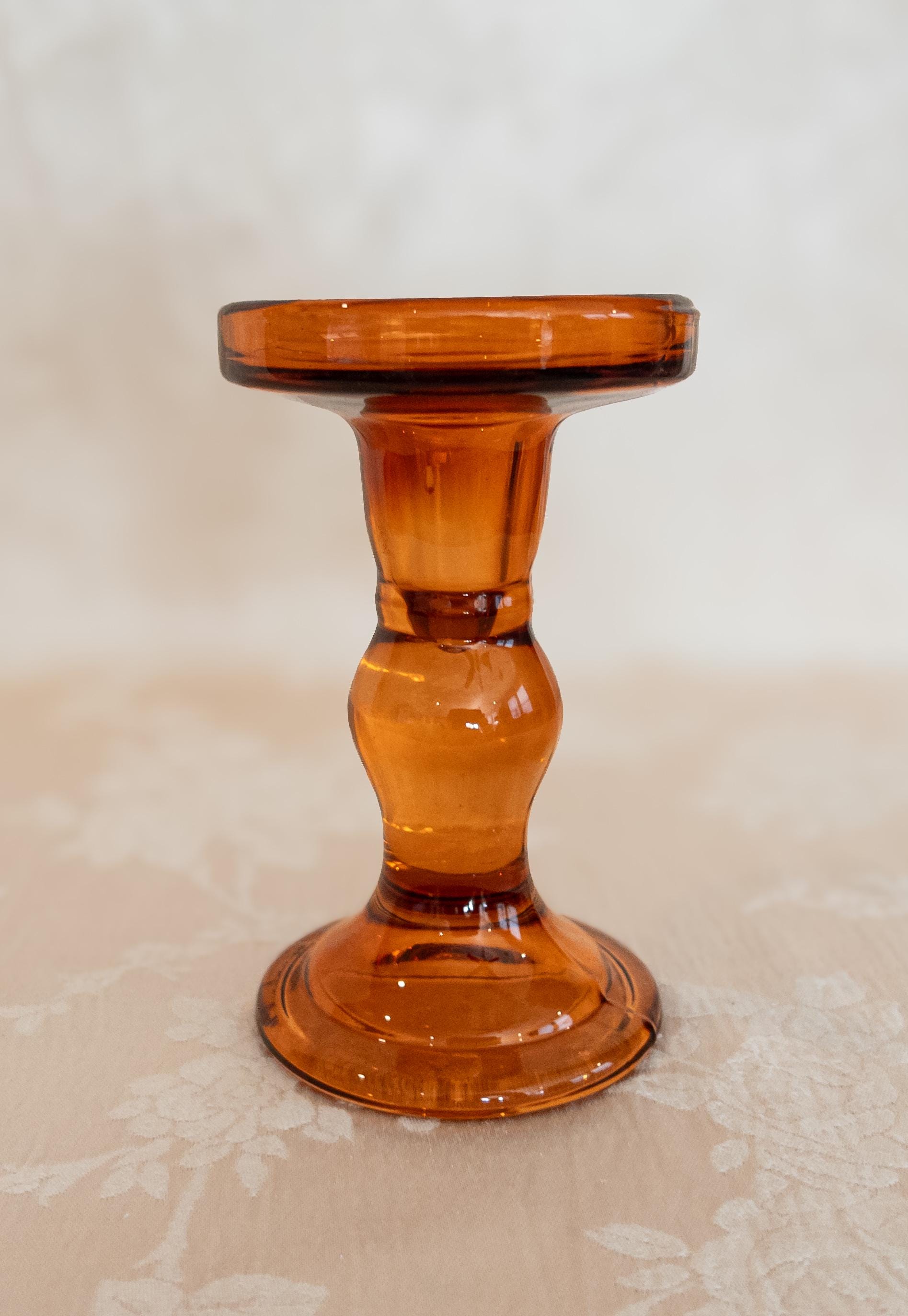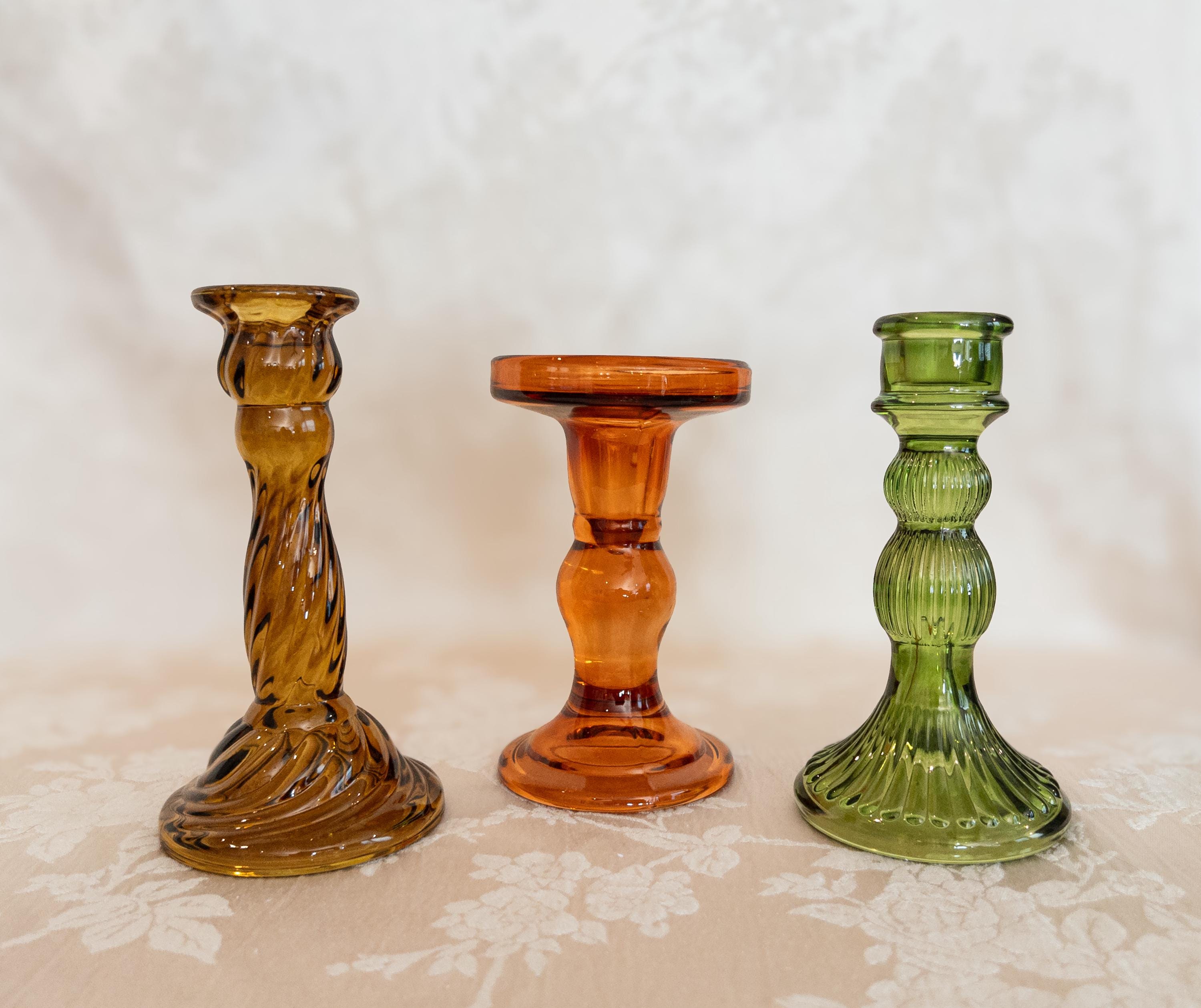Bring a warm vintage glow to your table or mantel with these jewel-toned glass candlestick holders. Each one features a unique silhouette and rich autumn color—perfect for mixing and matching to create an inviting fall tablescape or retro-inspired home décor display.