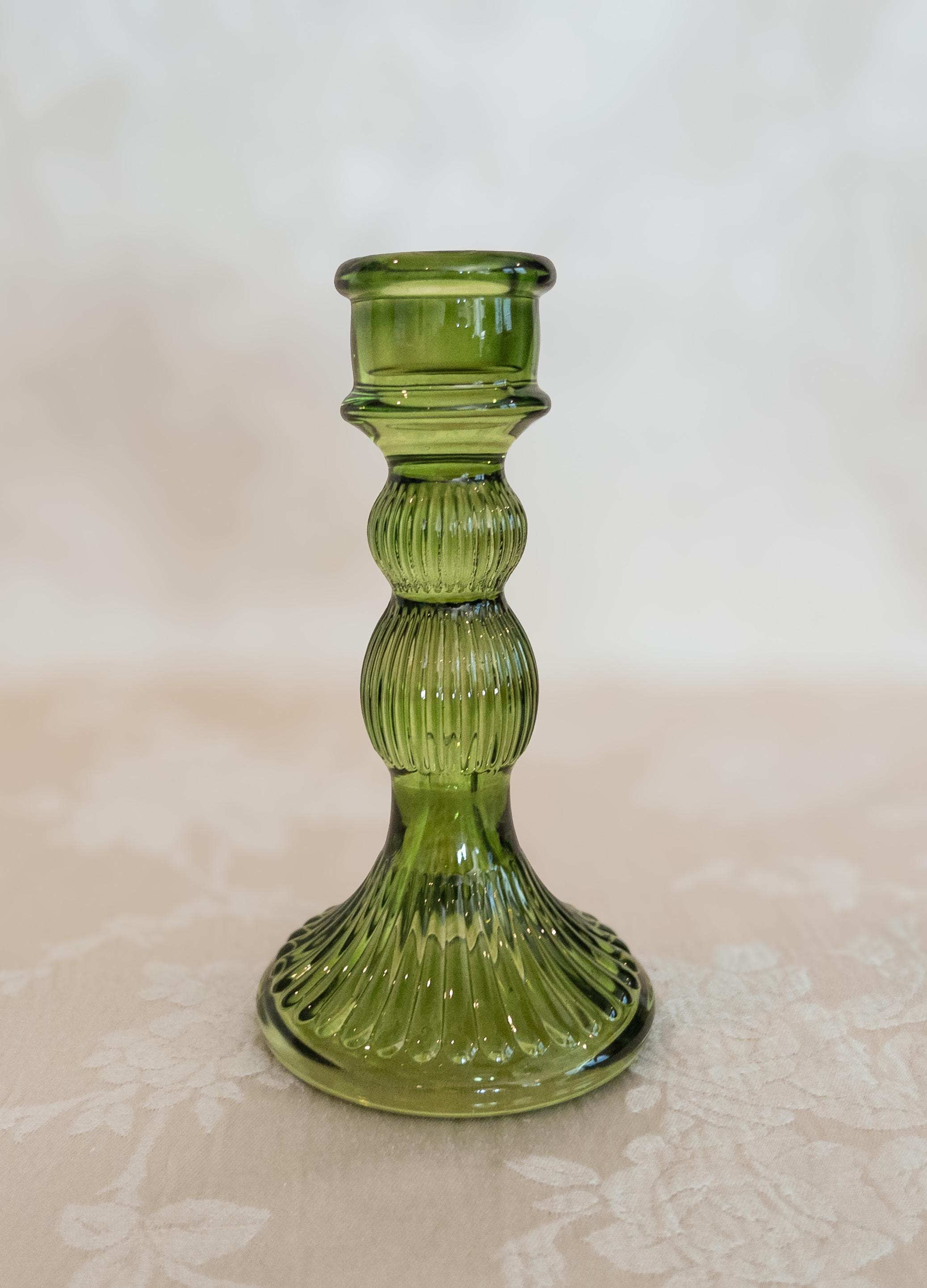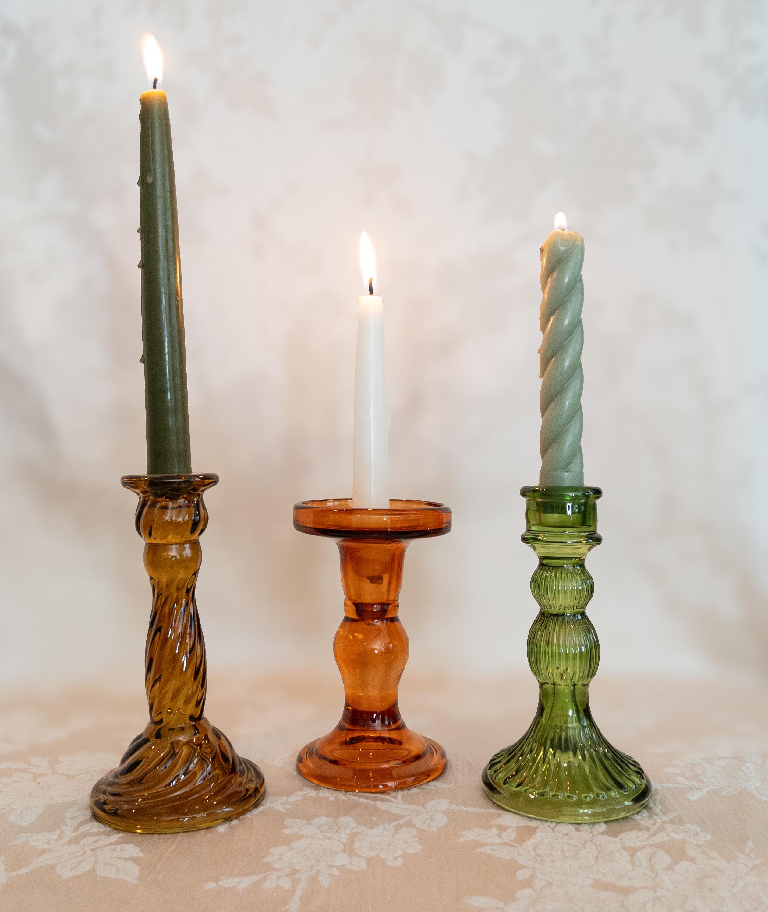 Each holder is crafted from colored glass with a luminous finish that catches candlelight beautifully. Suitable for most standard taper candles. Display one as a statement accent or group several together for an elegant, layered glow.