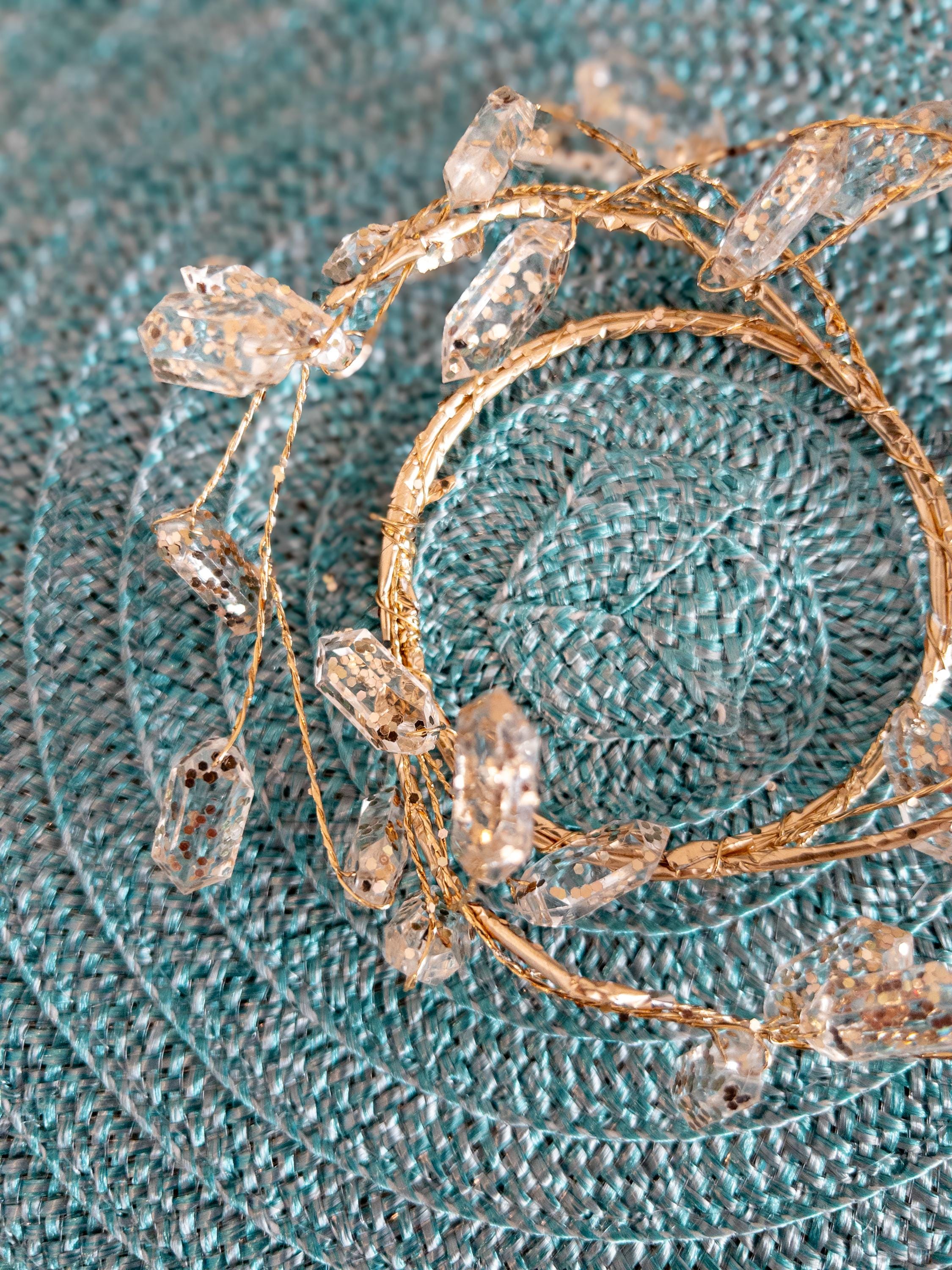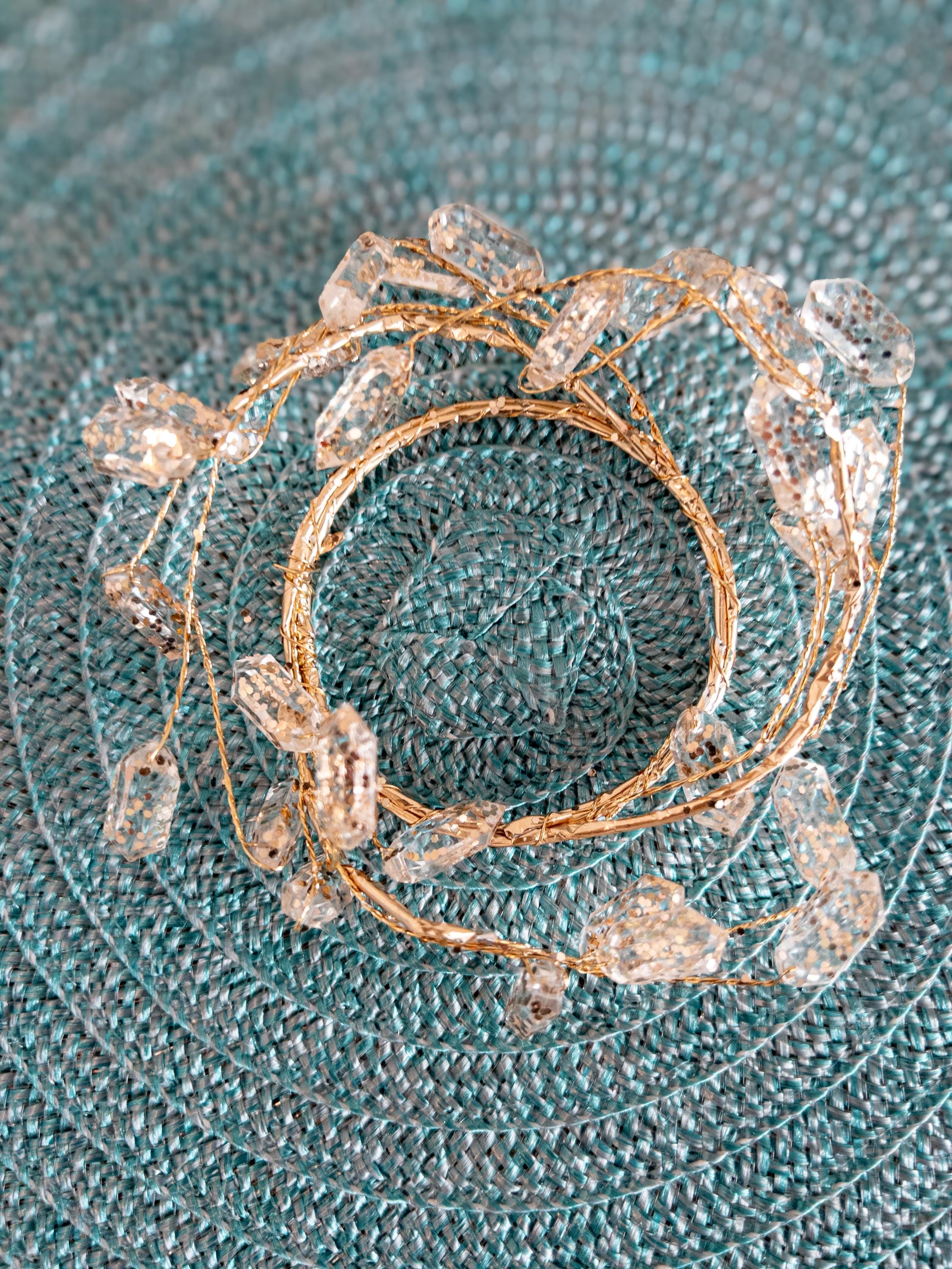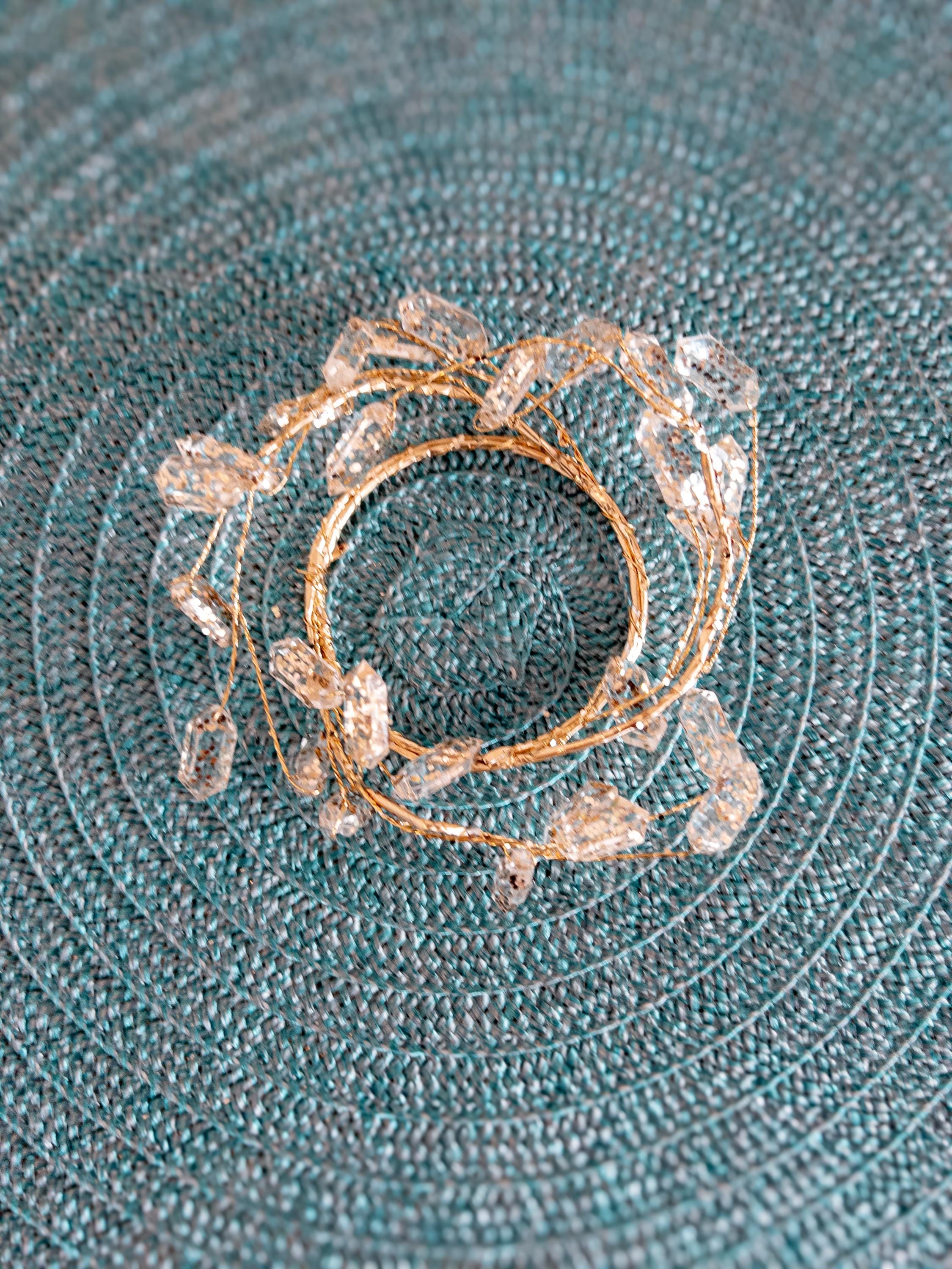 Crafted from clear acrylic gems with delicate gold flecks intertwined along flexible gold wire, this 6-inch ring catches and reflects light beautifully — whether used with flickering candlelight or daylight sparkle.