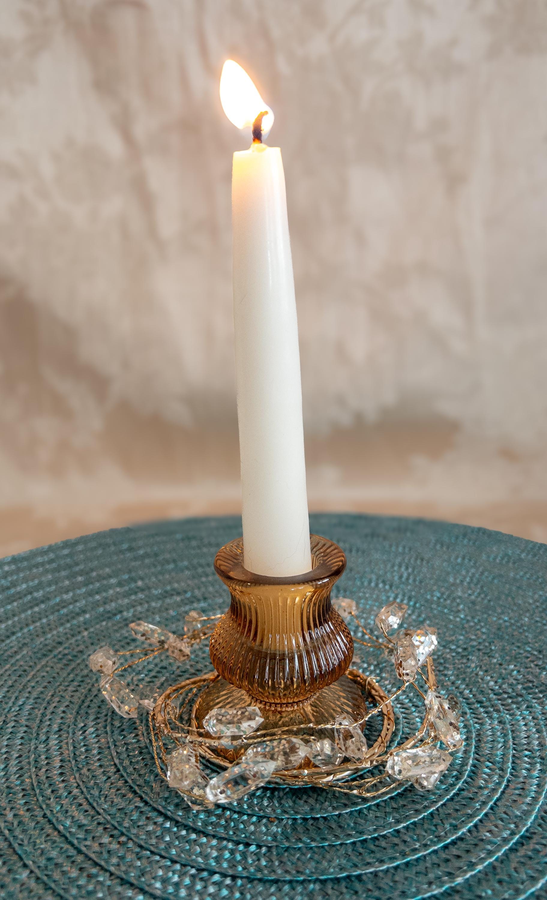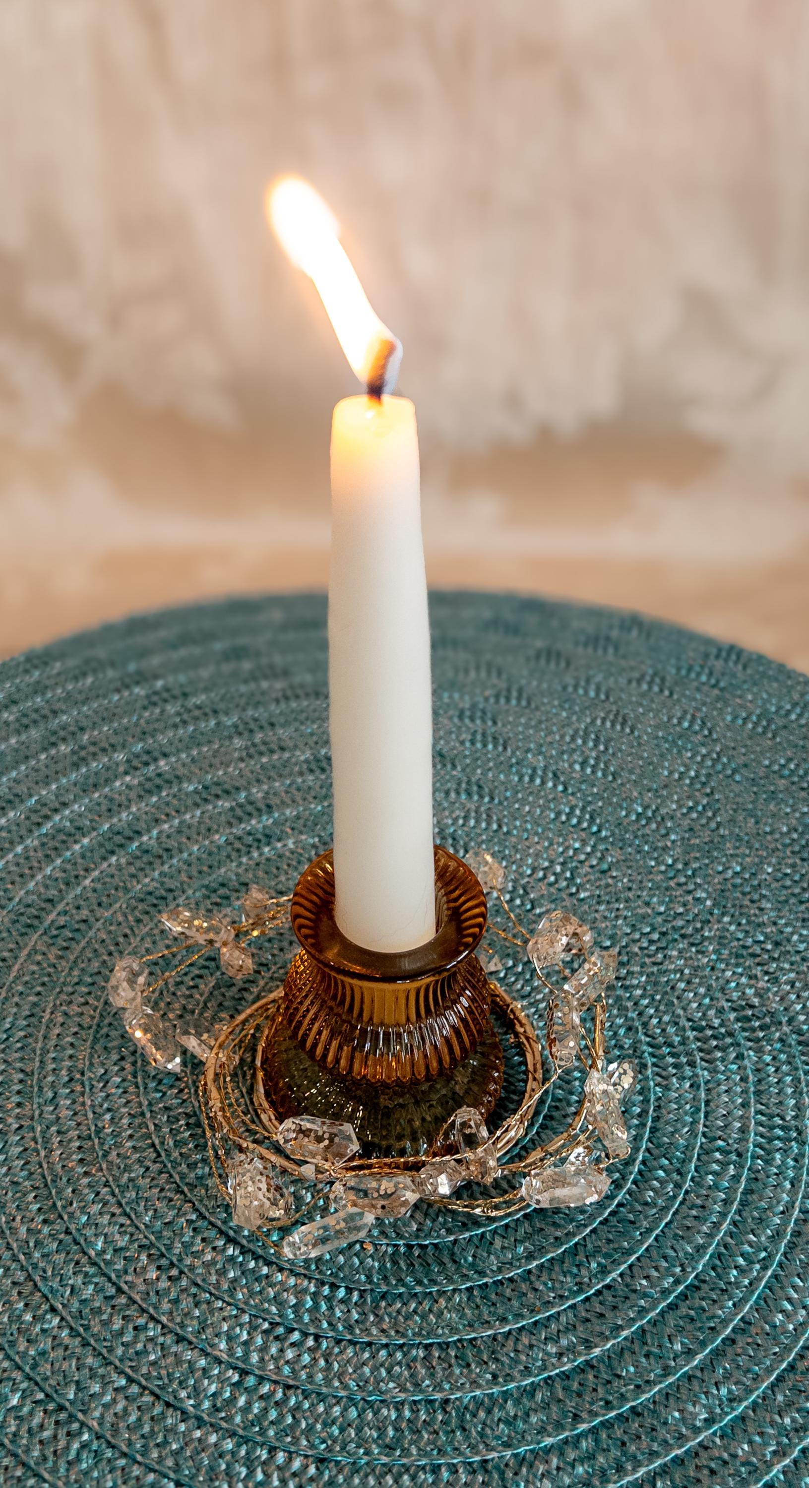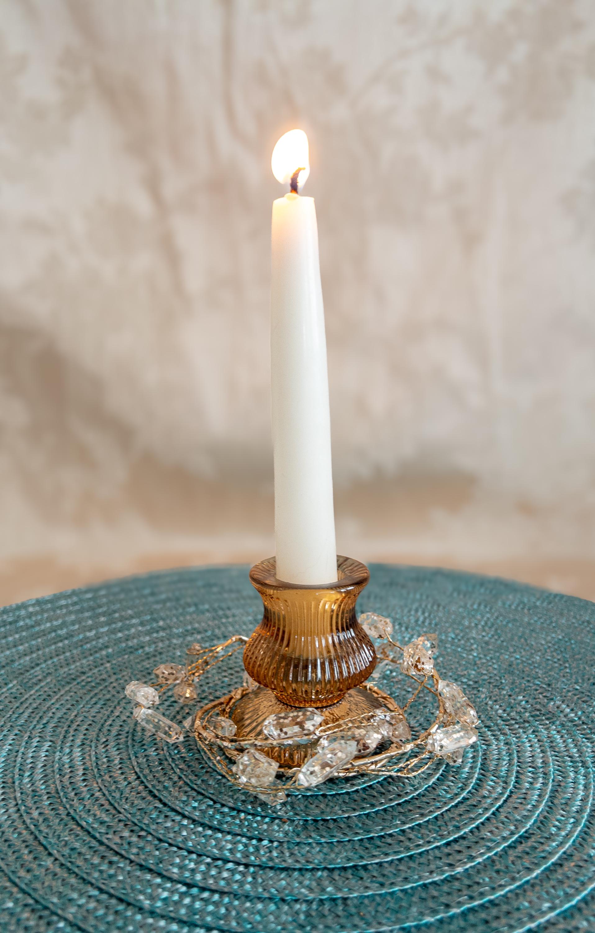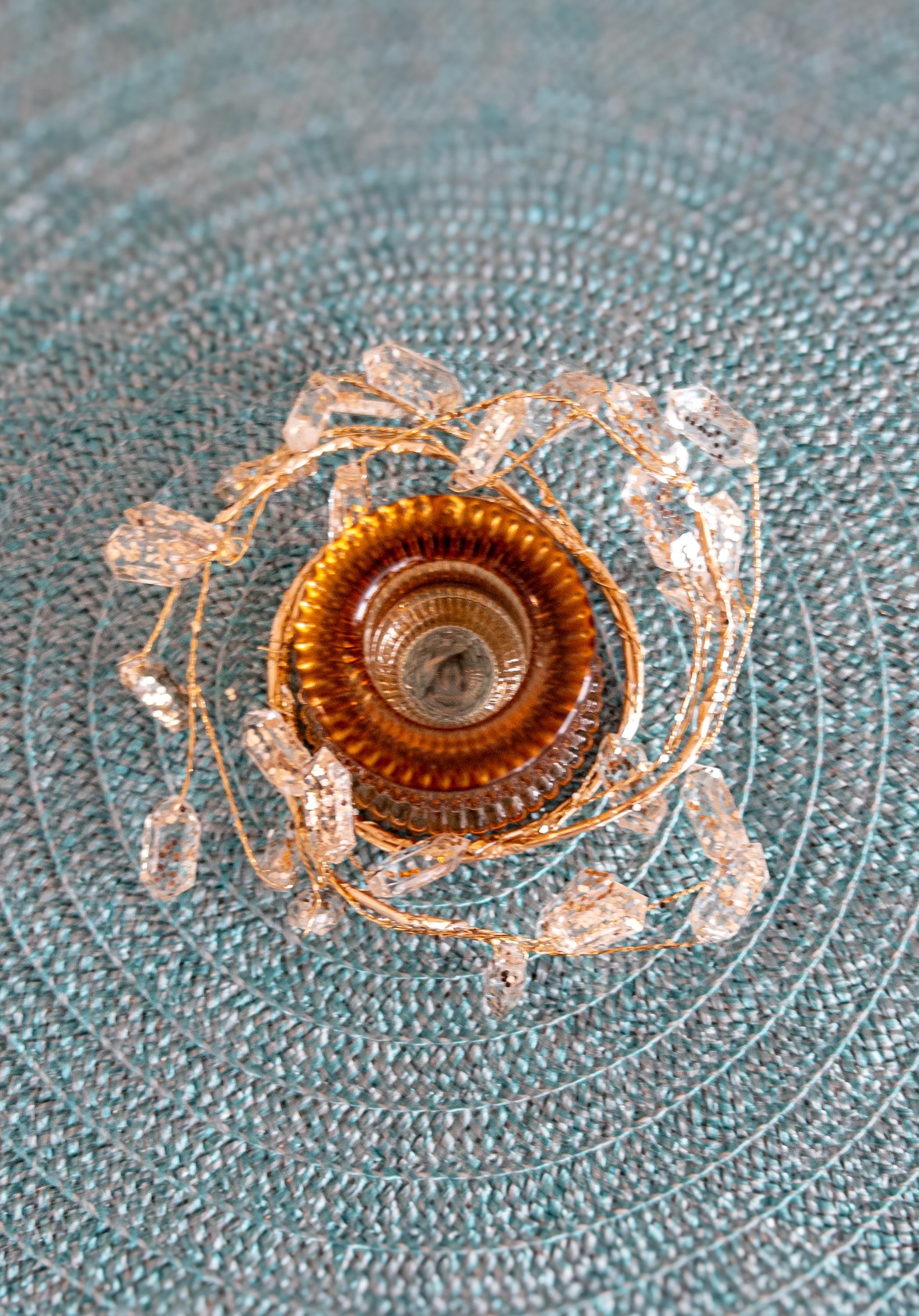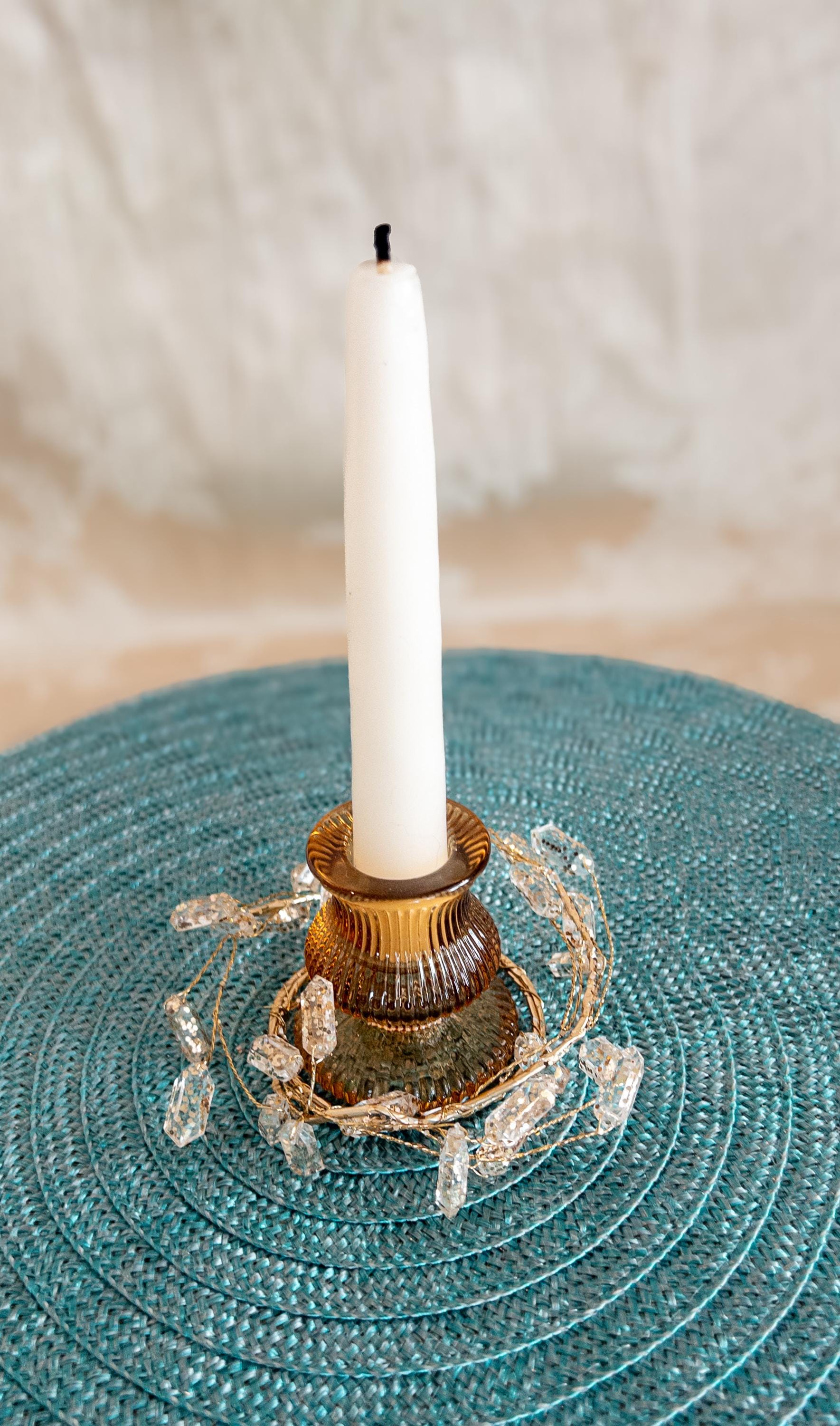 Add a touch of golden sparkle to your tablescape with this shimmering acrylic gemstone candle ring.