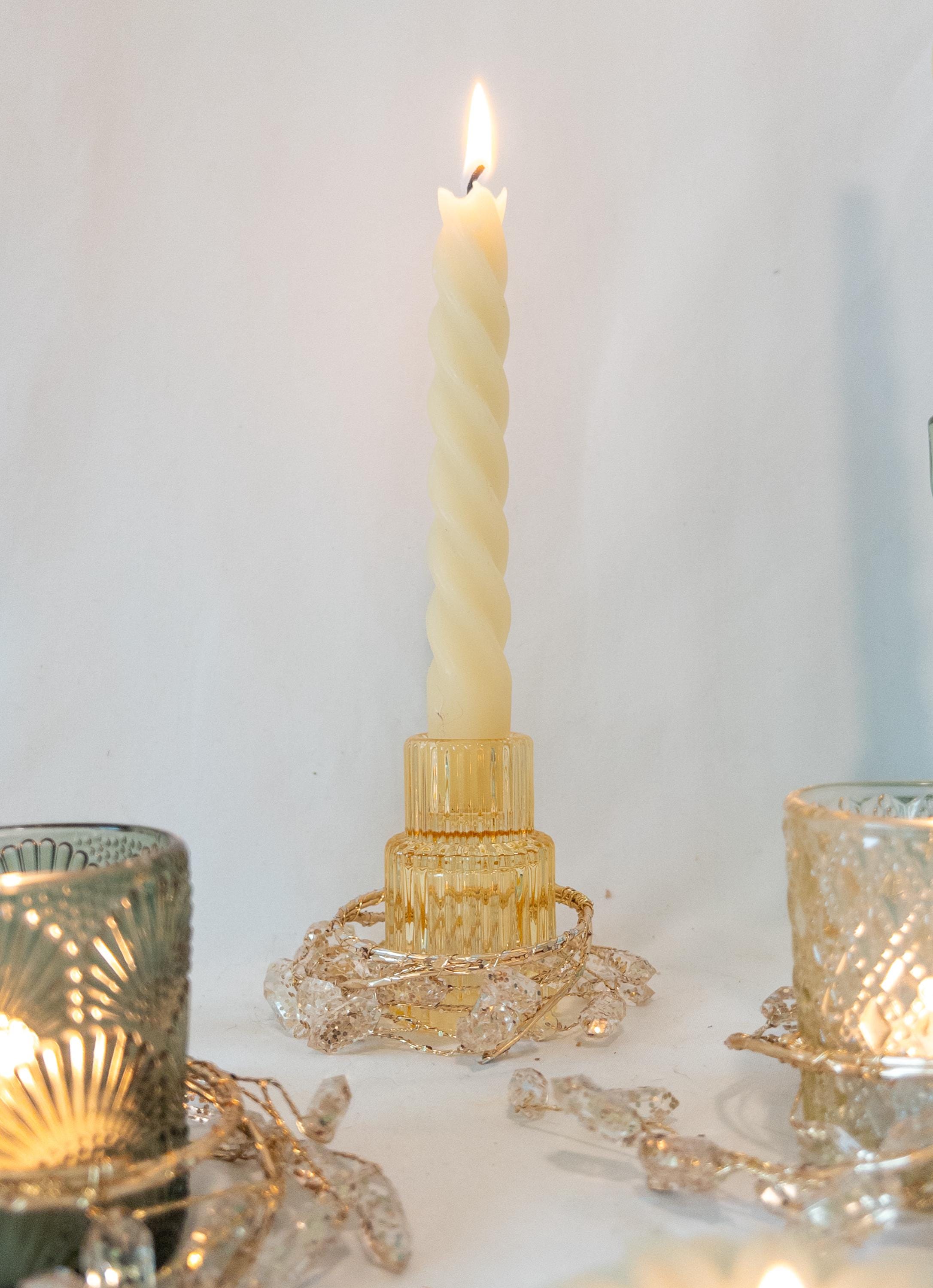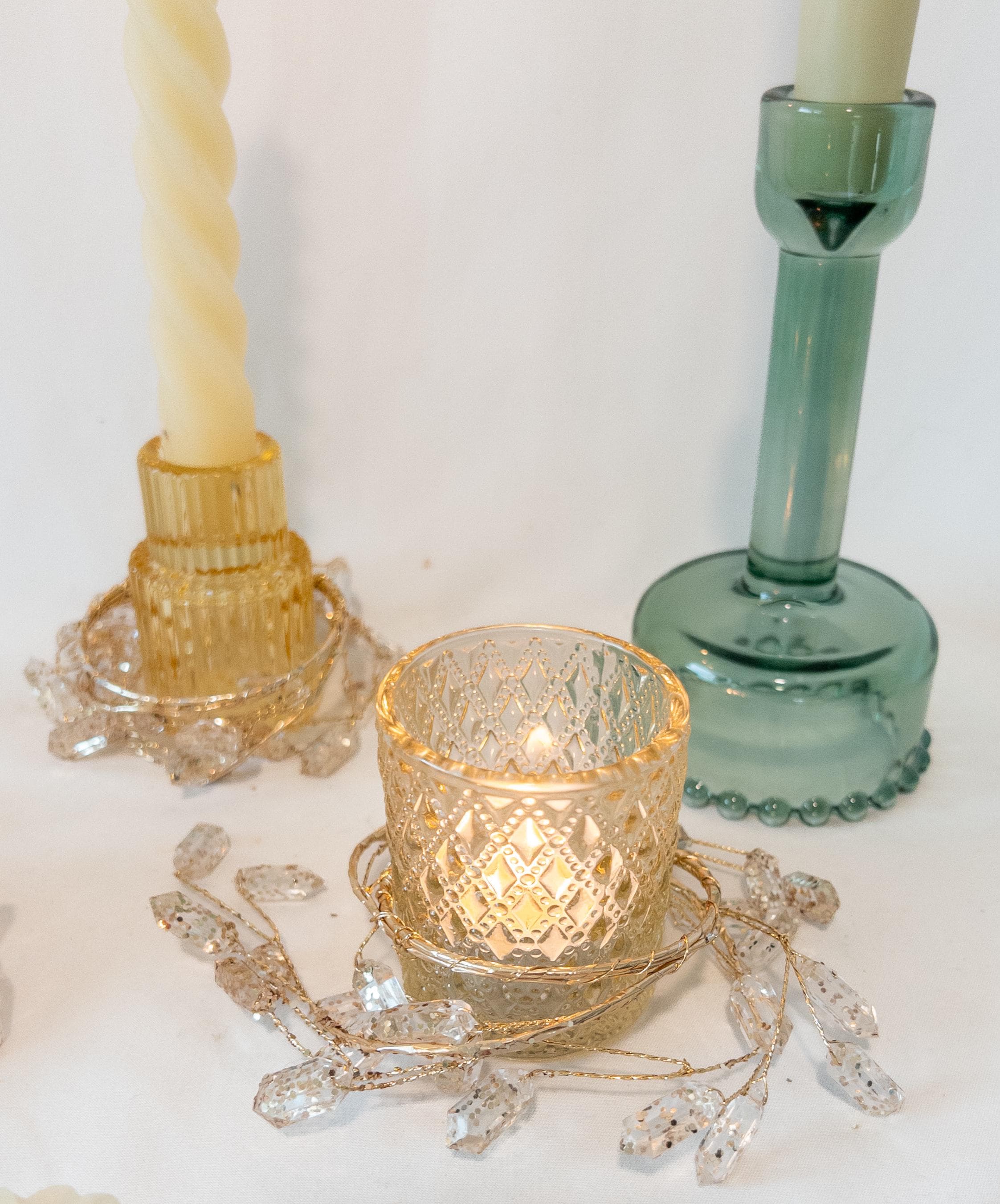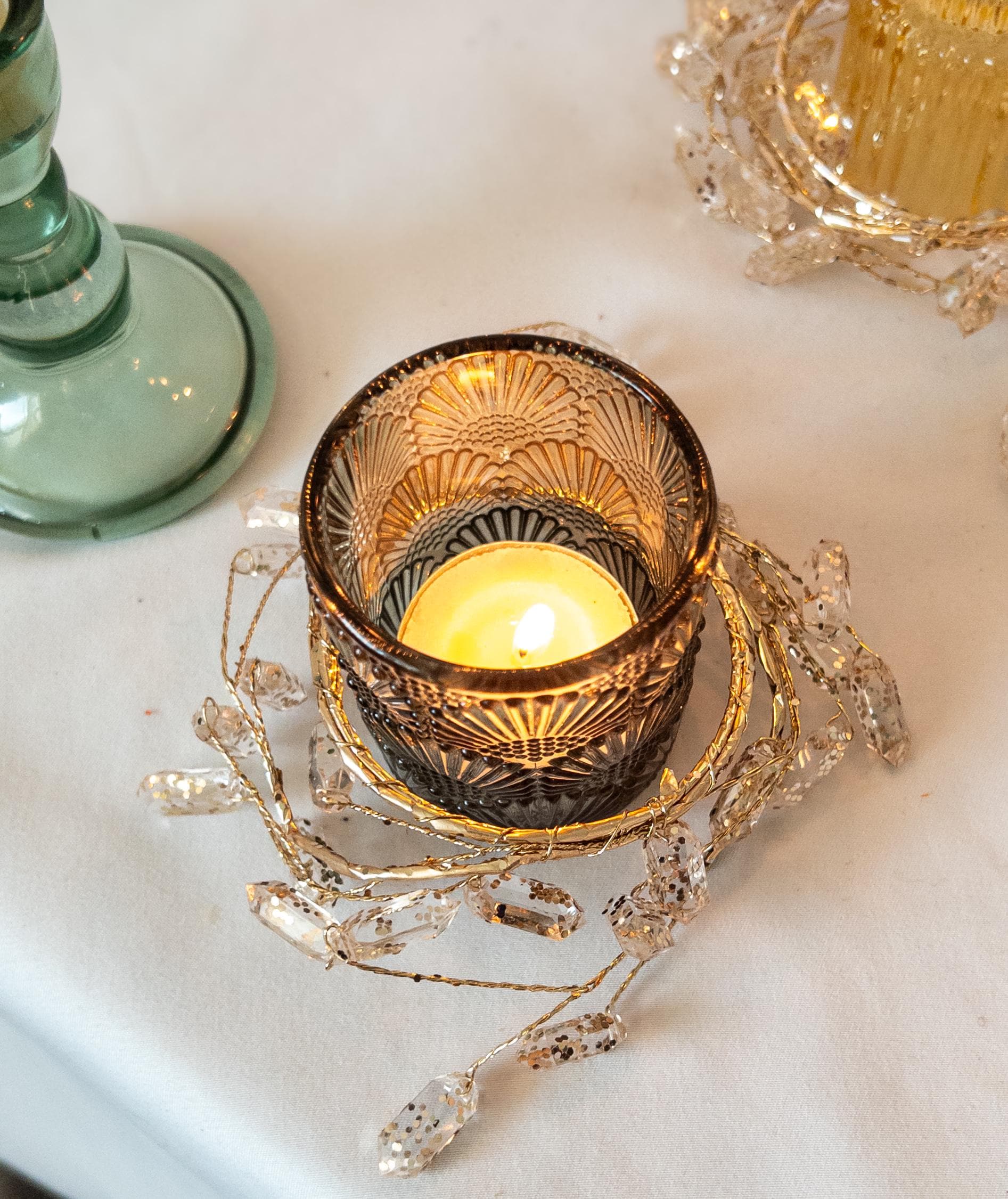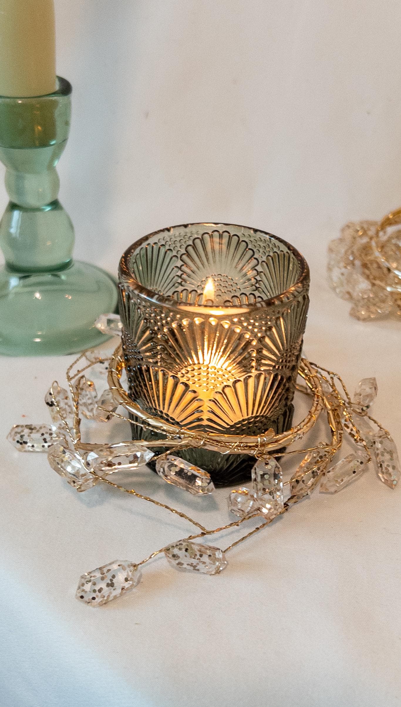 Add a touch of golden sparkle to your tablescape with this shimmering acrylic gemstone candle ring.