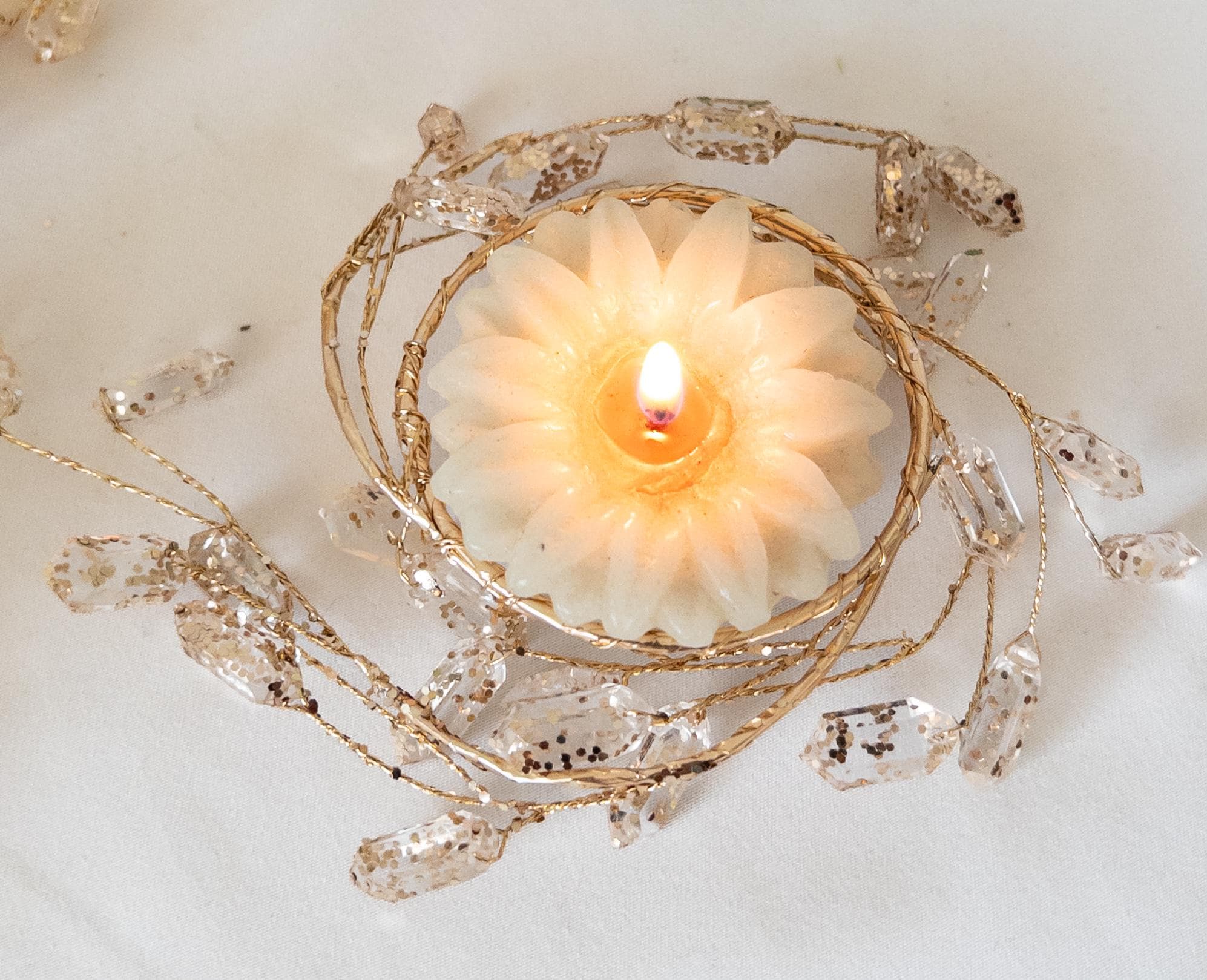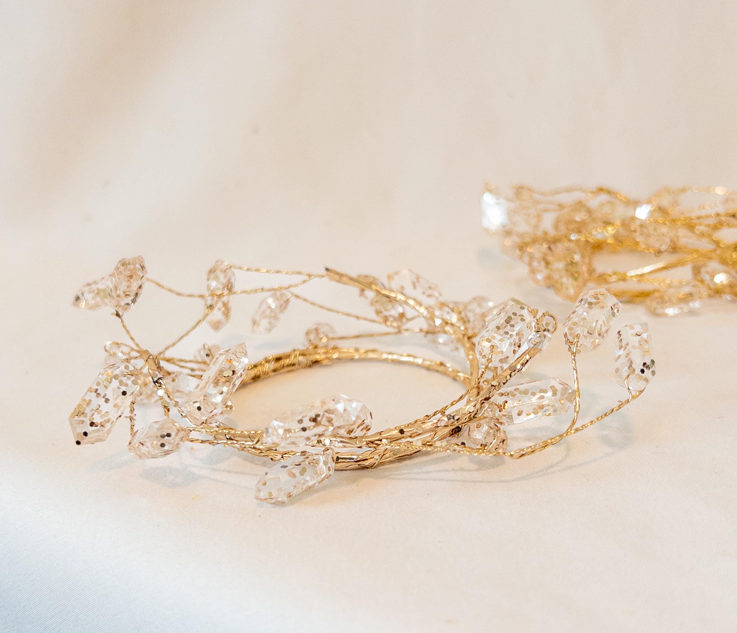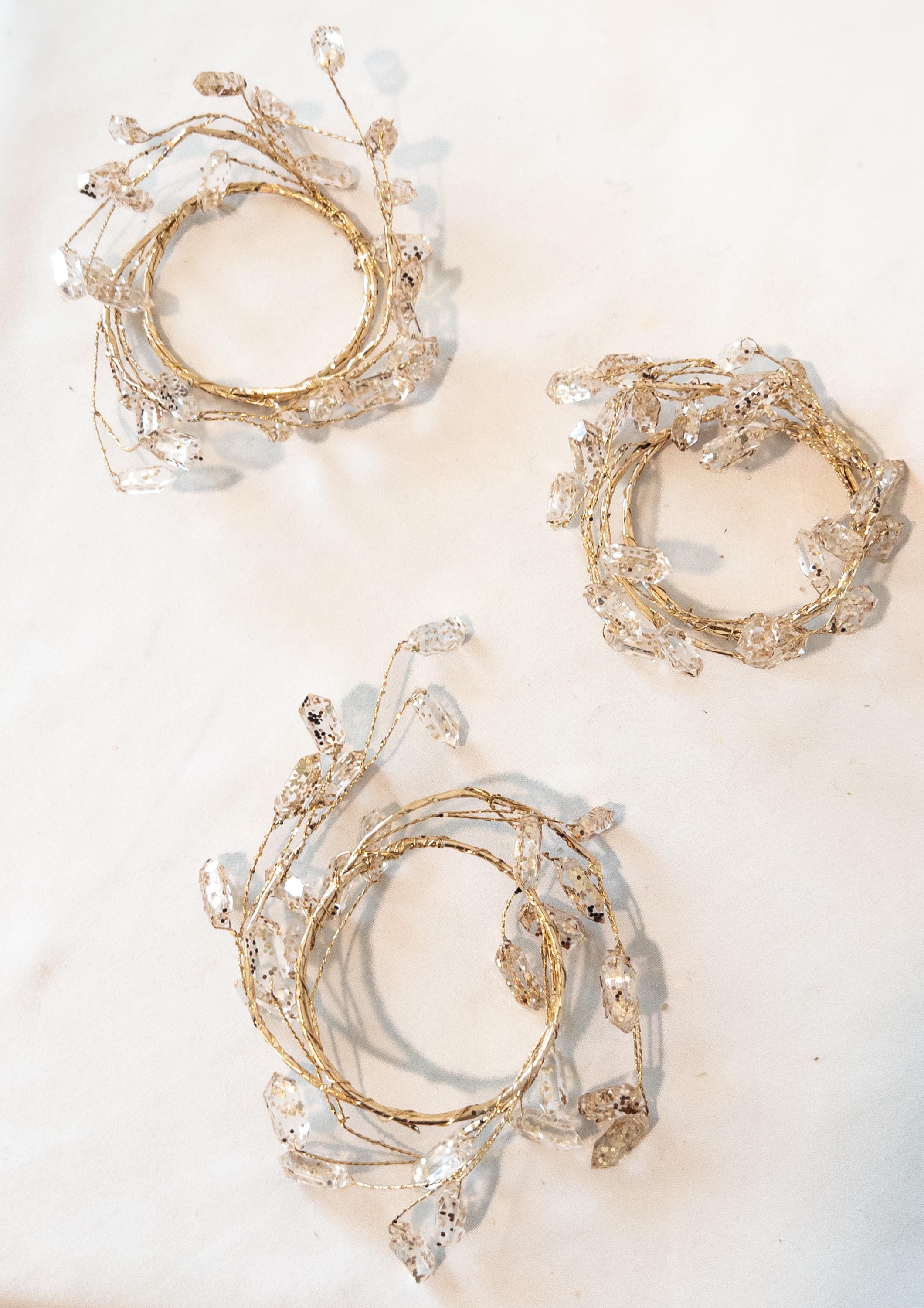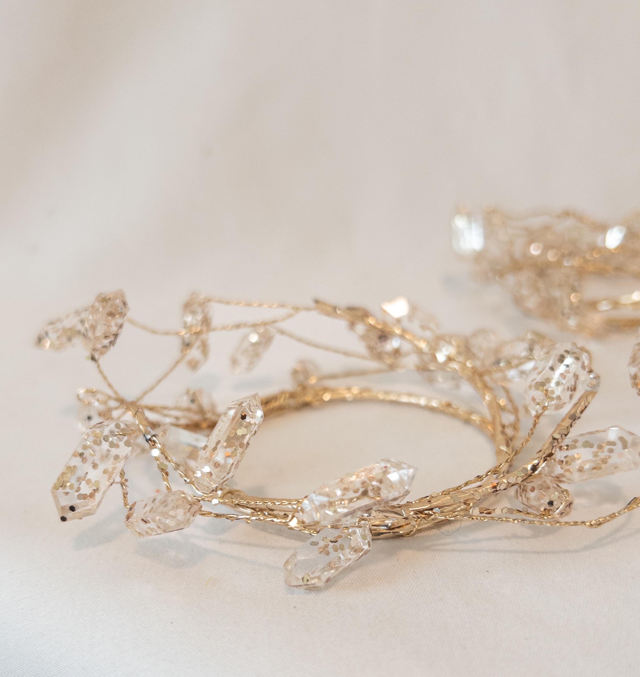 Crafted from clear acrylic gems with delicate gold flecks intertwined along flexible gold wire, this 6-inch ring catches and reflects light beautifully — whether used with flickering candlelight or daylight sparkle.