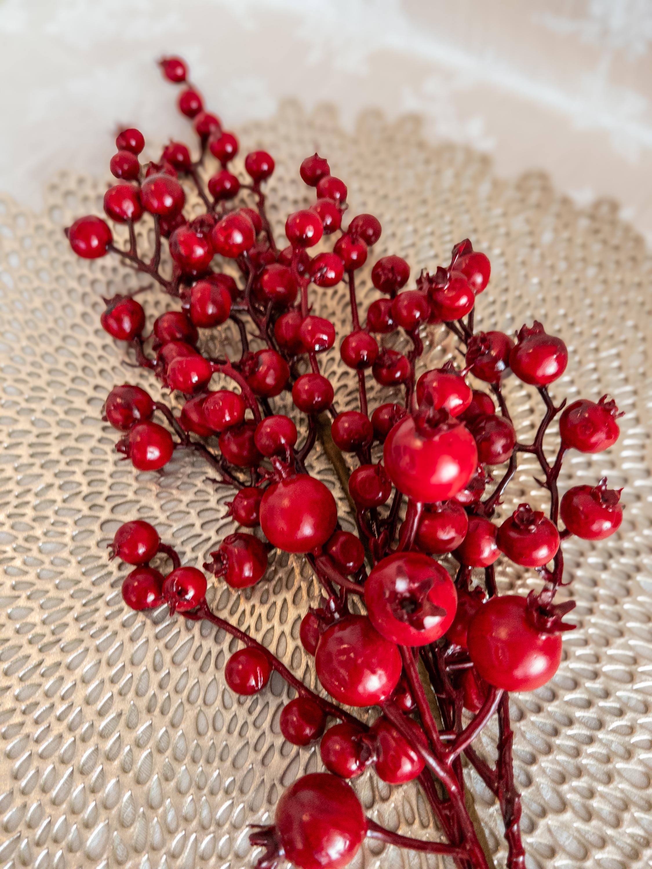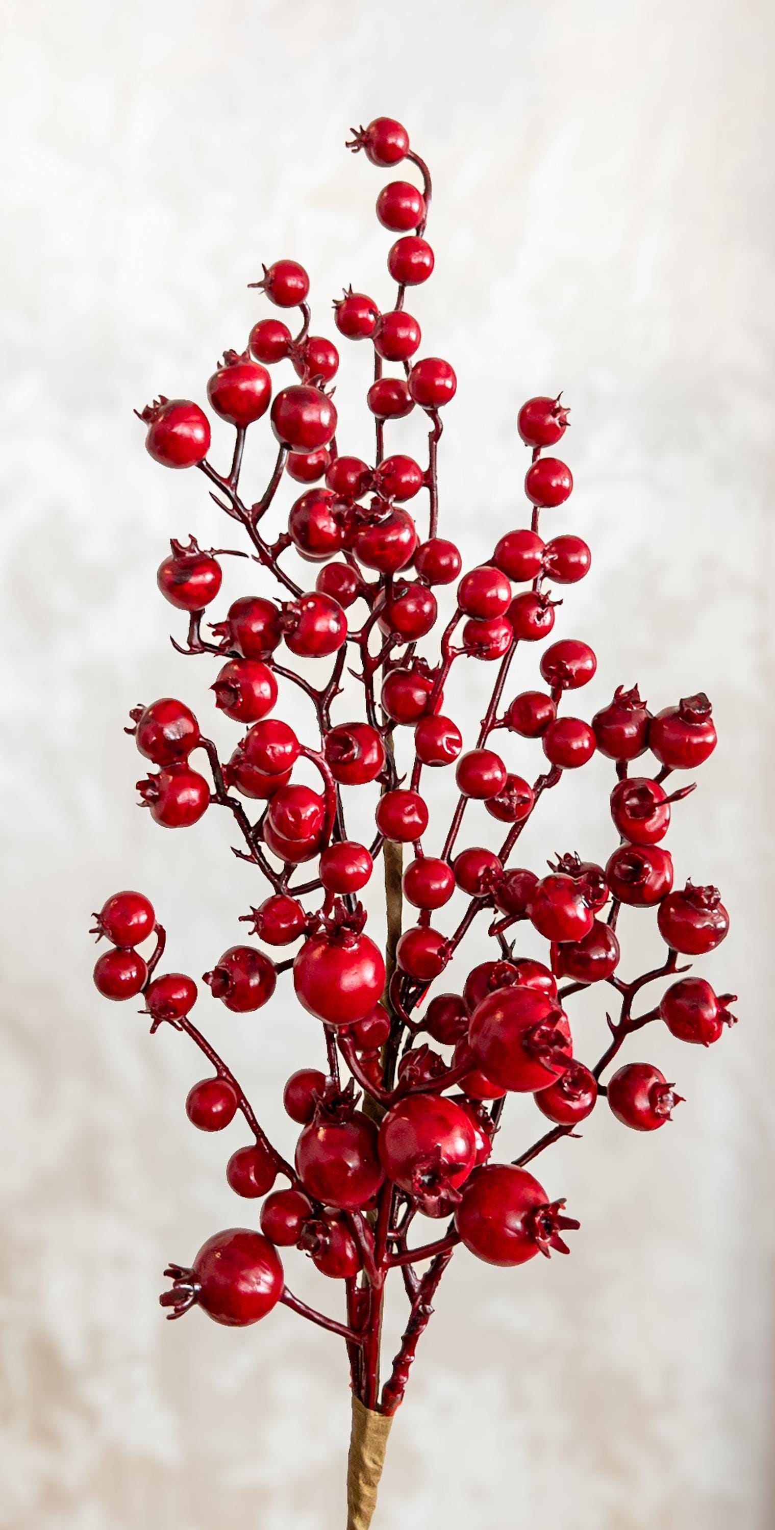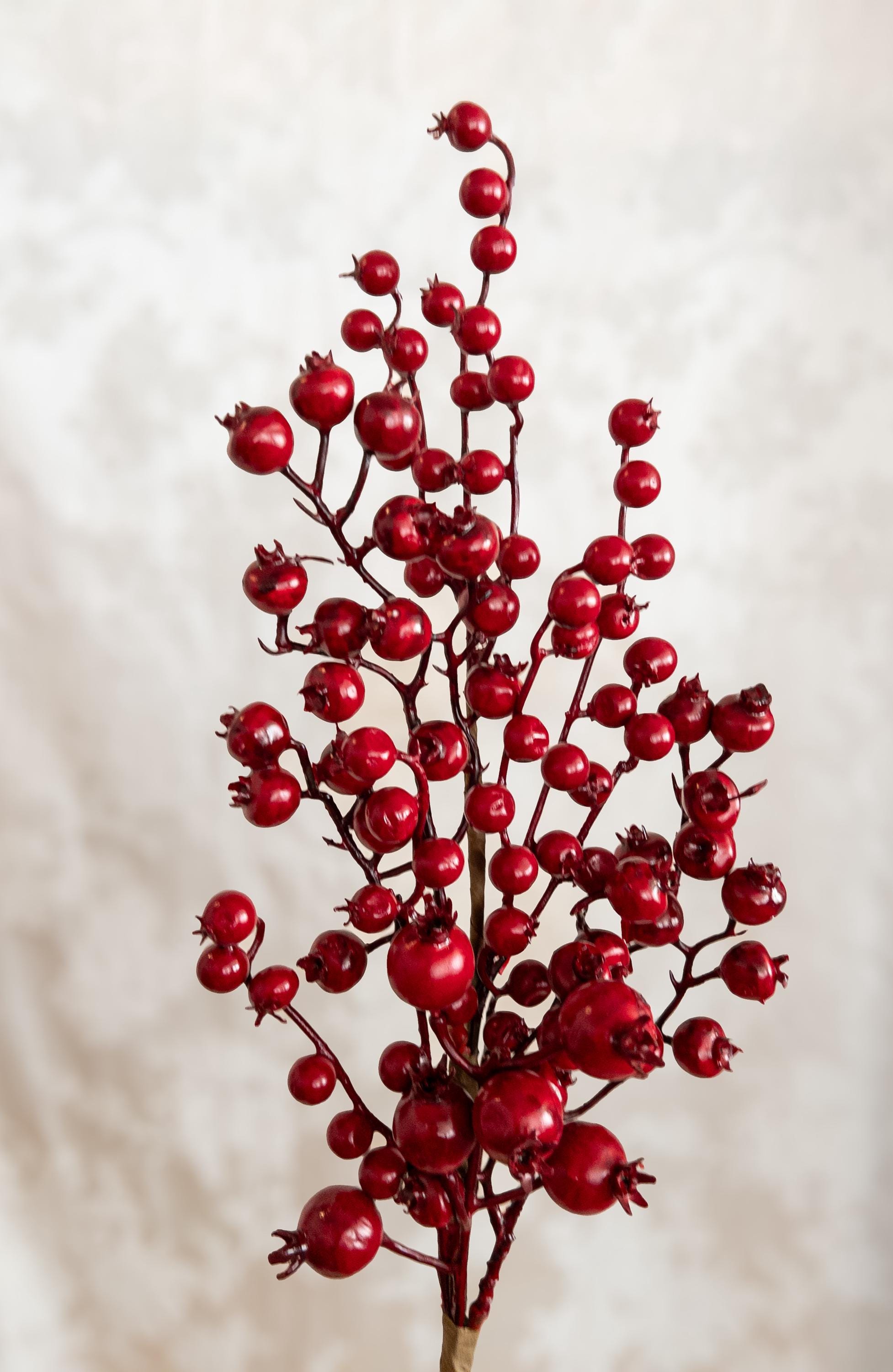 This spray features glossy, deep red berries in varied sizes on branching stems, creating a lush and organic look that adds instant warmth to any arrangement. Display it on its own in a vase, tuck it into a holiday wreath or garland, or mix it with evergreen branches and pinecones for a timeless Christmas centerpiece.